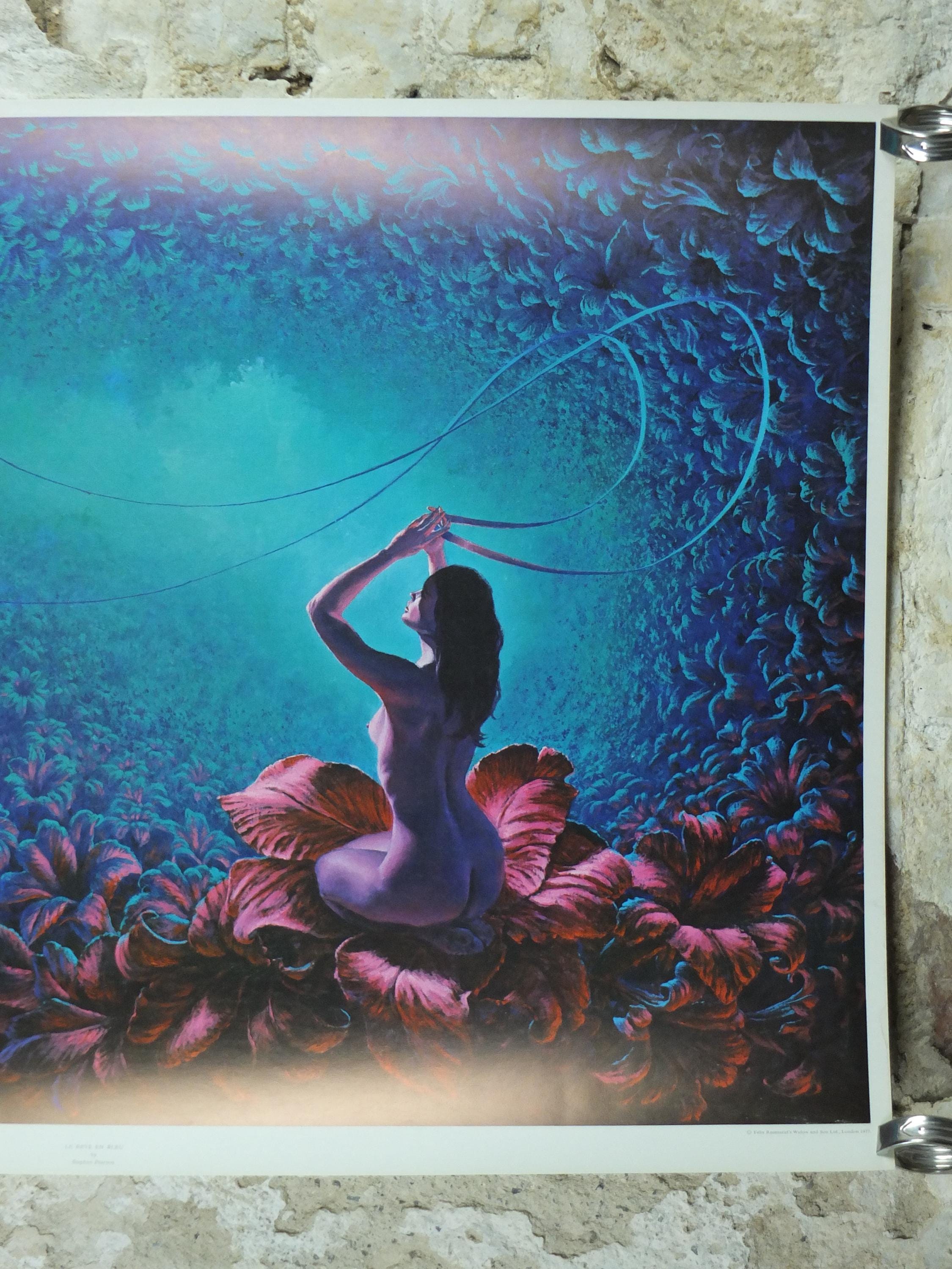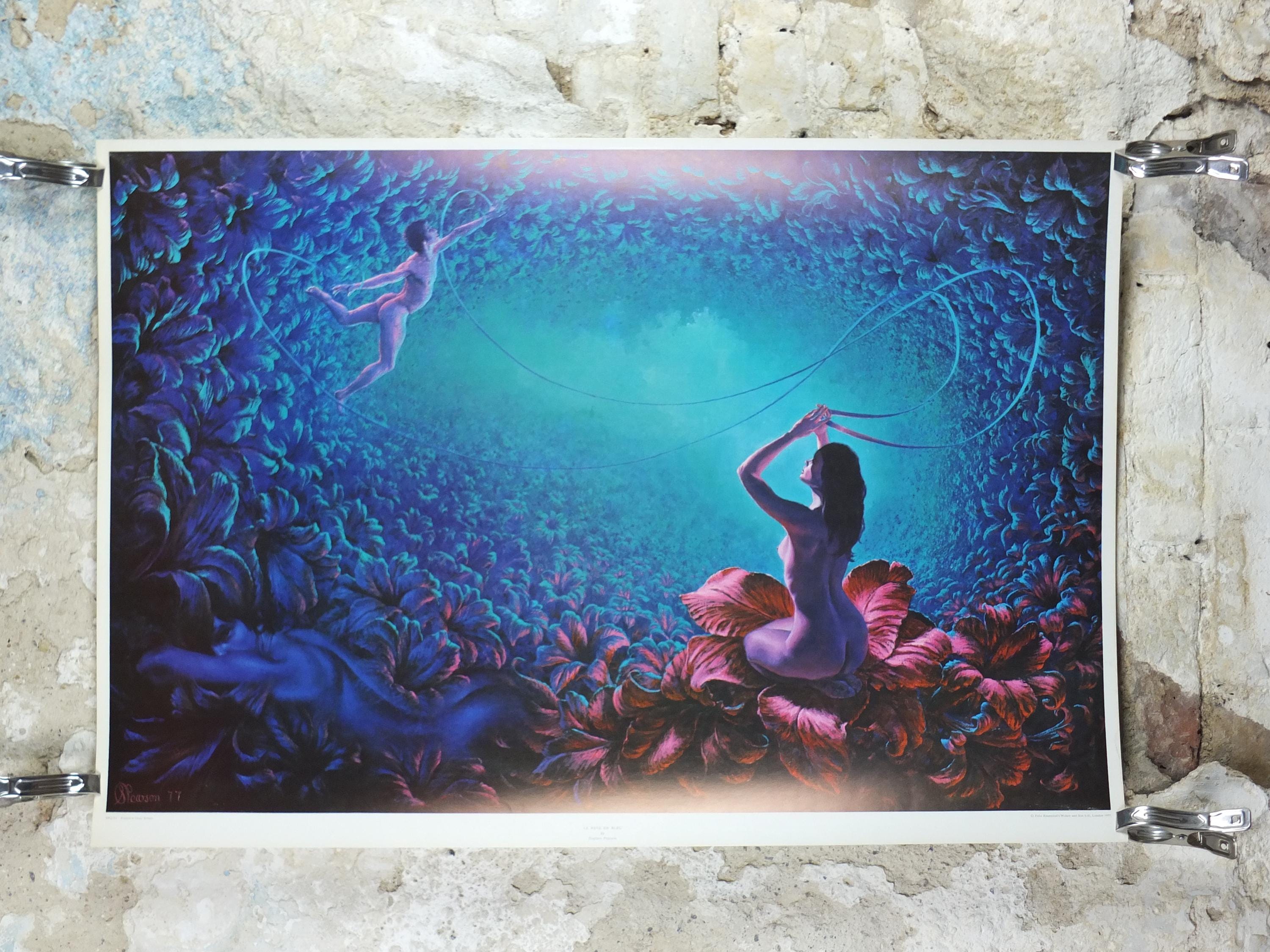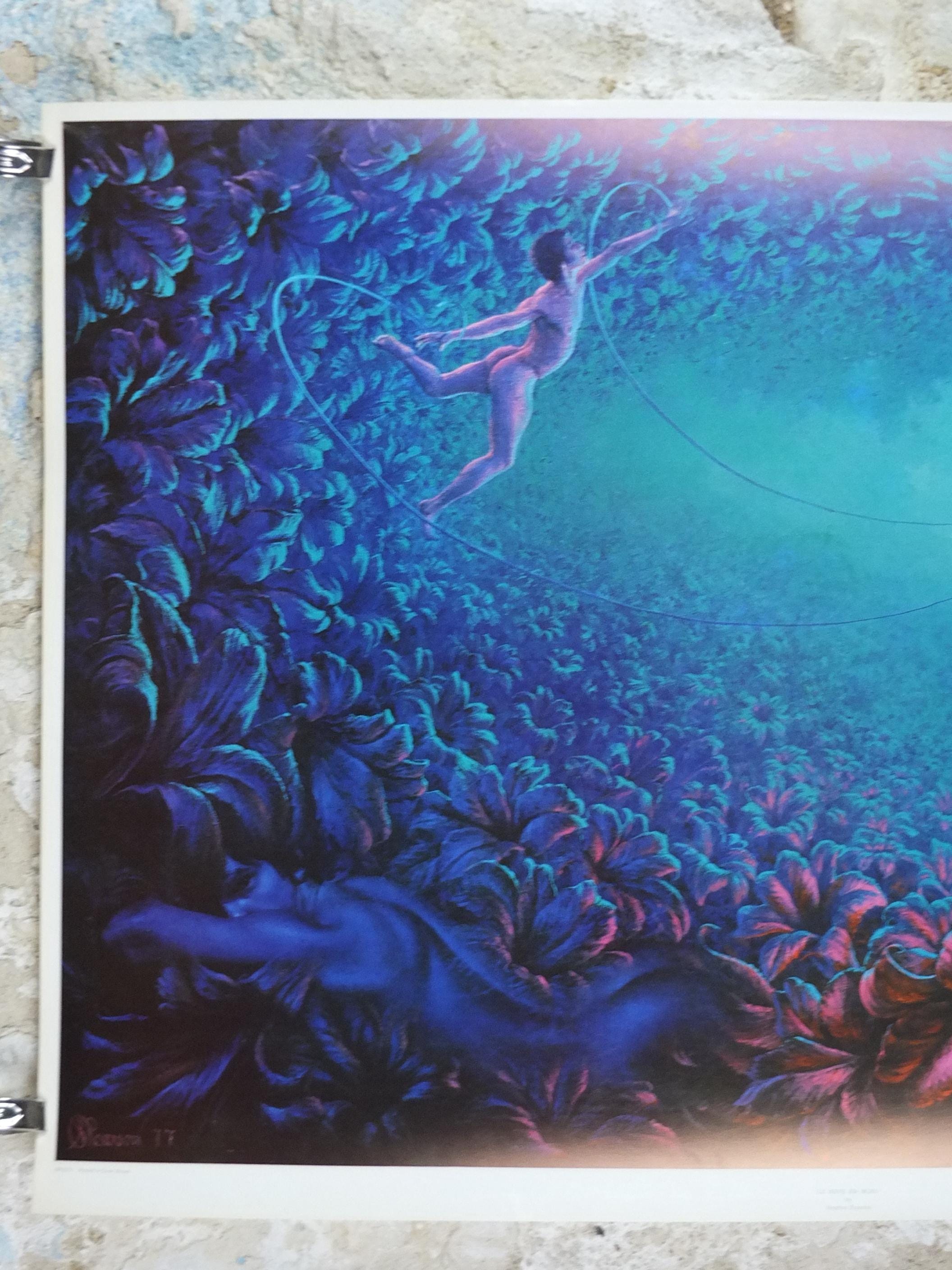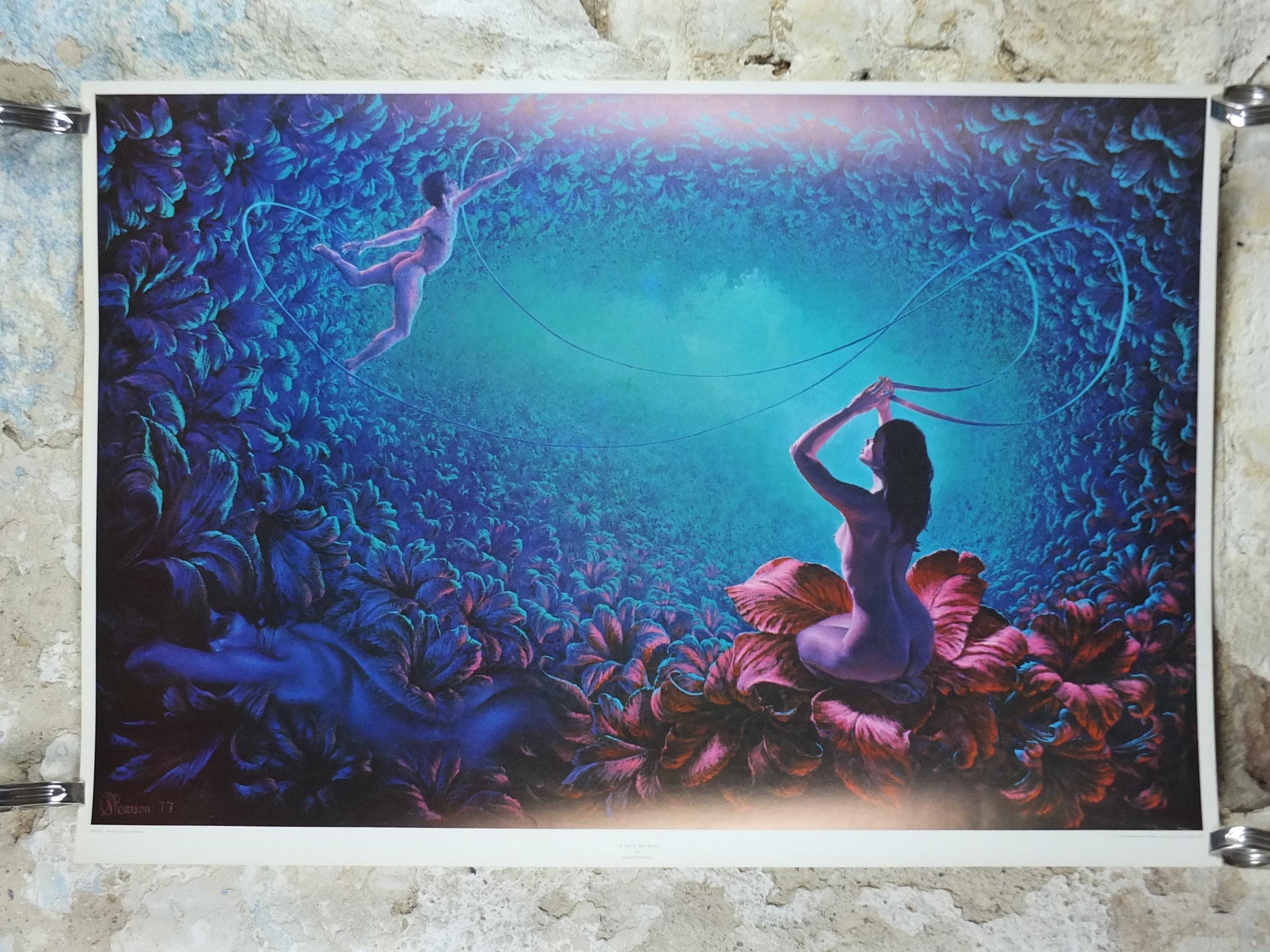 This is a Stephen Pearson poster from 1977 titled "Le Reve en Bleu" or "The Dream in Blue". It shows a nude female figure in a lush, surreal, floral landscape who with a whip like device has caught a flying man who may be under the sea, trying to swim towards the surface.