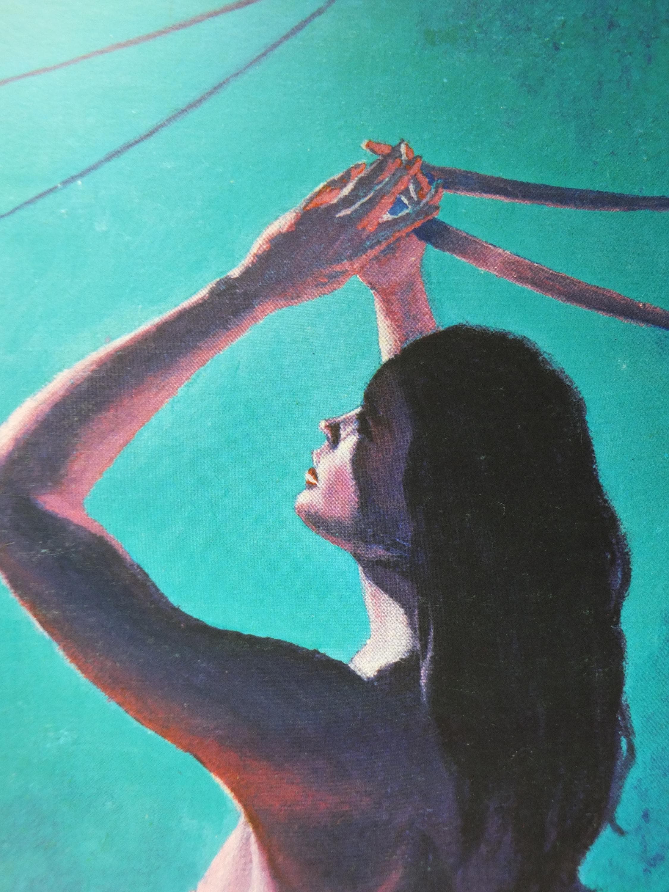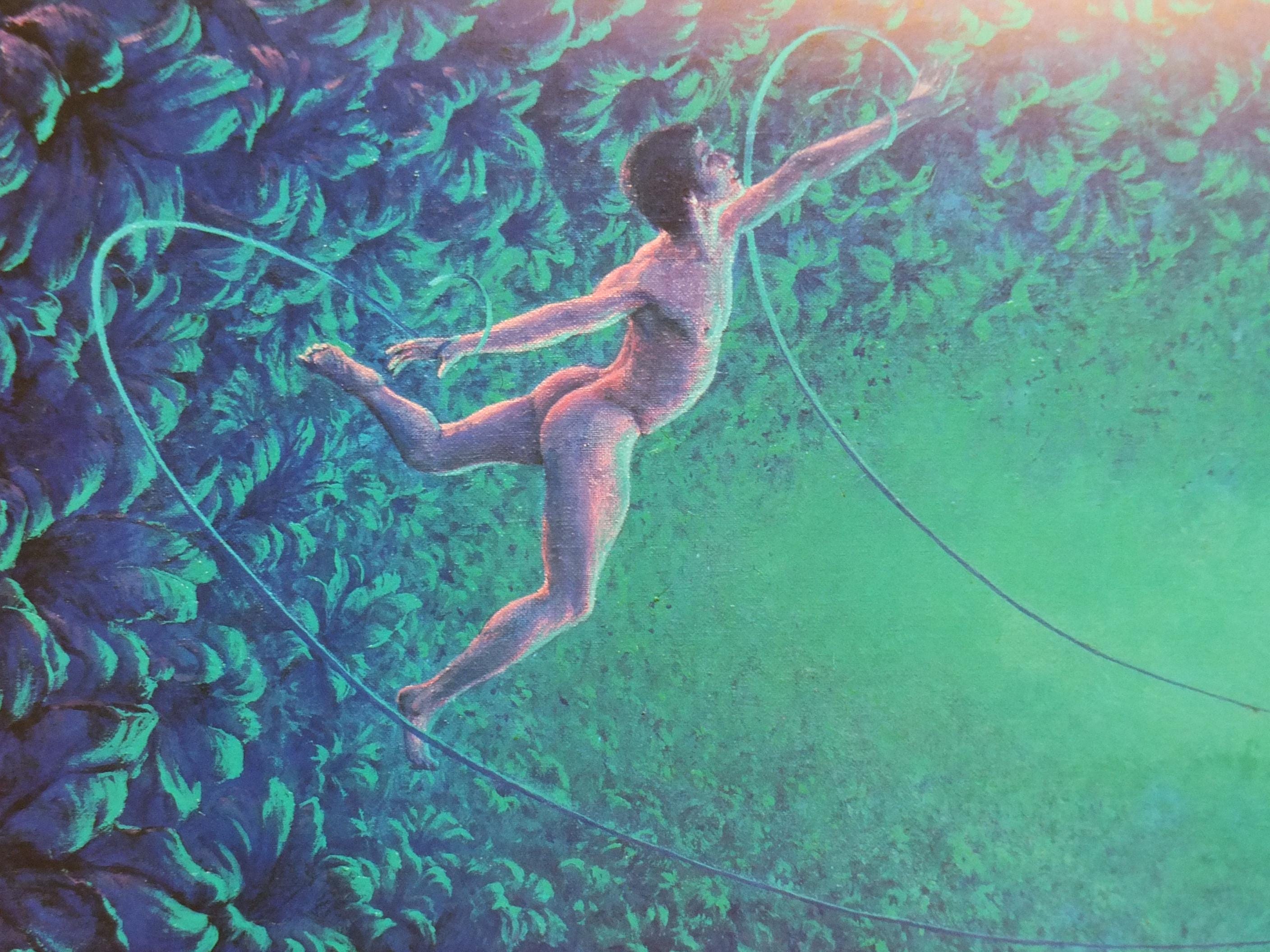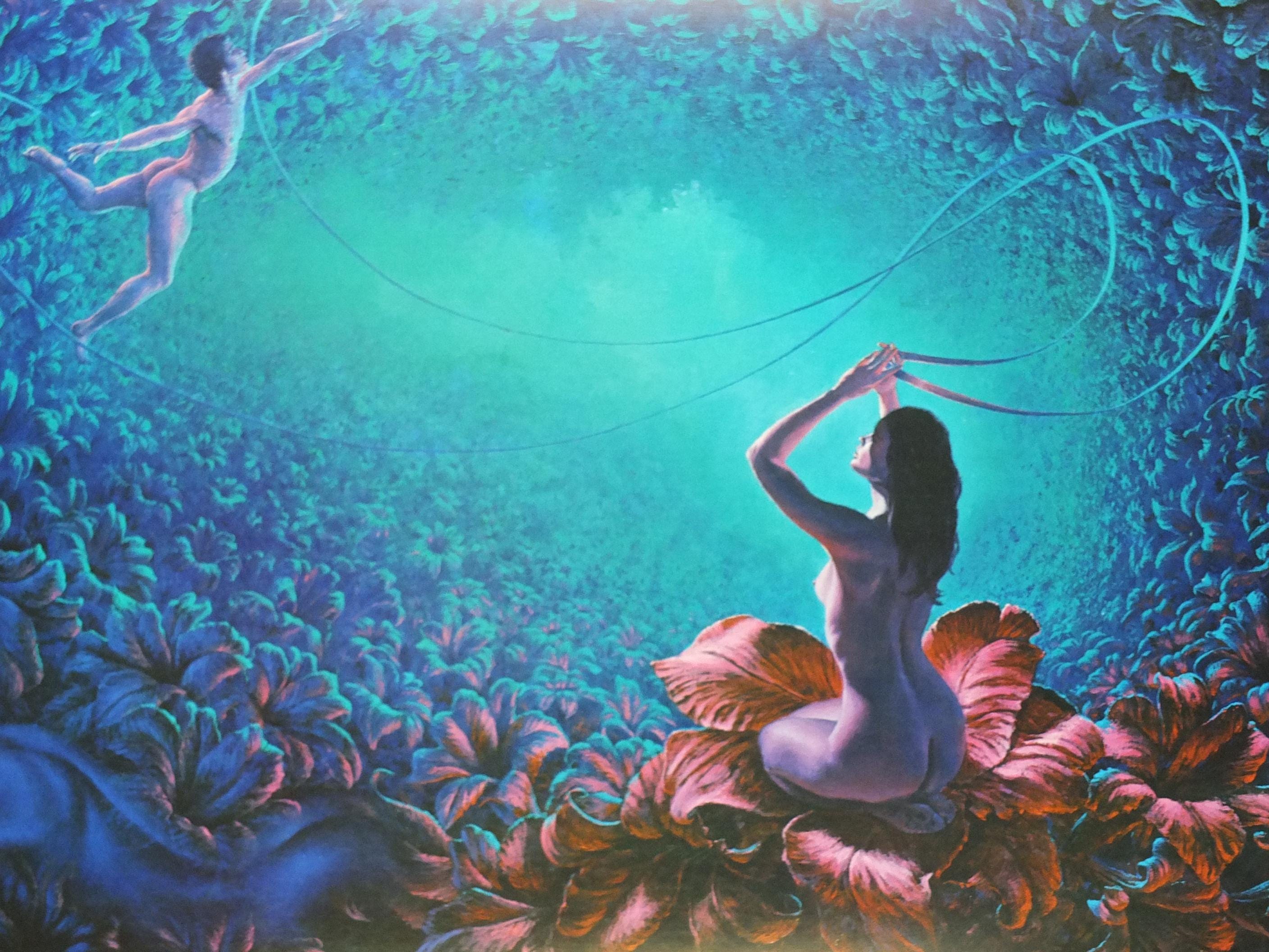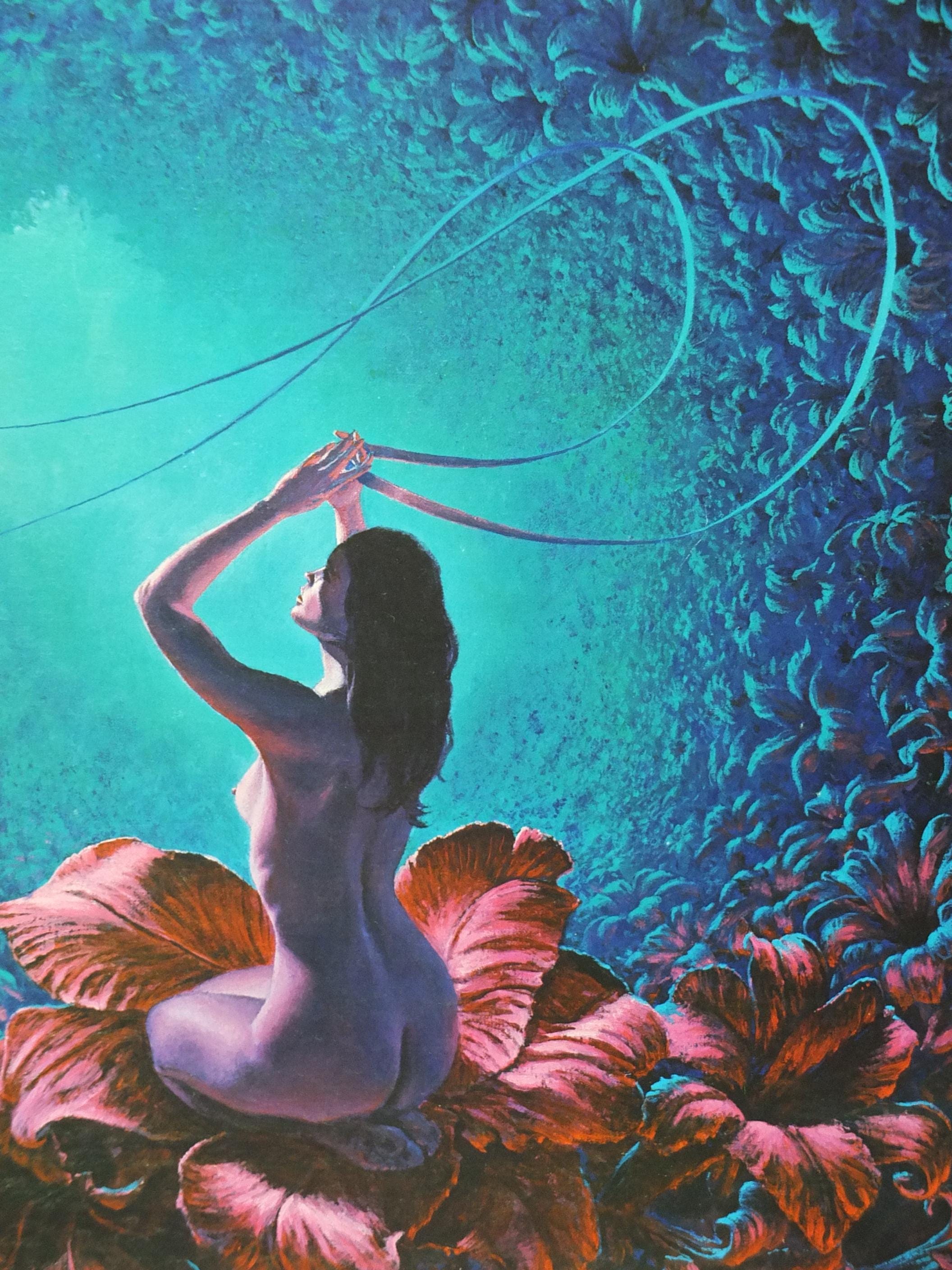 This is a Stephen Pearson poster from 1977 titled "Le Reve en Bleu" or "The Dream in Blue". It shows a nude female figure in a lush, surreal, floral landscape who with a whip like device has caught a flying man who may be under the sea, trying to swim towards the surface.