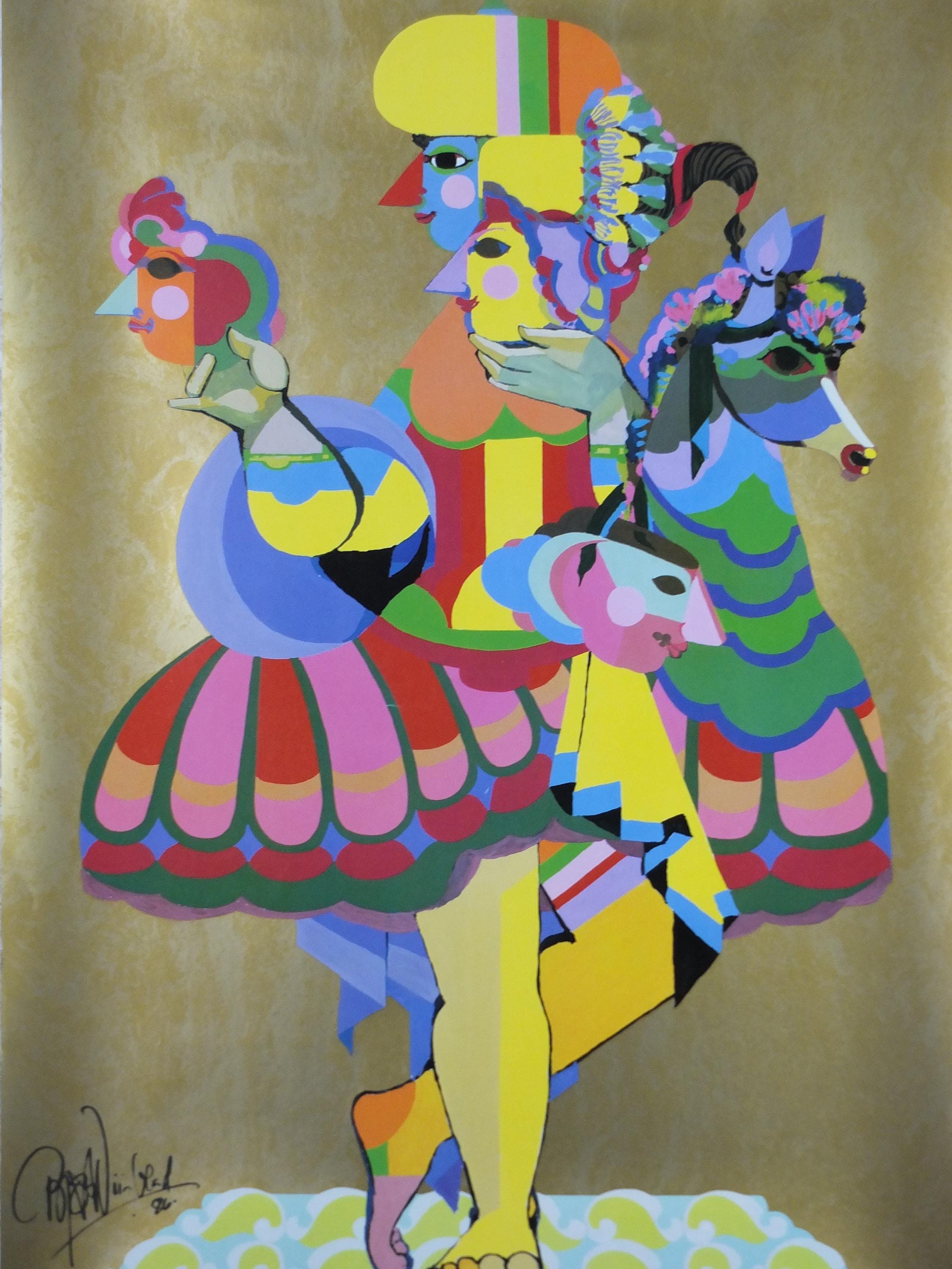 It shows a vibrant, abstract figure—or possibly a collection of intertwined figures—that strongly evokes the spirit of Carnival or a masquerade. The colorful masks, elaborate headpieces, and dynamic pose perfectly embody the "Fun Ship" vibe that Carnival is known for. One of the figures even has a mask resembling a horse's head, and the clothing is bright and festive.