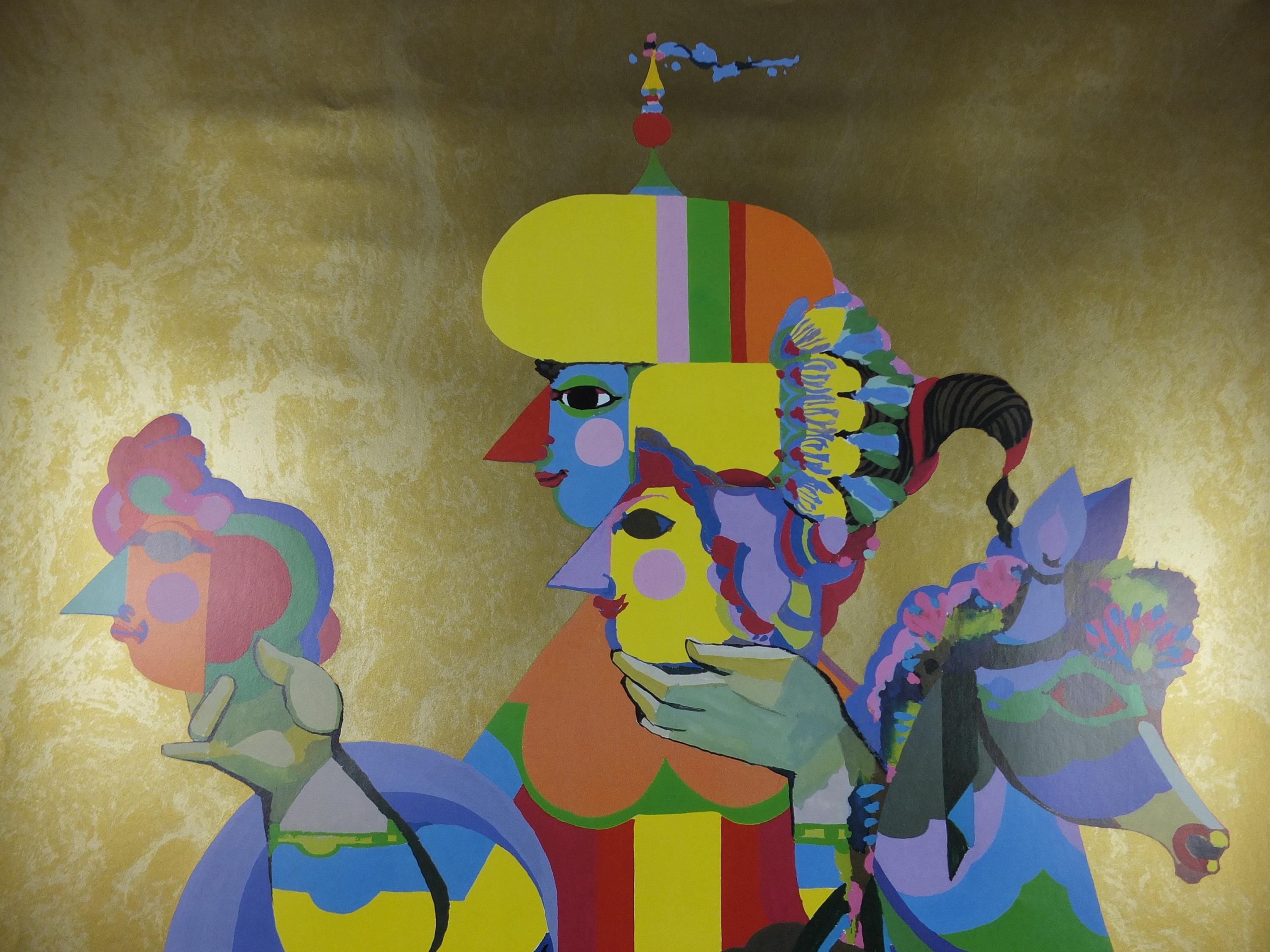 Bjørn Wiinblad was a Danish painter, designer and artist in ceramics, silver, bronze, textiles, and graphics. His work includes whimsical round-faced people, dressed in vaguely 19th-century costume. They are often surrounded by natural elements: twining vines, floral wreaths, and fantastical trees. When Wiinblad employed color, he did so with great assurance. His colors are saturated and strong—sometimes almost psychedelic—and are often supplemented with metallic gold or silver.