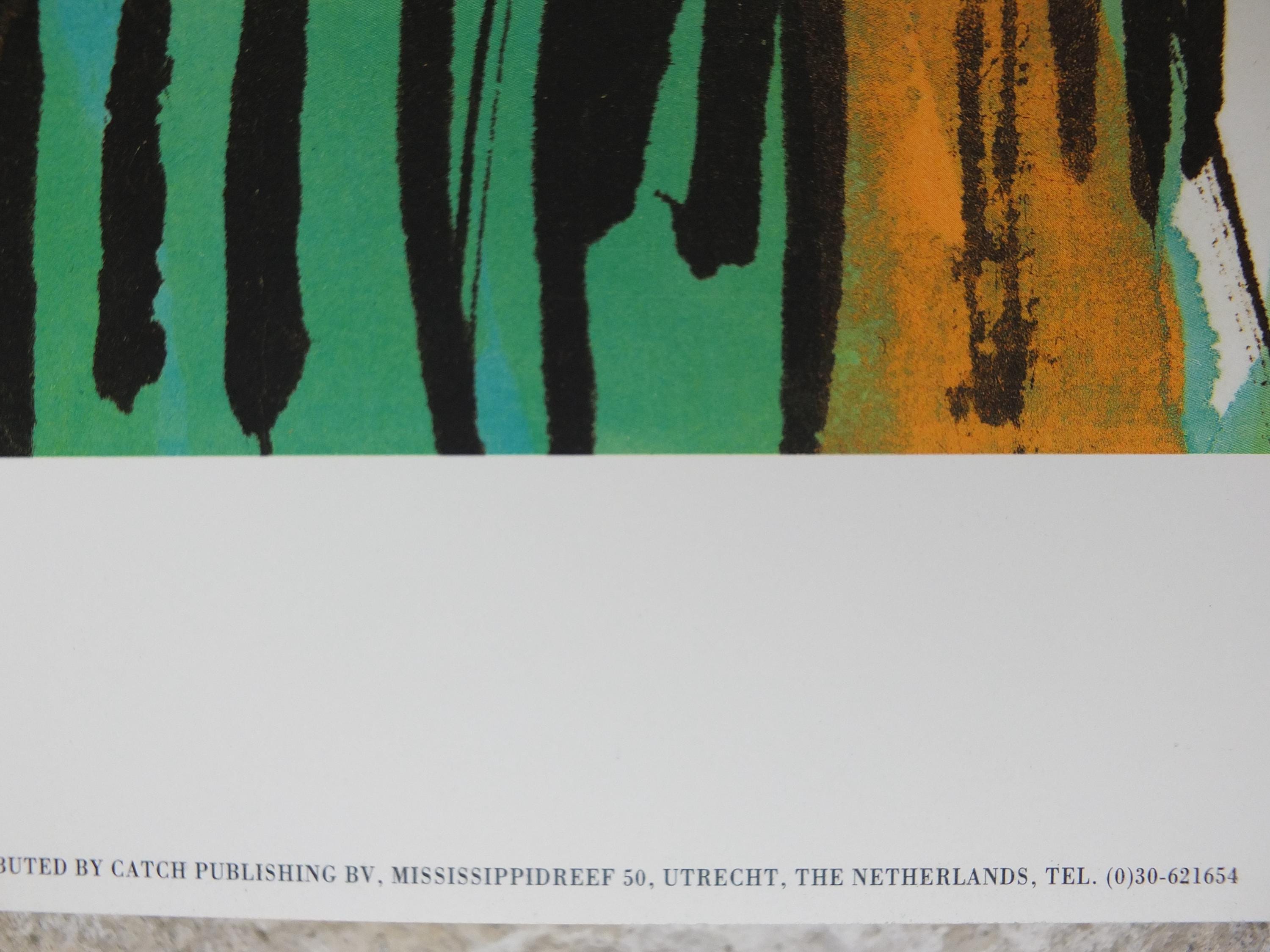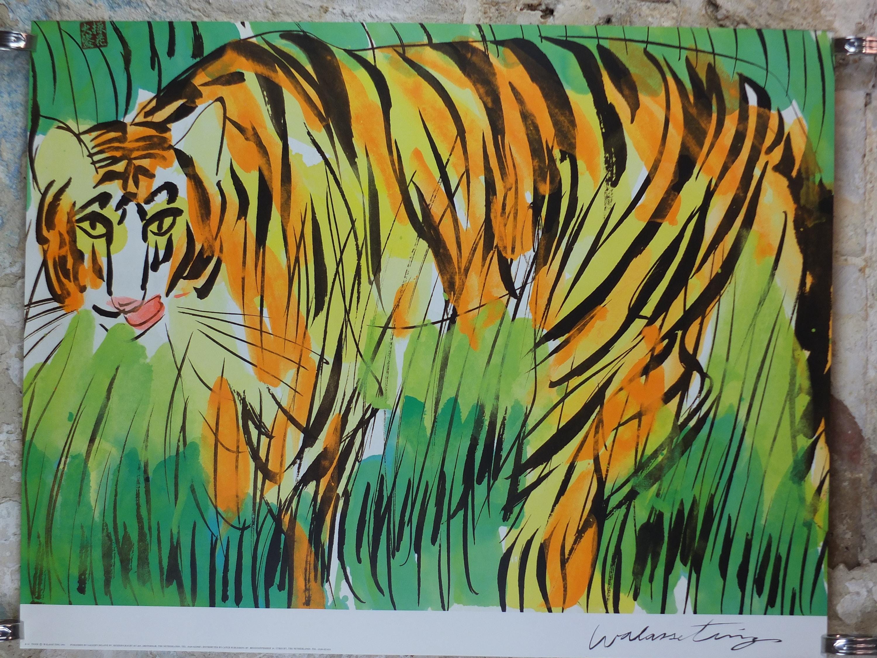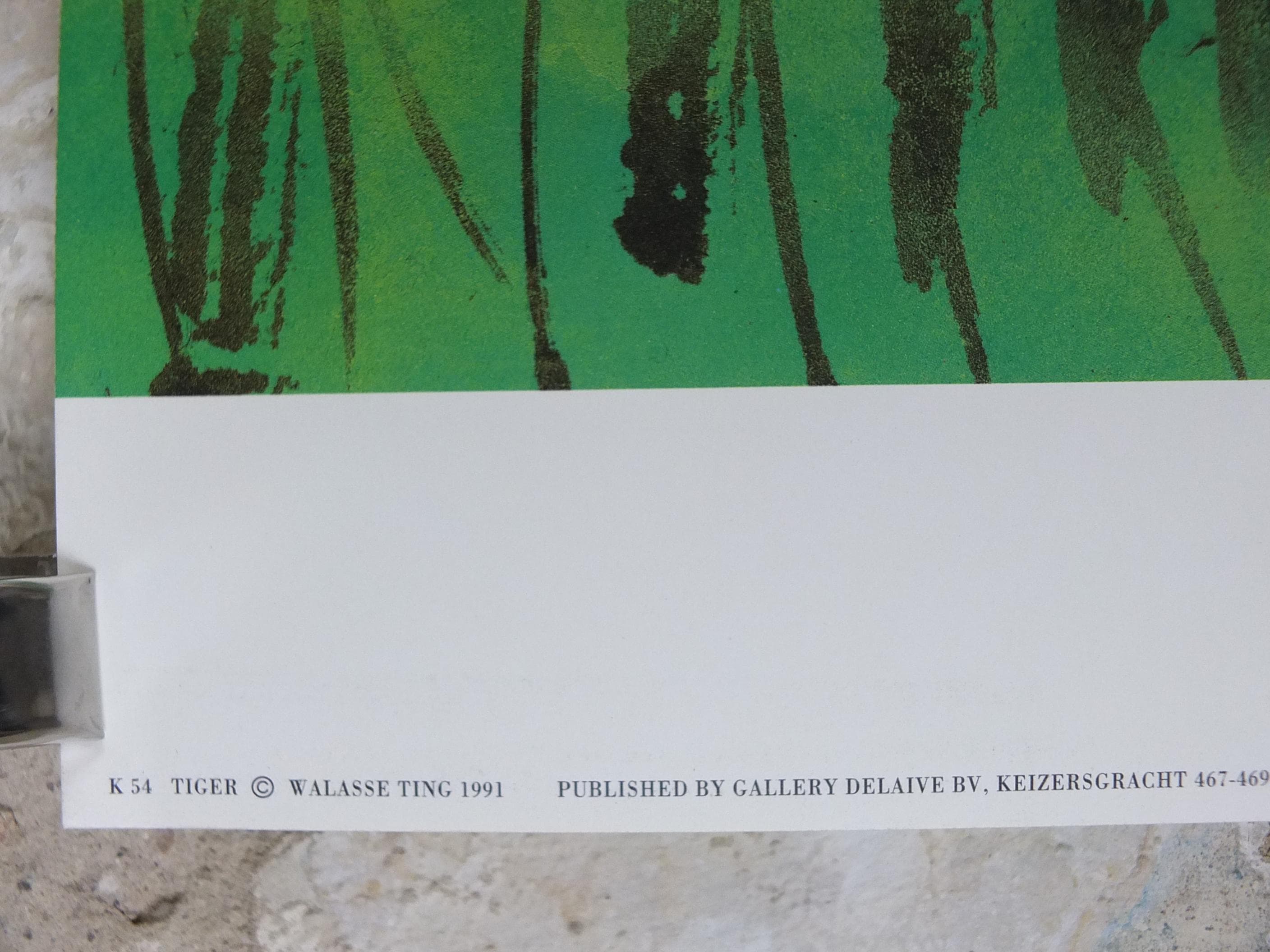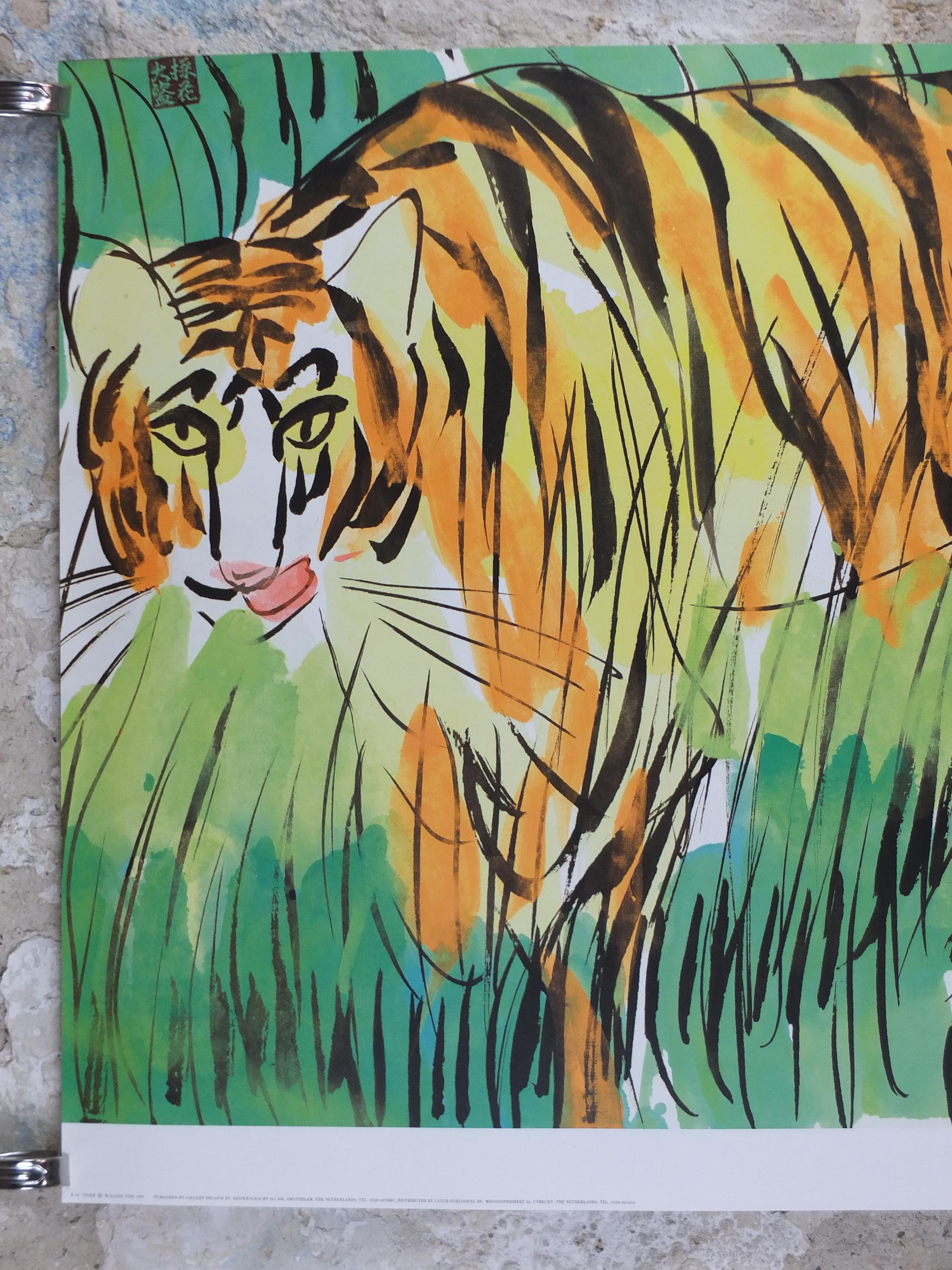 This magnificant and colourful Walasse Ting exhibition poster is from the Galerie Delaive in Utrecht, The Netherlands for an exhibition in 1991 featuring "Tiger" from 1991 and shows a tiger drawn in bold, sweeping black outline that suggests the use of Chinese calligraphy. This outline serves to define the form of the tiger, which is then vividly filled with the artist's signature palette of dazzling, often neon acrylic colors, imbuing the creature with a sense of energy.
