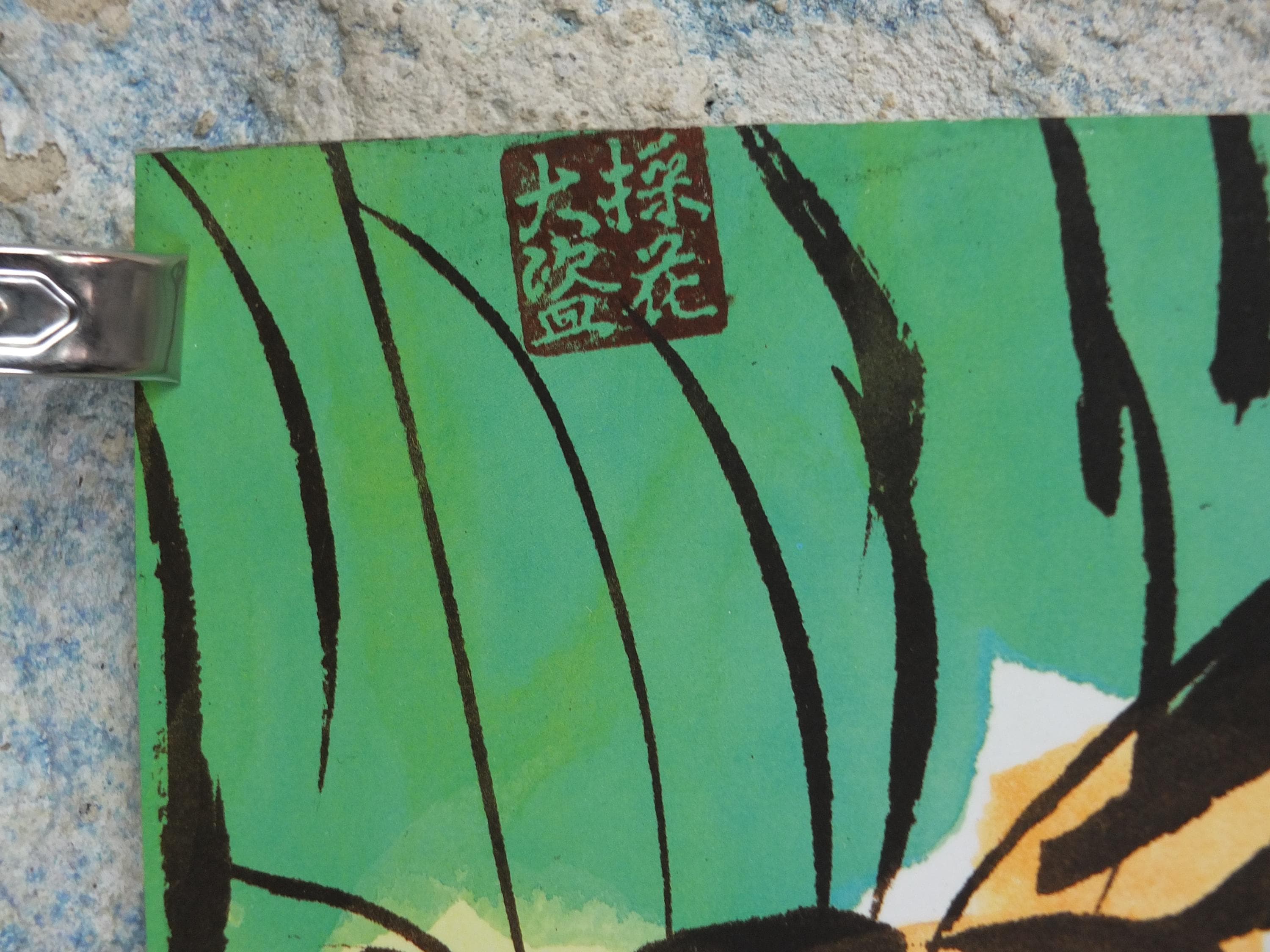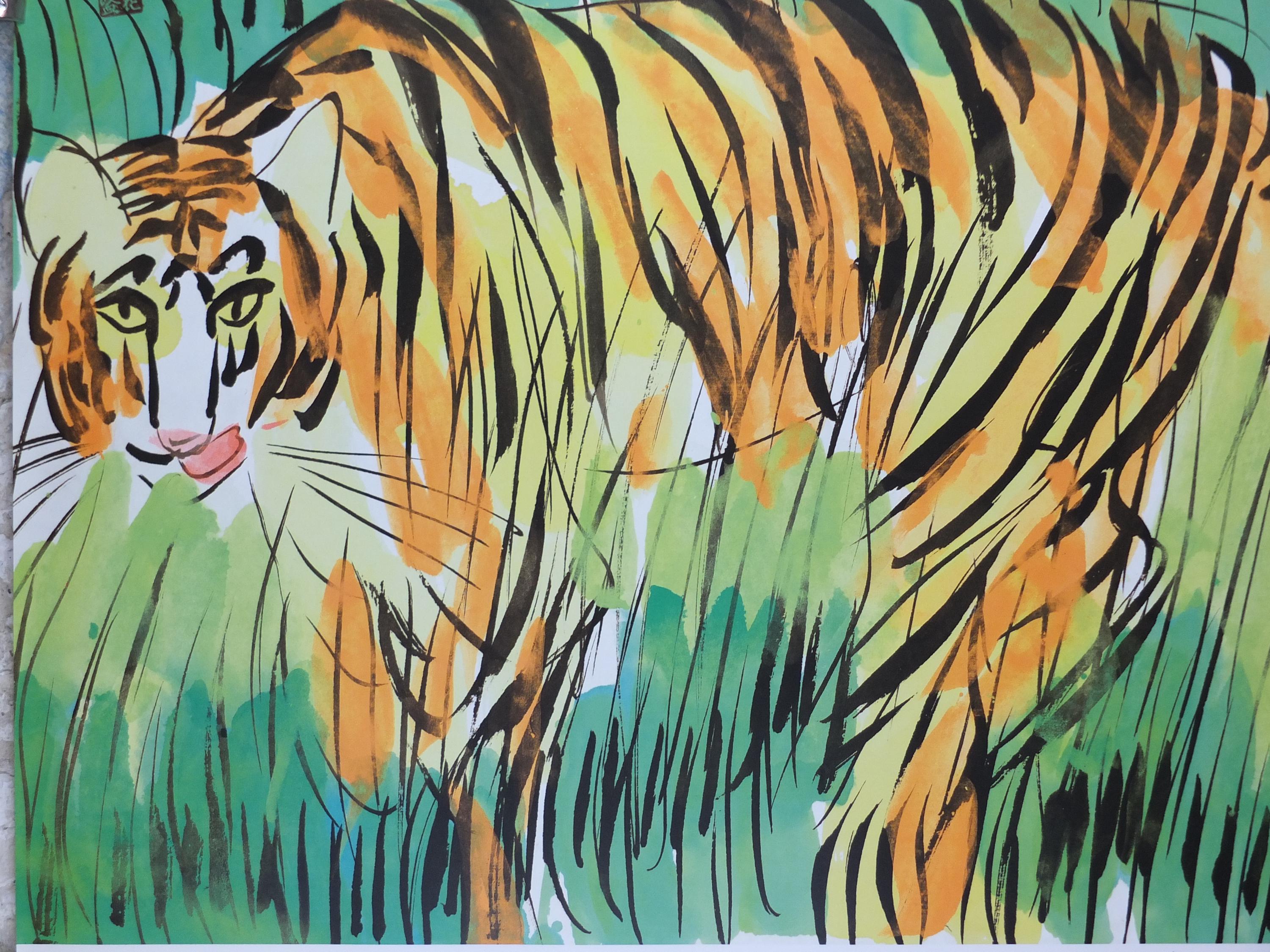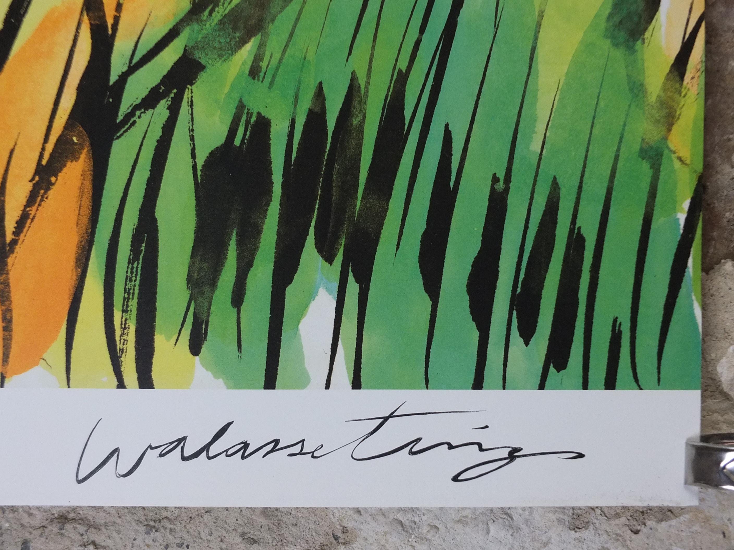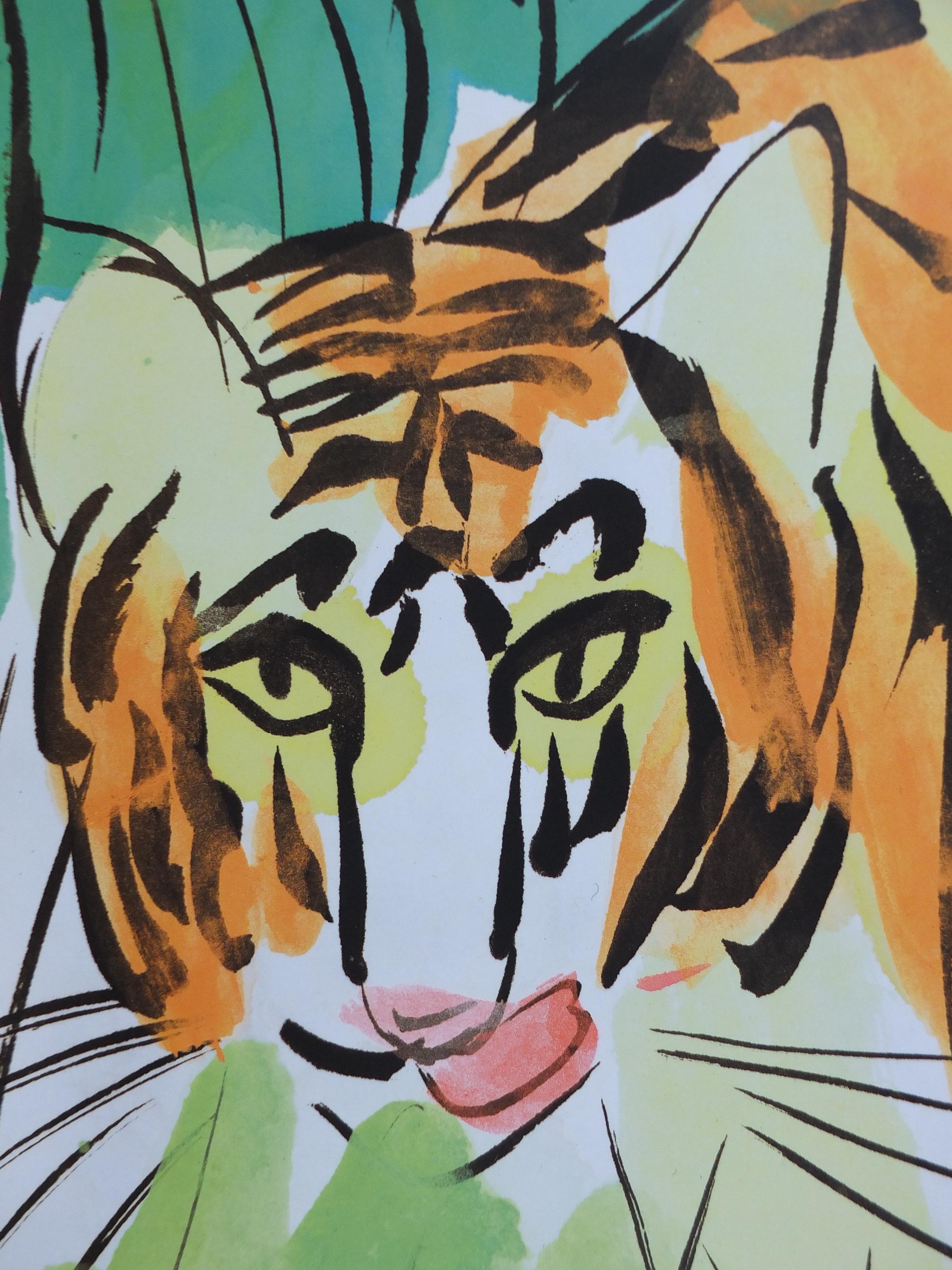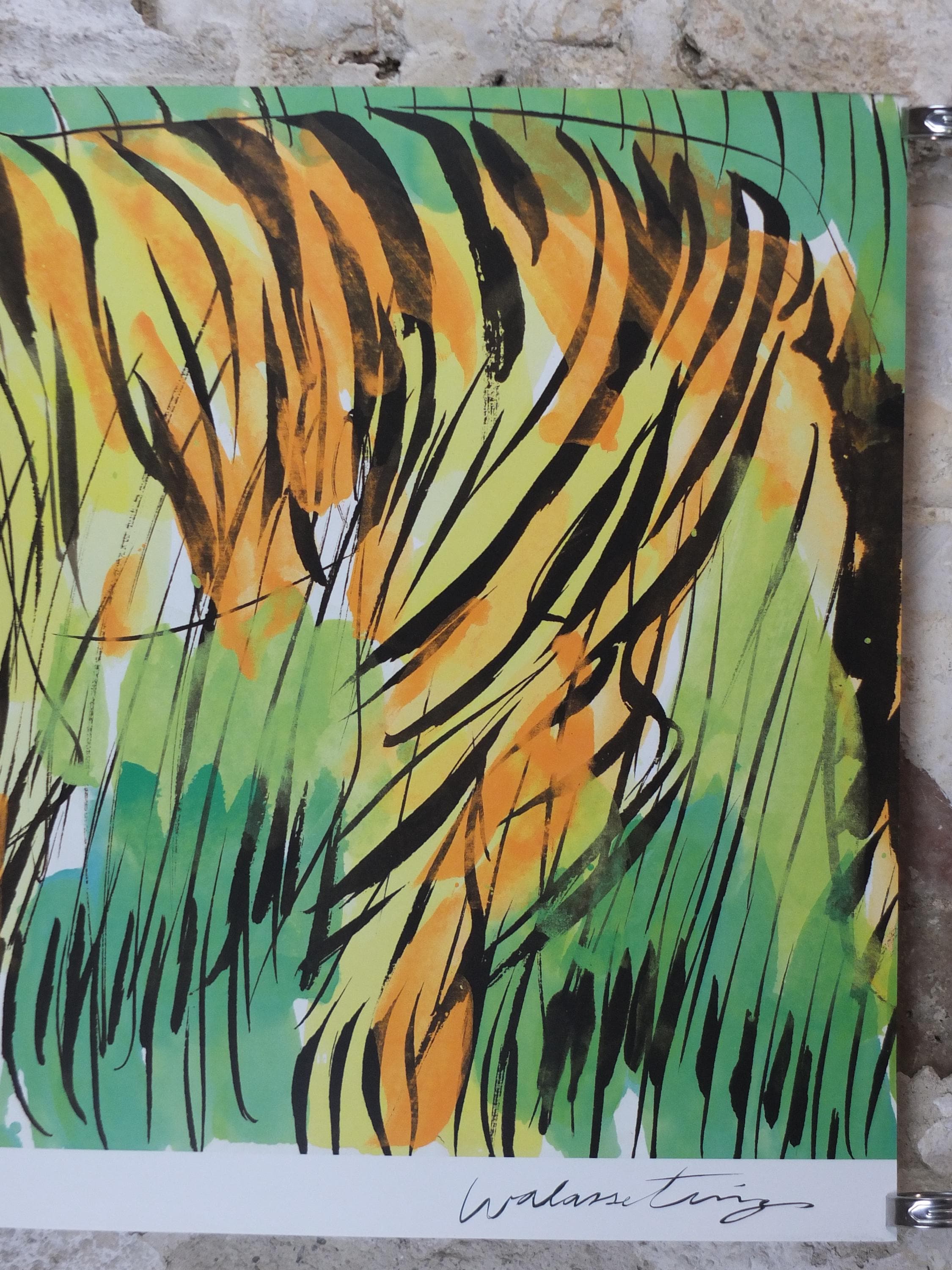 This magnificant and colourful Walasse Ting exhibition poster is from the Galerie Delaive in Utrecht, The Netherlands for an exhibition in 1991 featuring "Tiger" from 1991 and shows a tiger drawn in bold, sweeping black outline that suggests the use of Chinese calligraphy. This outline serves to define the form of the tiger, which is then vividly filled with the artist's signature palette of dazzling, often neon acrylic colors, imbuing the creature with a sense of energy.