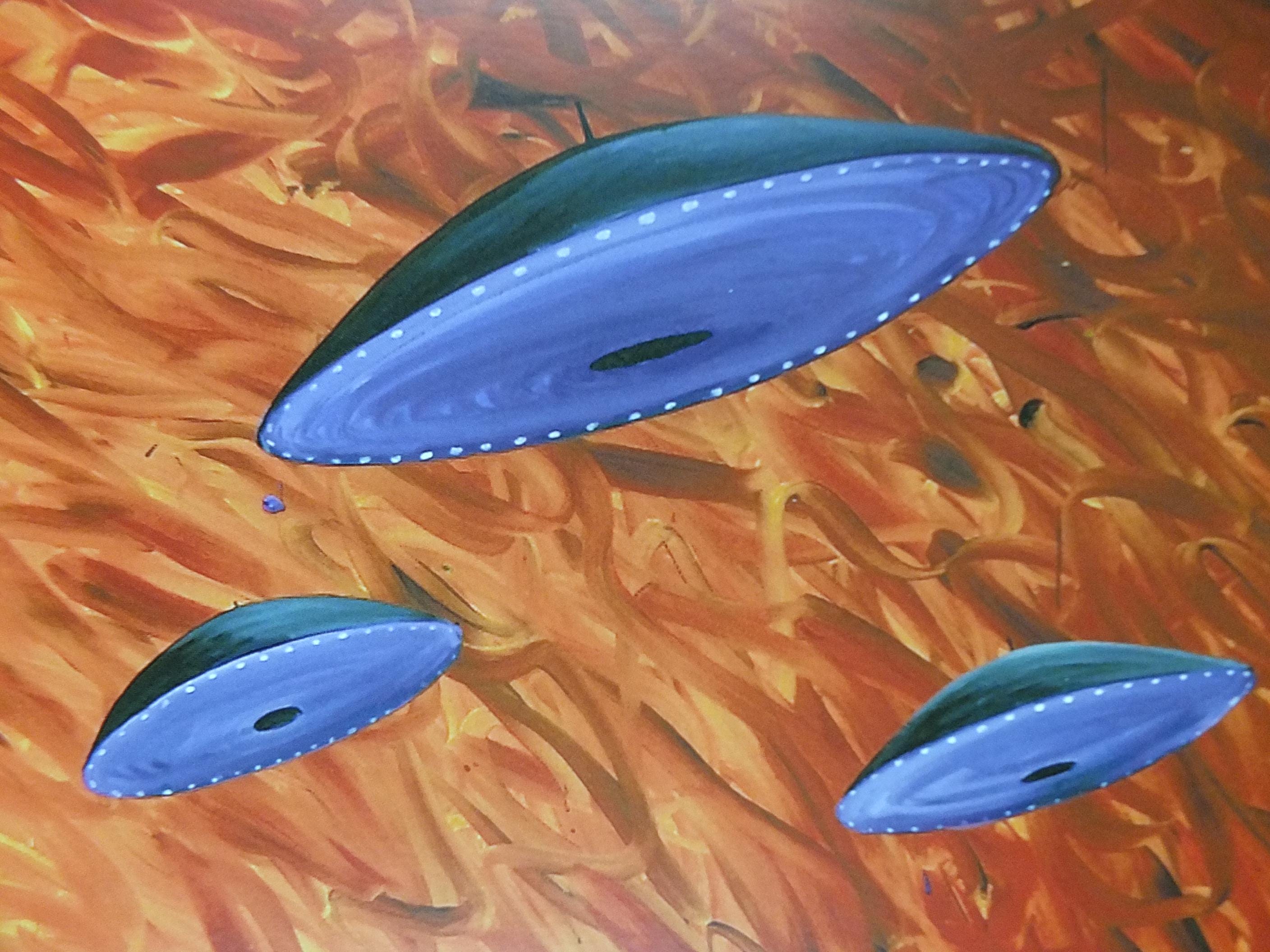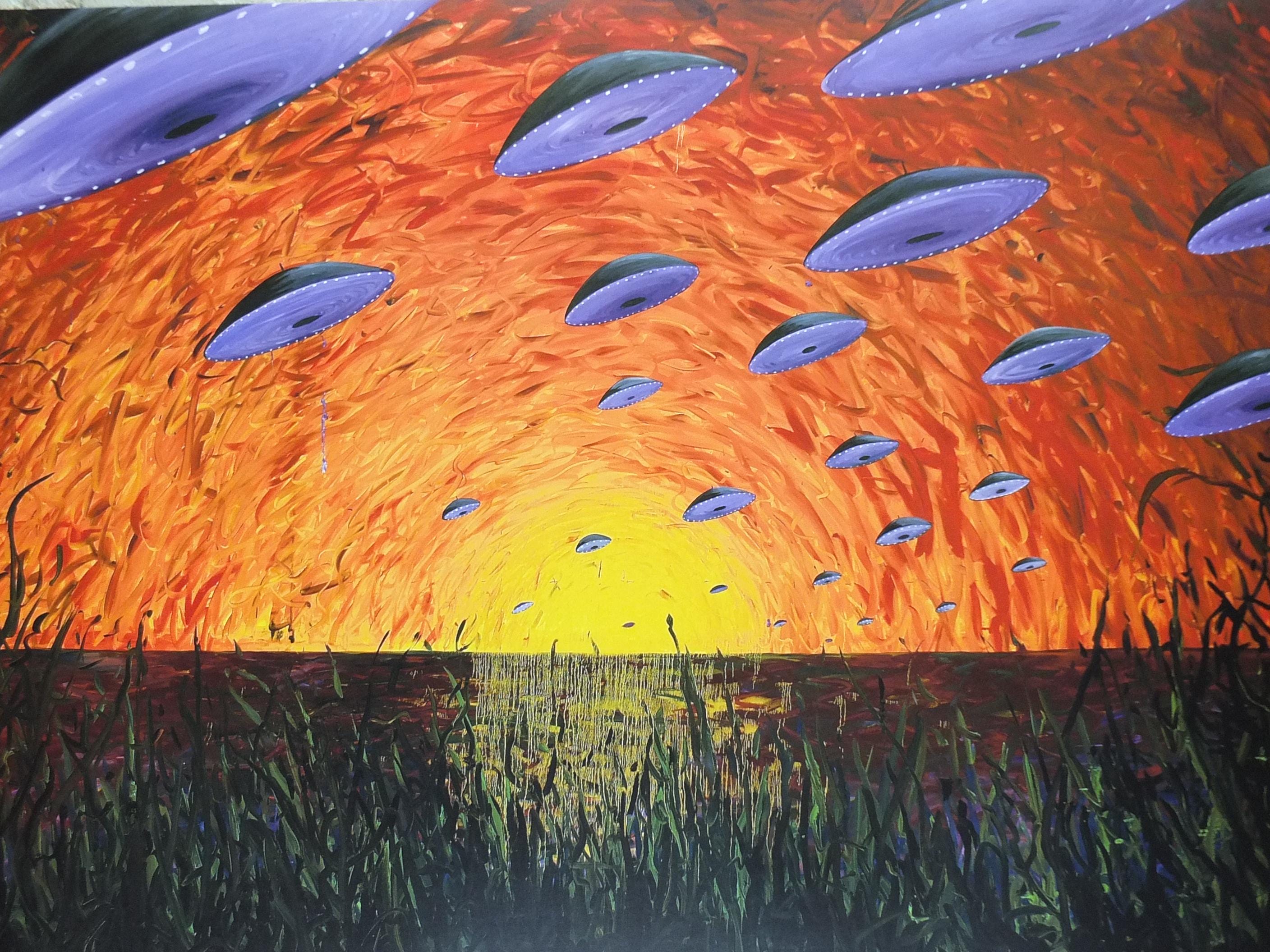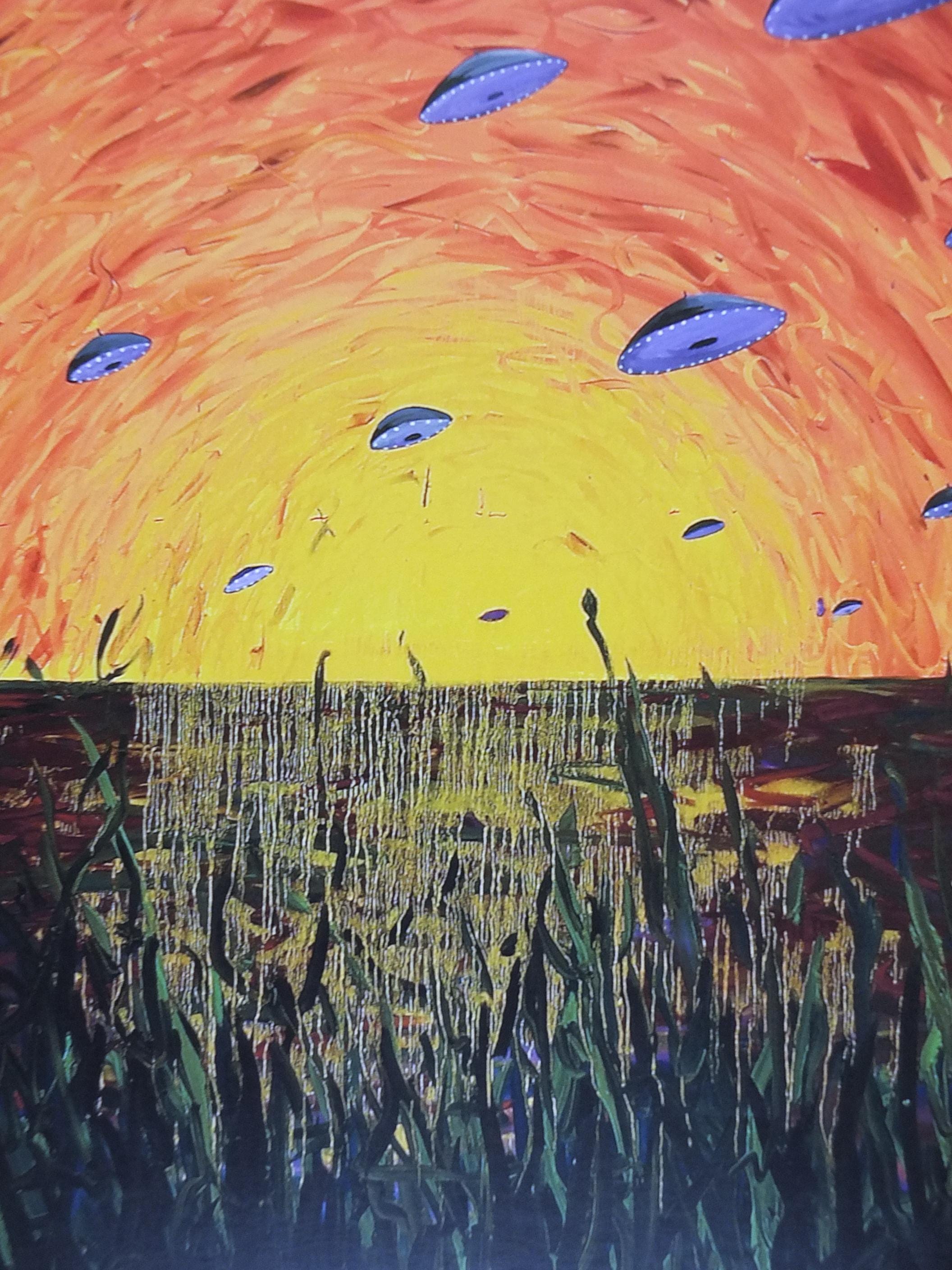 The poster shows a sunset or sunrise over a dark landscape, filled with tall grasses. The most notable element is a swarm of purple, disc-shaped objects—clearly reminiscent of classic UFOs—that are flying towards or away from the central light source.