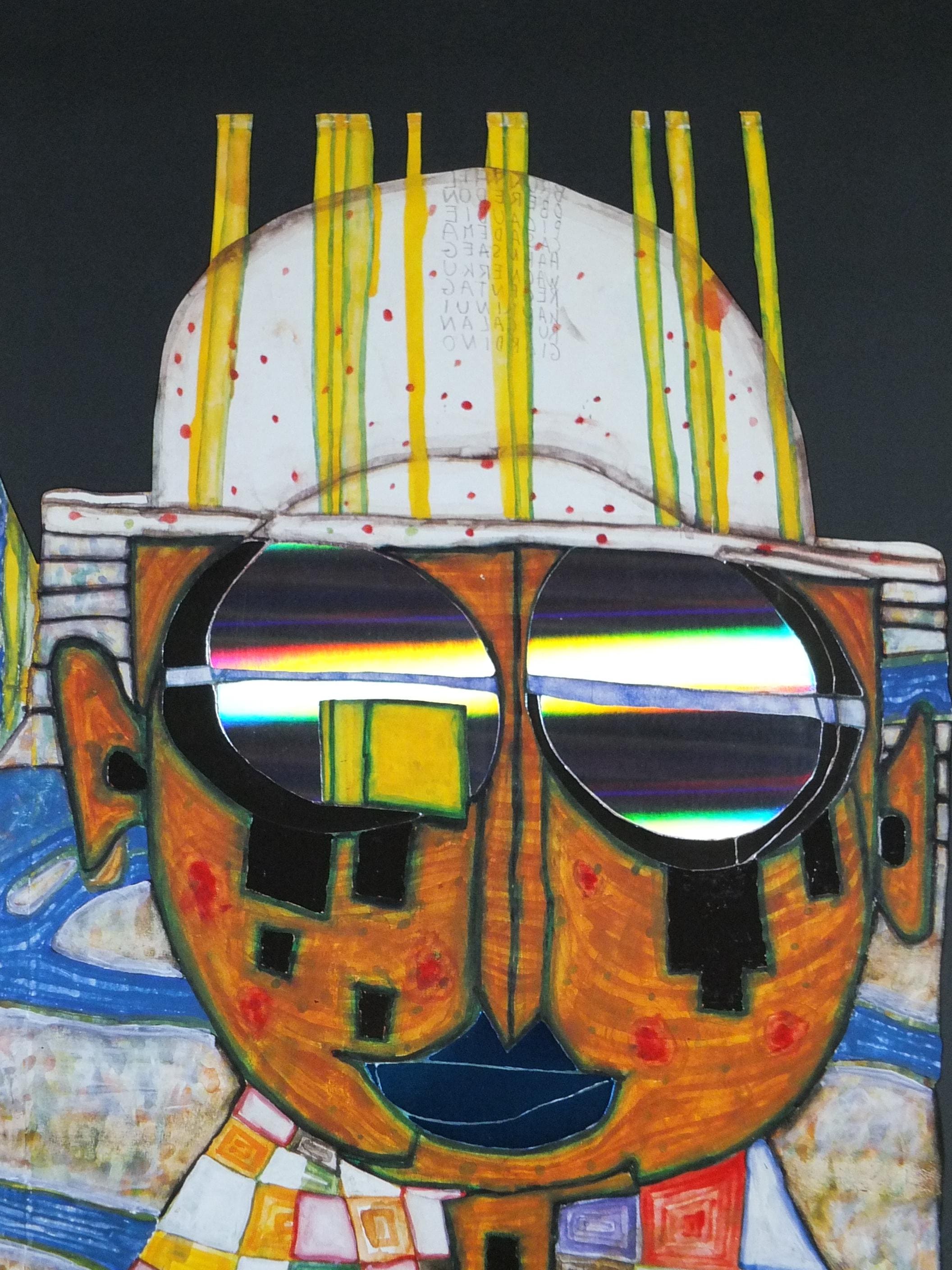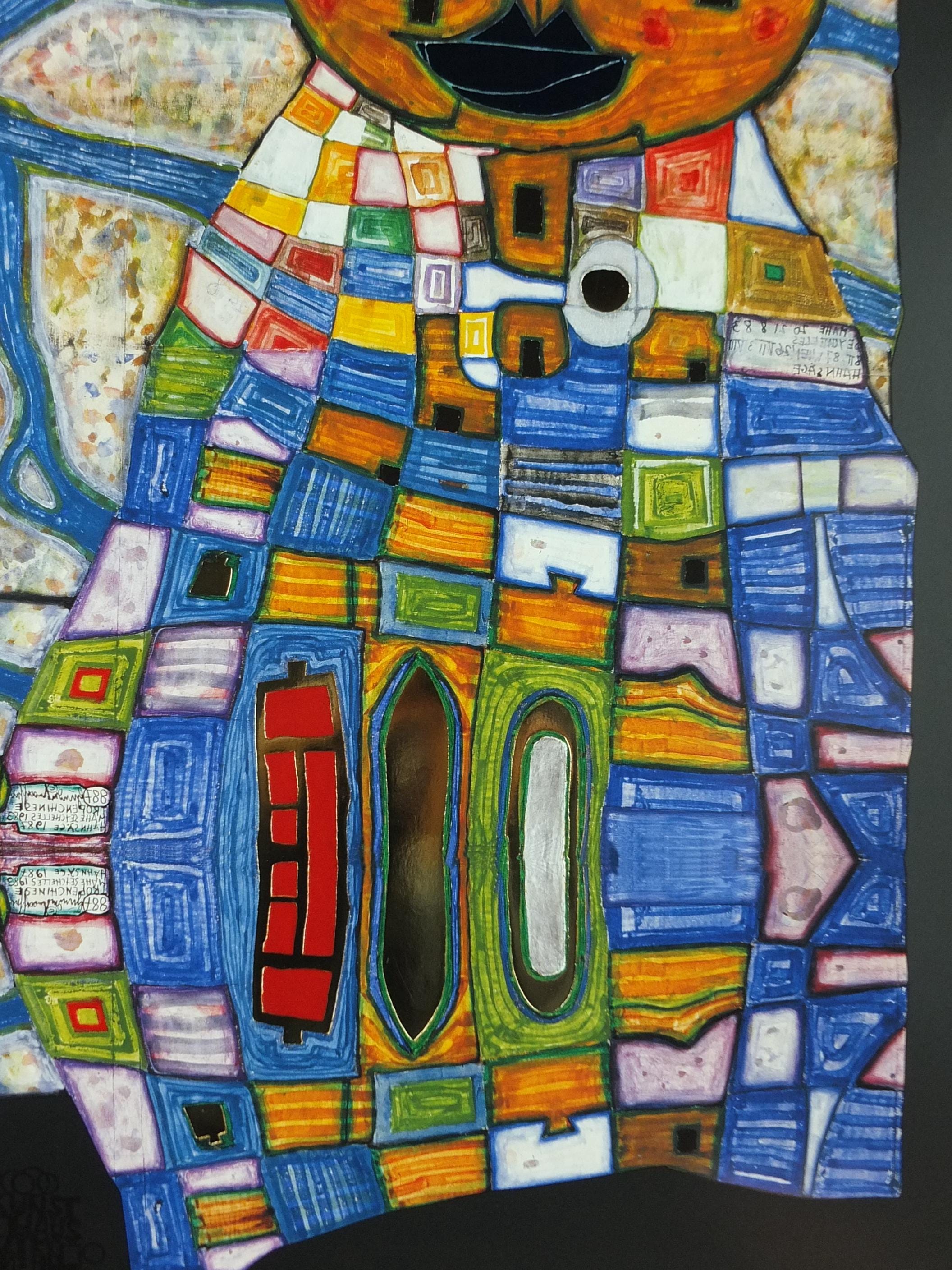 Hundertwasser described the figure in the painting as wearing a "tropical helmet" and a "costume [that] is architectural... composed of parcels, like dwelling units," reflecting his philosophy of organic and humane architecture.