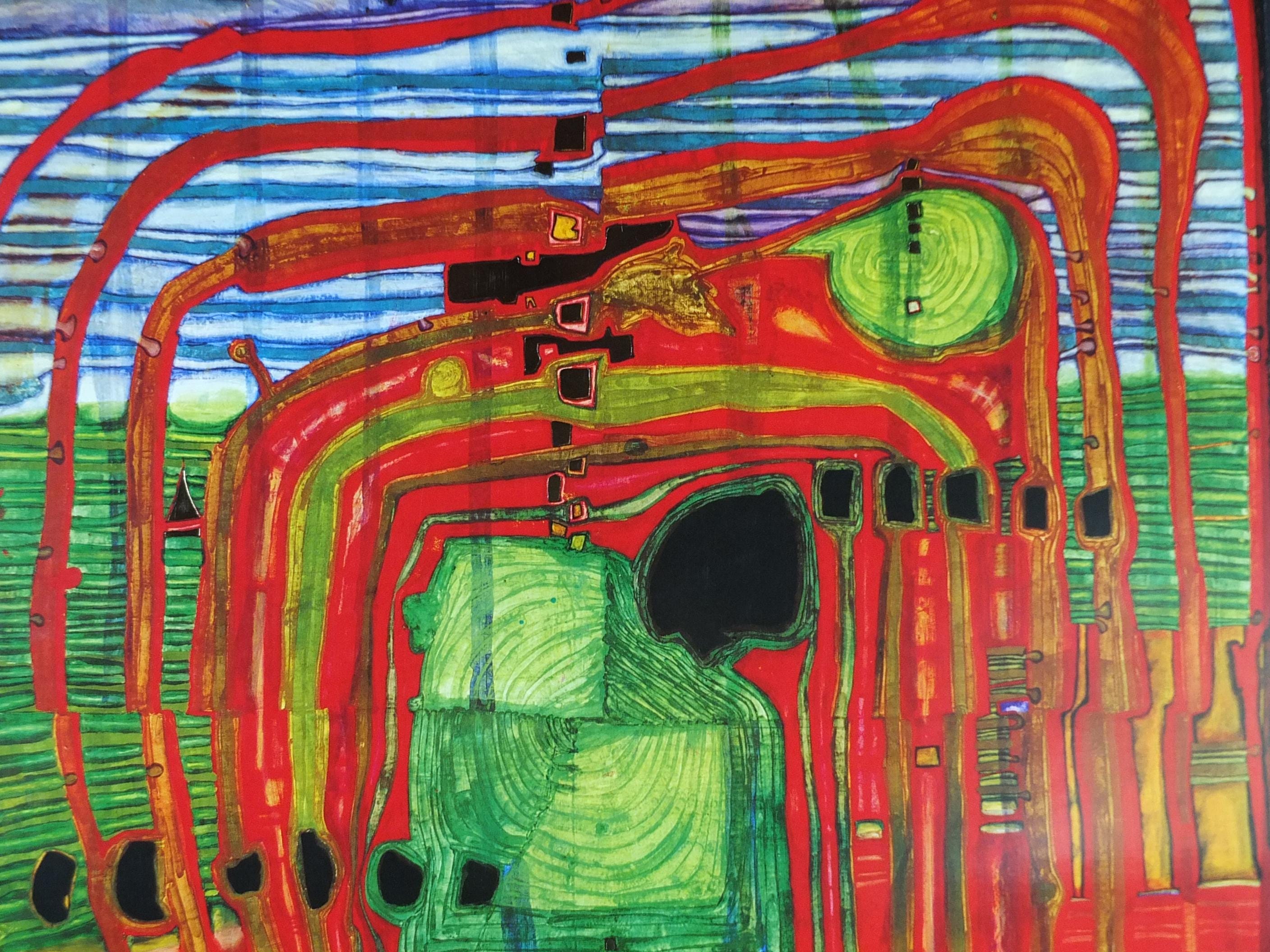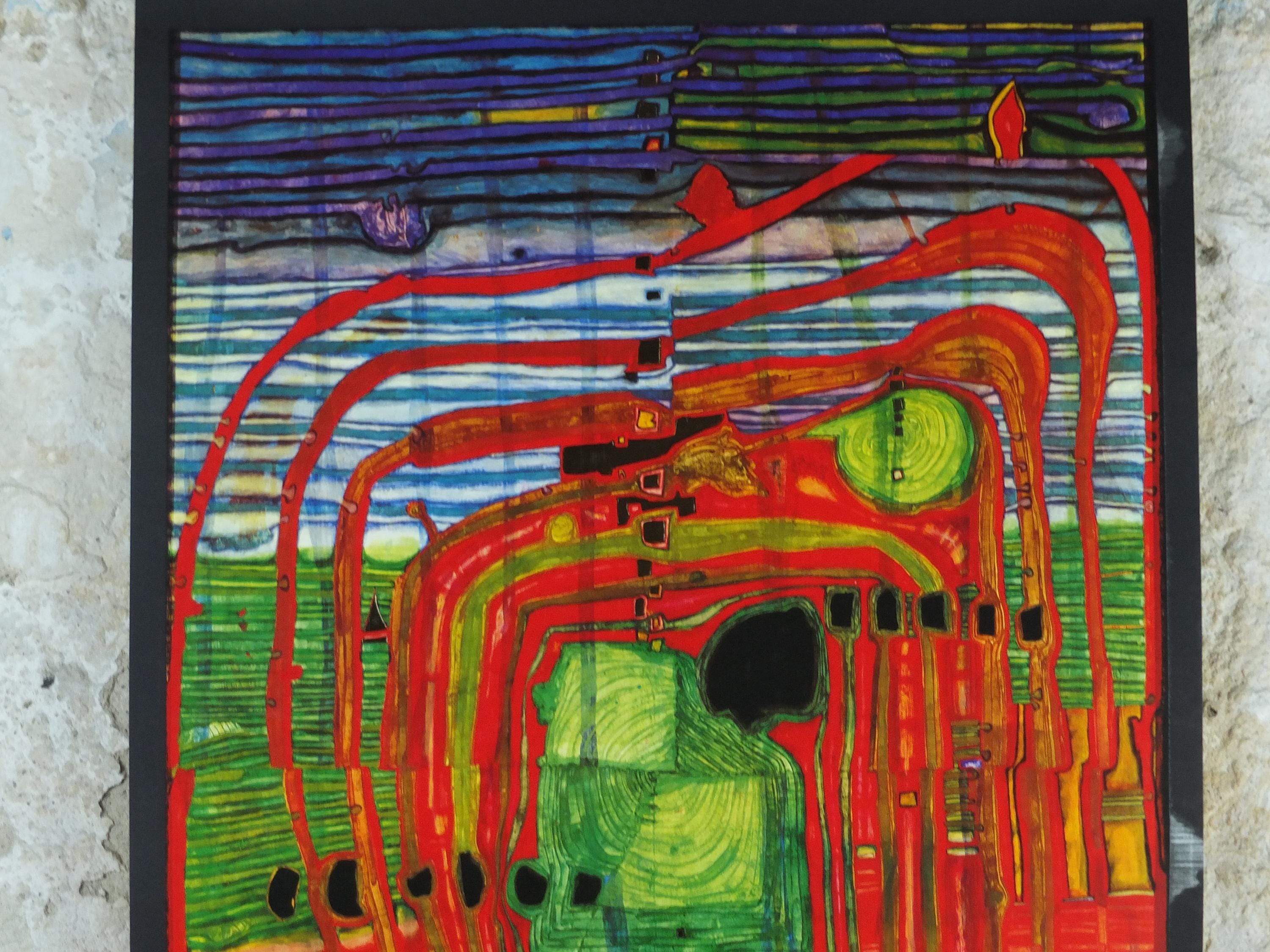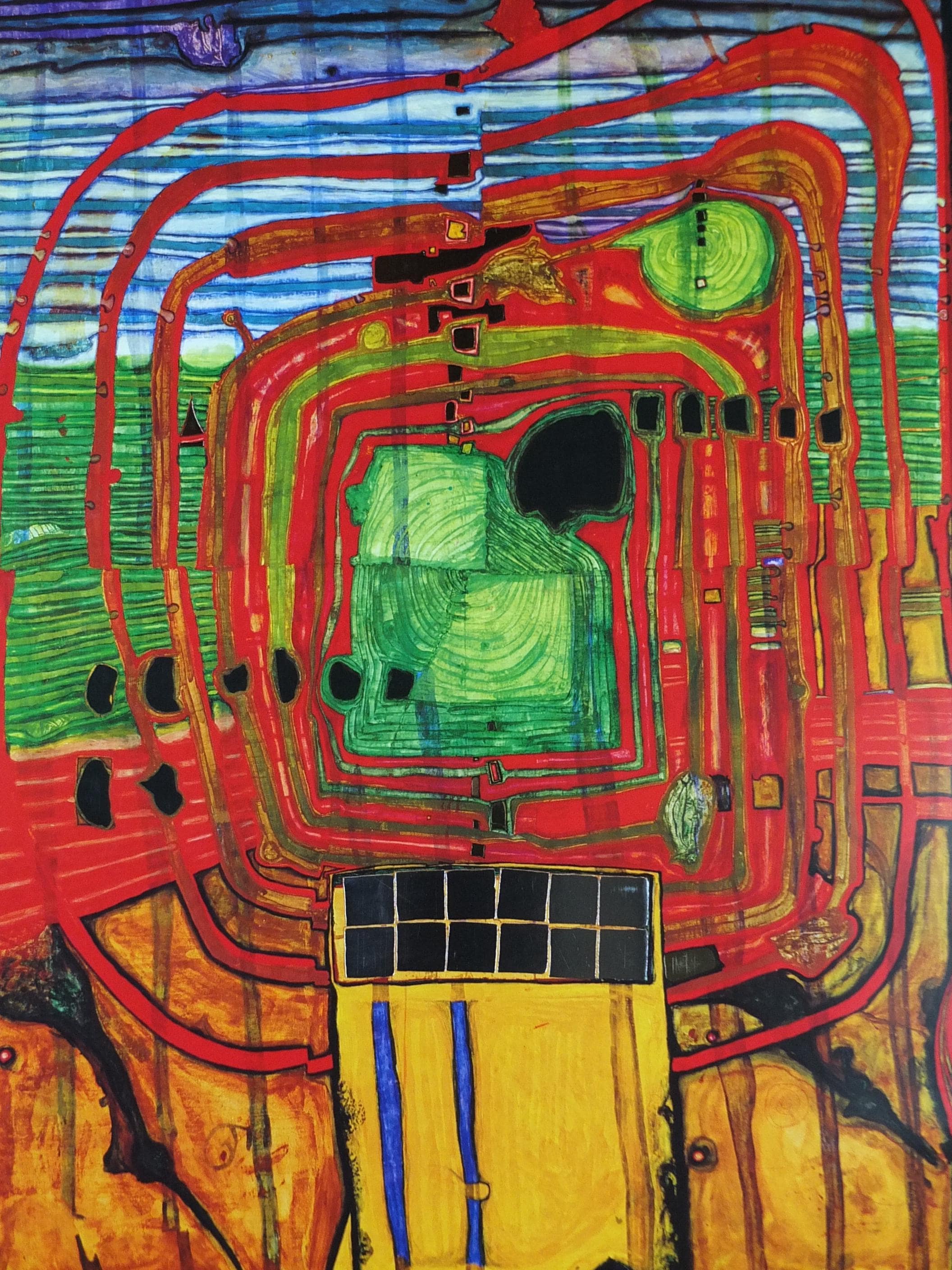 Hundertwasser's comment on the work, "To me the most honest form of Tachism was total self-renunciation: if a painter climbs up a ladder with a bucket of paint and shoots himself up there, letting the paint fall "automatically" onto the canvas waiting on the floor, that is the most sublime act of Tachistic self-renunciation. The canvas is like a jumping sheet, the paint sticks to it, the dead initiator falls through it. Painting blind- blindfolded - or drawing left-handed - when you're right-handed - are not so totally honest, and when you let snails, monkeys, donkey tails, elephant trunks do the painting, it is somebody else doing the work, albeit Tachistically correctly. With this picture I wanted to show very lucidly and immediately and precisely how a Tachistically fluidoid-spiraloid painting done in a state of complete awareness looks as if it were from a different viewpoint, a different time and world, when it is painted with the traditional method. I had great respect for Tachism, but as an outsider. "