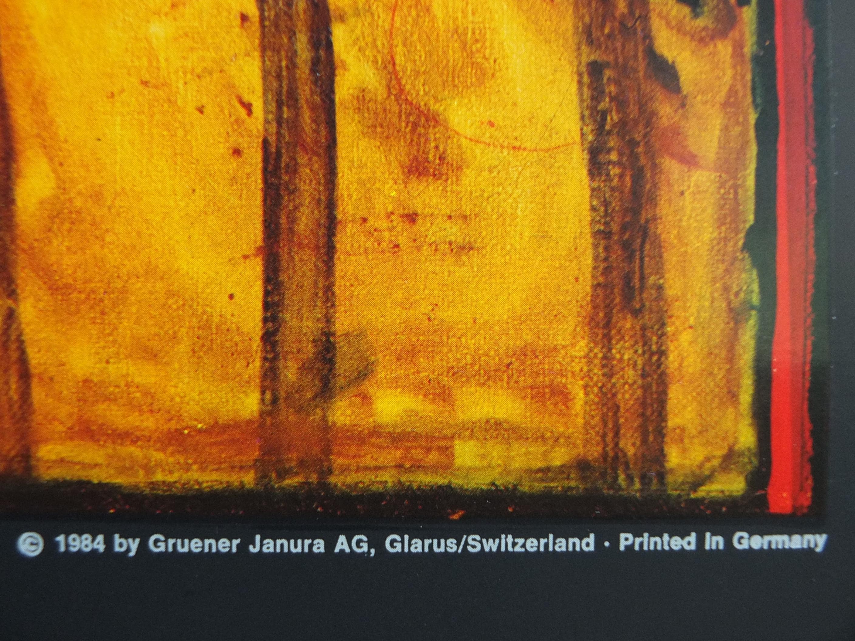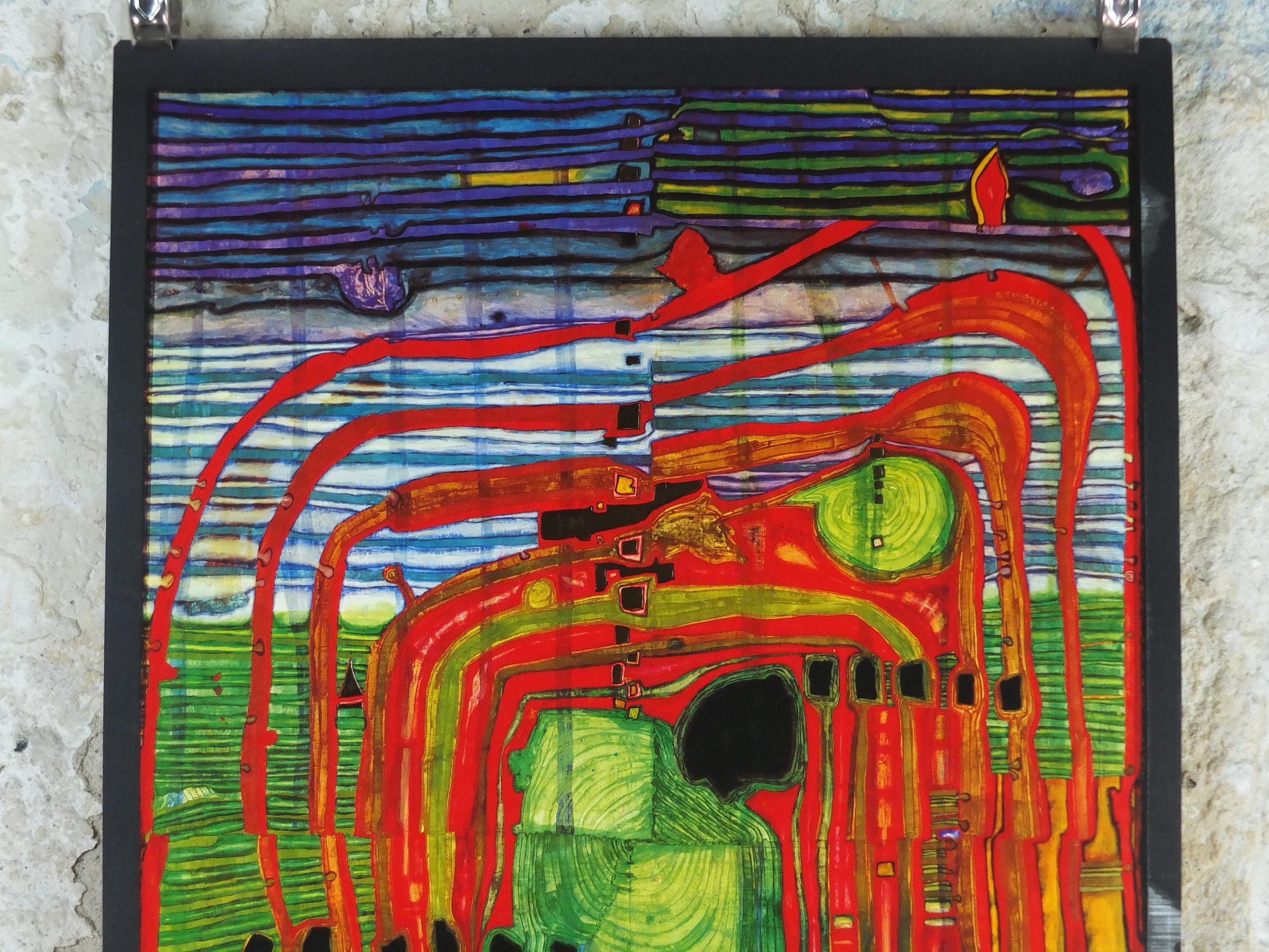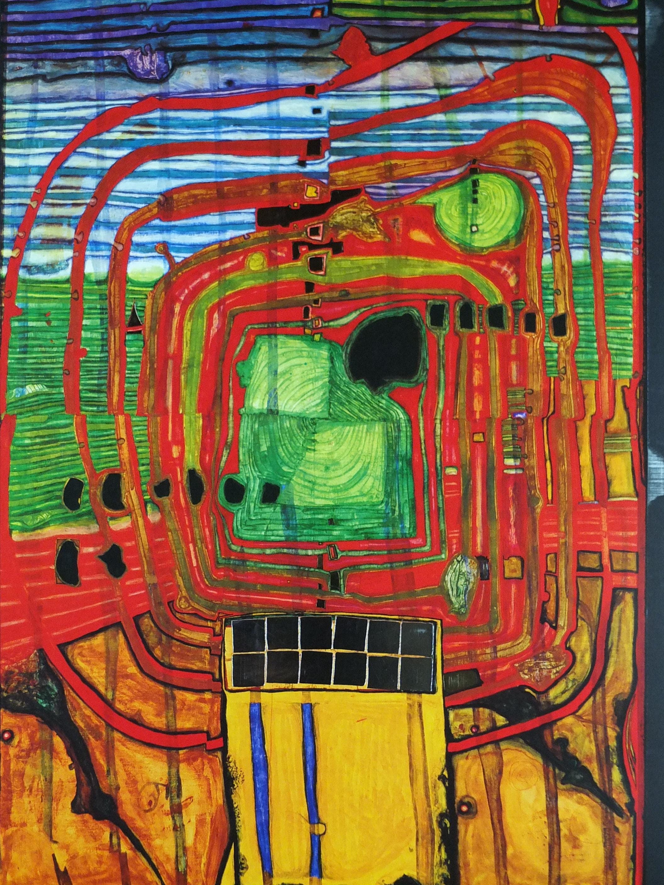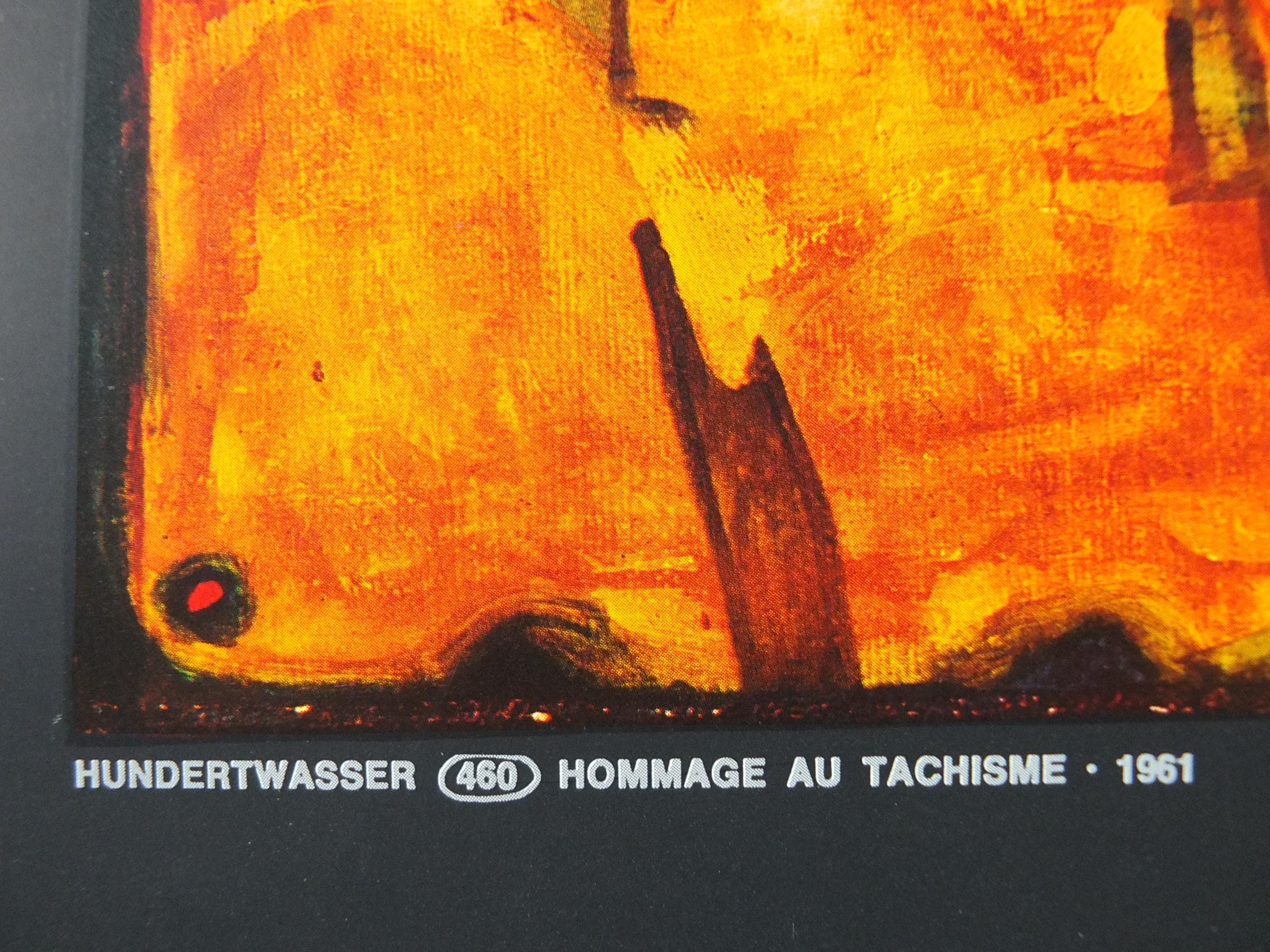 Hundertwasser's comment on the work, "To me the most honest form of Tachism was total self-renunciation: if a painter climbs up a ladder with a bucket of paint and shoots himself up there, letting the paint fall "automatically" onto the canvas waiting on the floor, that is the most sublime act of Tachistic self-renunciation. The canvas is like a jumping sheet, the paint sticks to it, the dead initiator falls through it. Painting blind- blindfolded - or drawing left-handed - when you're right-handed - are not so totally honest, and when you let snails, monkeys, donkey tails, elephant trunks do the painting, it is somebody else doing the work, albeit Tachistically correctly. With this picture I wanted to show very lucidly and immediately and precisely how a Tachistically fluidoid-spiraloid painting done in a state of complete awareness looks as if it were from a different viewpoint, a different time and world, when it is painted with the traditional method. I had great respect for Tachism, but as an outsider. "
