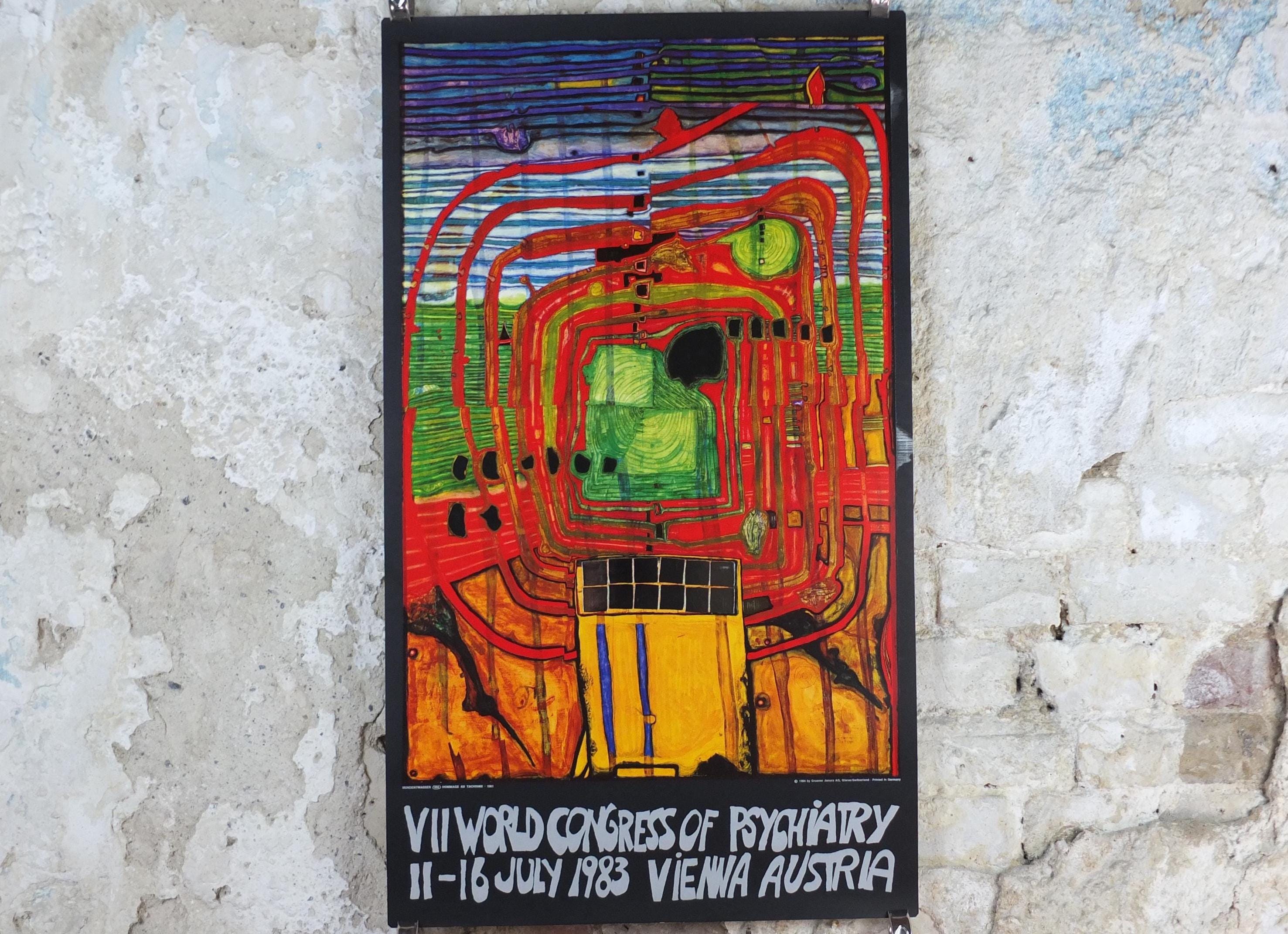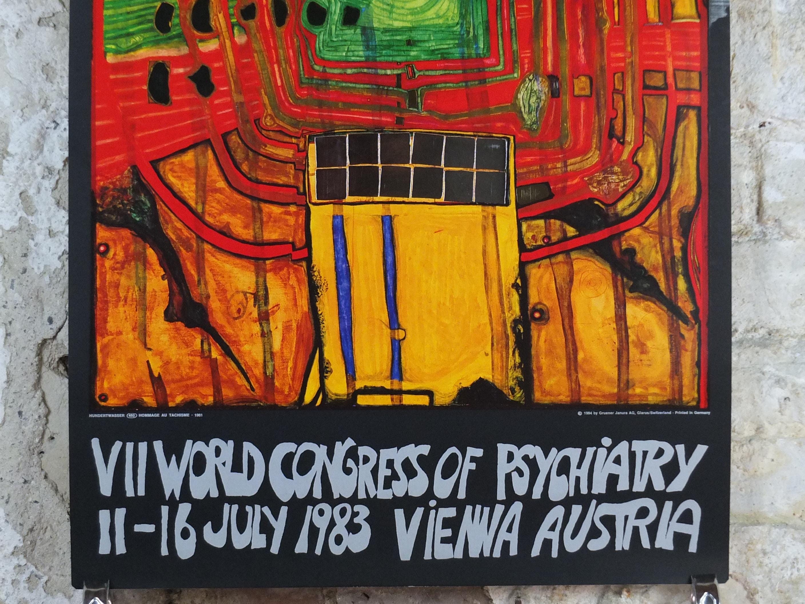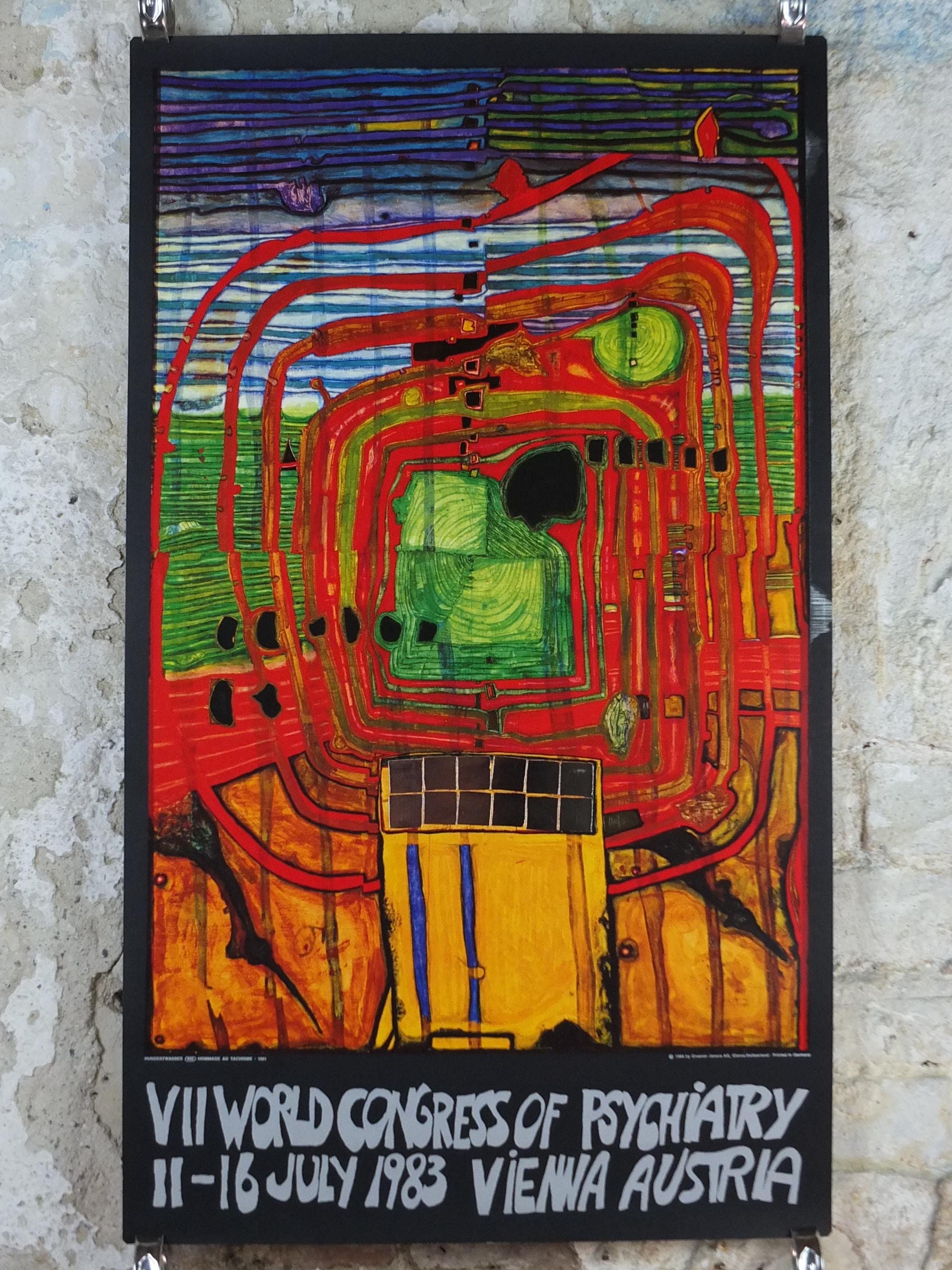This is a Friedensreich Hundertwasser poster from 1984 of his 1961 works 660 "Hommage au Tachisme" - which features vivid reds, greens, yellows, and blues in concentric, swirling patterns that evokes a sense of movement, life, or a mindscape, which is fitting for a psychiatry congress.