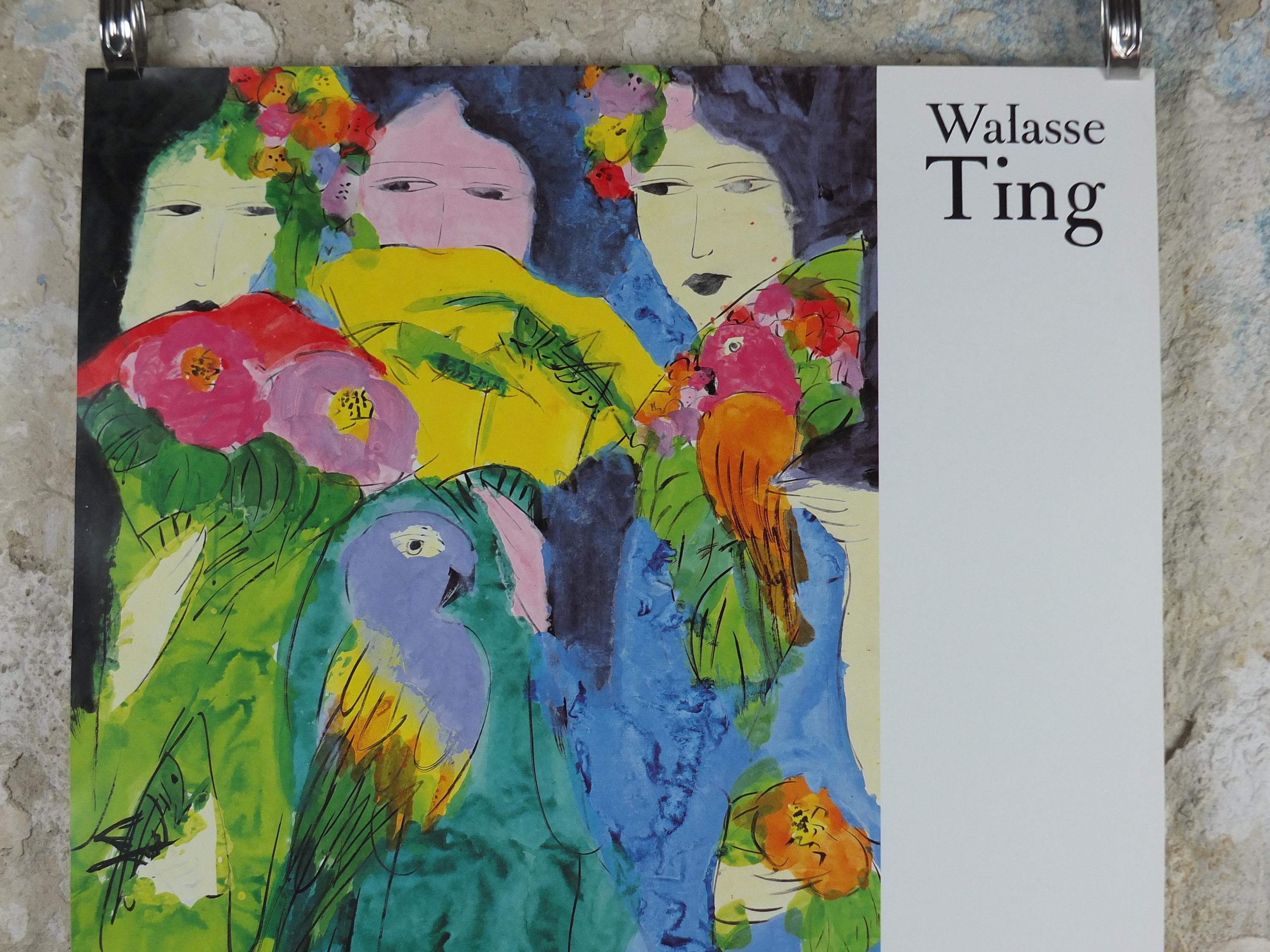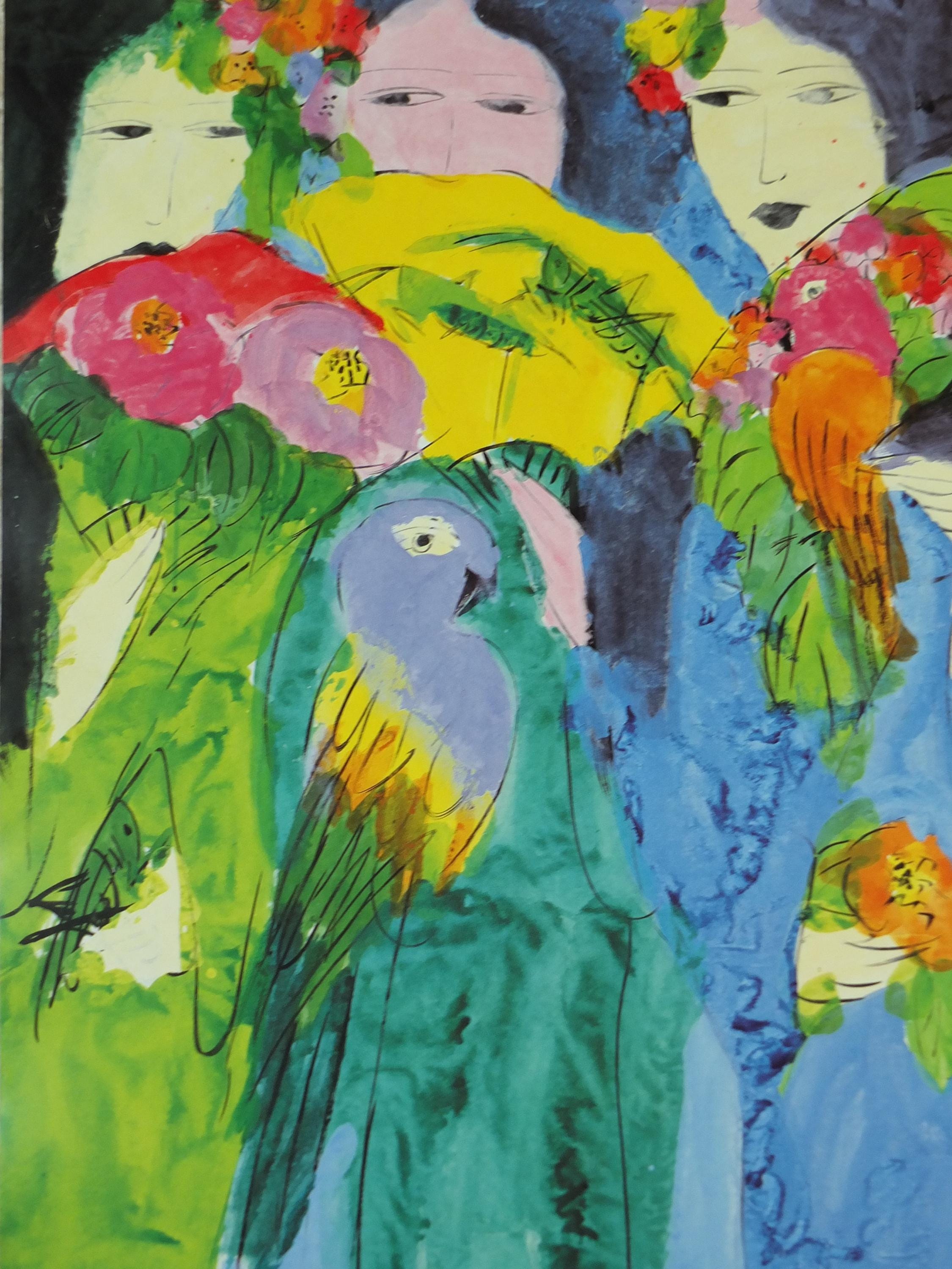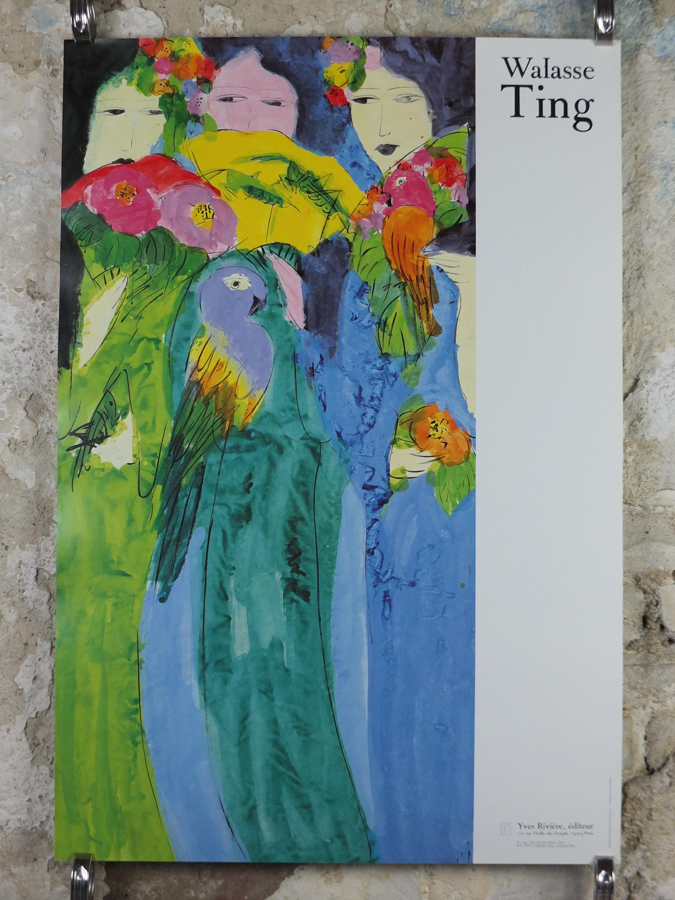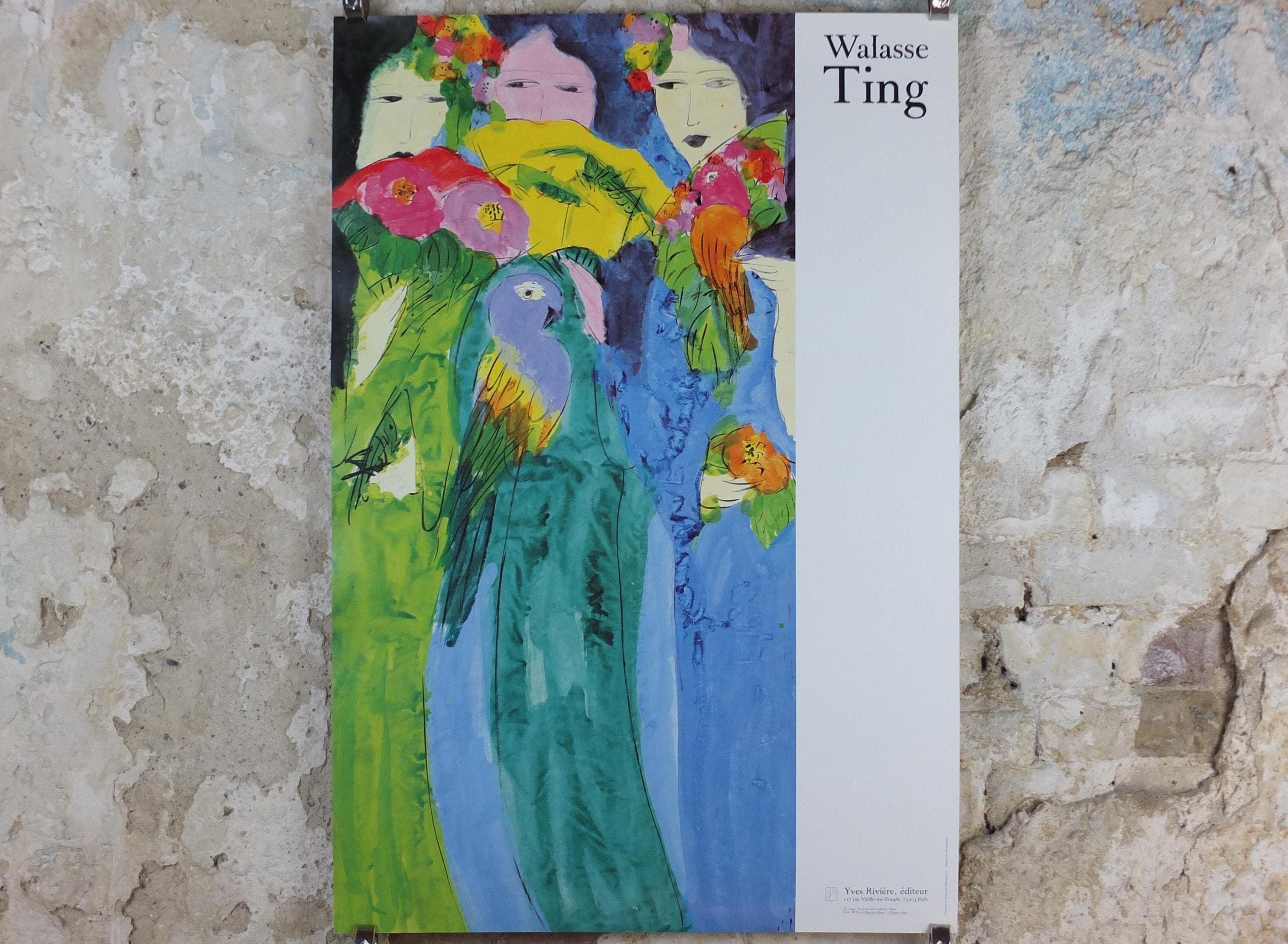 This colourful Walasse Ting exhibition poster is from the Yves Riviere in Paris, France for an exhibition in 1990 featuring "Three ladies with fans and parrots" from 1990 and shows three woman in long blue and green robes and long hair with their faces hidden by fans in the foreground covered in many colourful flowers with parrots in the foreground.