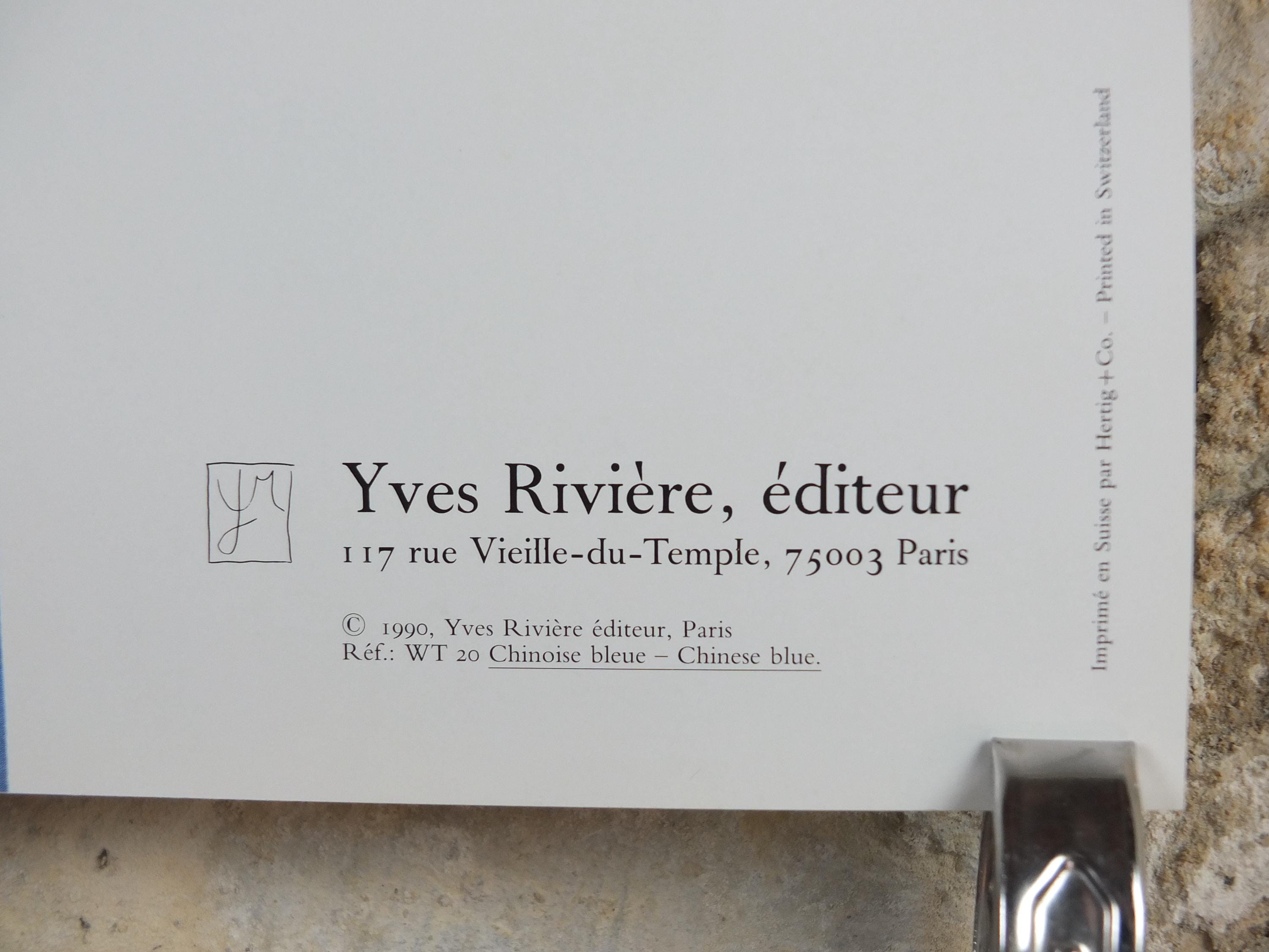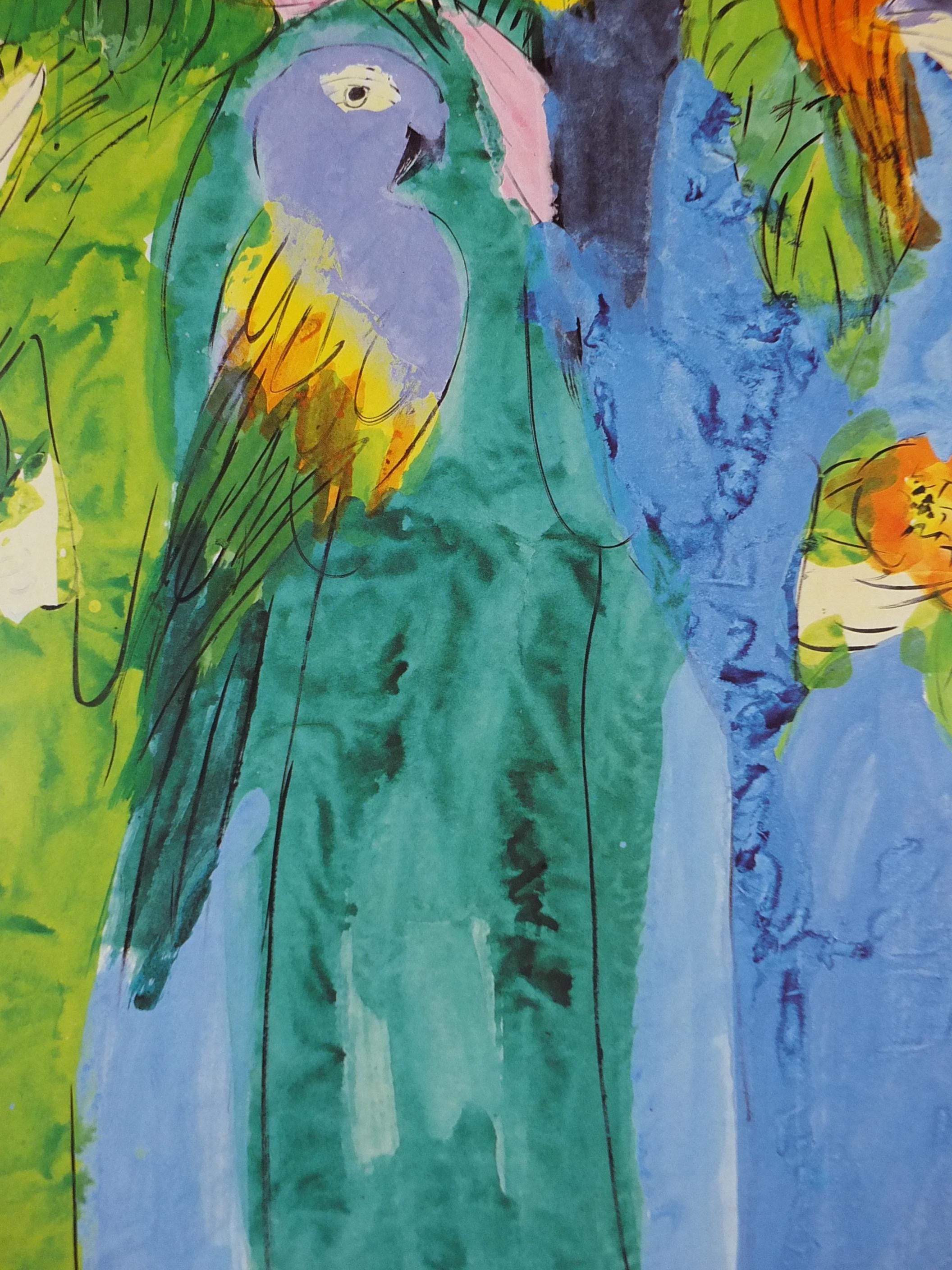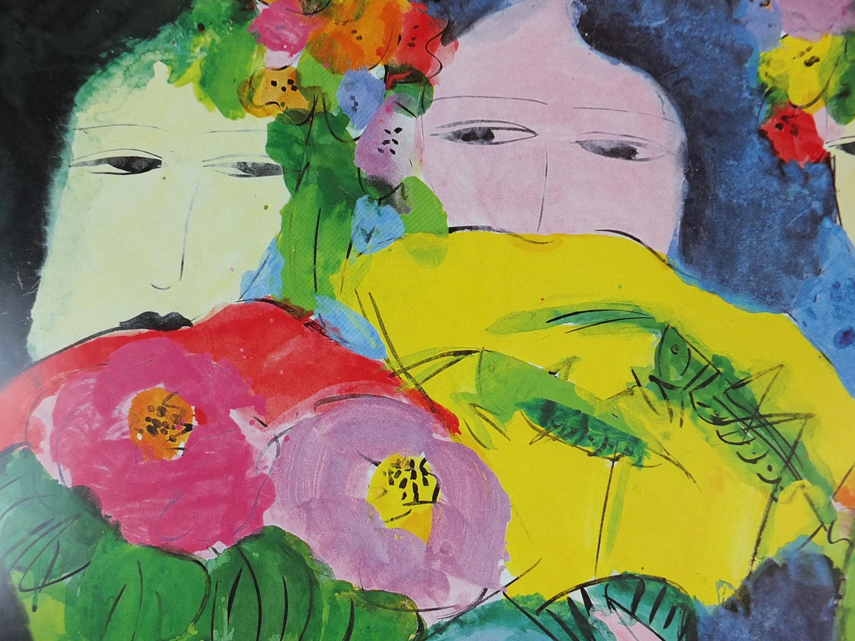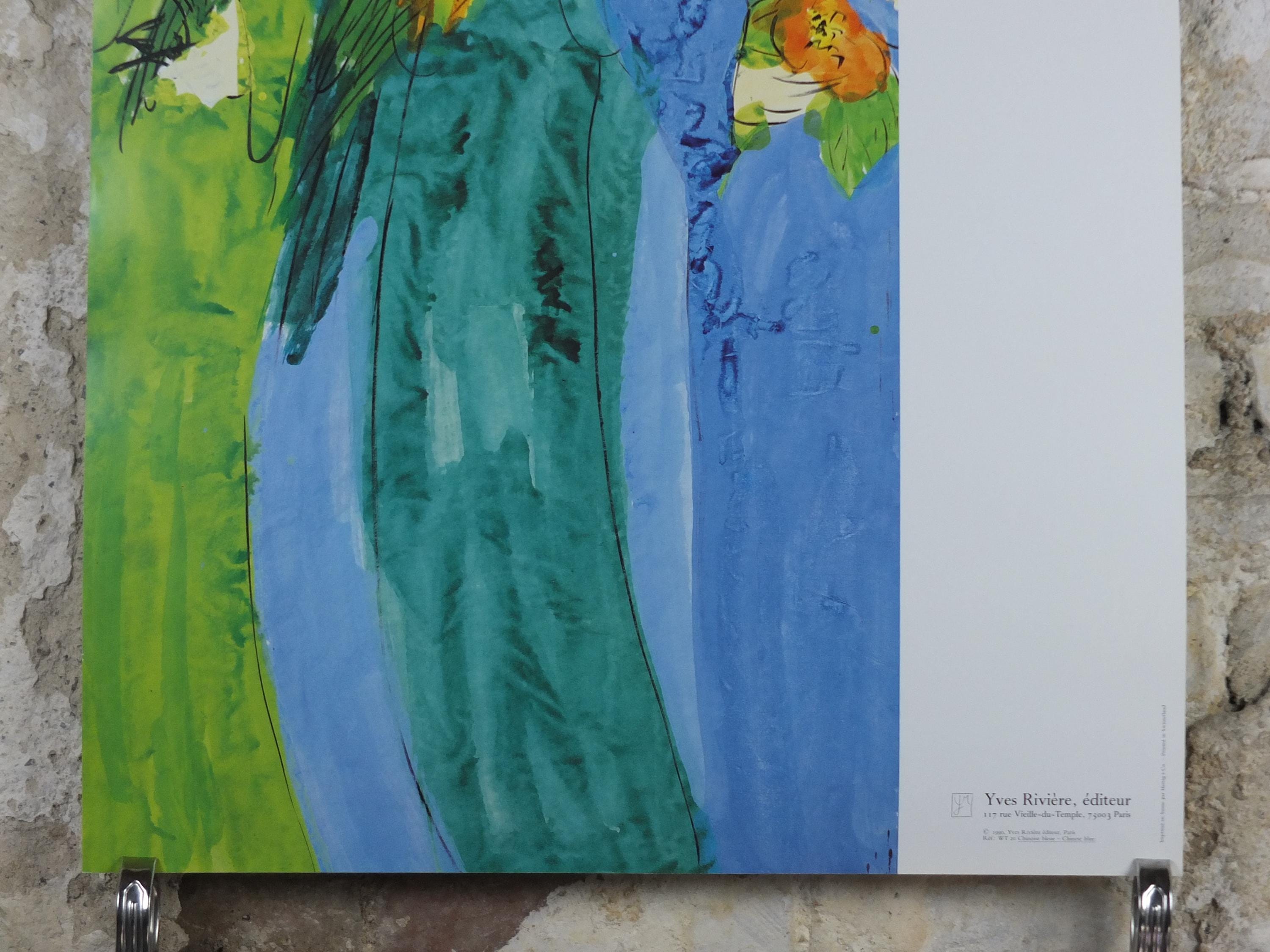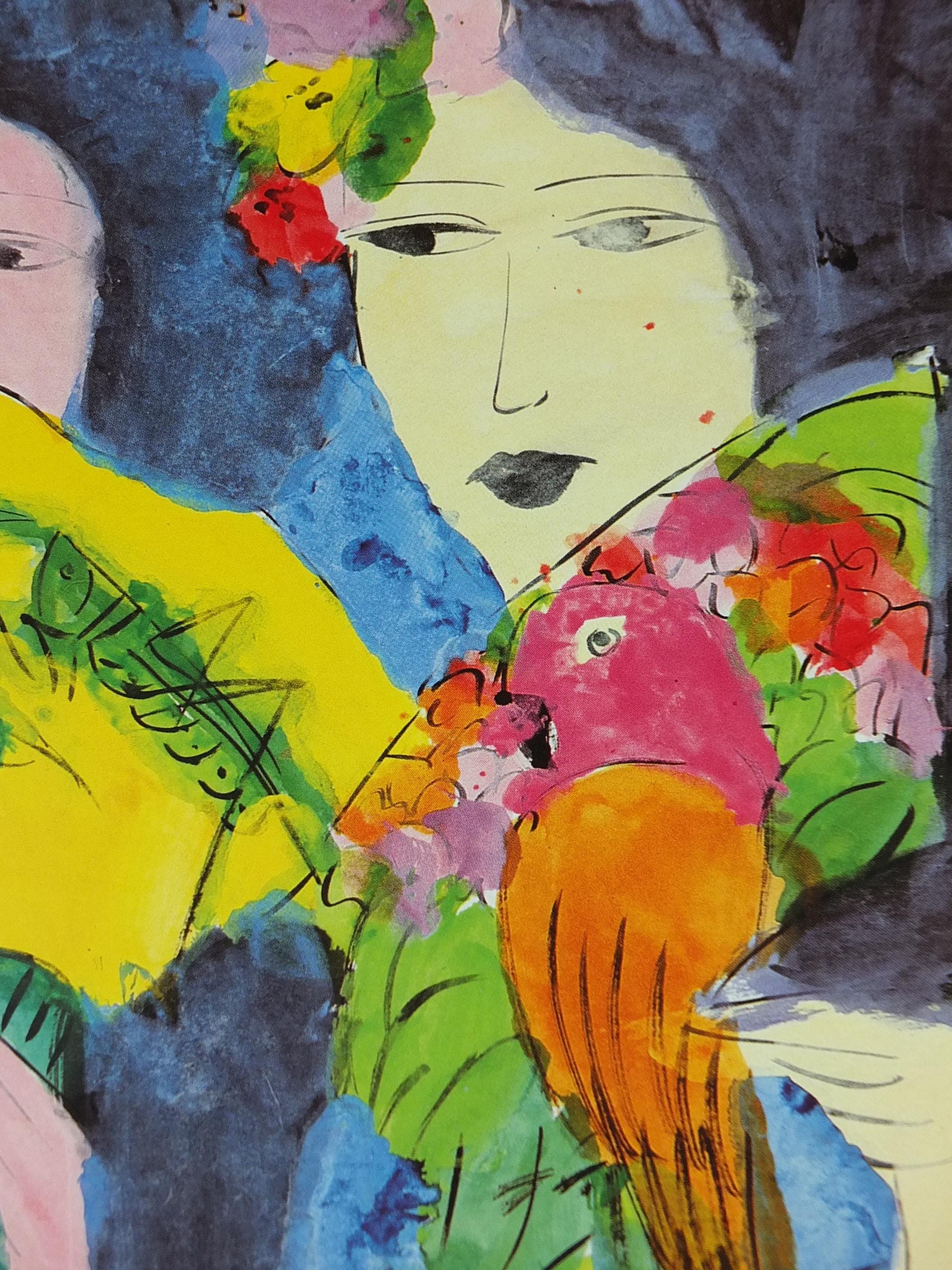 This colourful Walasse Ting exhibition poster is from the Yves Riviere in Paris, France for an exhibition in 1990 featuring "Three ladies with fans and parrots" from 1990 and shows three woman in long blue and green robes and long hair with their faces hidden by fans in the foreground covered in many colourful flowers with parrots in the foreground.