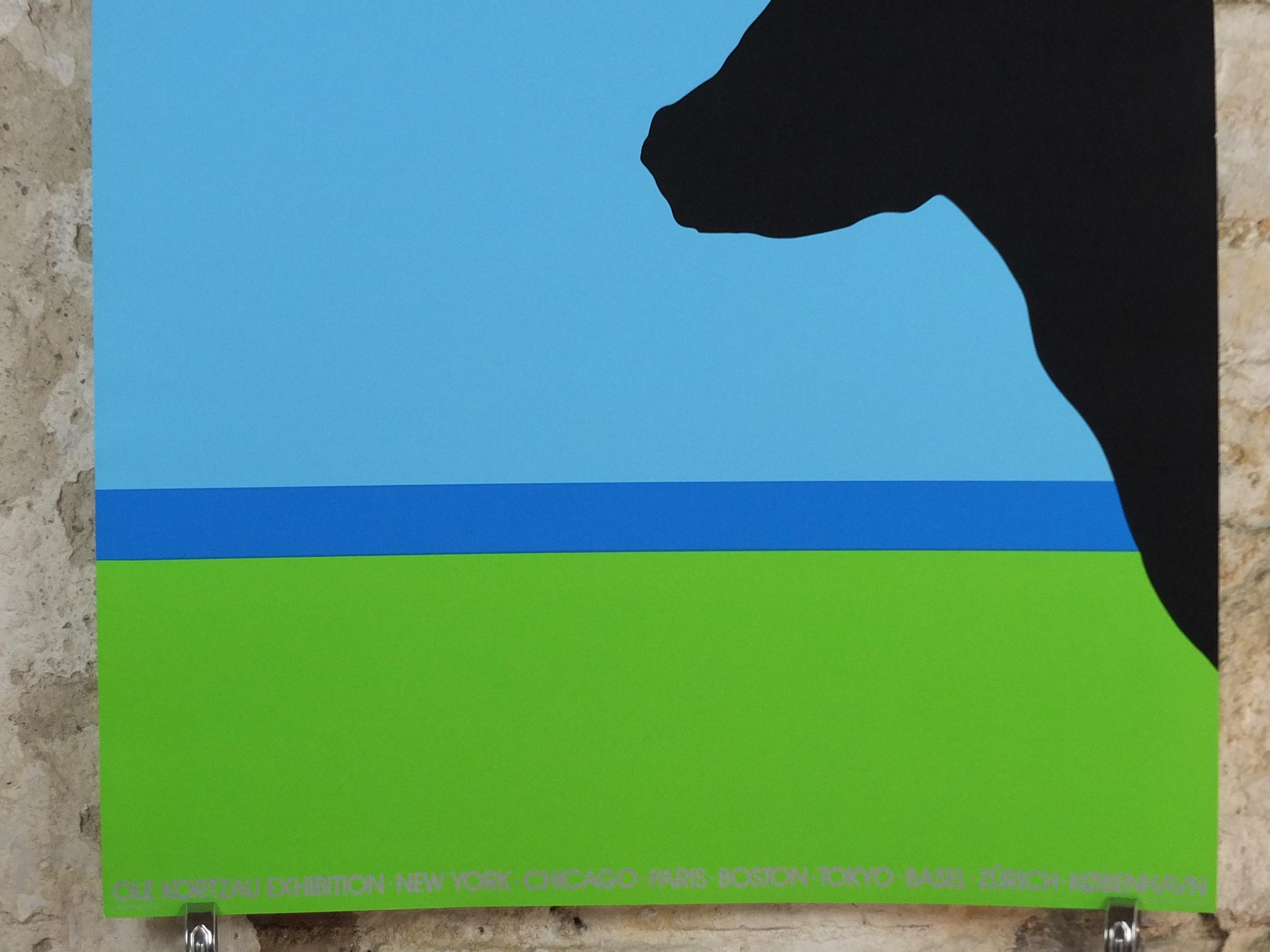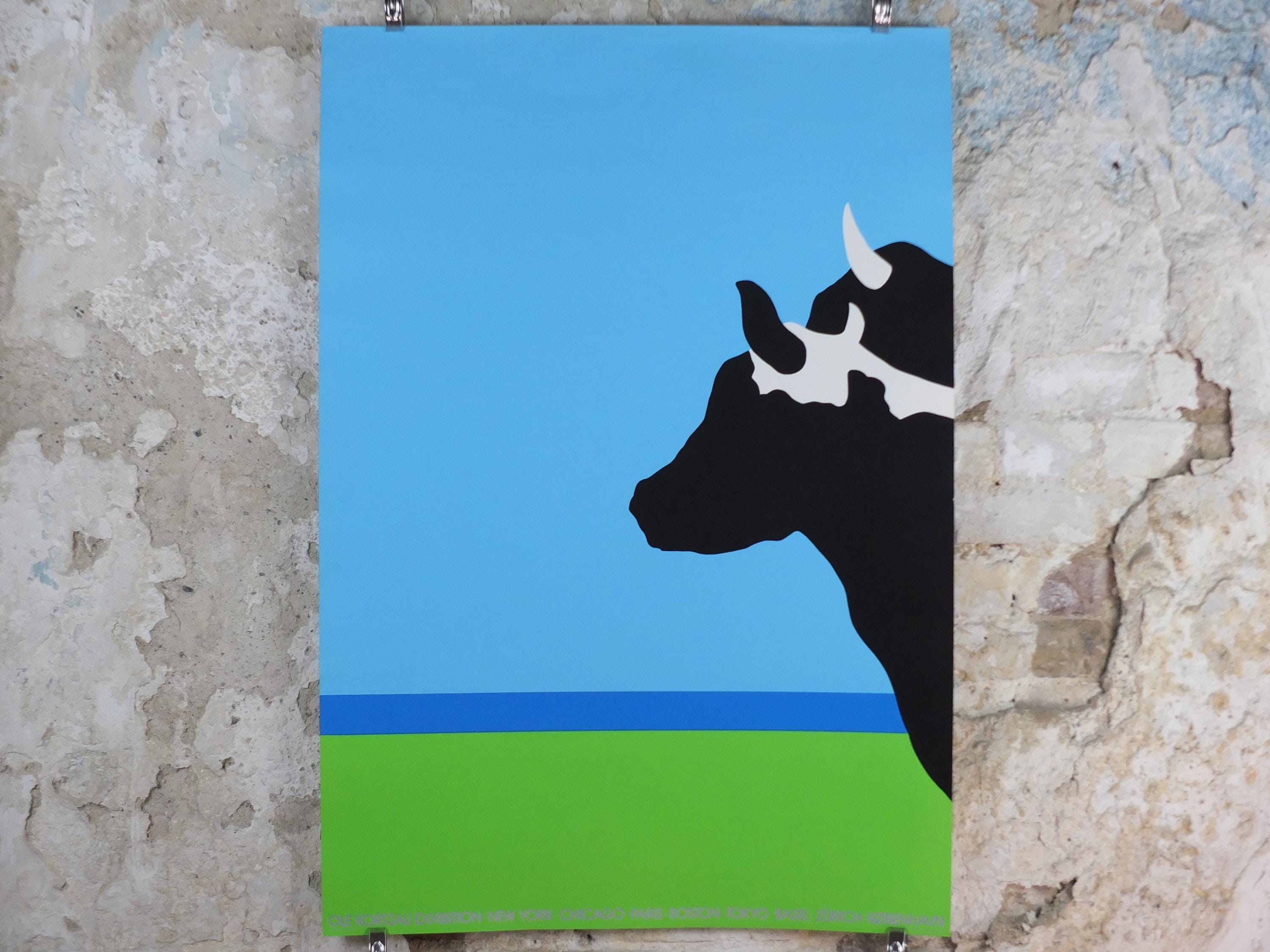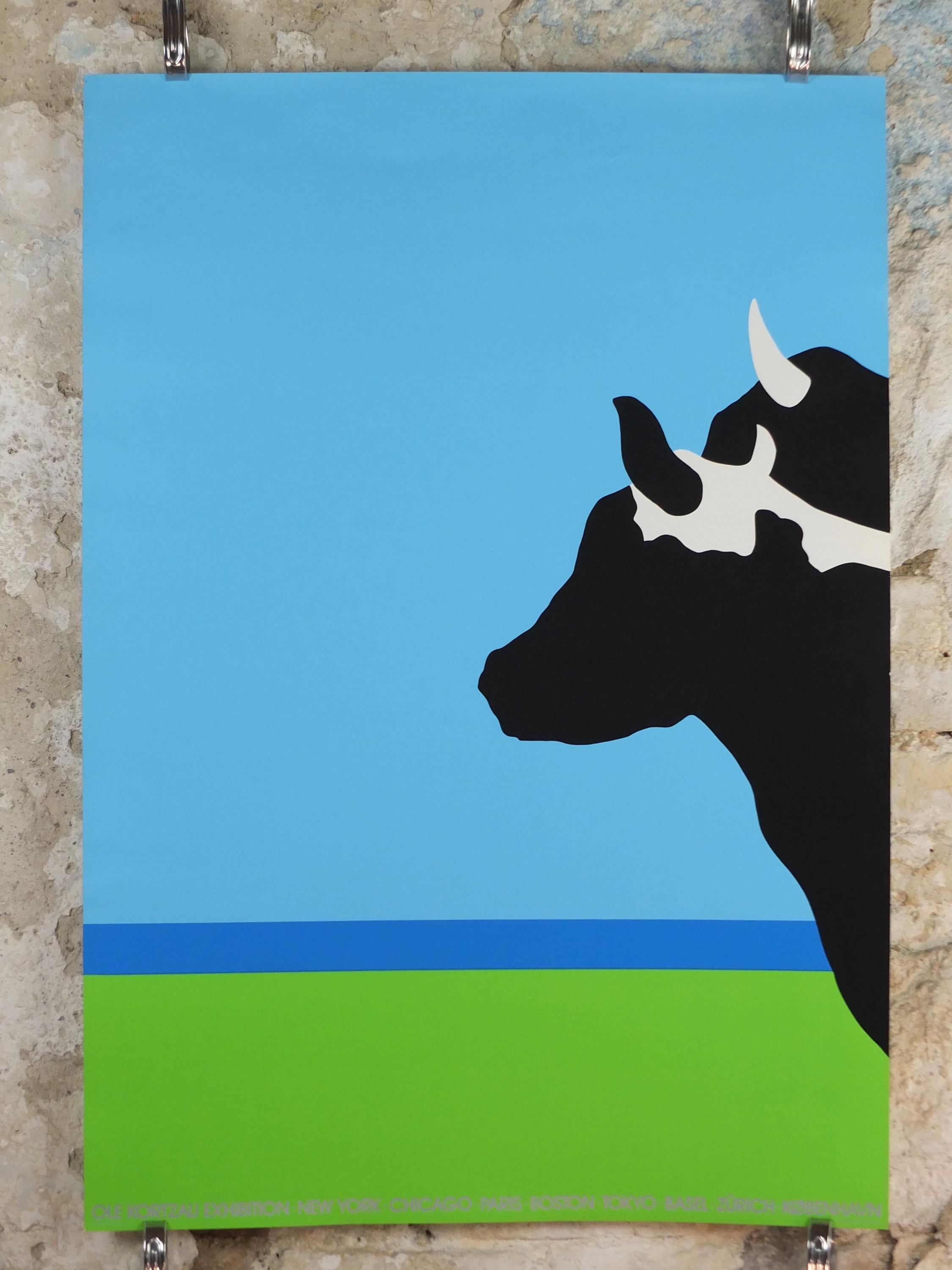 This original exhibition poster has a livestock / beef / ranch subject for an Ole Kortzau exhibition in 1977 featuring a very clean and colourful modernist version of a cow looking over the flat plains of Denmark.