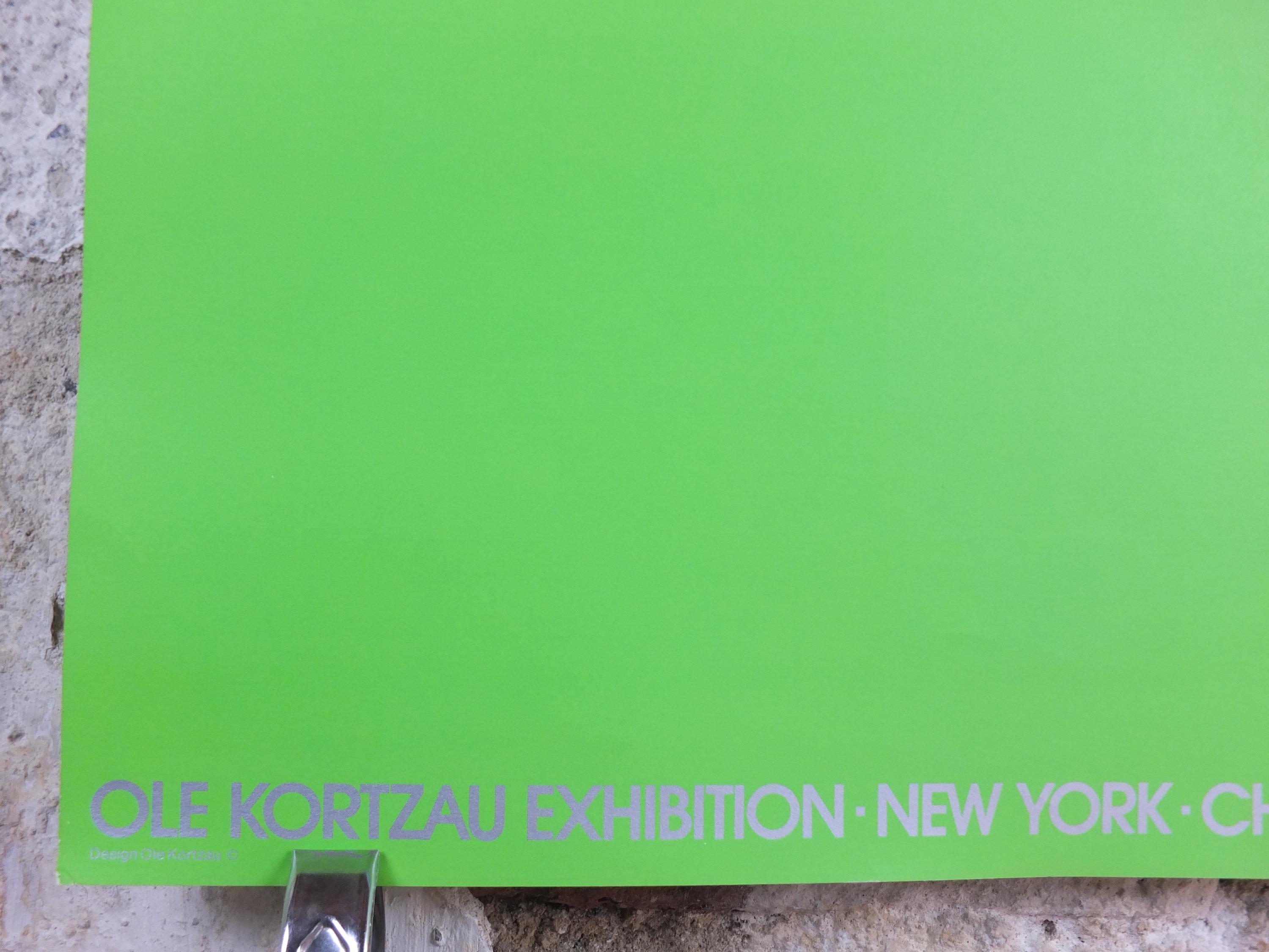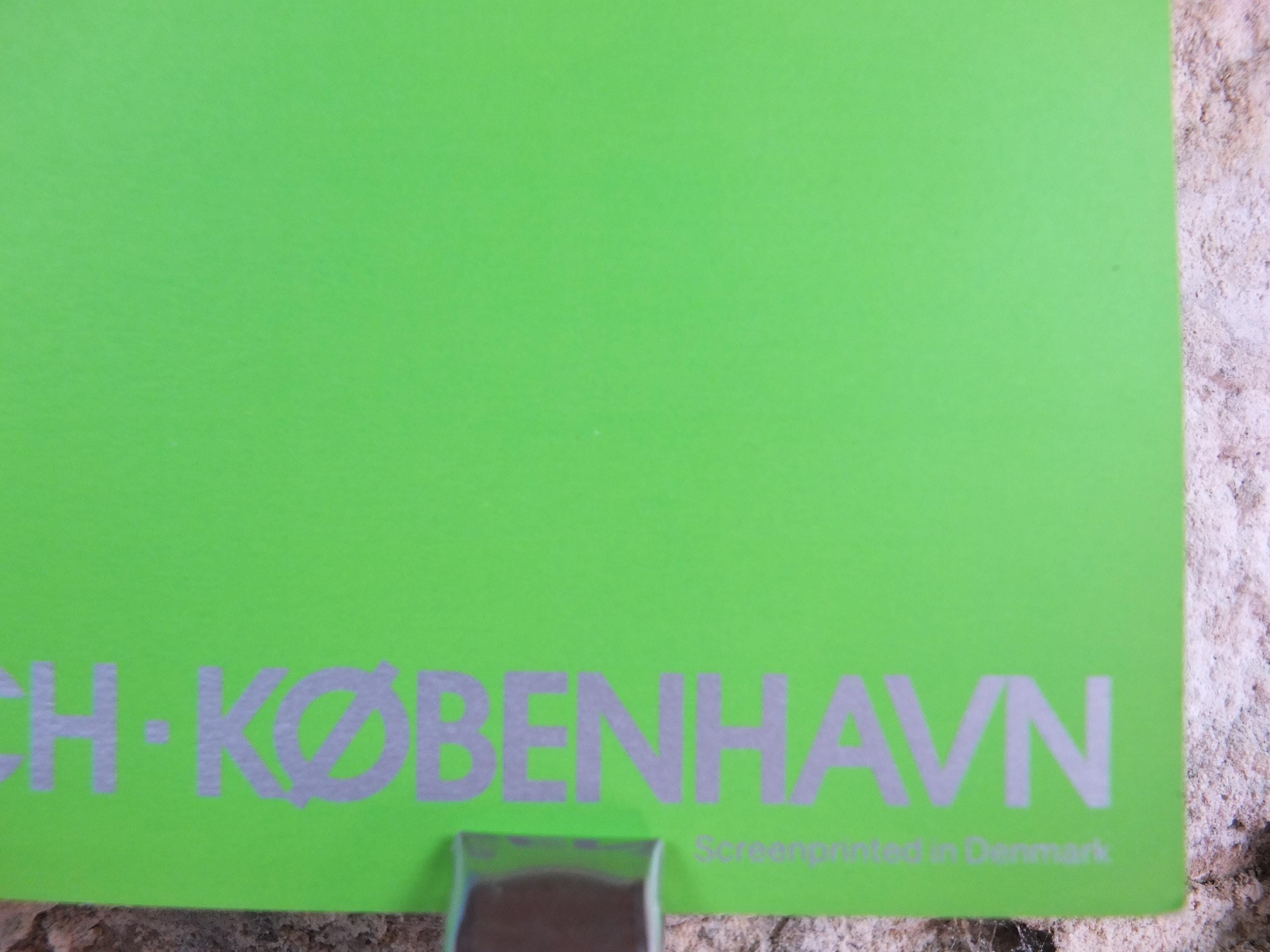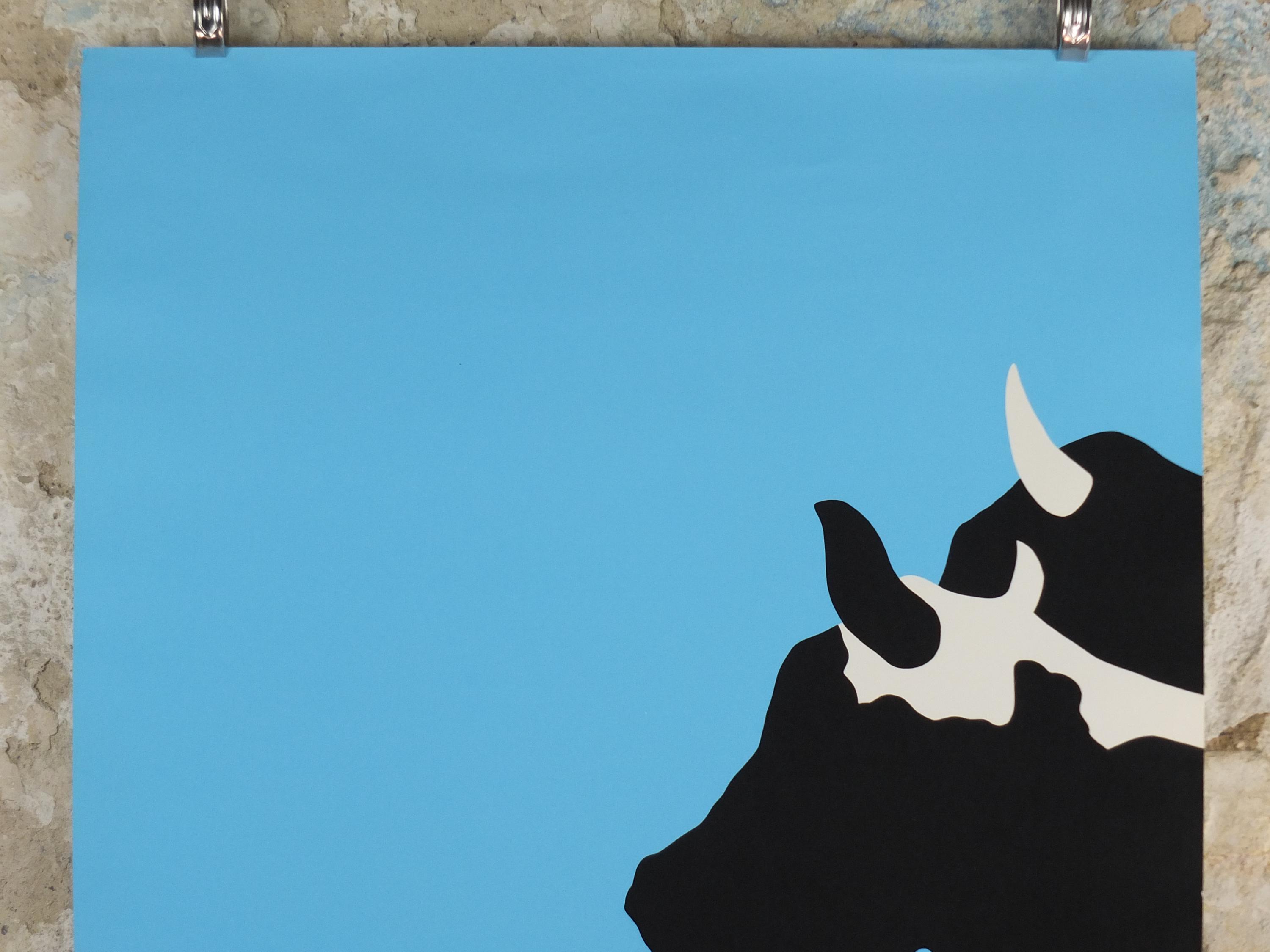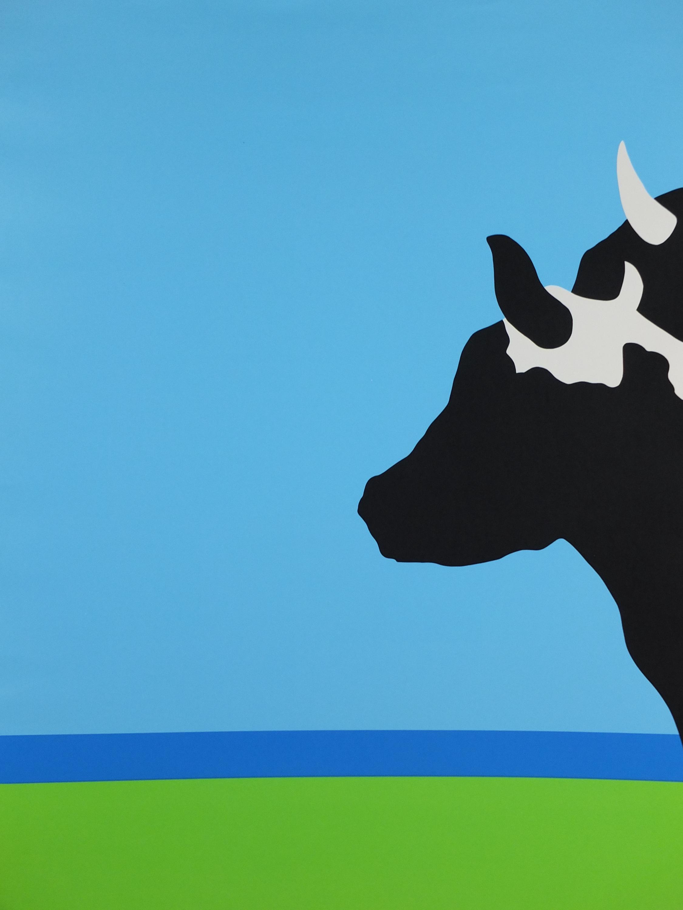 This original exhibition poster has a livestock / beef / ranch subject for an Ole Kortzau exhibition in 1977 featuring a very clean and colourful modernist version of a cow looking over the flat plains of Denmark.