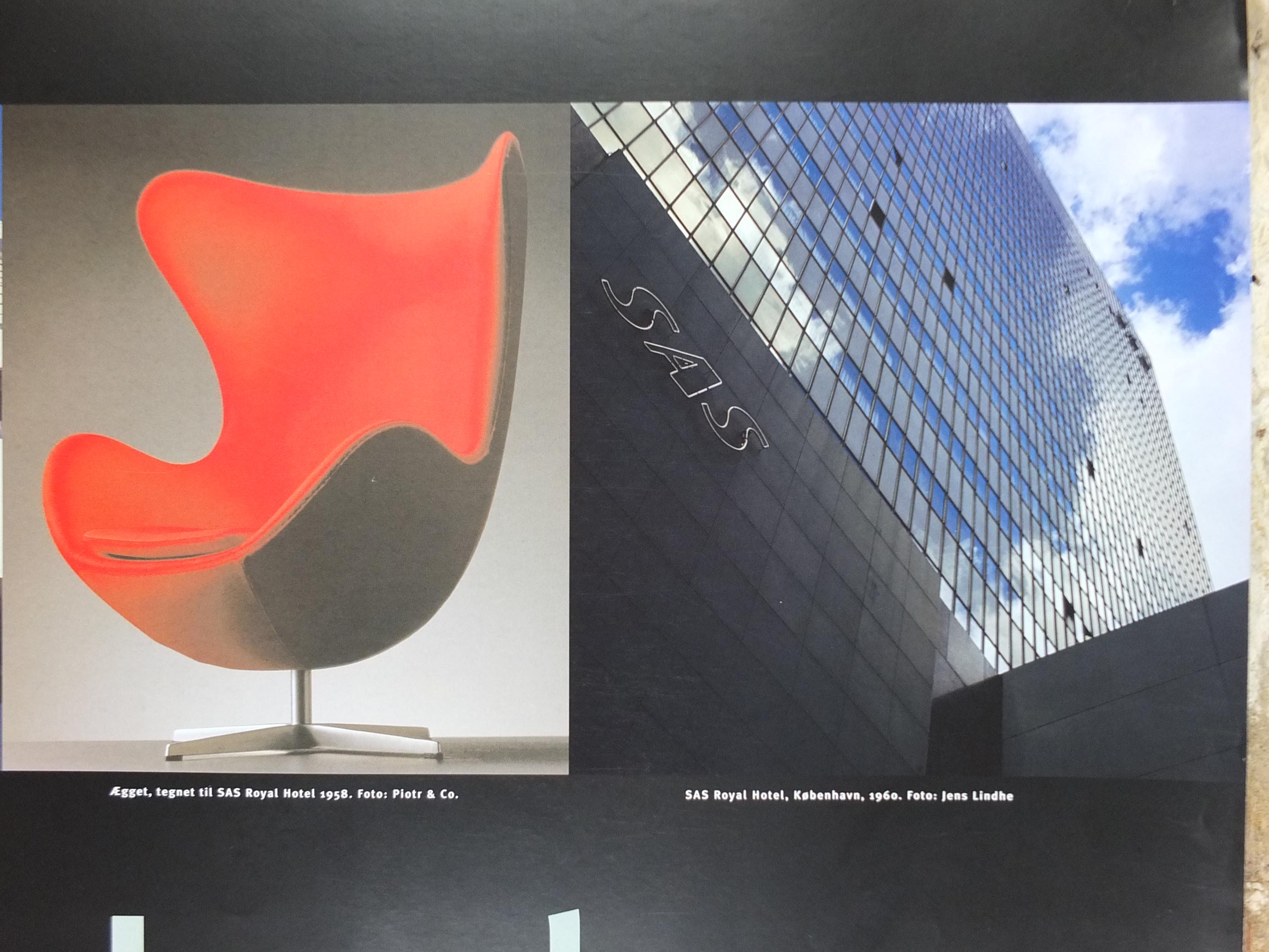 Right: A photograph of the SAS Royal Hotel (København, 1960). This building is considered a masterpiece of modern architecture and interior design, for which Jacobsen designed everything from the structure down to the furniture (like the Egg Chair) and cutlery.