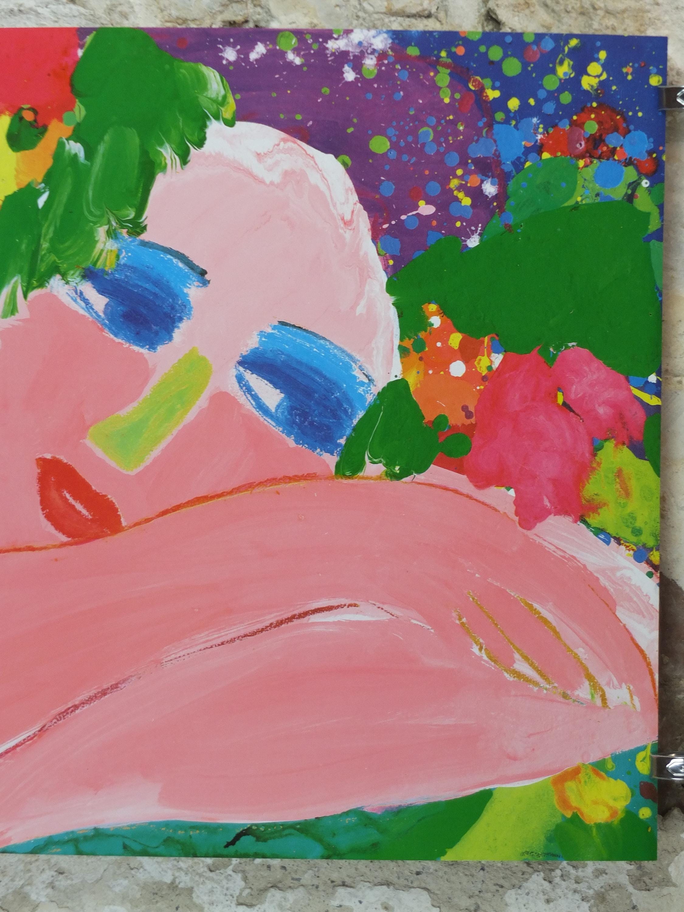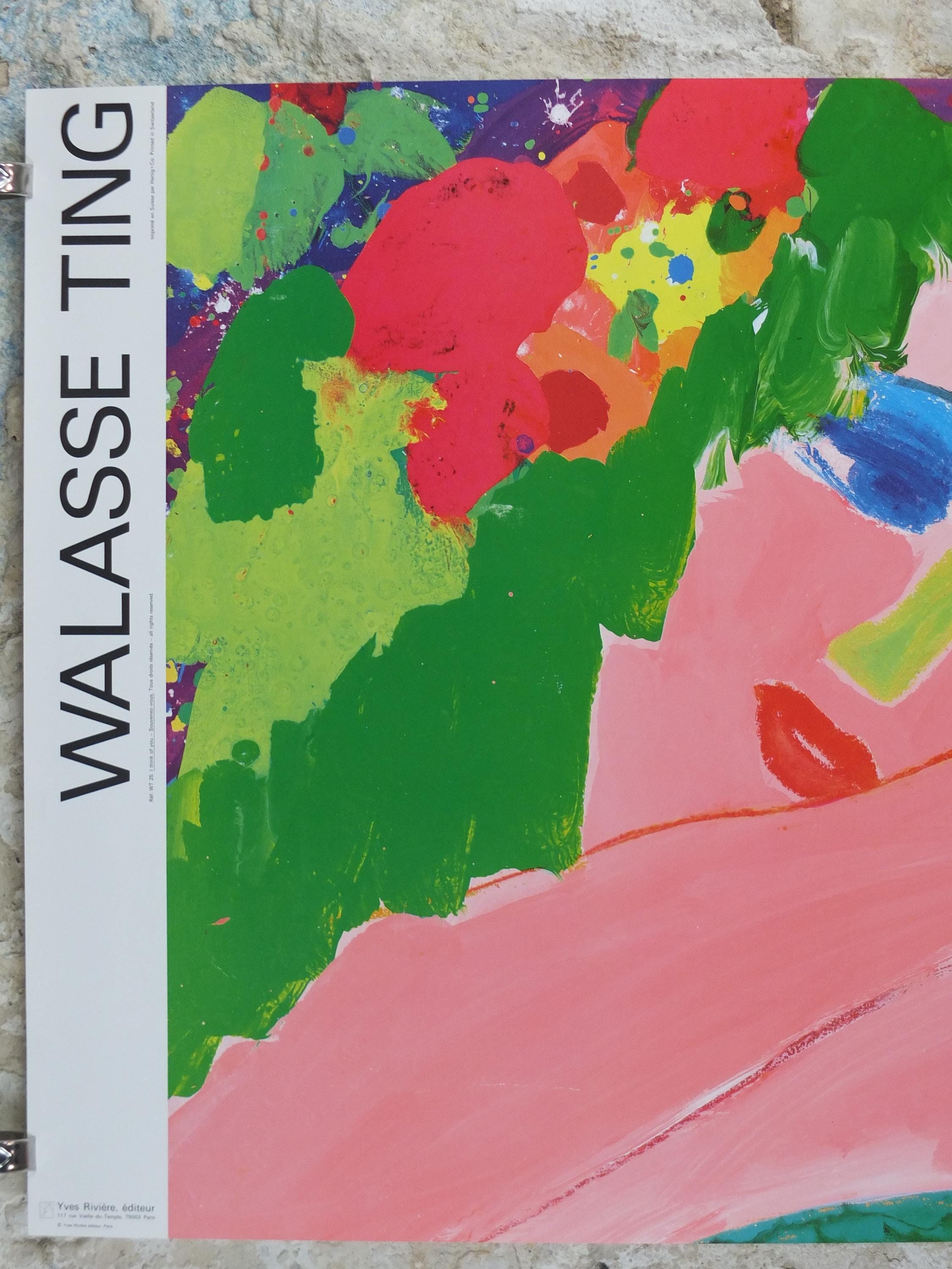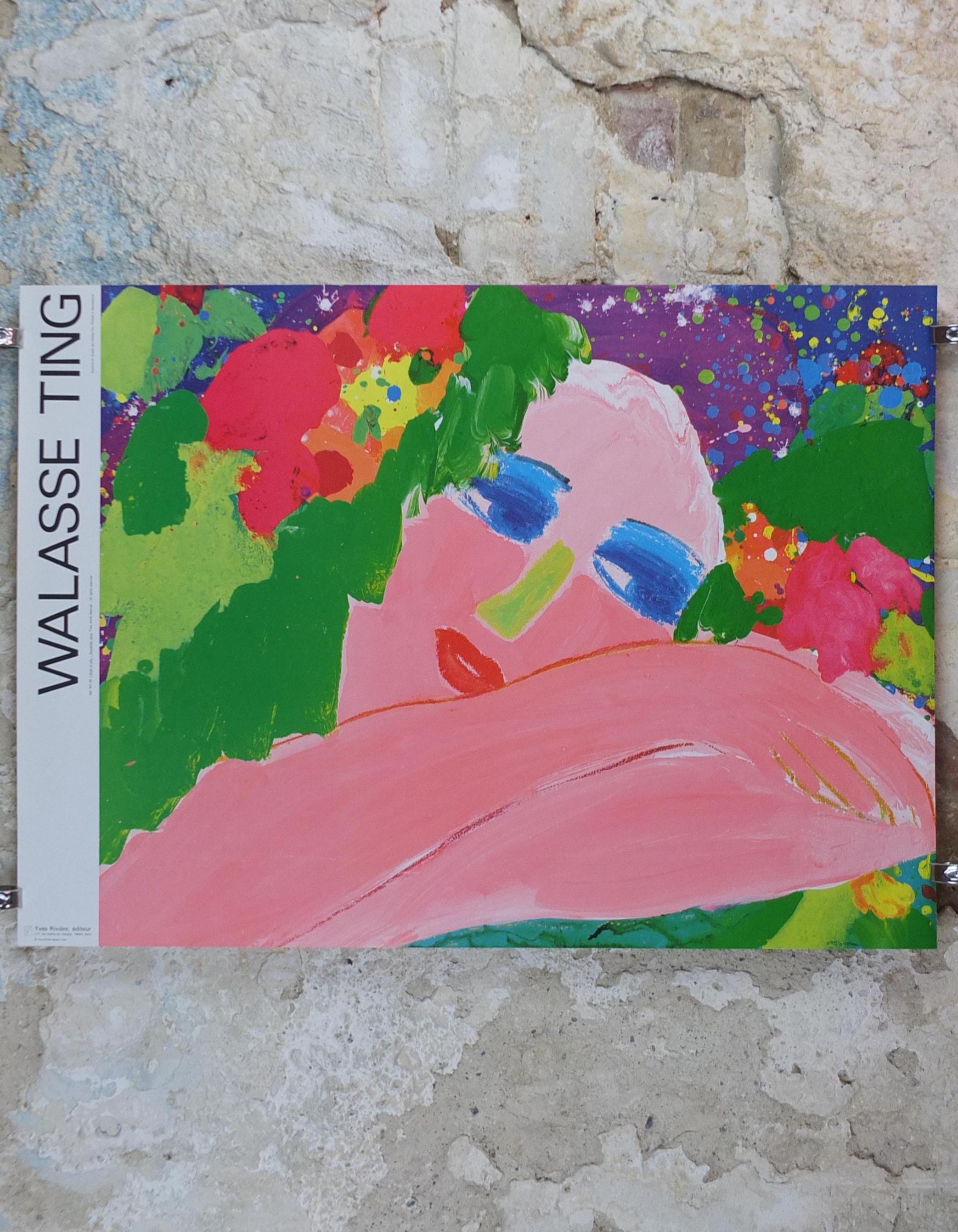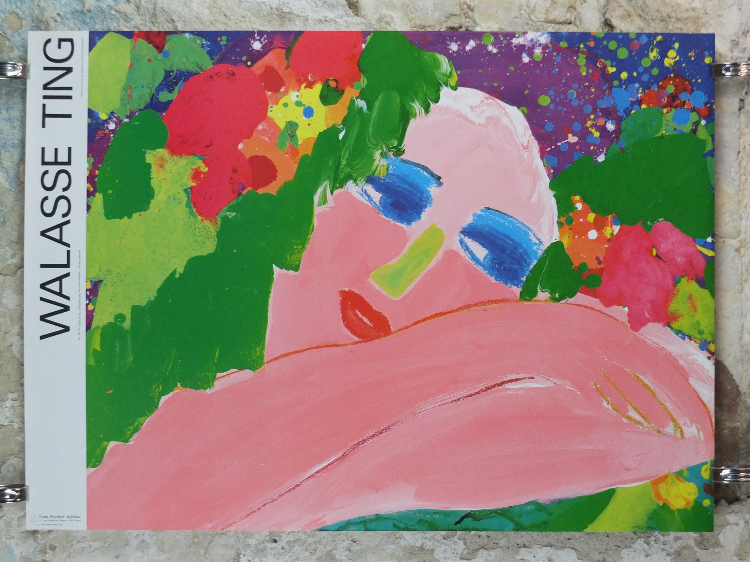 This colourful Walasse Ting exhibition poster is from the Yves Rivere in Paris for an exhibition in the 1990s featuring "I think of you" or "souvenez vous" and shows a woman in art deco dress of the 1920s and 1930s with her head resting thoughtfully on her arm.