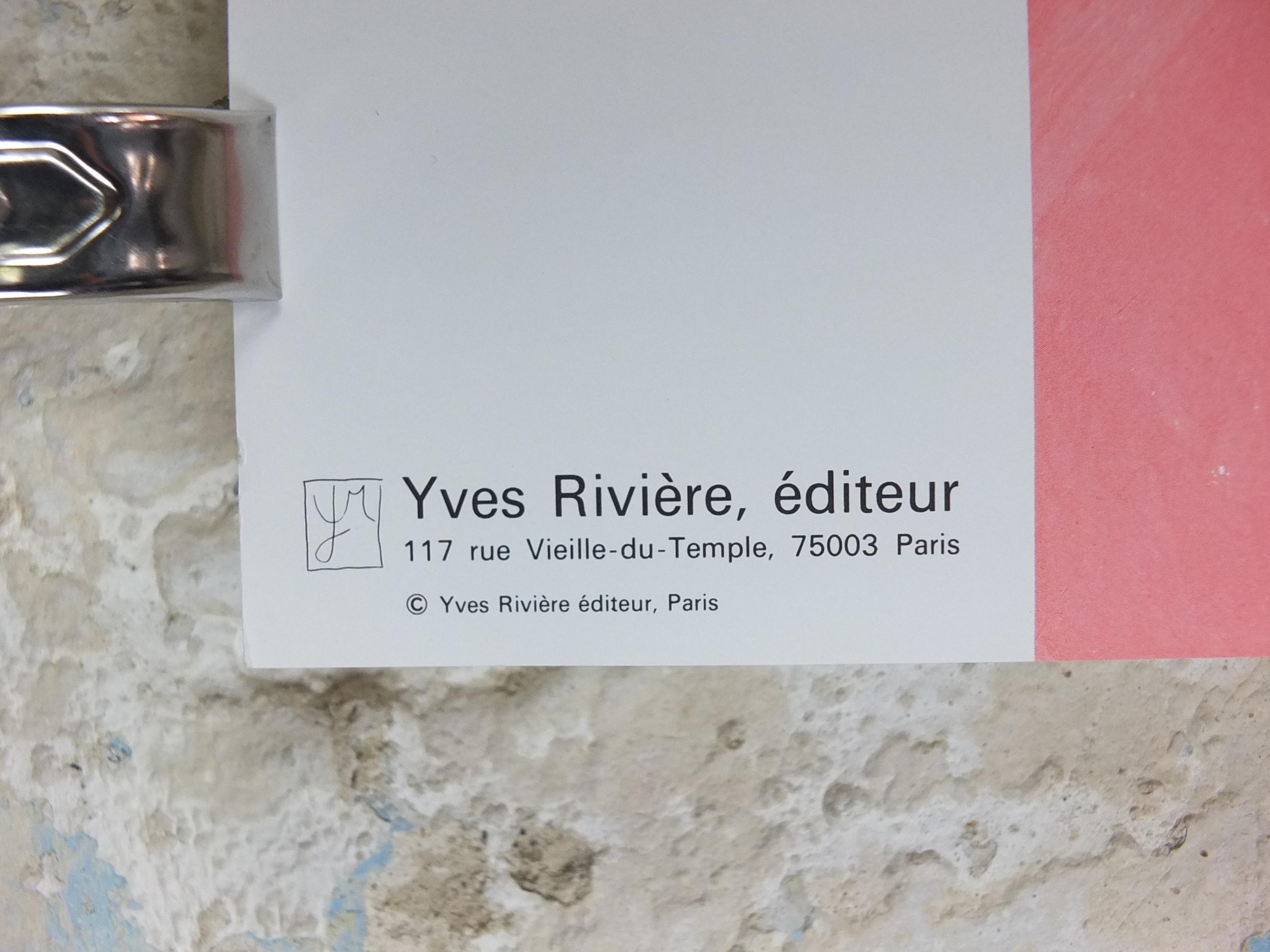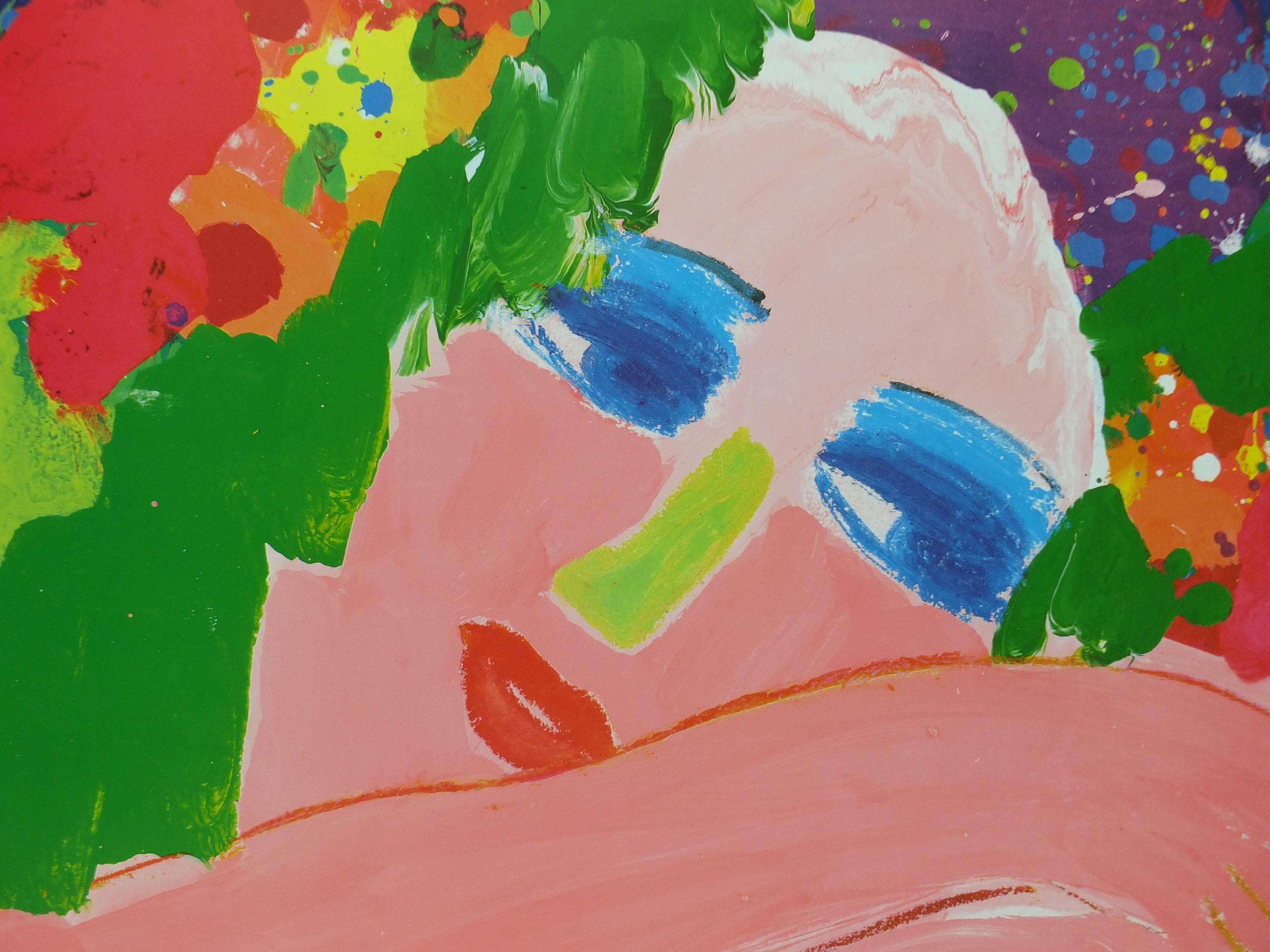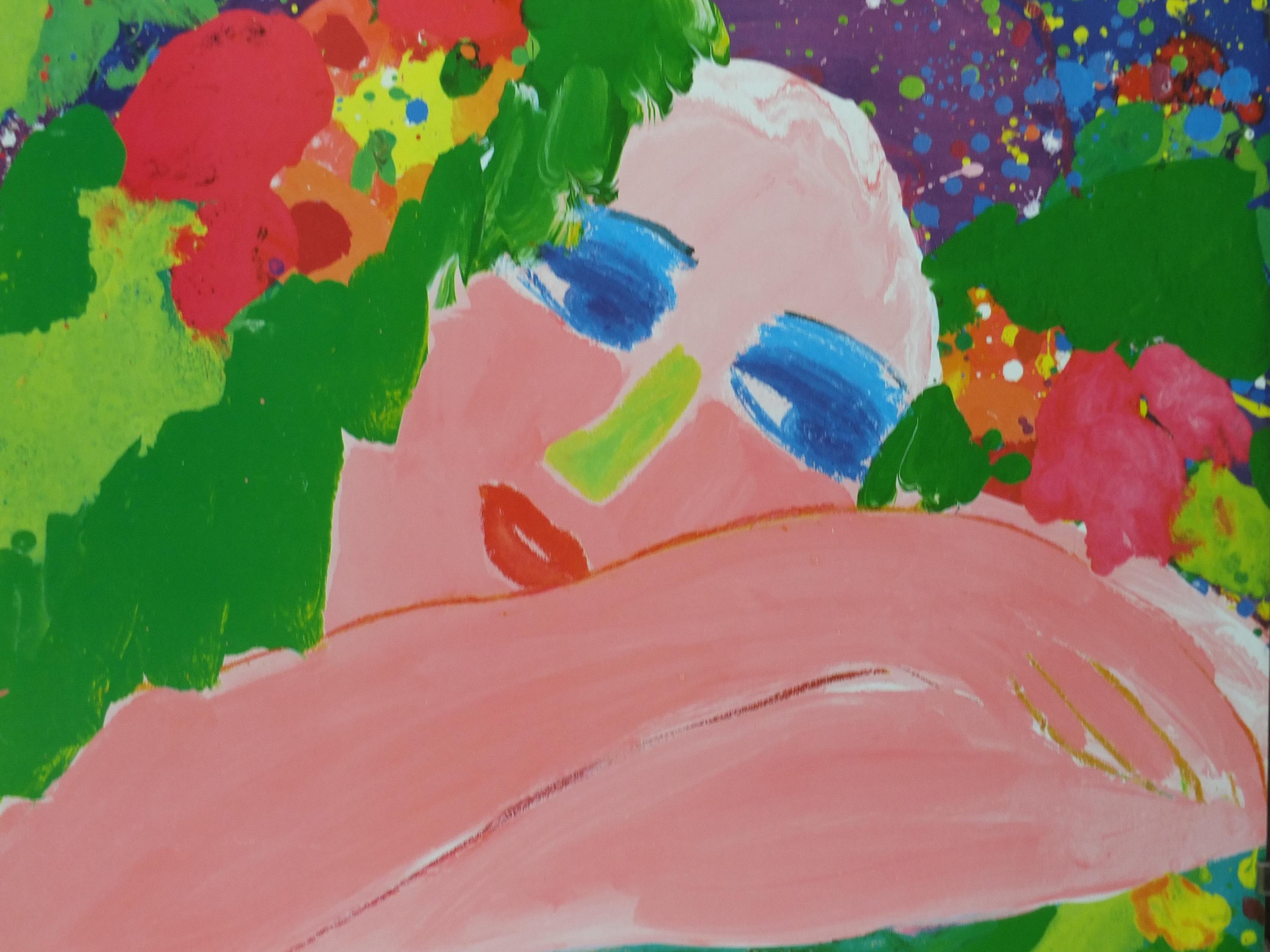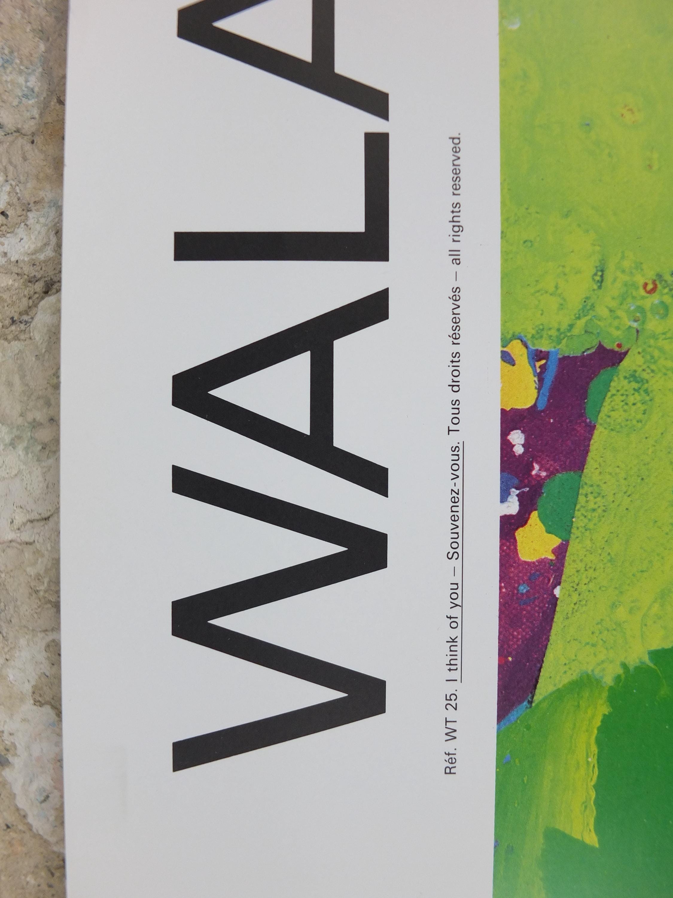 This colourful Walasse Ting exhibition poster is from the Yves Rivere in Paris for an exhibition in the 1990s featuring "I think of you" or "souvenez vous" and shows a woman in art deco dress of the 1920s and 1930s with her head resting thoughtfully on her arm.