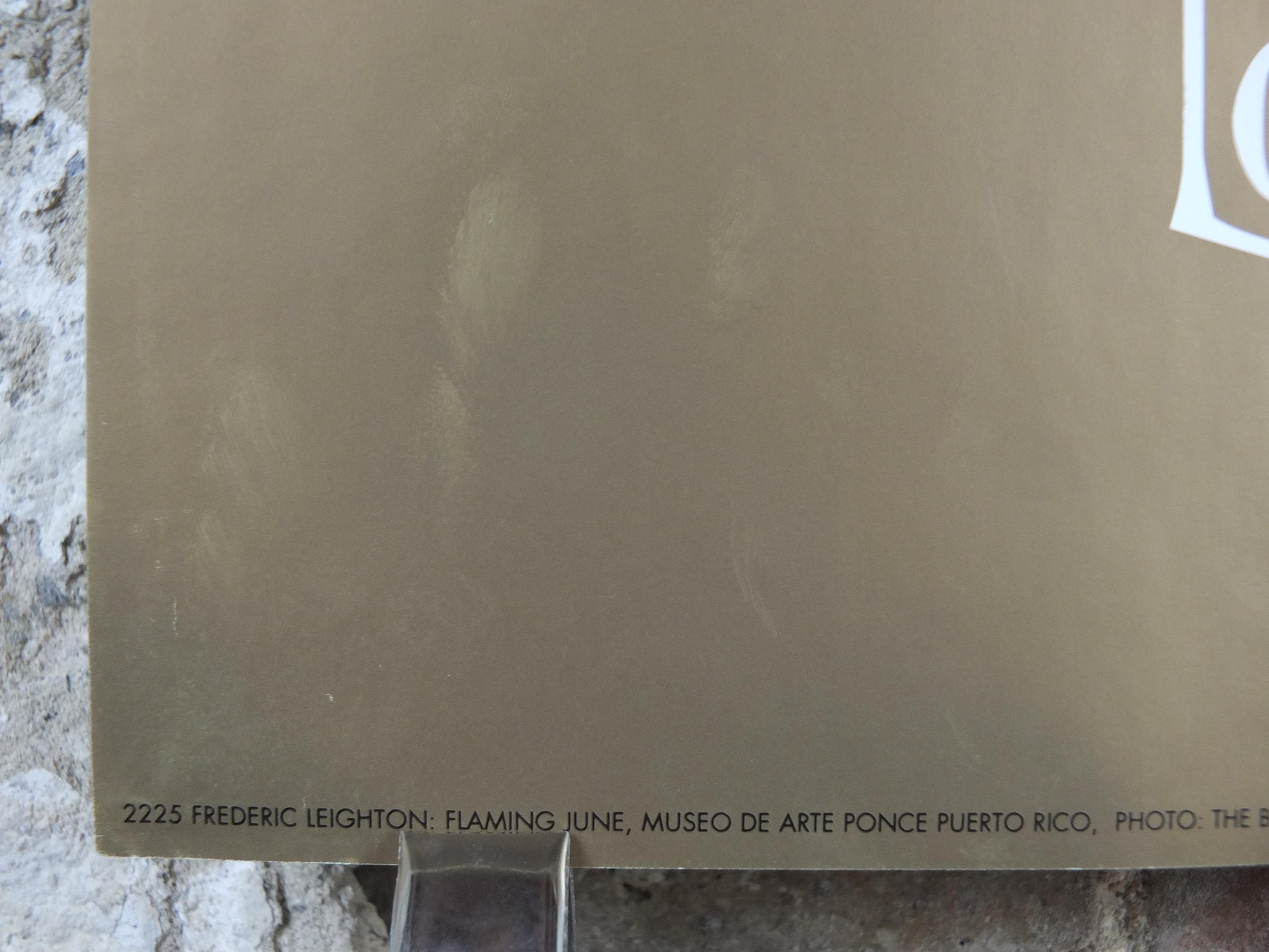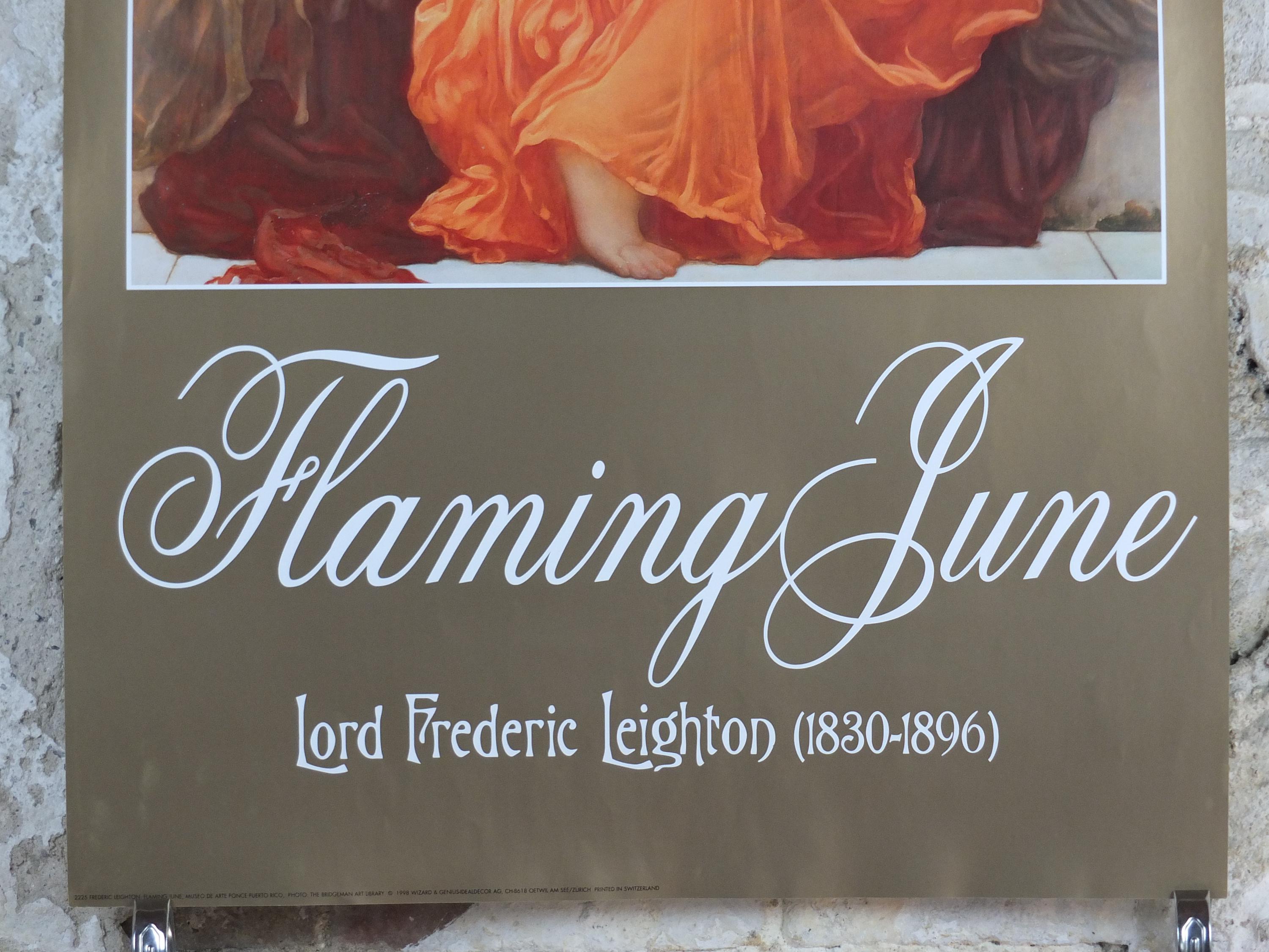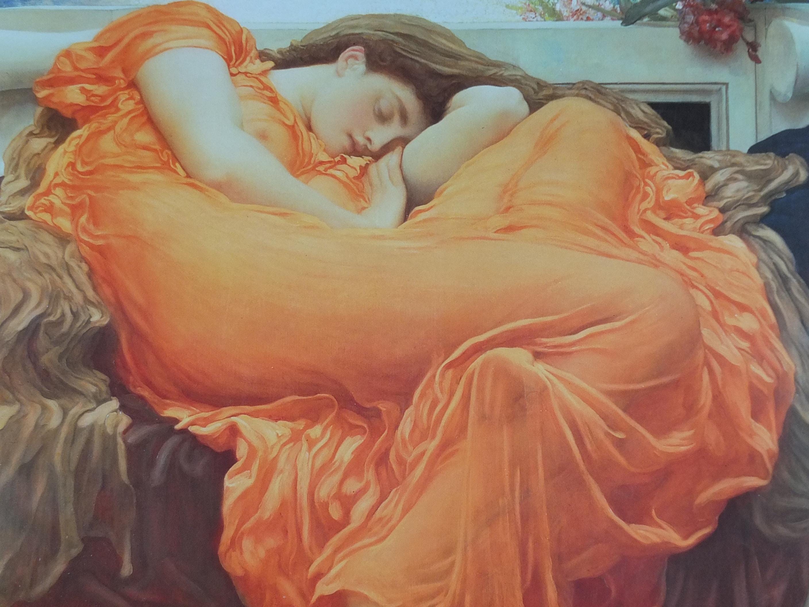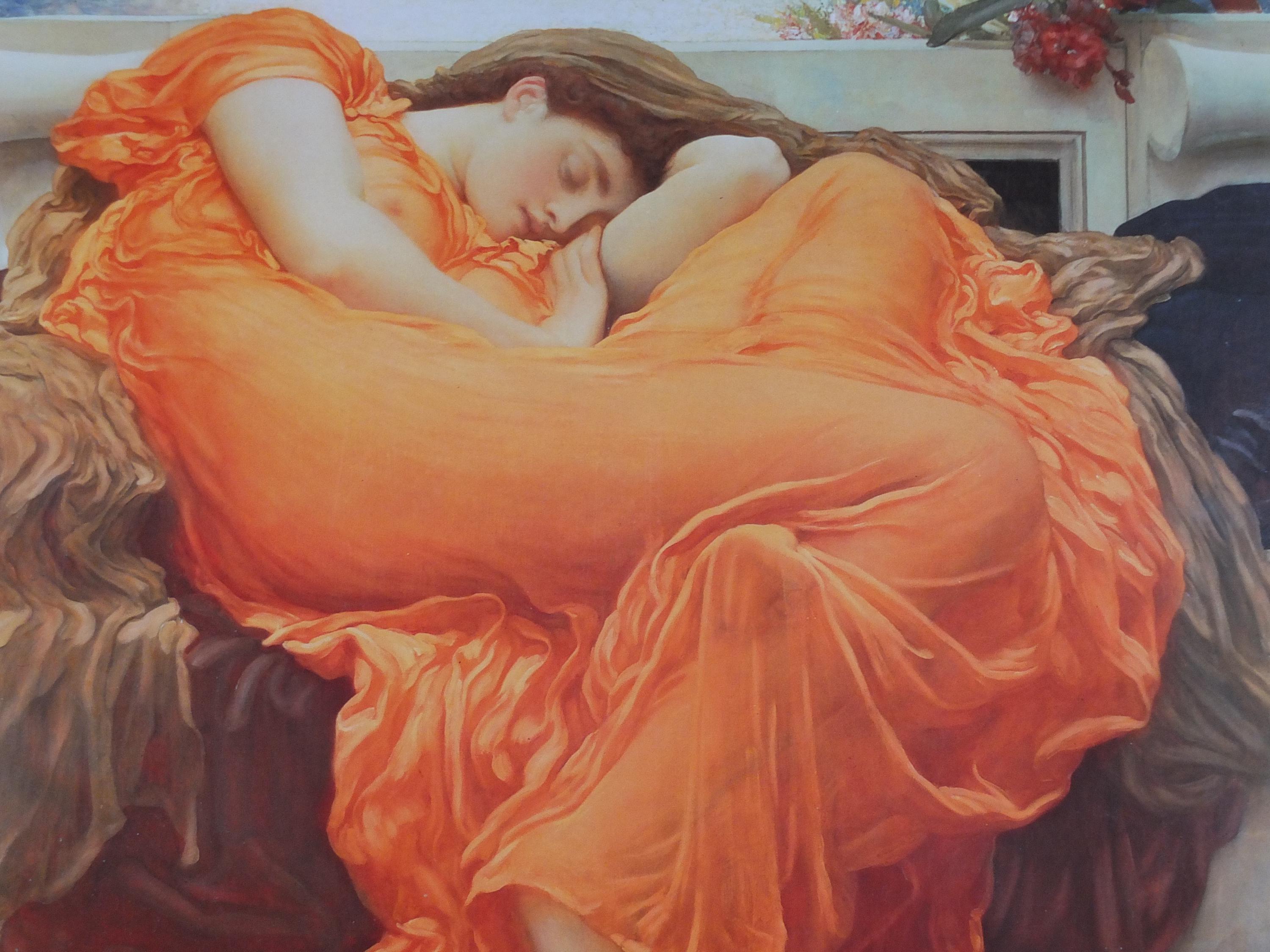This poster shows "Flaming June" from Lord Frederic Leighton who painted in the academisim and pre-Raphealite art styles.