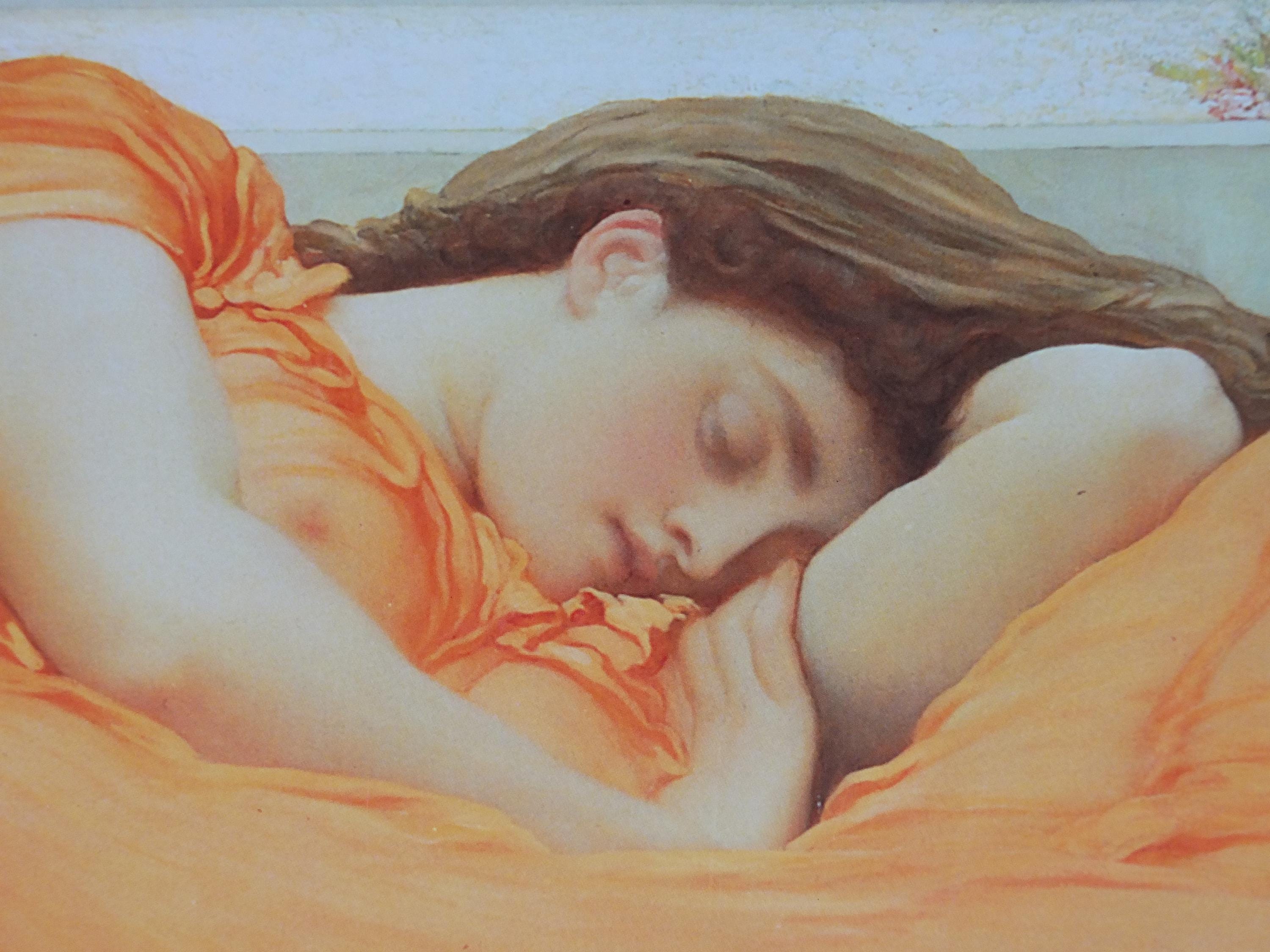 Flaming June is a painting by Sir Frederic Leighton, produced in 1895. Painted with oil paints on a 47-by-47-inch (1,200 mm × 1,200 mm) square canvas, it is widely considered to be Leighton's magnum opus, showing his classicist nature. It is thought that the woman portrayed alludes to the figures of sleeping nymphs and naiads the Greeks often sculpted.