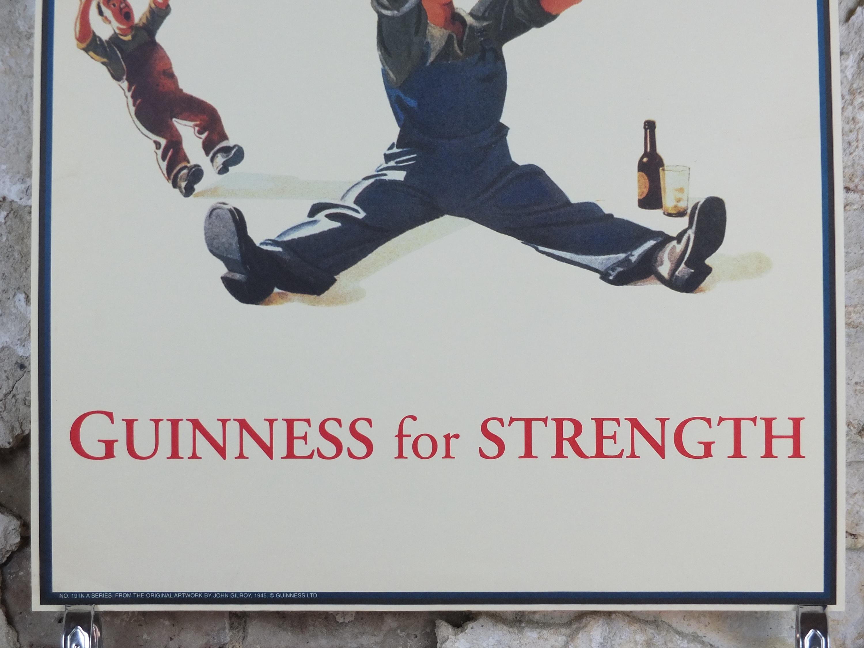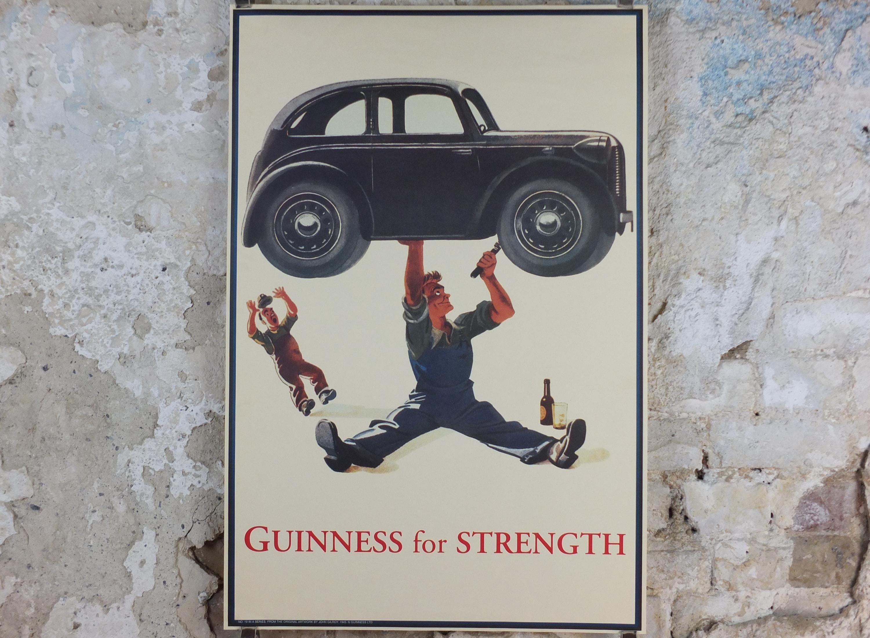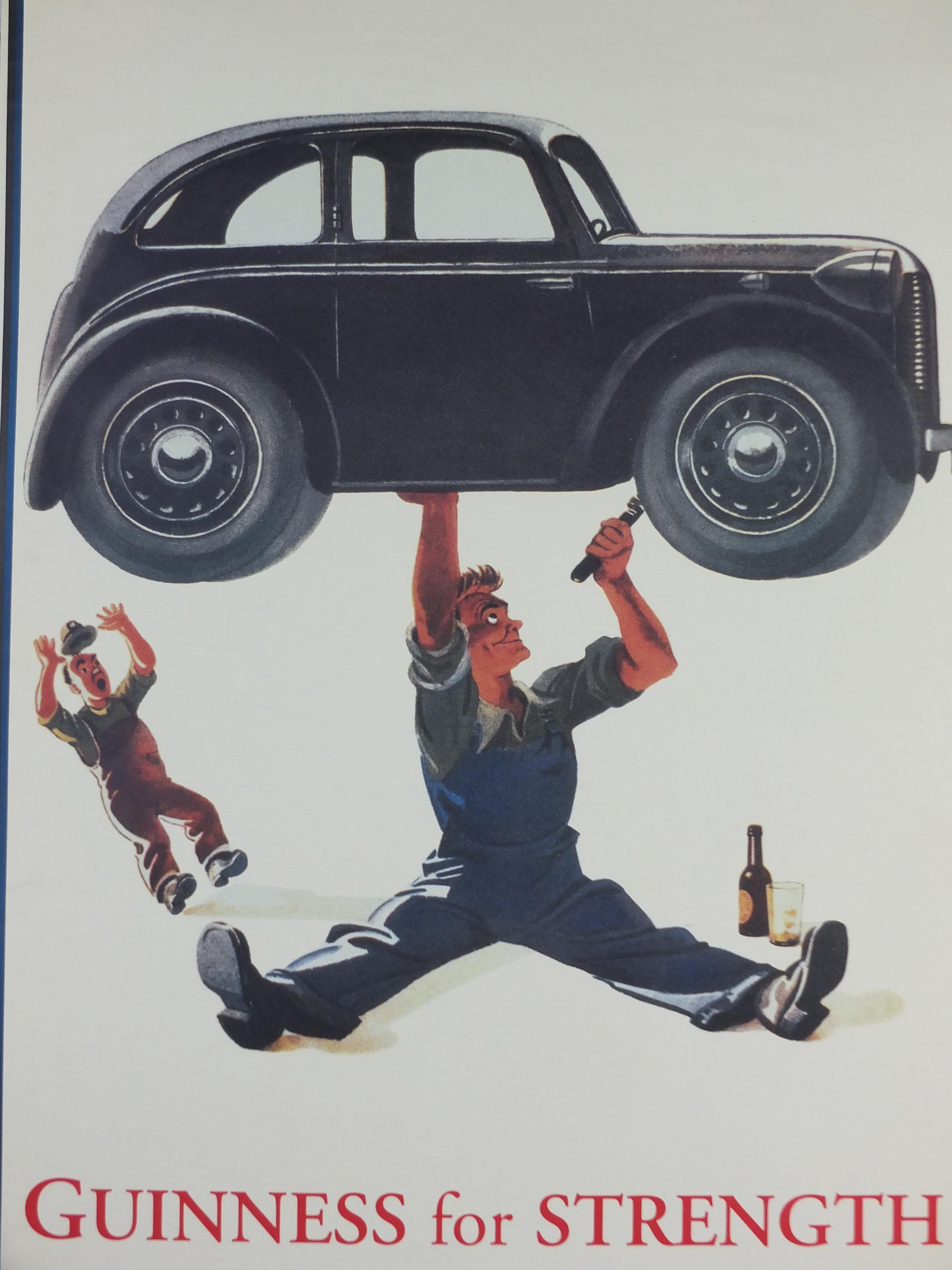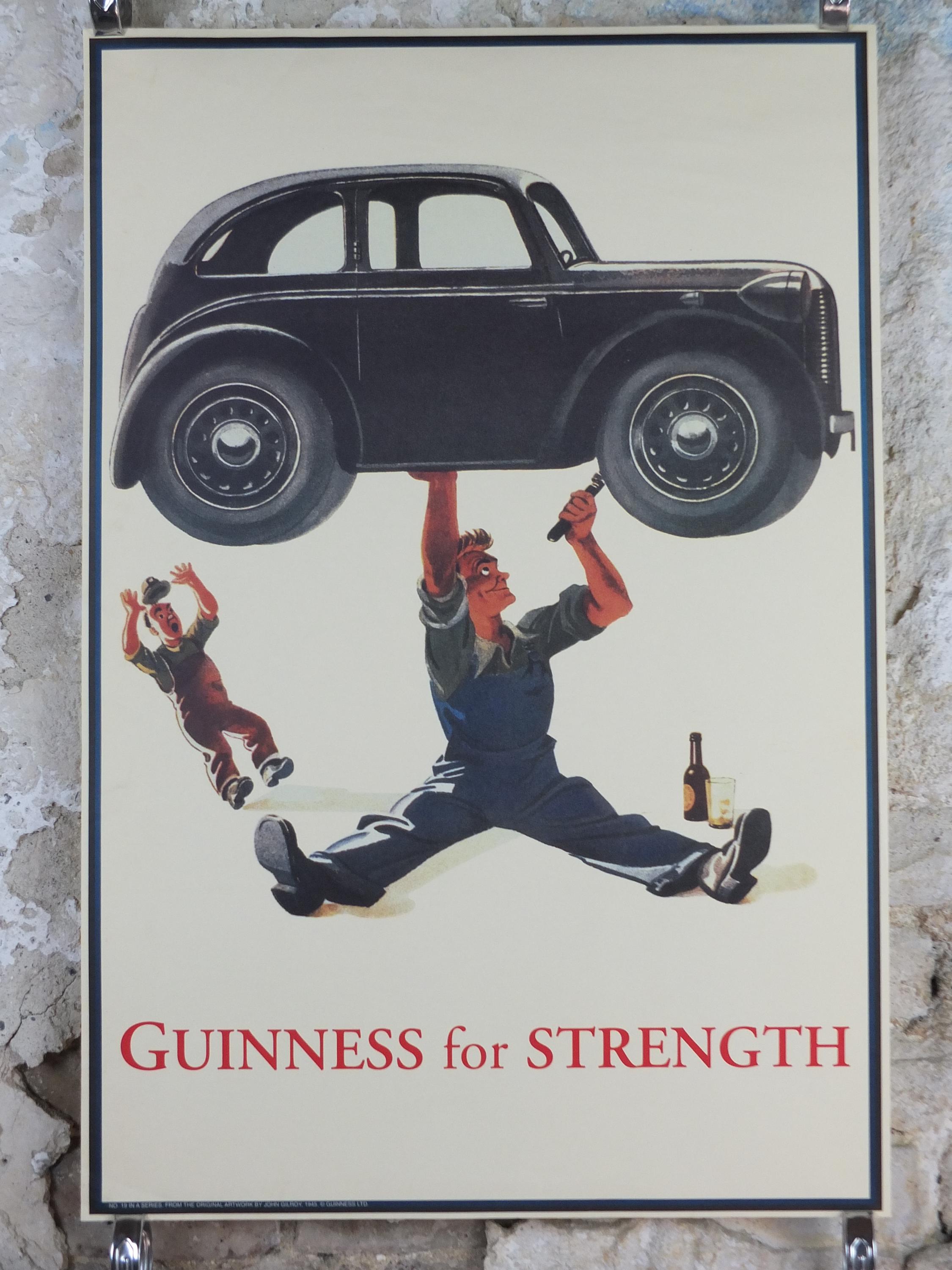 This is a mid 1990s poster from the Guinness Museum in Dublin. It shows a very strong mechanic lifting what looks like an old Ford with his bare hands for making repairs. Like Popeye with his spinach, only it's a Guinness!