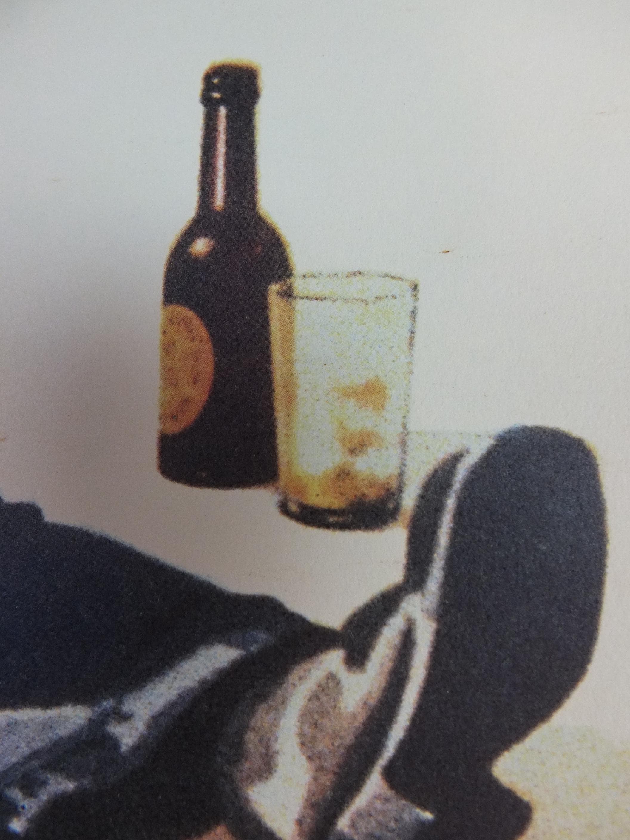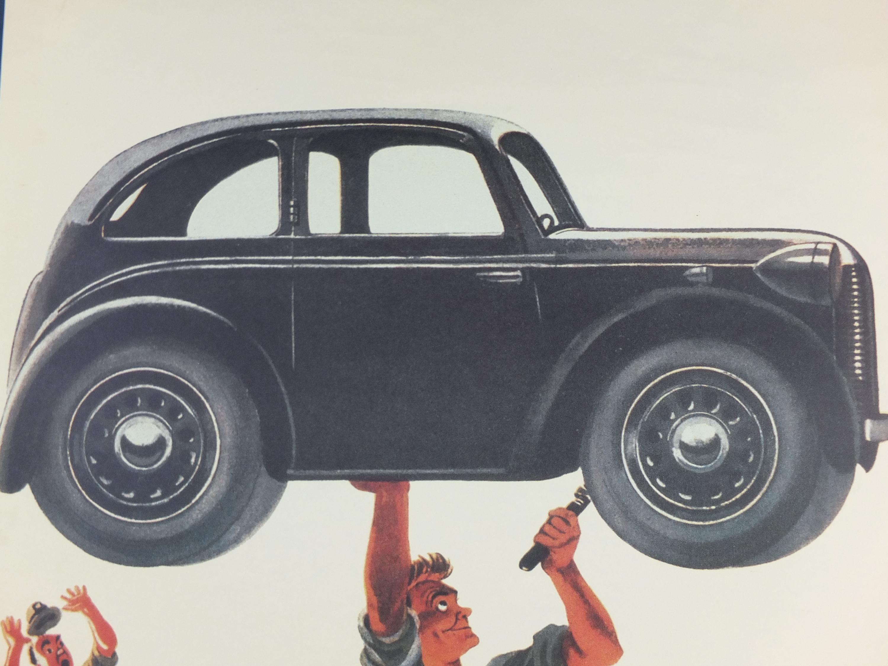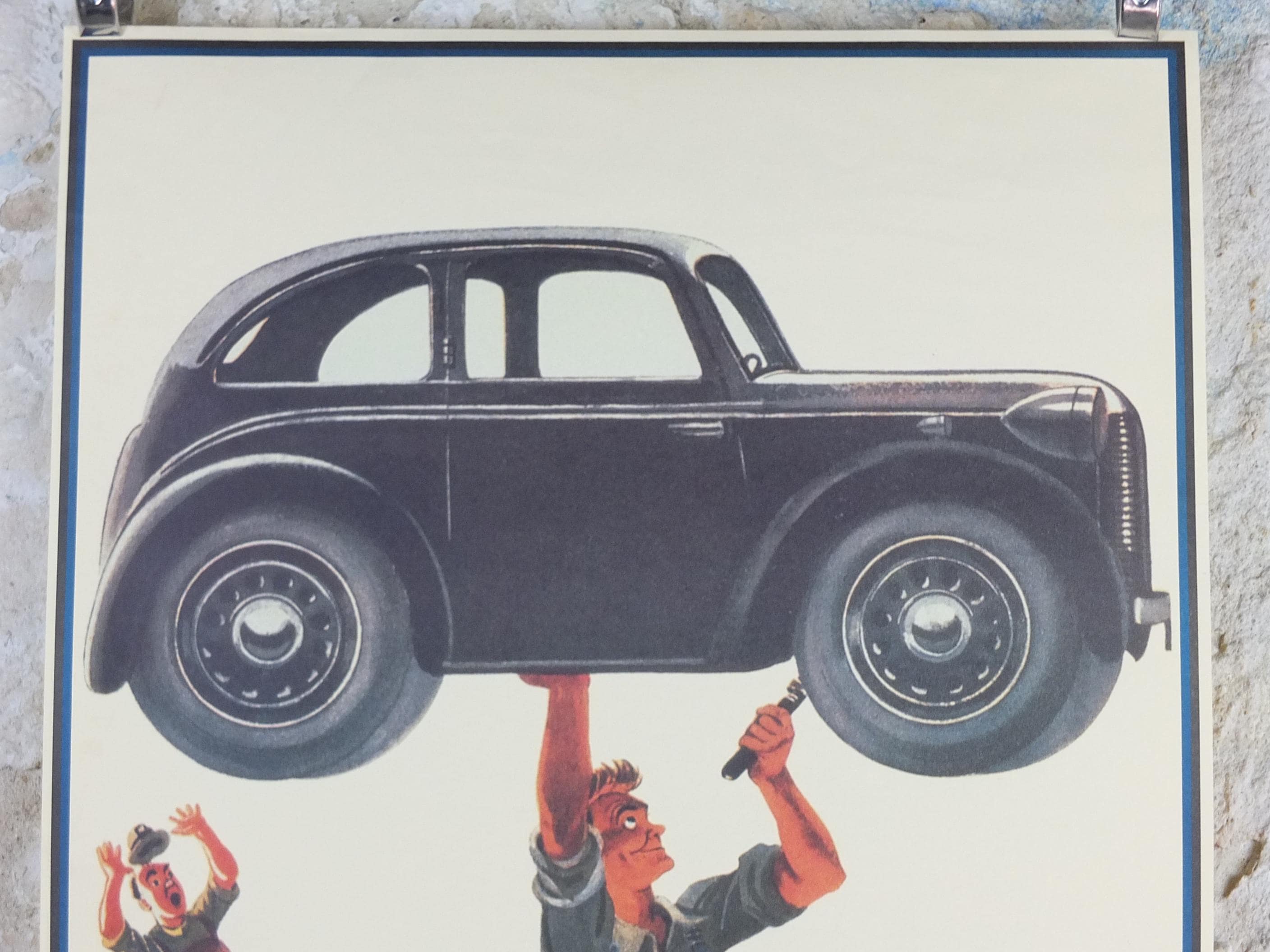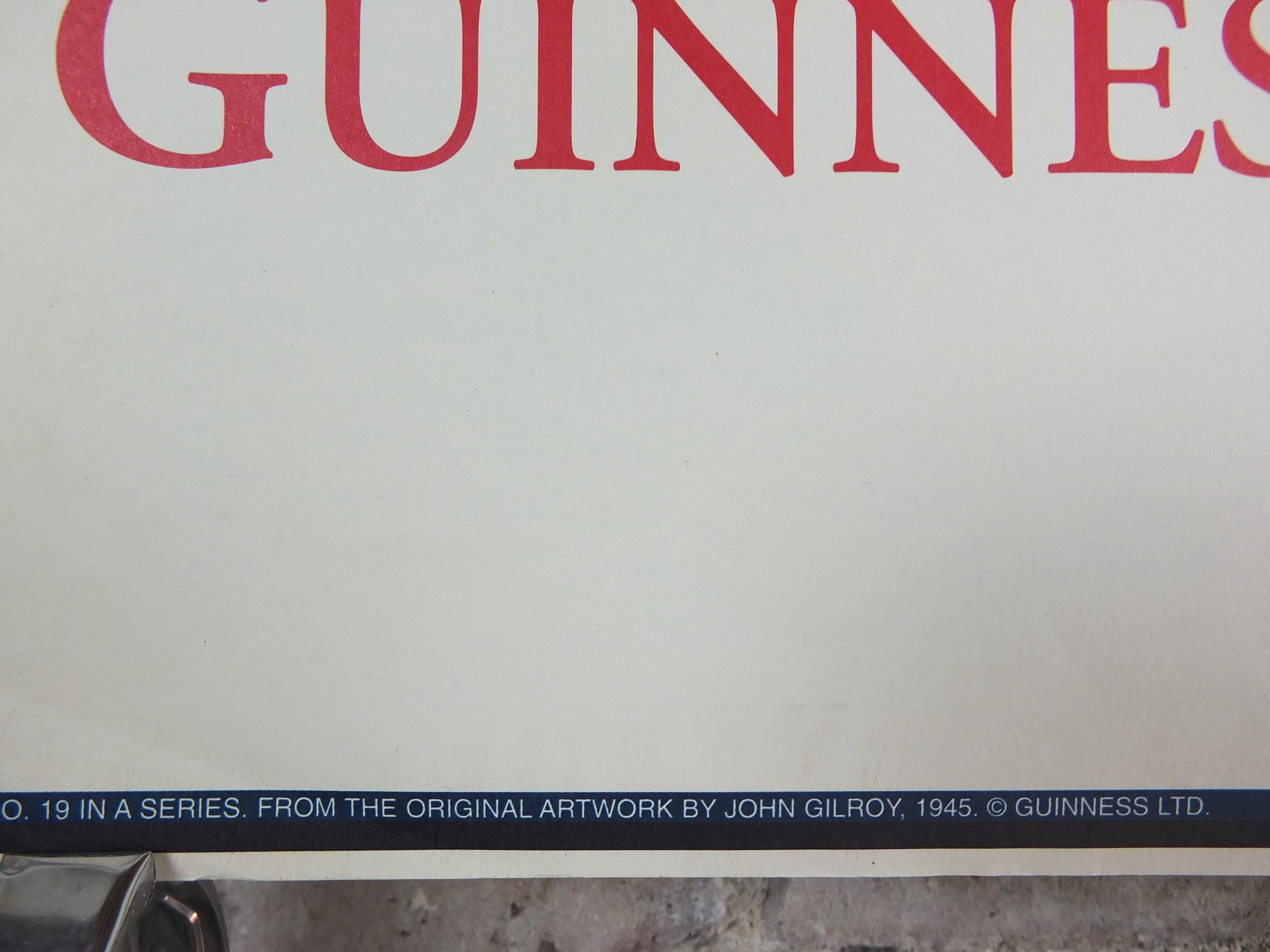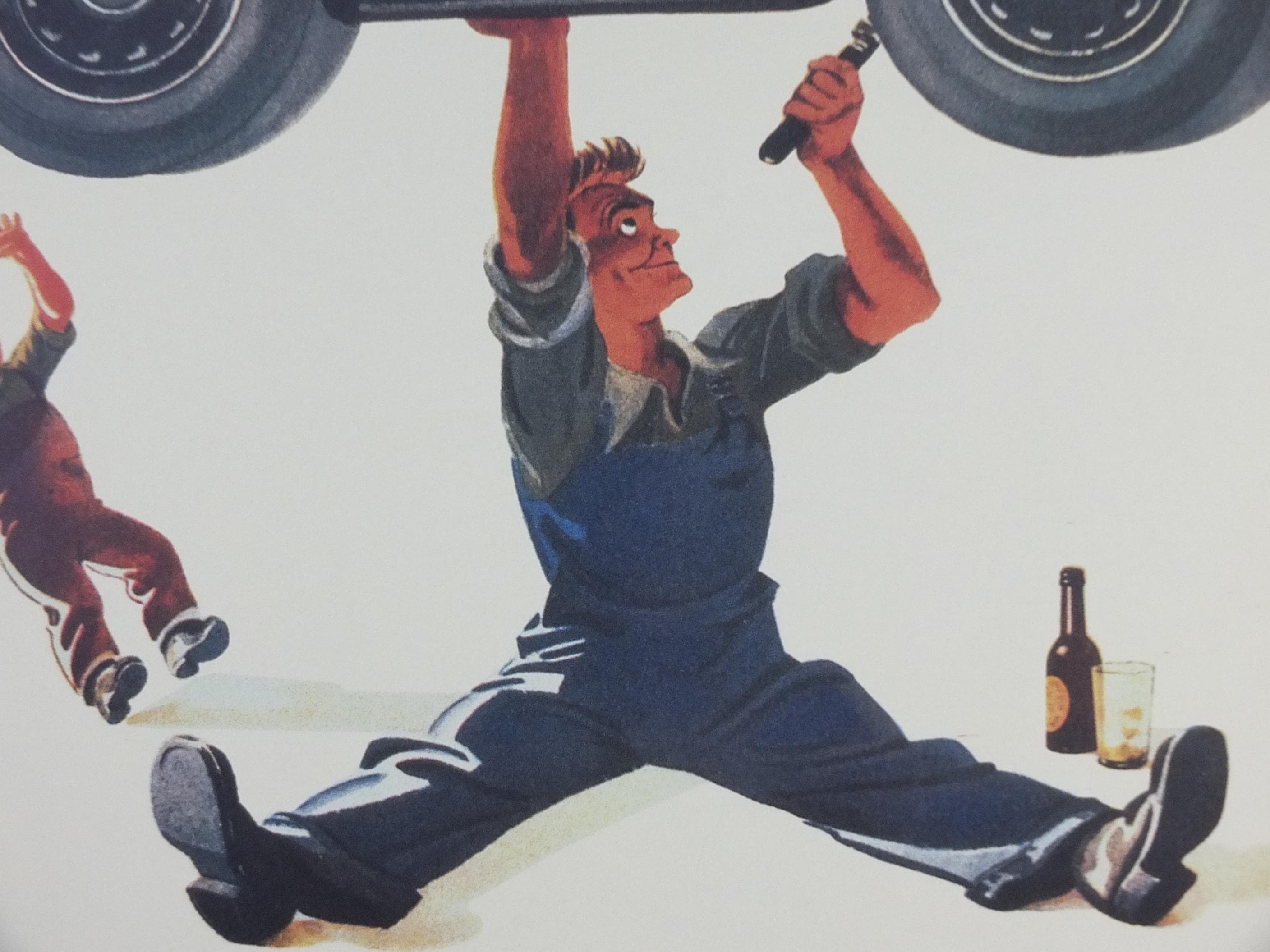 This is a mid 1990s poster from the Guinness Museum in Dublin. It shows a very strong mechanic lifting what looks like an old Ford with his bare hands for making repairs. Like Popeye with his spinach, only it's a Guinness!
