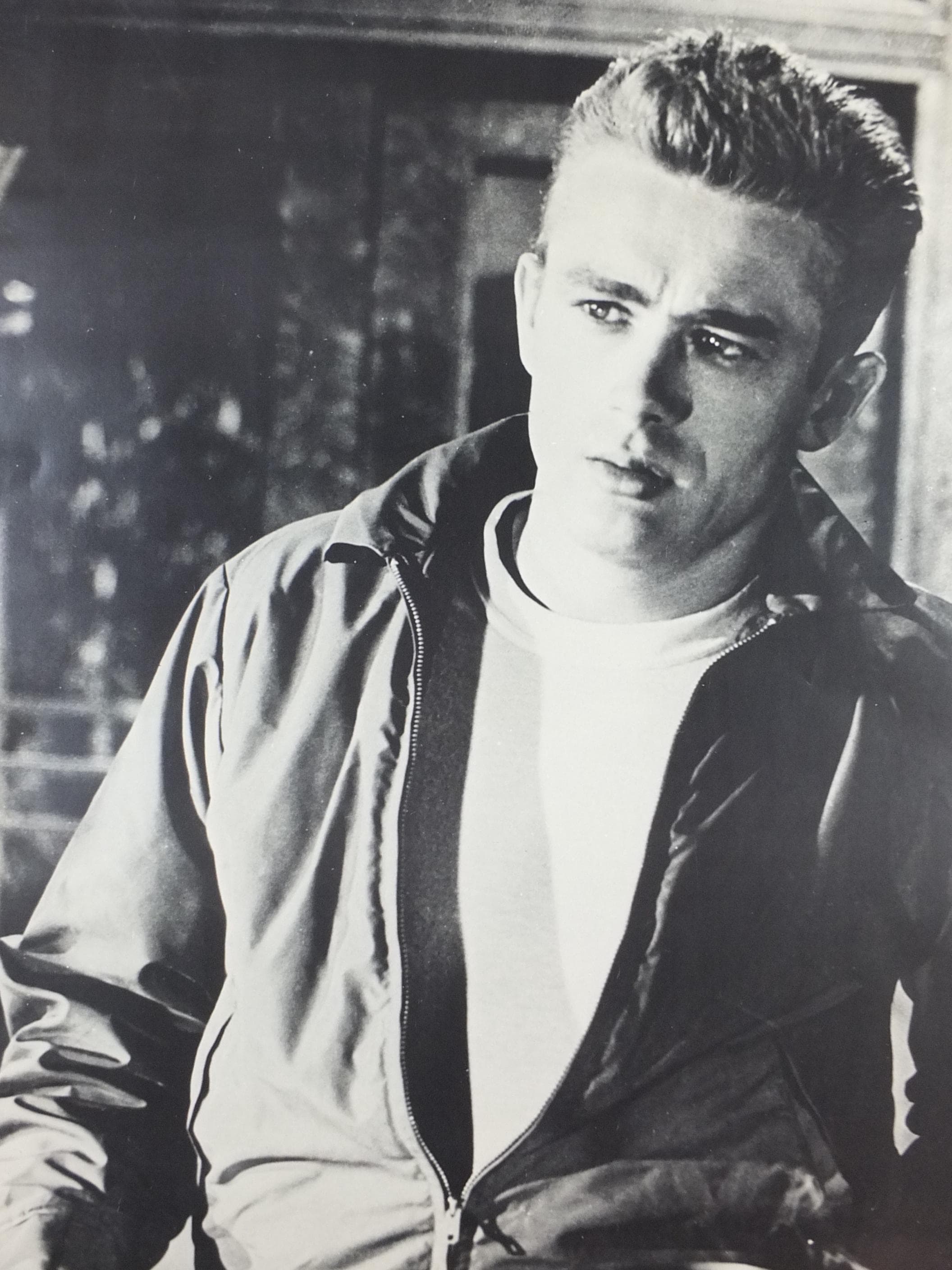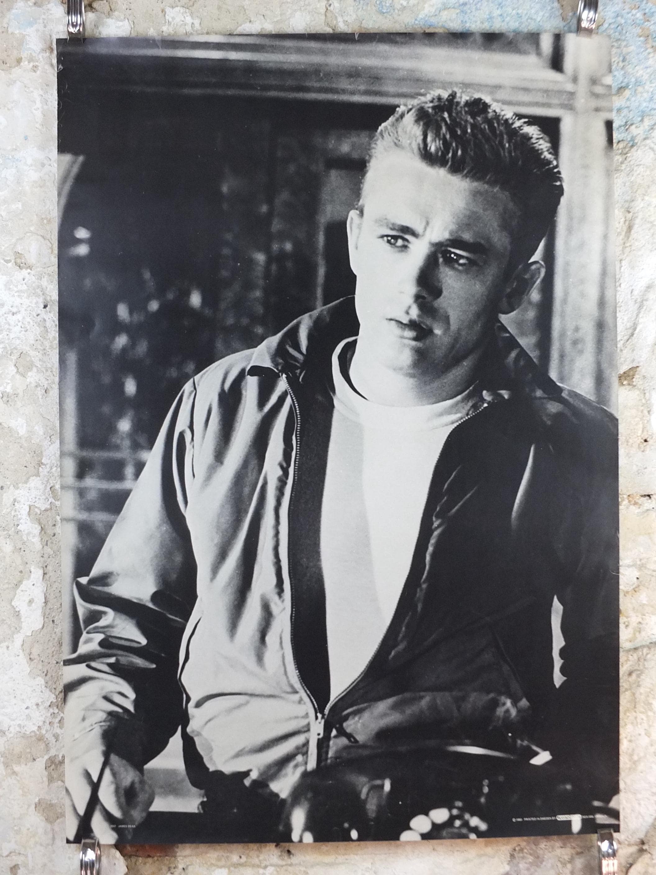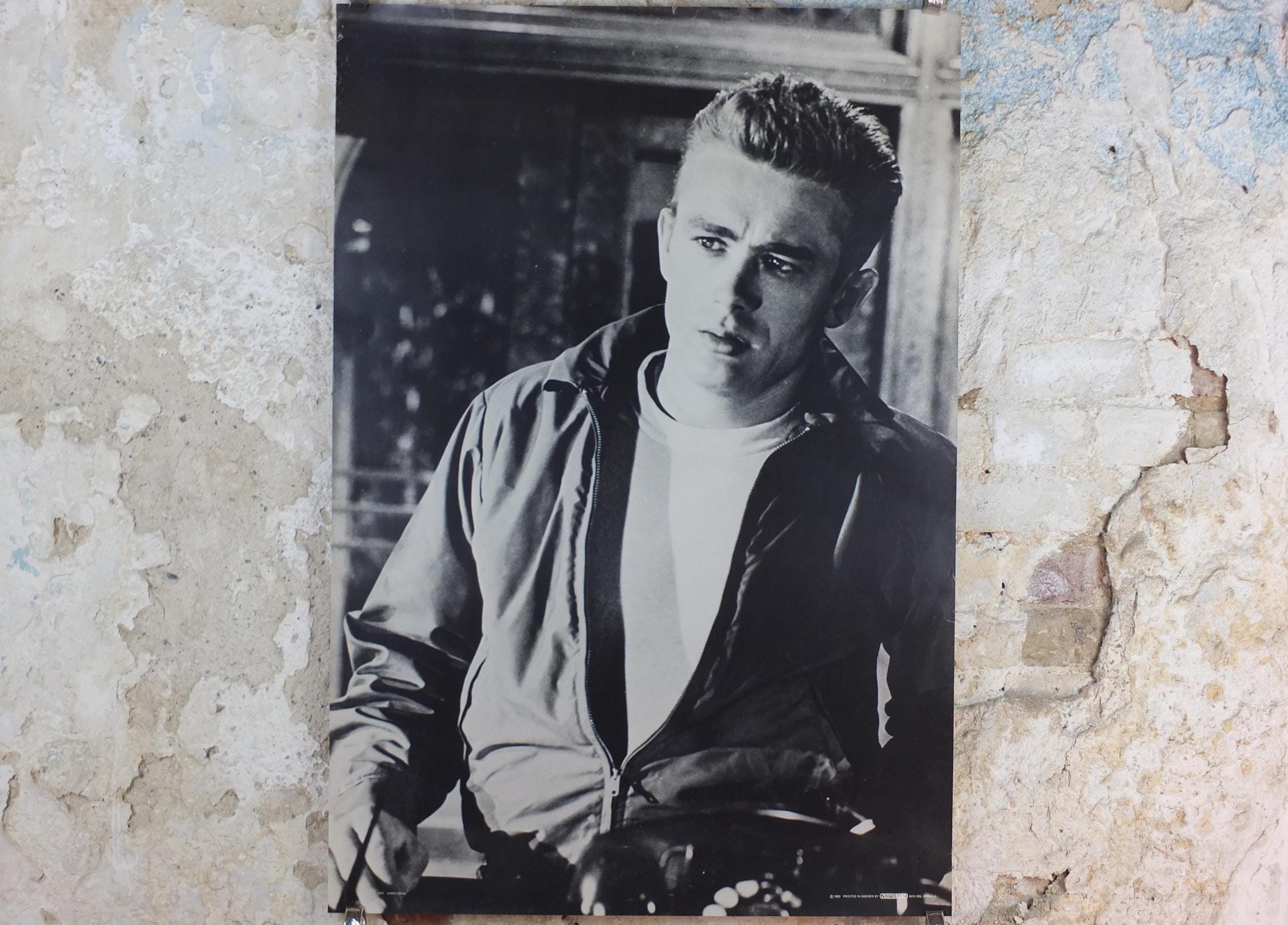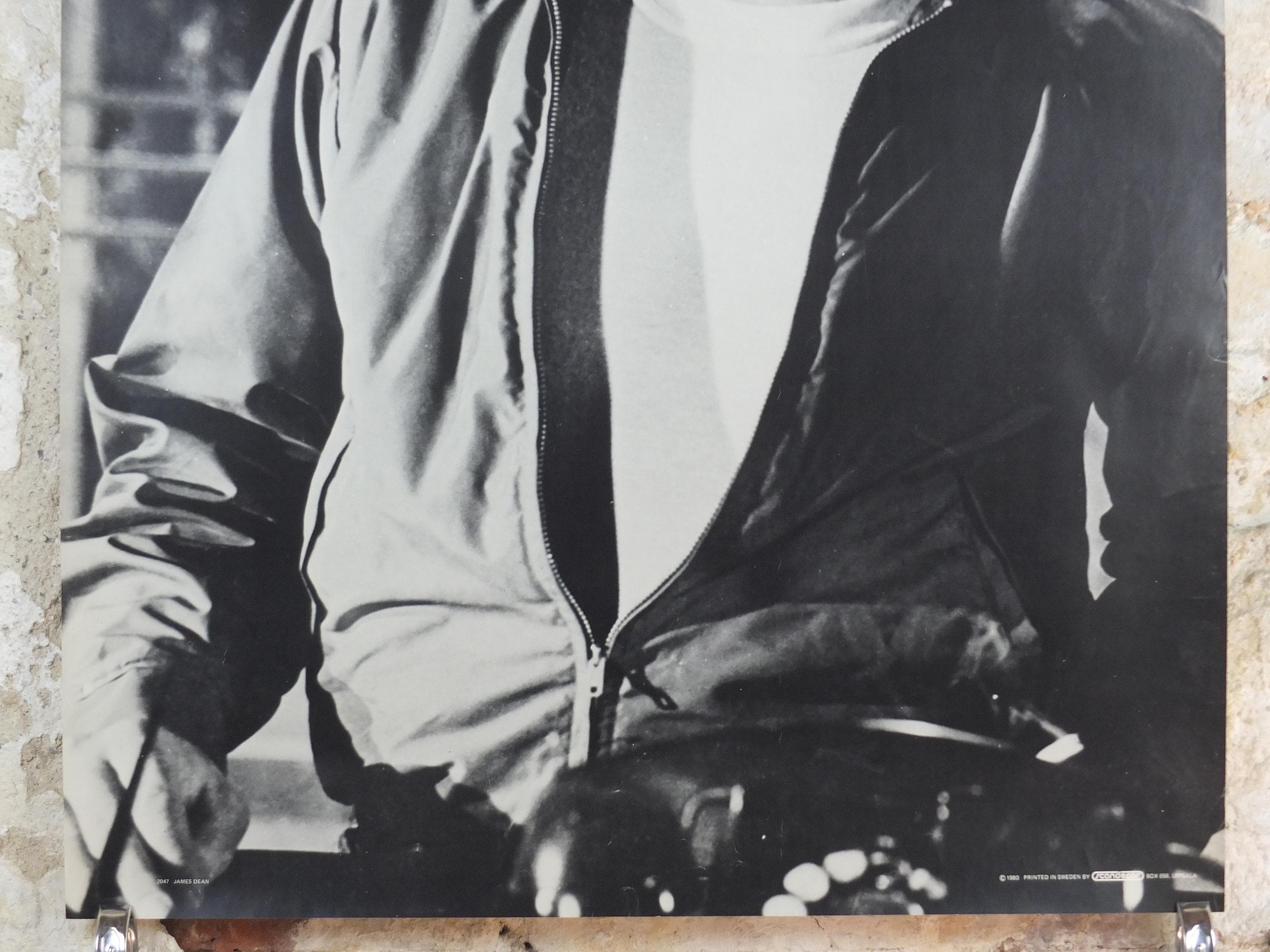 This is a vintage poster from the 1980 of James Dean from the movie "Rebel Without a Cause". He's wearing a zippered jacket over a simple white T-shirt, a look that became an iconic symbol of youthful rebellion in the 1950s.