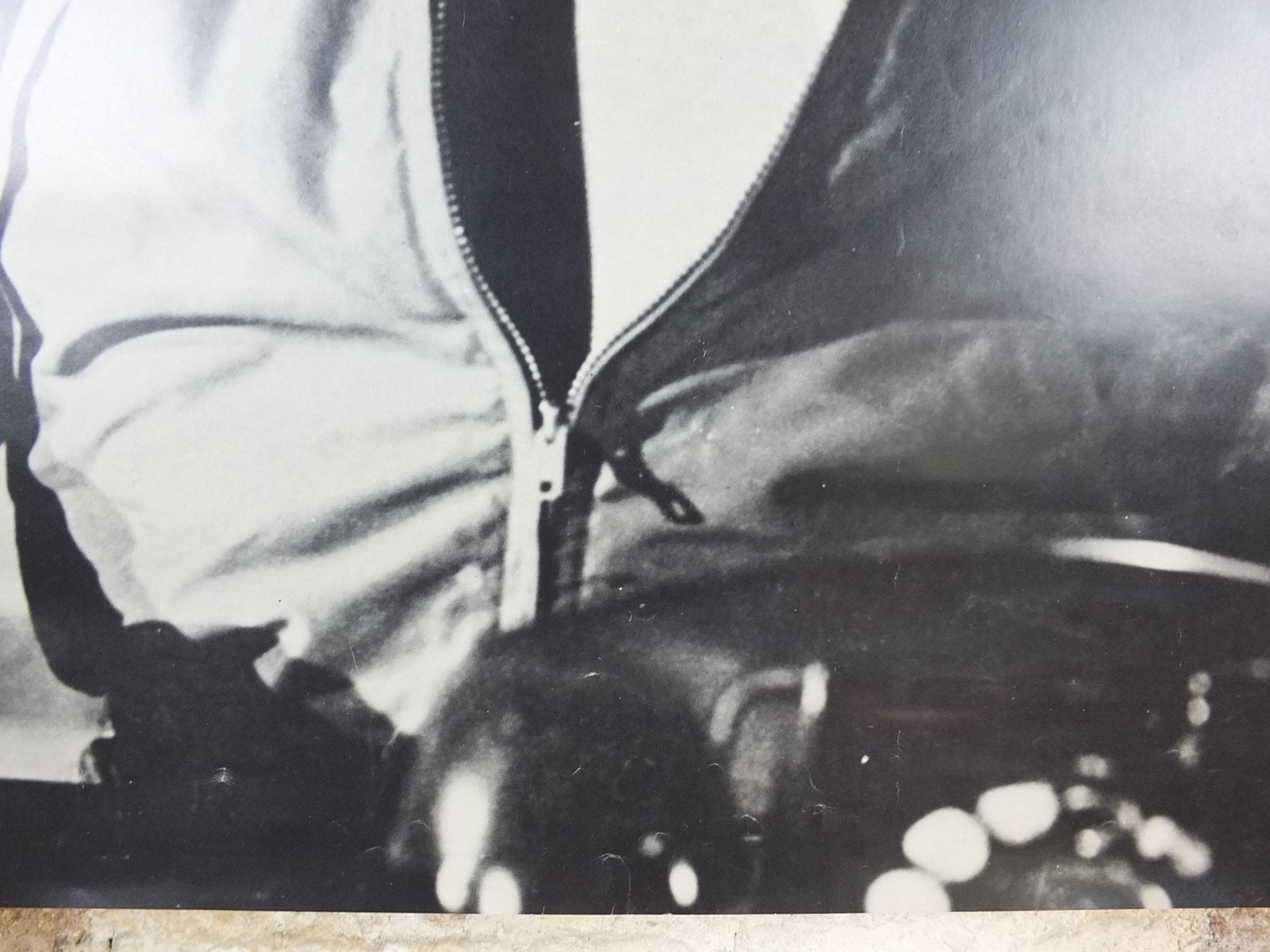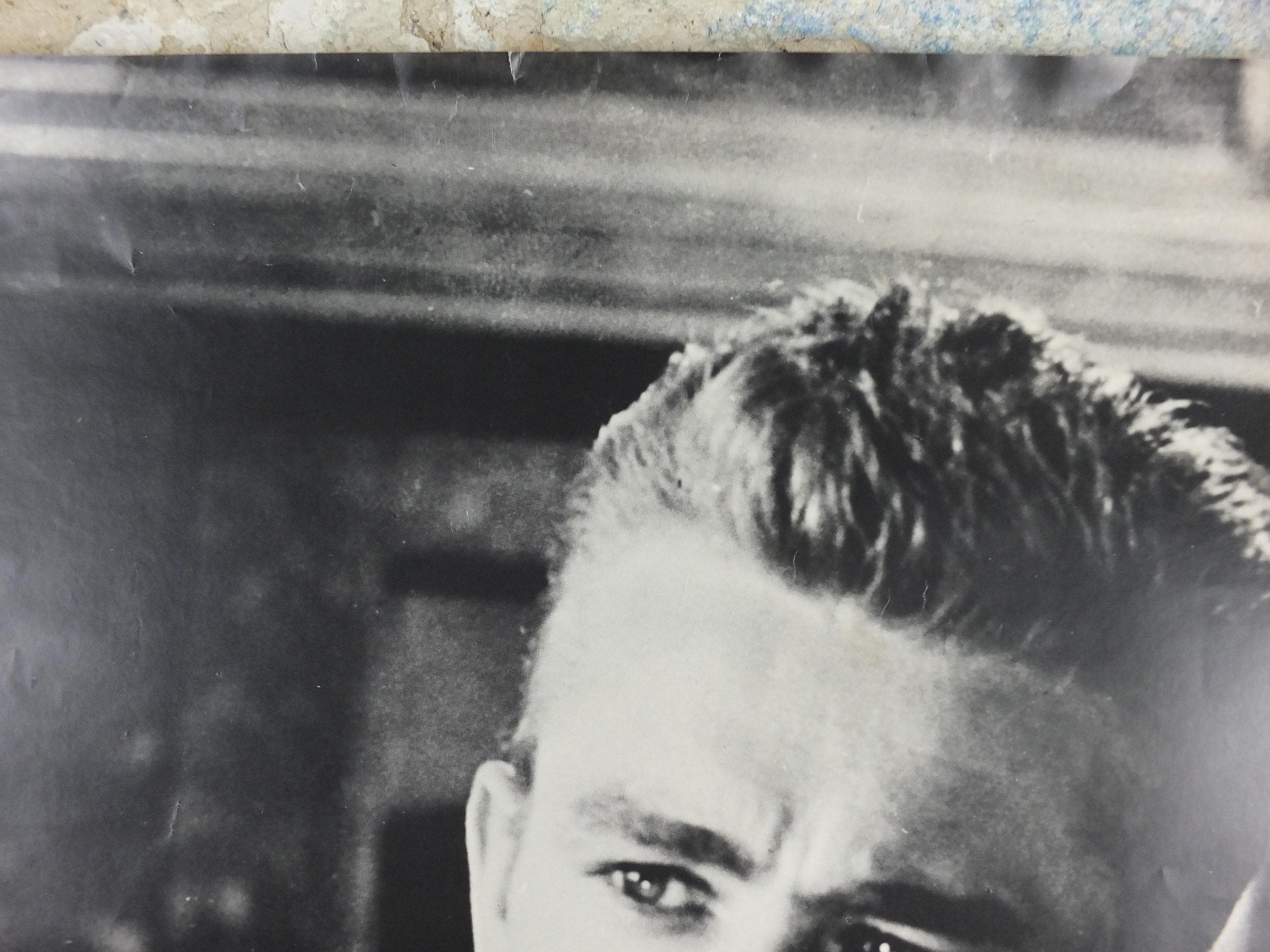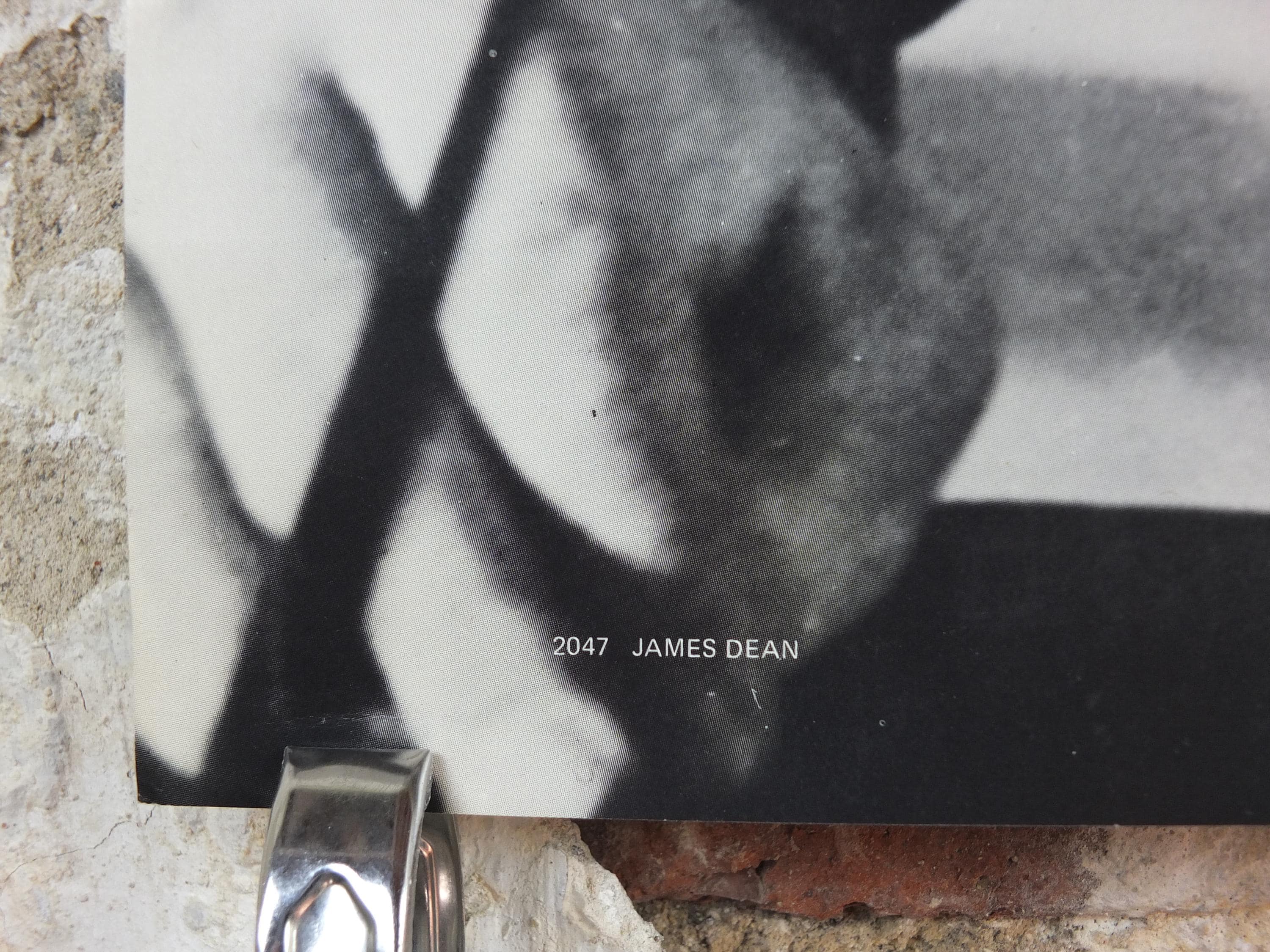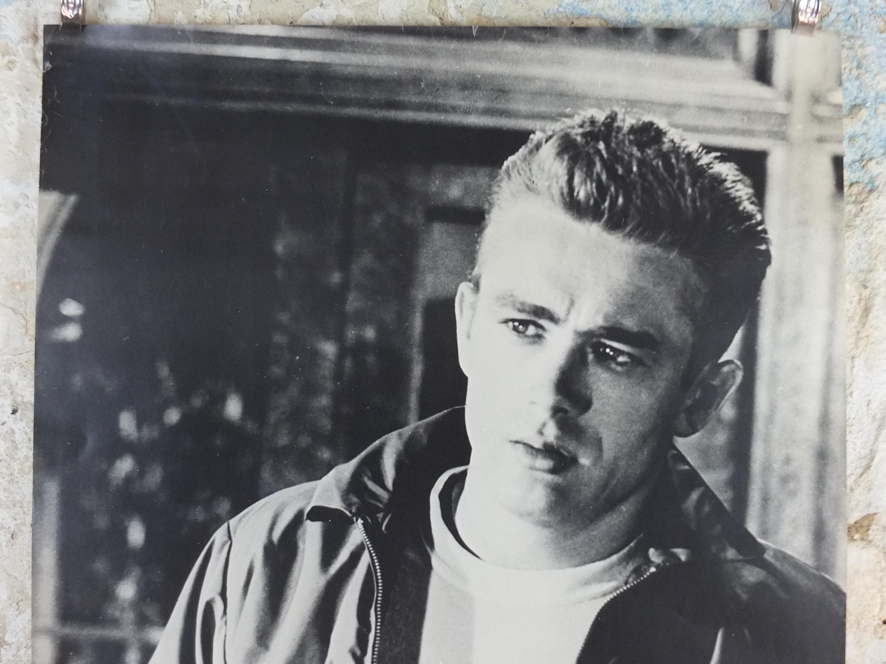 This is a vintage poster from the 1980 of James Dean from the movie "Rebel Without a Cause". He's wearing a zippered jacket over a simple white T-shirt, a look that became an iconic symbol of youthful rebellion in the 1950s.