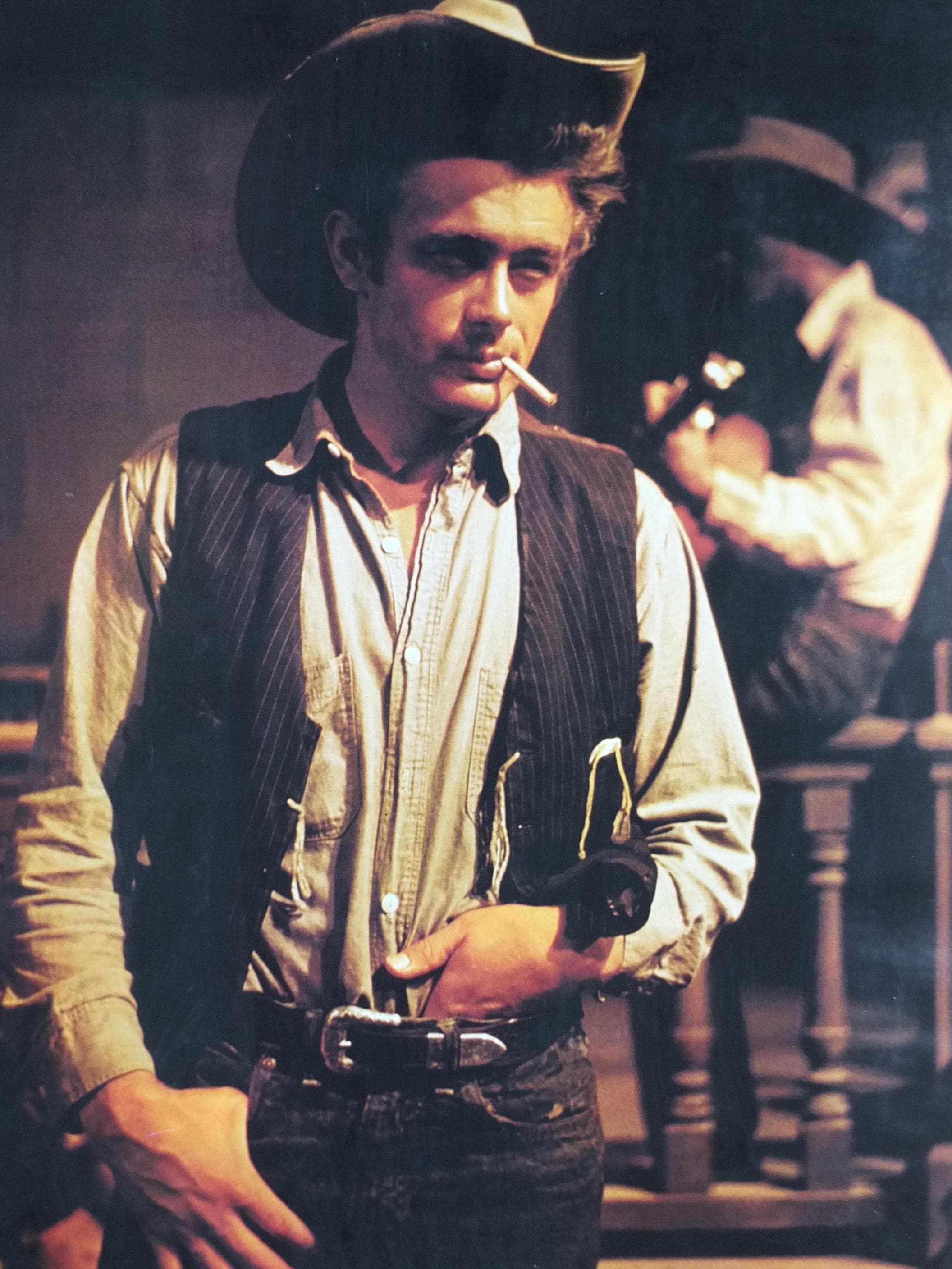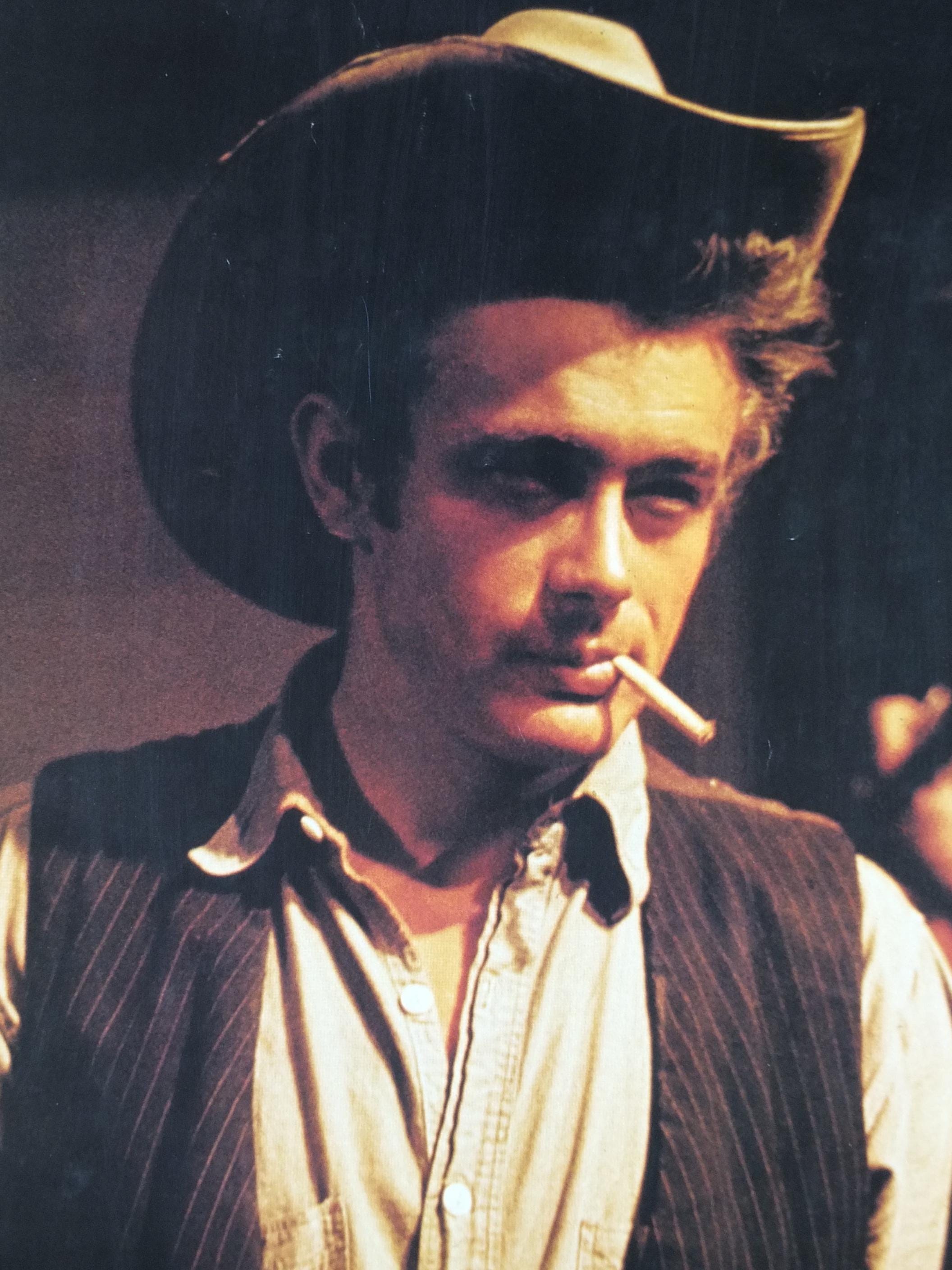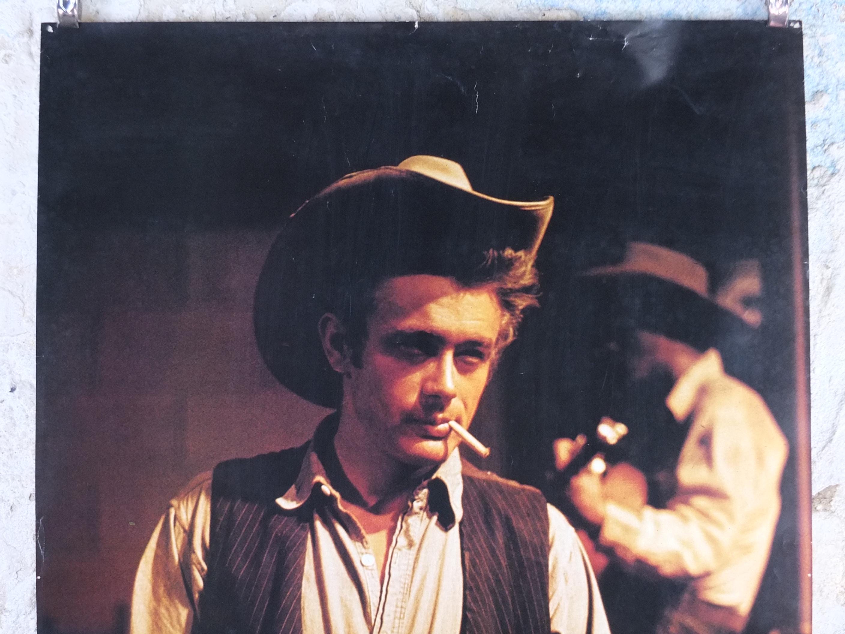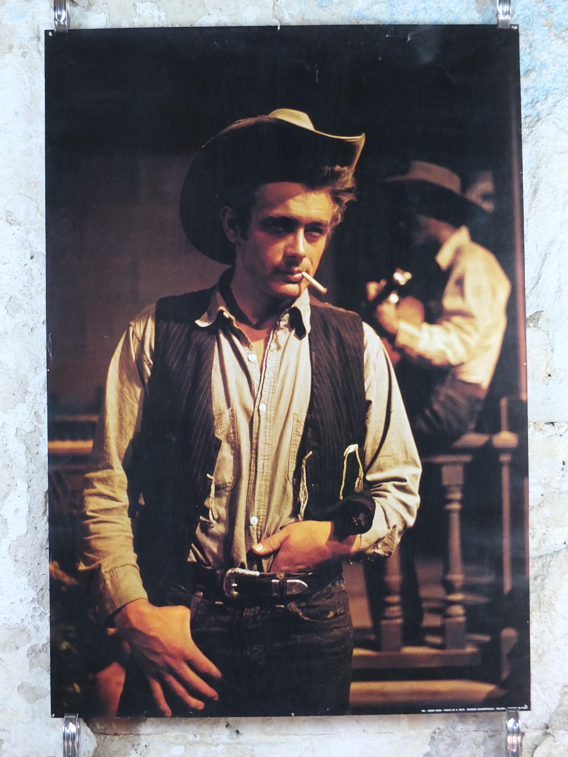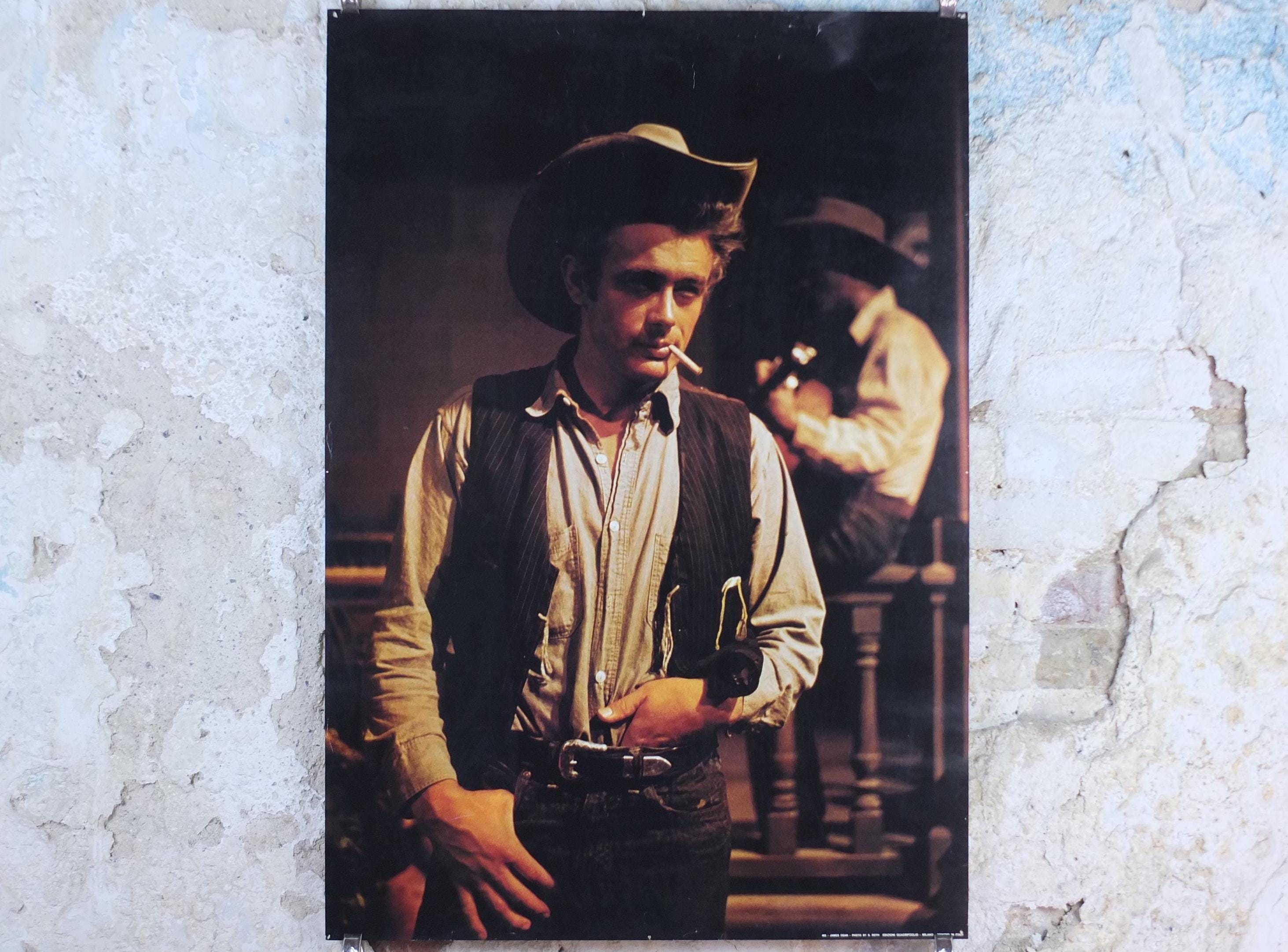 This is a vintage poster from the 1980s of James Dean from the movie "Giant". James Dean in his cowboy attire for the film, complete with a wide-brimmed hat, a vest, a button-down shirt, and jeans, with a cigarette hanging from his lips—a classic, brooding image that perfectly embodies the rebellious spirit he was famous for.