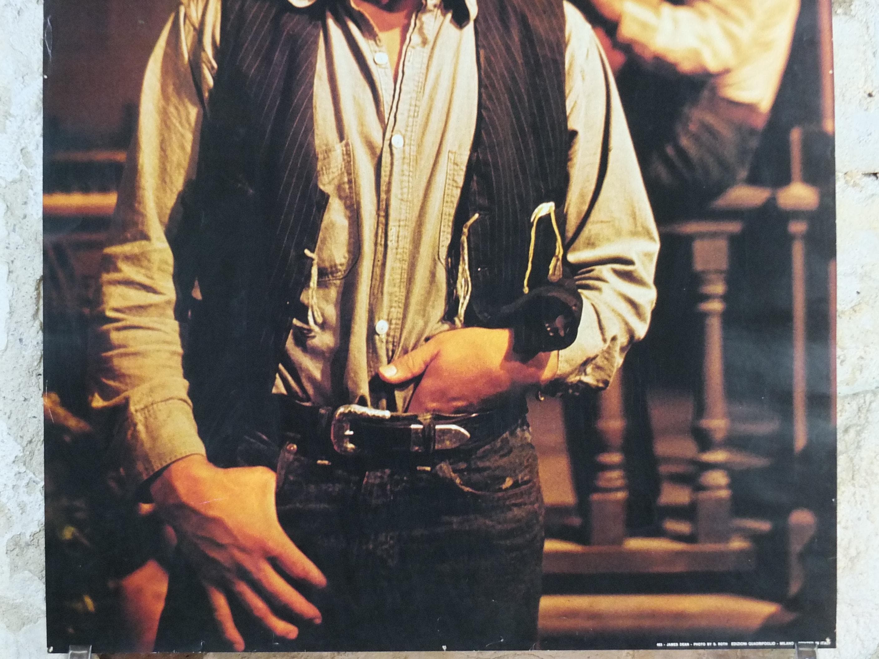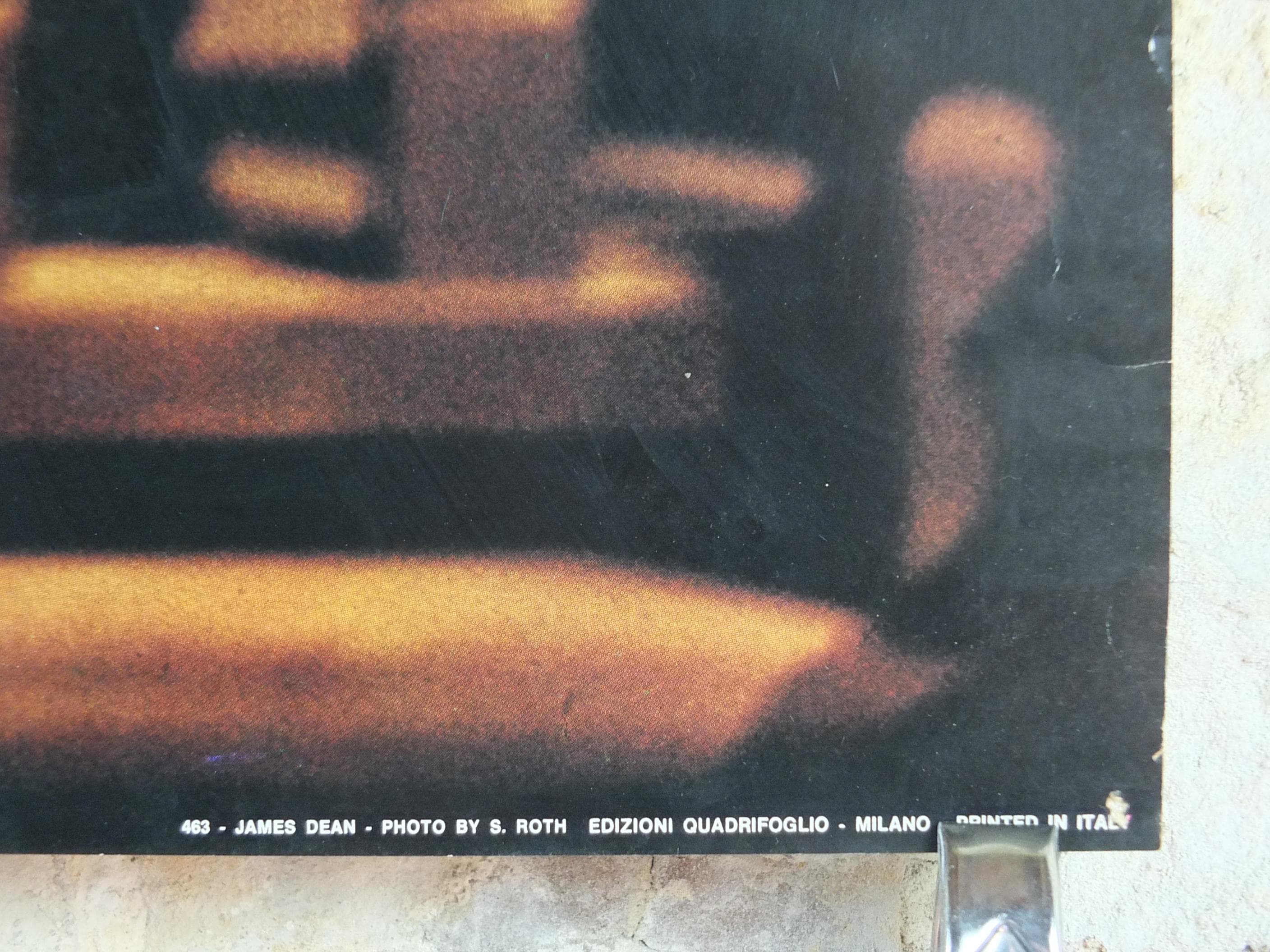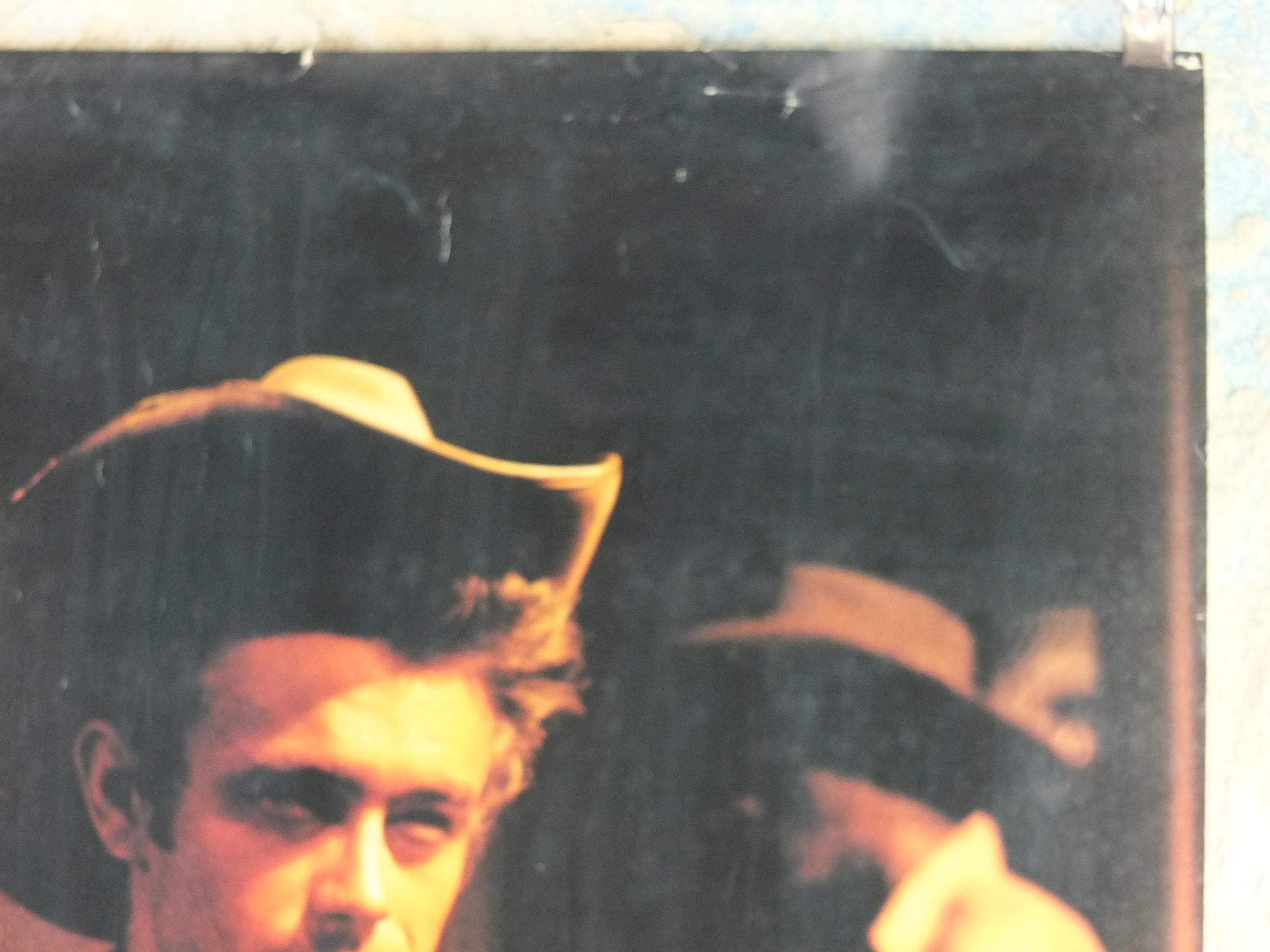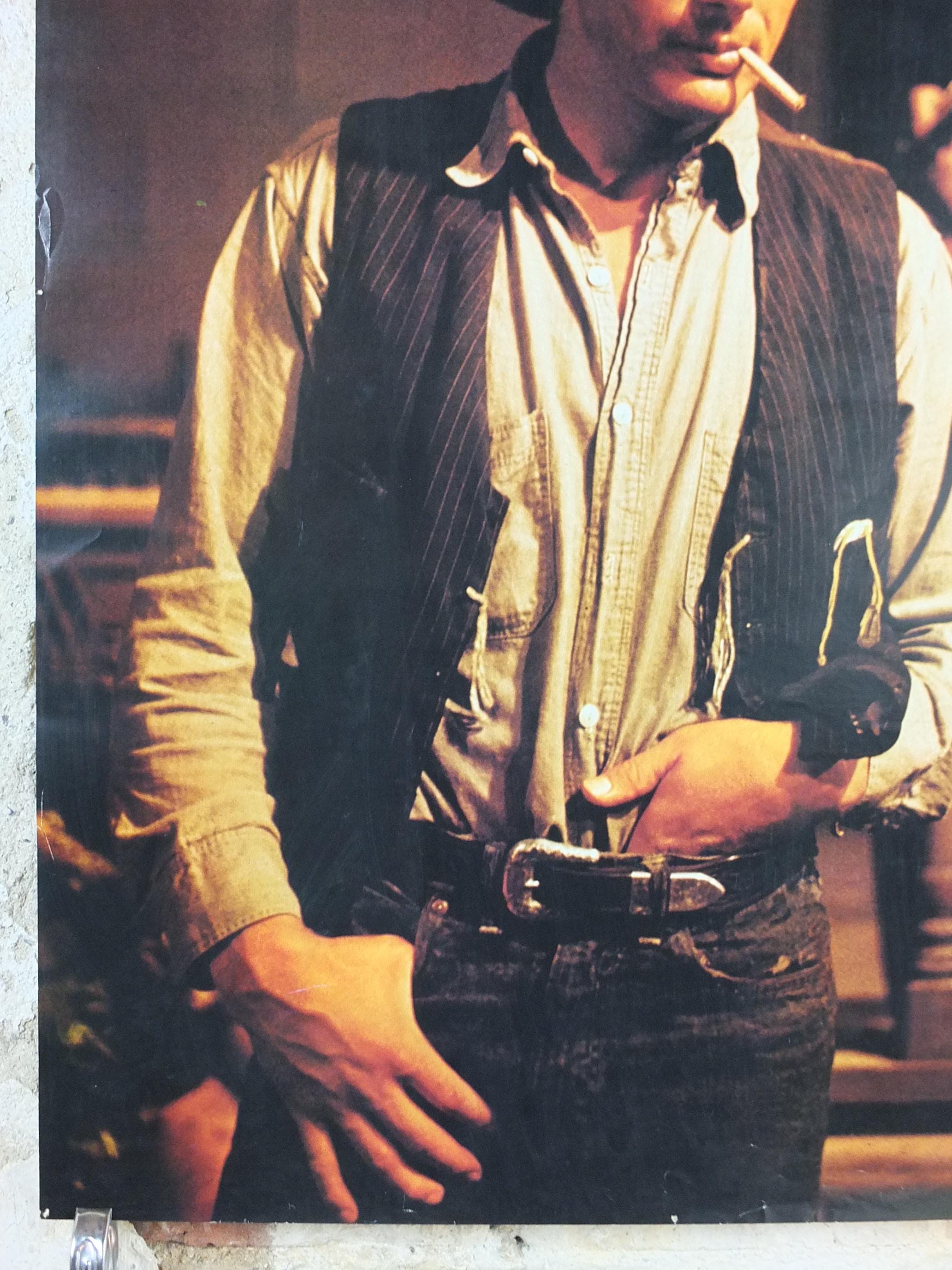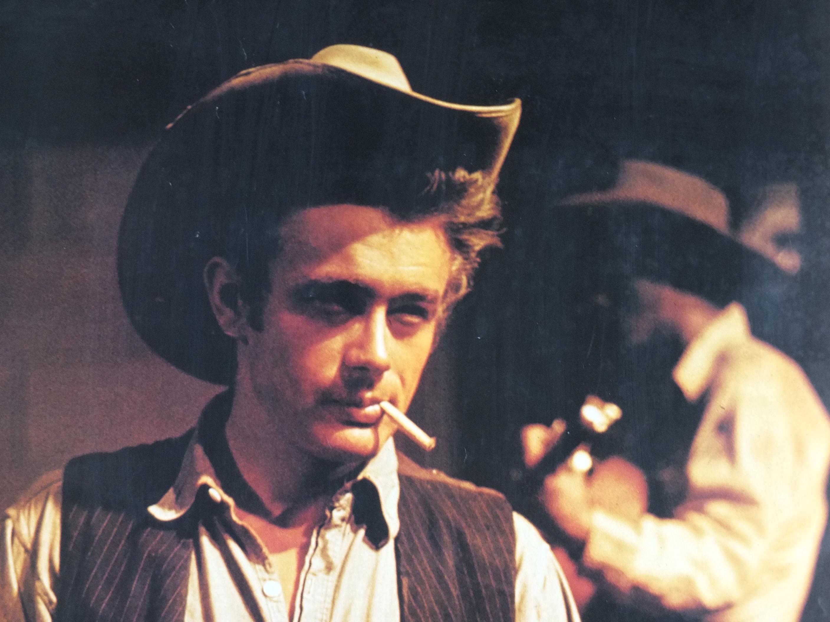 This is a vintage poster from the 1980s of James Dean from the movie "Giant". James Dean in his cowboy attire for the film, complete with a wide-brimmed hat, a vest, a button-down shirt, and jeans, with a cigarette hanging from his lips—a classic, brooding image that perfectly embodies the rebellious spirit he was famous for.