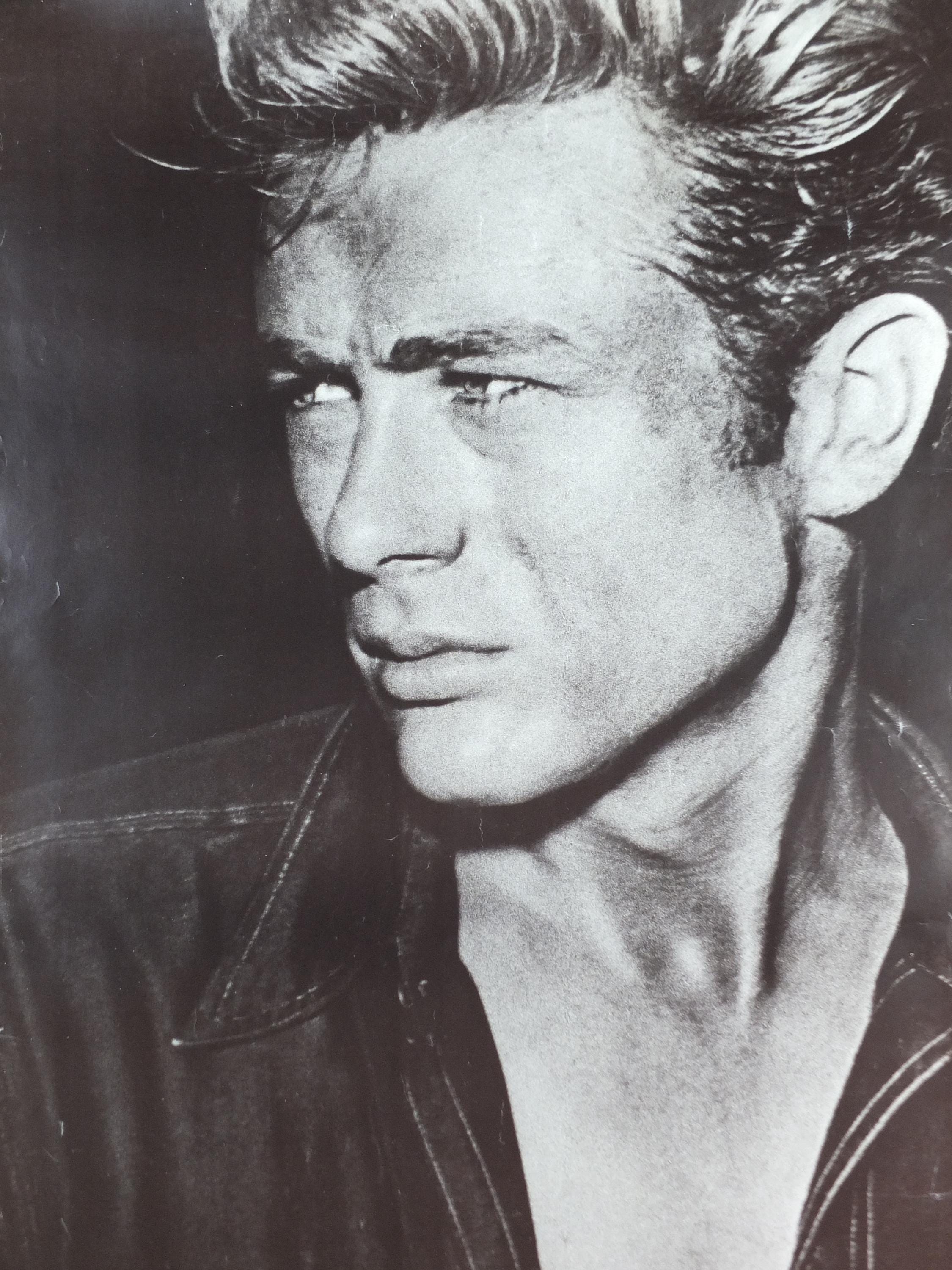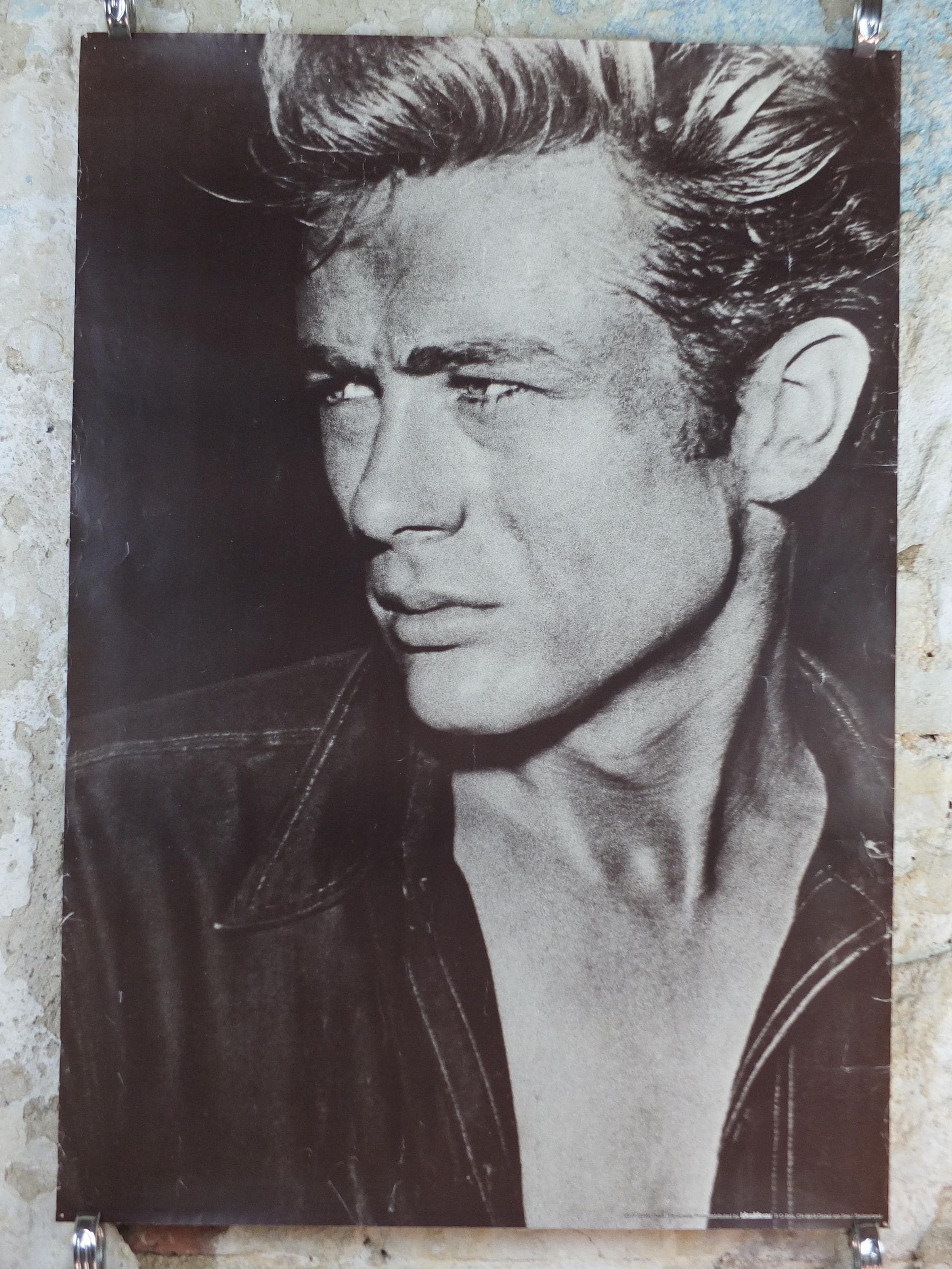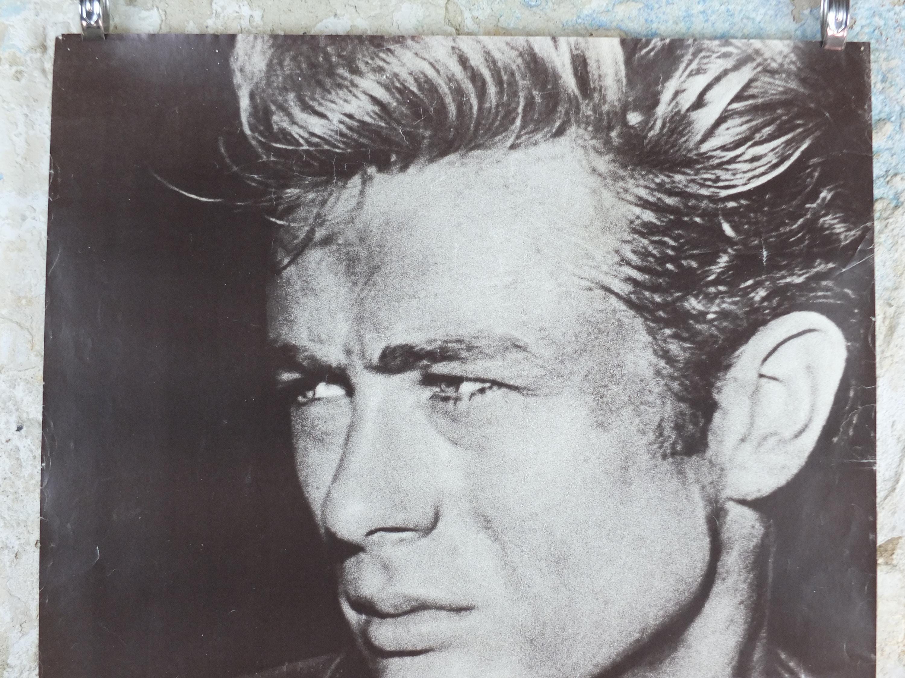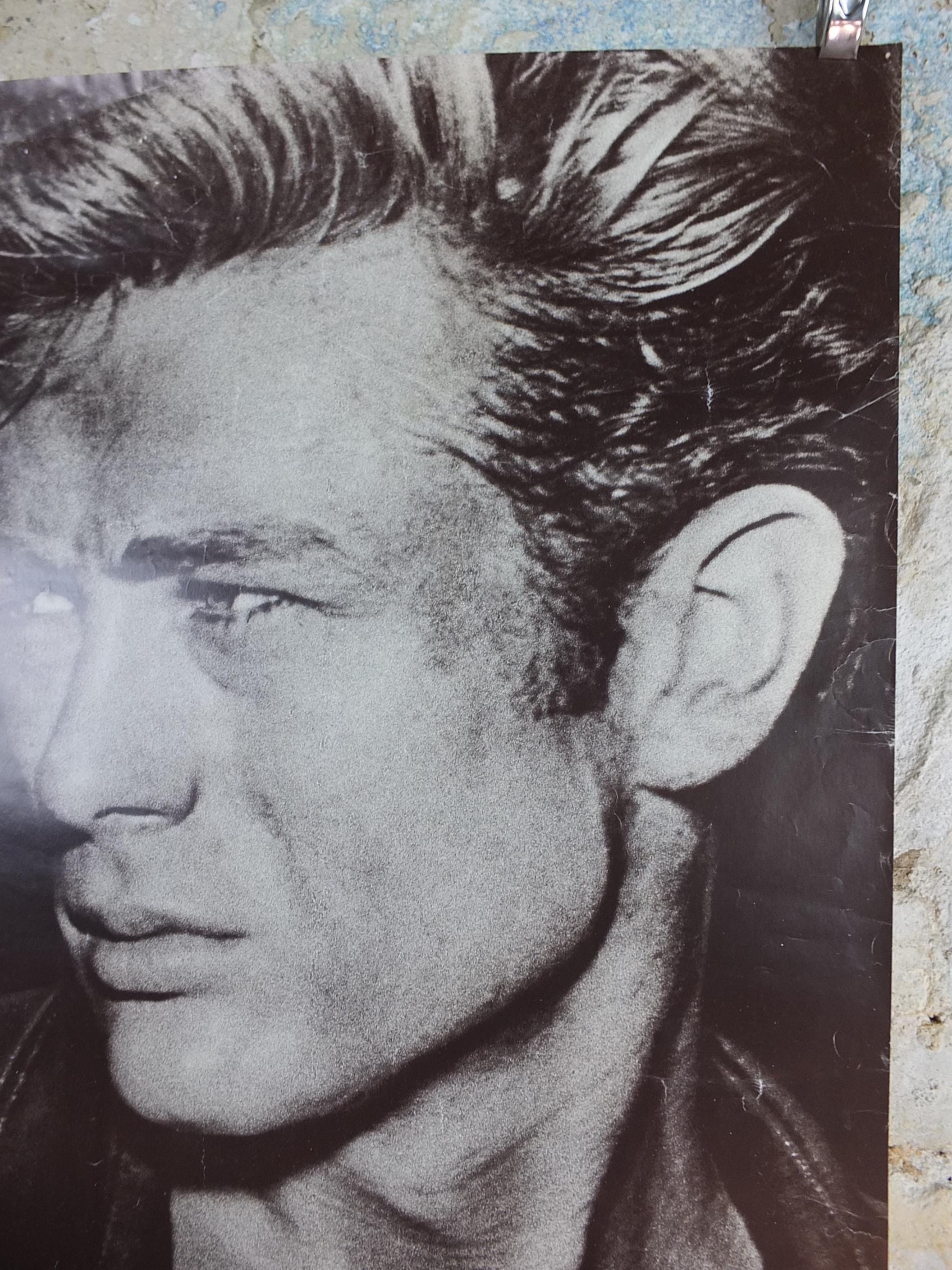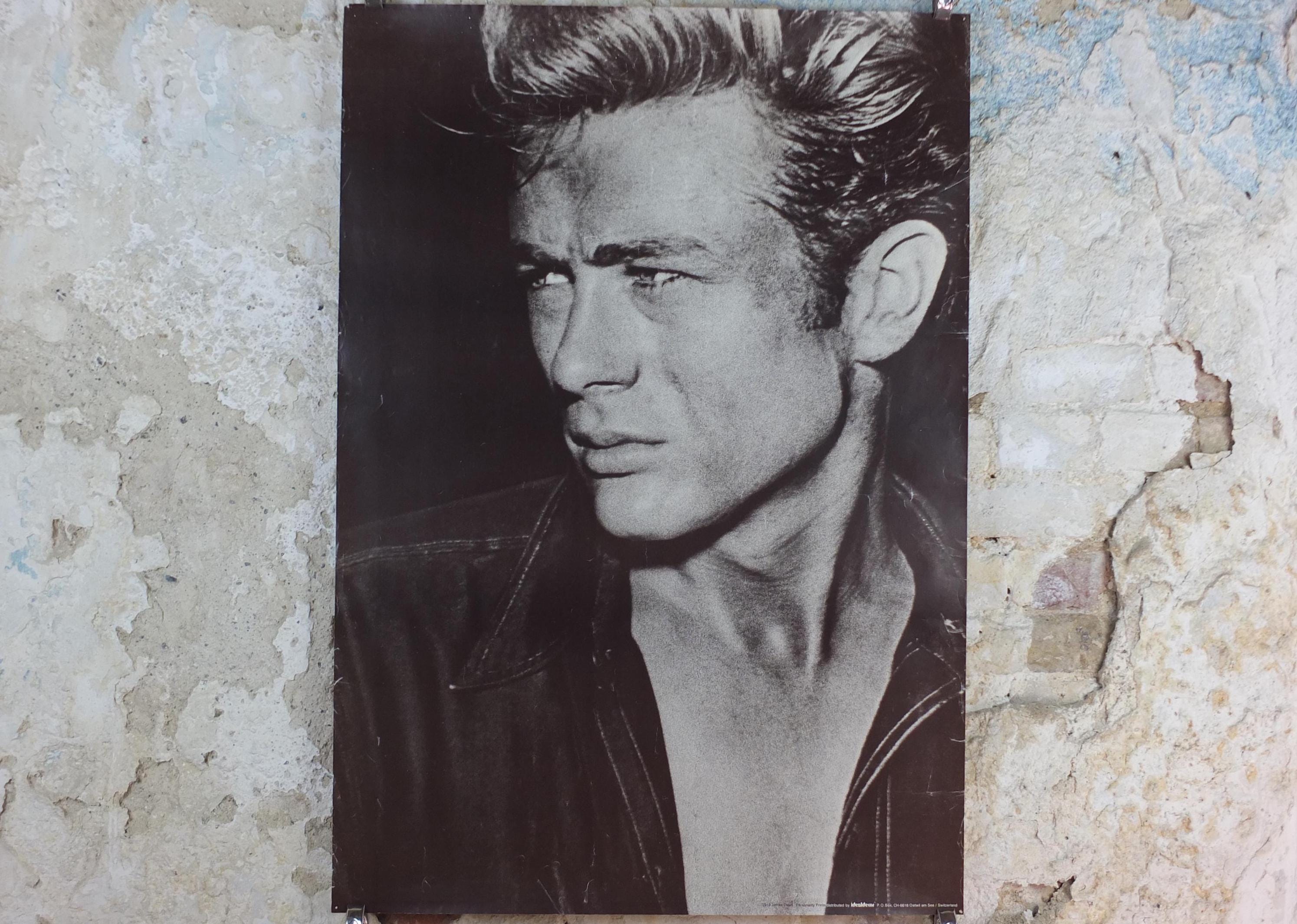 This is a vintage poster from the 1980s of James Dean from the movie "Rebel Without a Cause". Its a close-up with his hair styled in a distinctive pompadour and wearing a leather or dark denim jacket—this image is most commonly associated with his persona as the troubled youth Jim Stark from the classic film