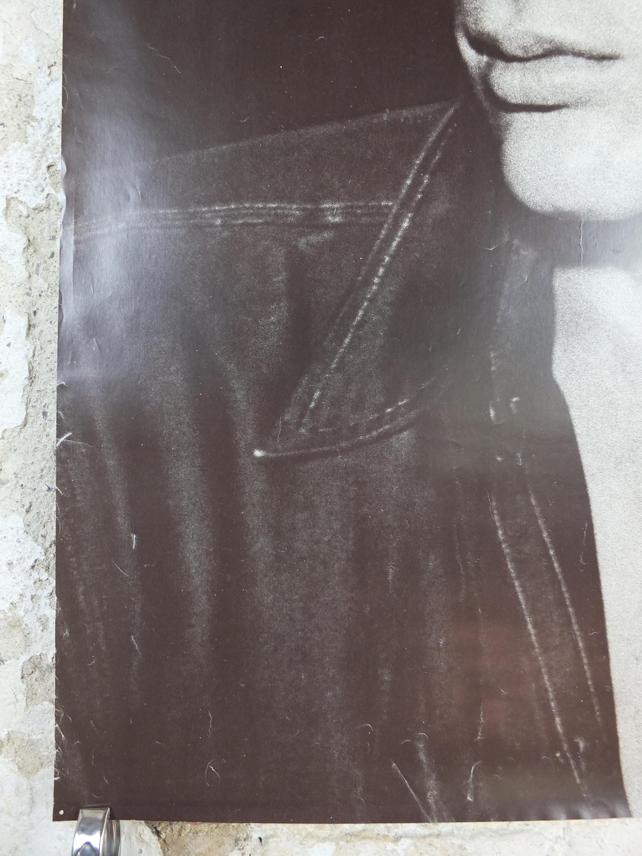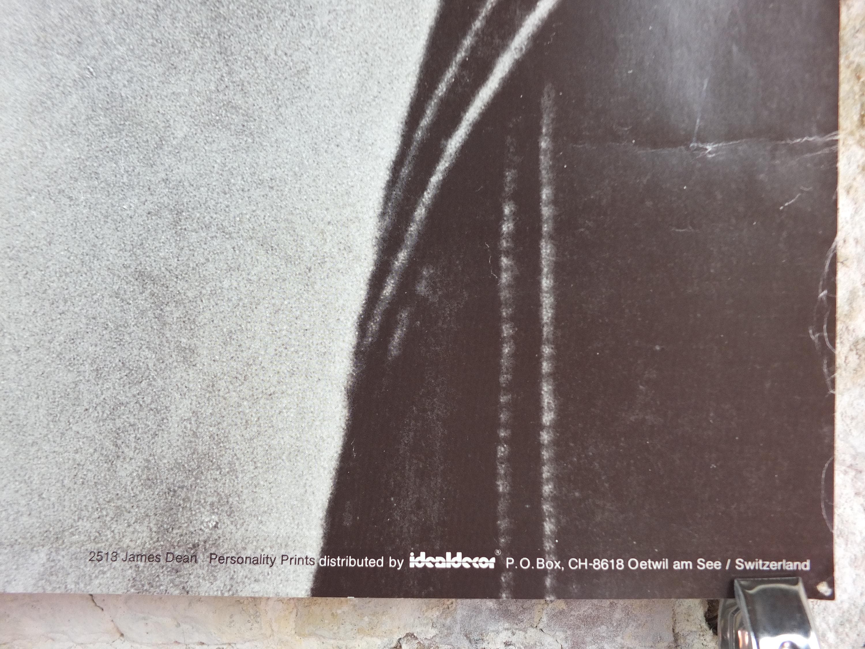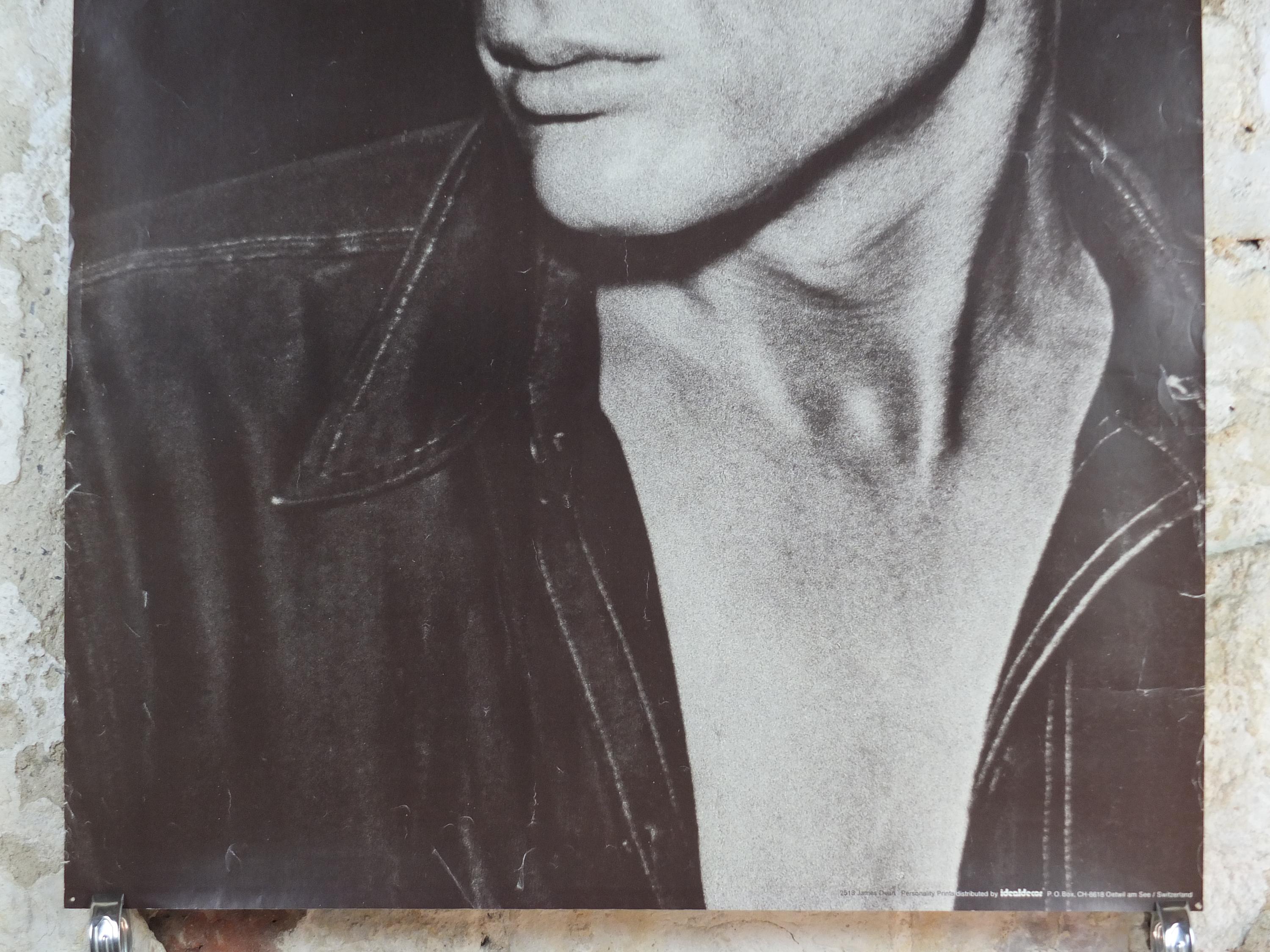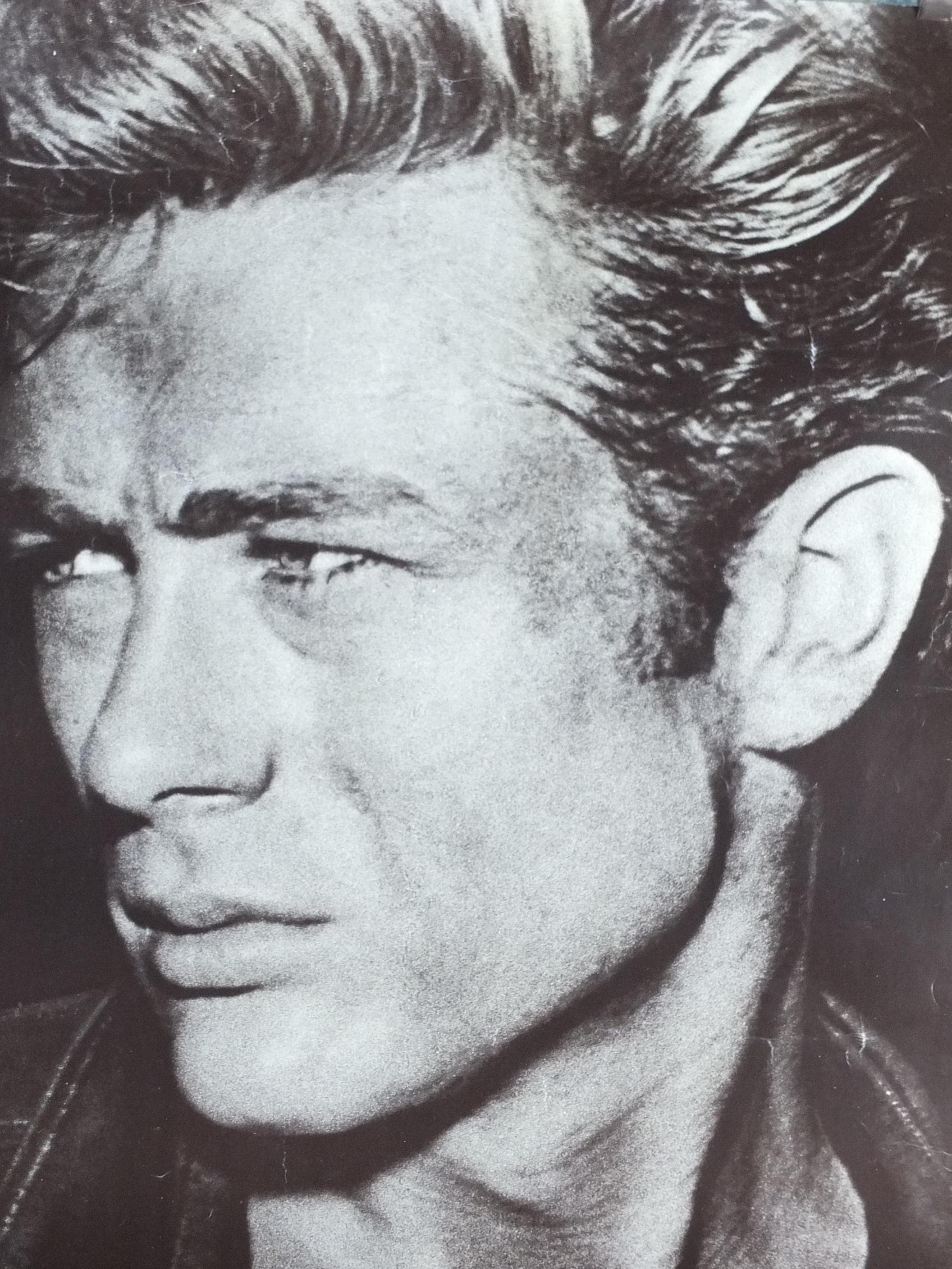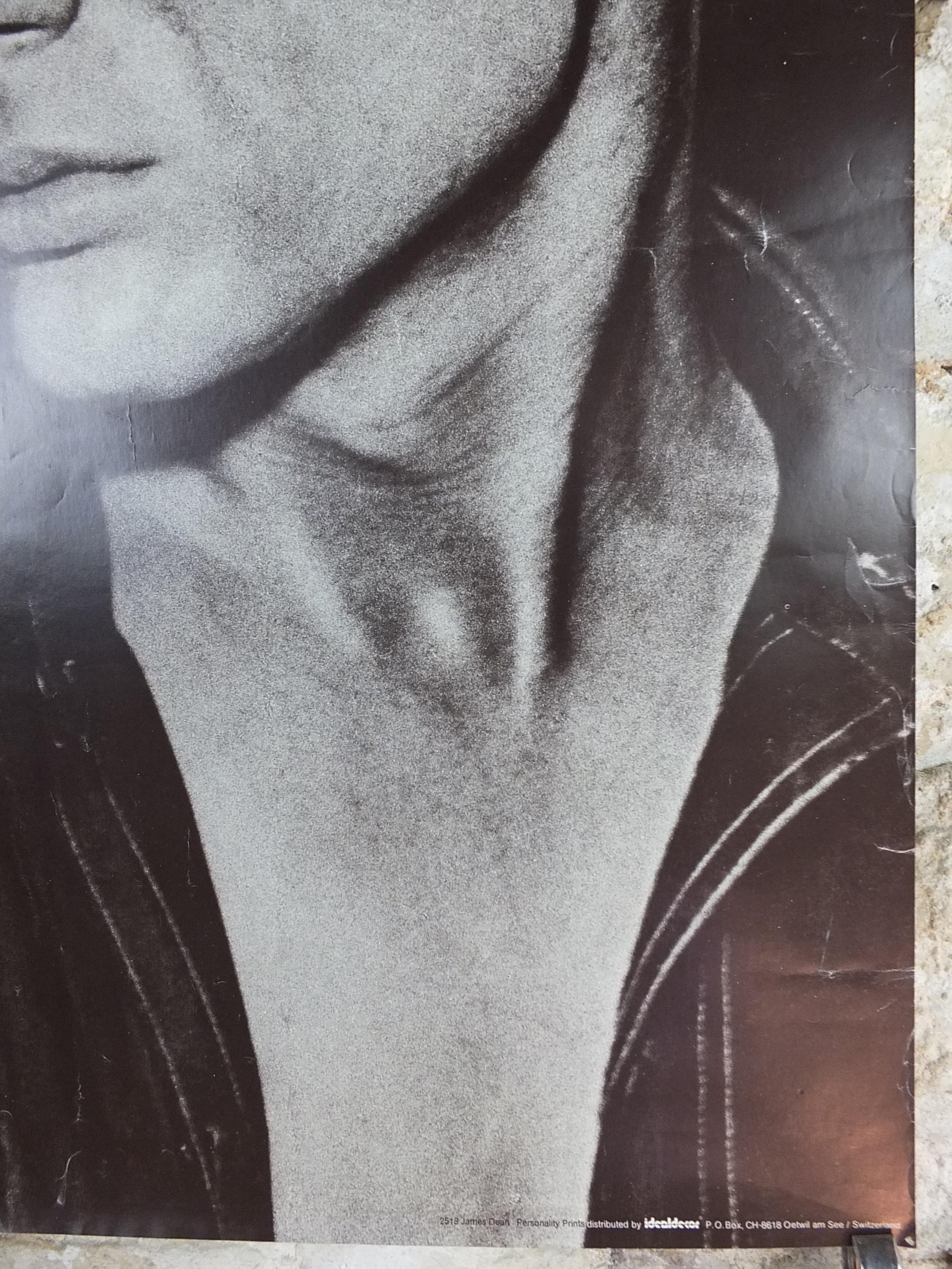 This is a vintage poster from the 1980s of James Dean from the movie "Rebel Without a Cause". Its a close-up with his hair styled in a distinctive pompadour and wearing a leather or dark denim jacket—this image is most commonly associated with his persona as the troubled youth Jim Stark from the classic film