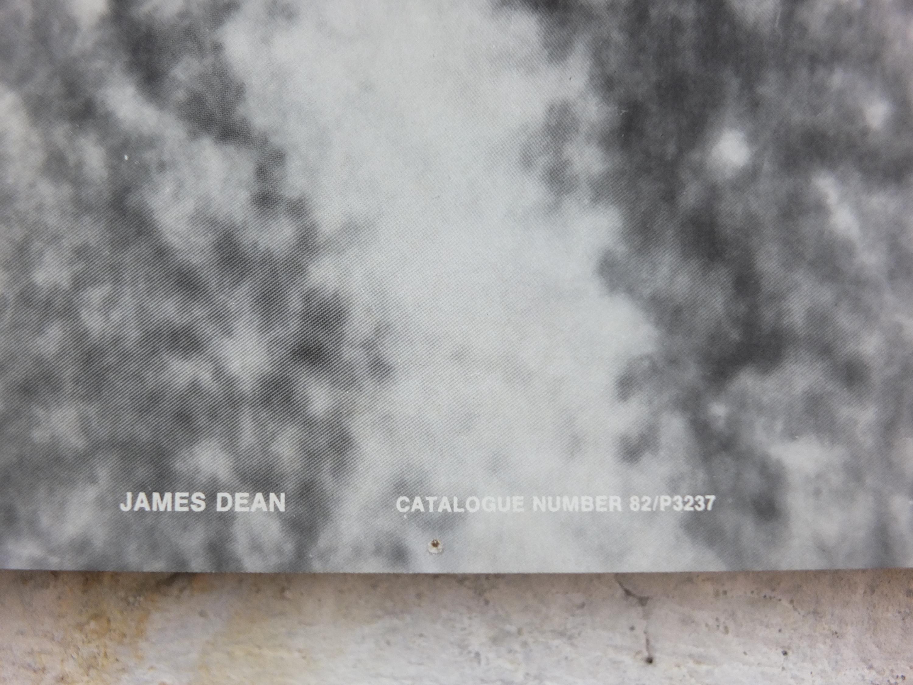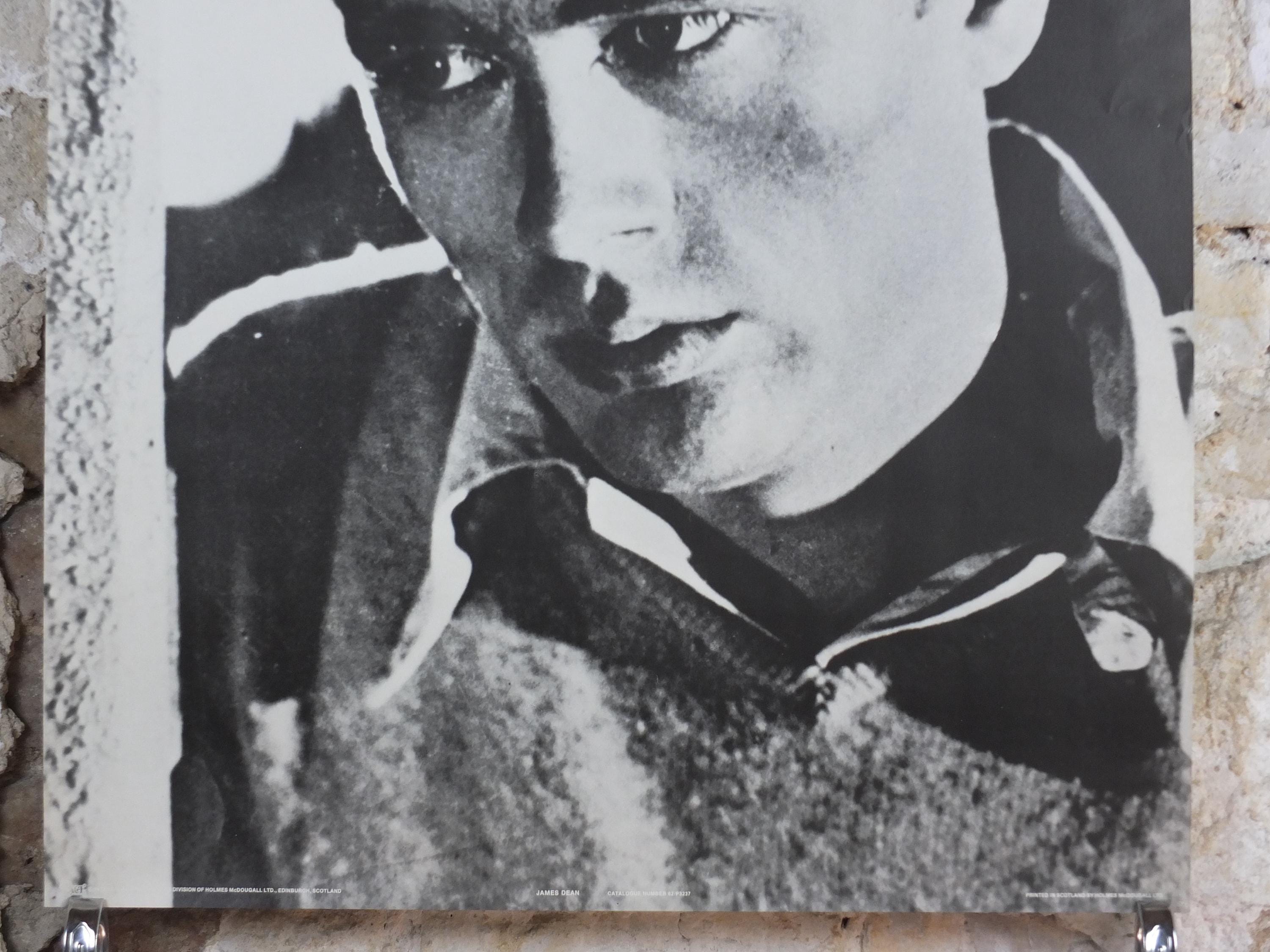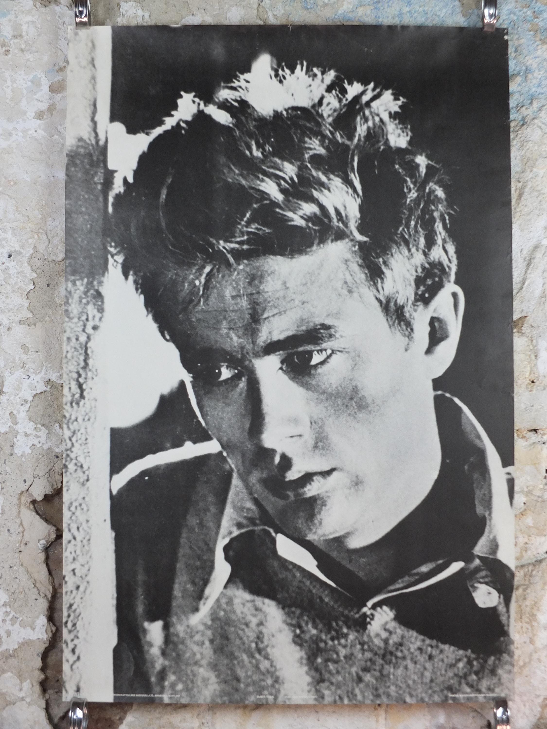 This is a vintage poster from the 1980 of James Dean from the movie "Rebel Without a Cause". Its a close-up image of his intense gaze, the poster is likely marketed to capture his overall "Rebel" persona associated primarily with Rebel Without a Cause.