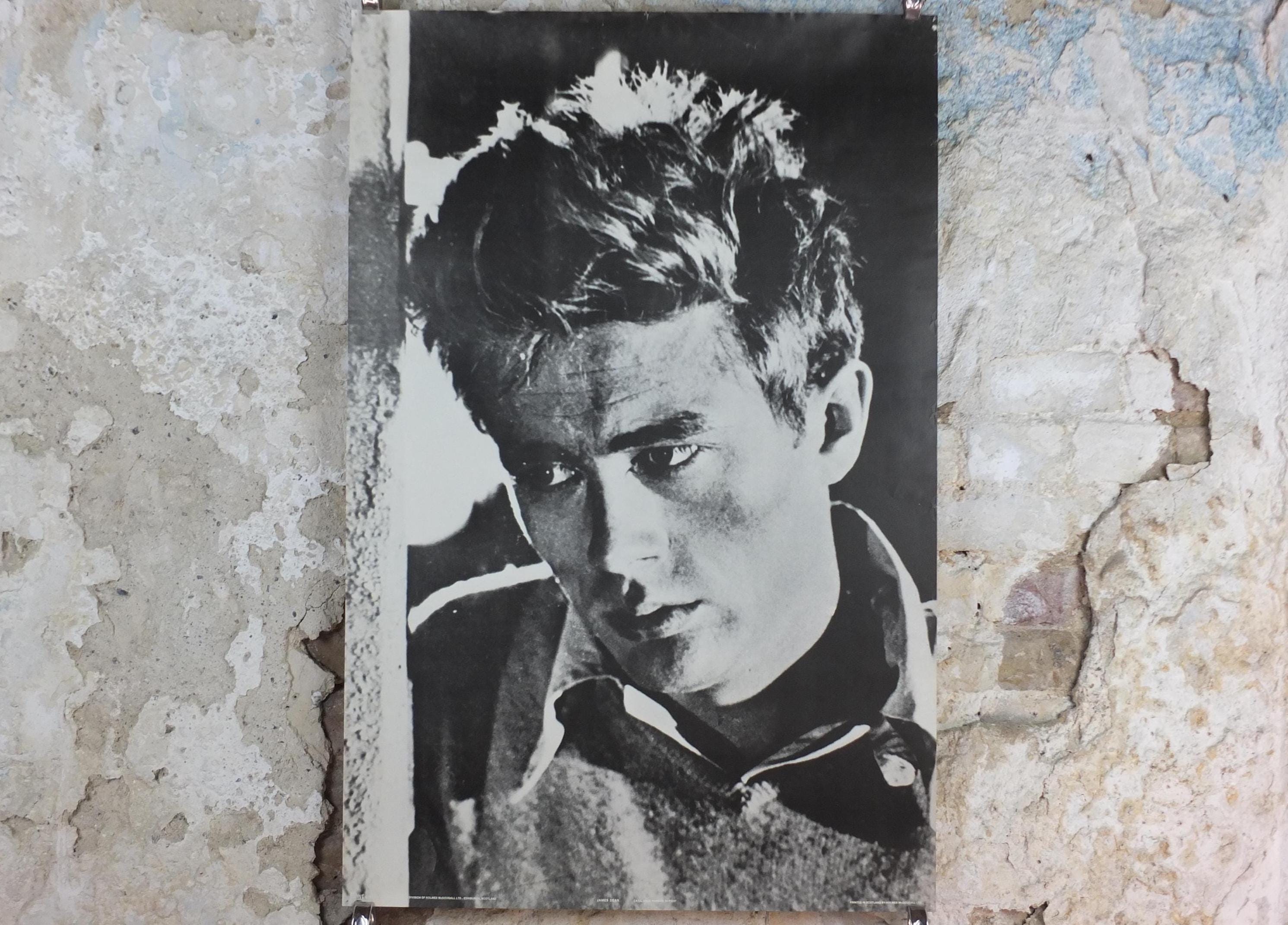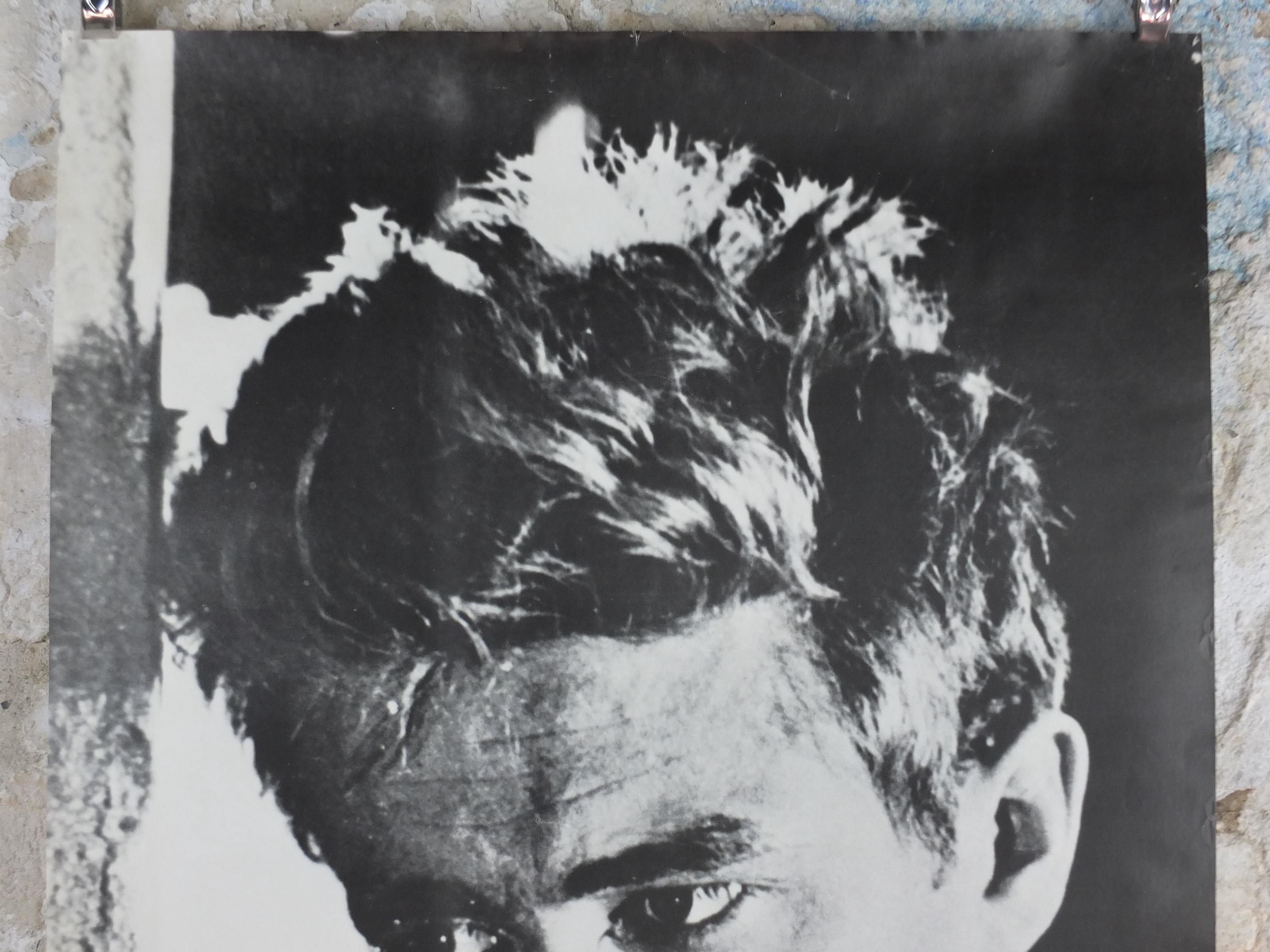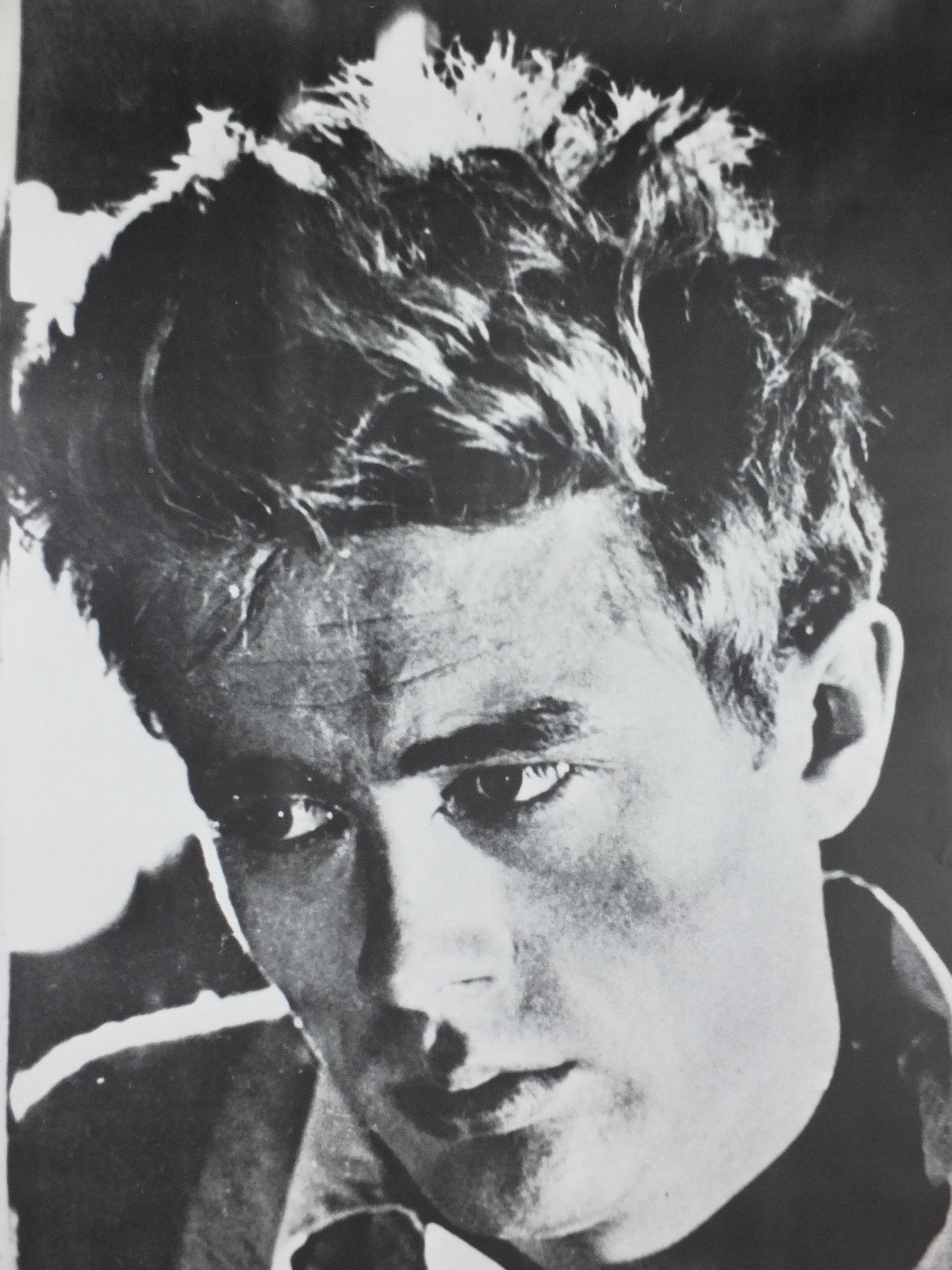 This is a vintage poster from the 1980 of James Dean from the movie "Rebel Without a Cause". Its a close-up image of his intense gaze, the poster is likely marketed to capture his overall "Rebel" persona associated primarily with Rebel Without a Cause.