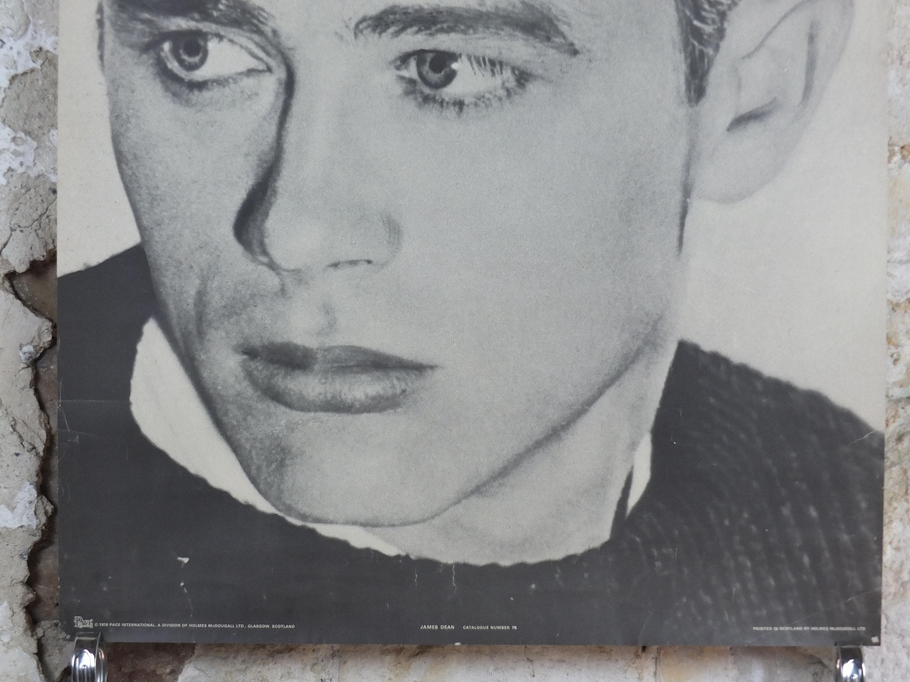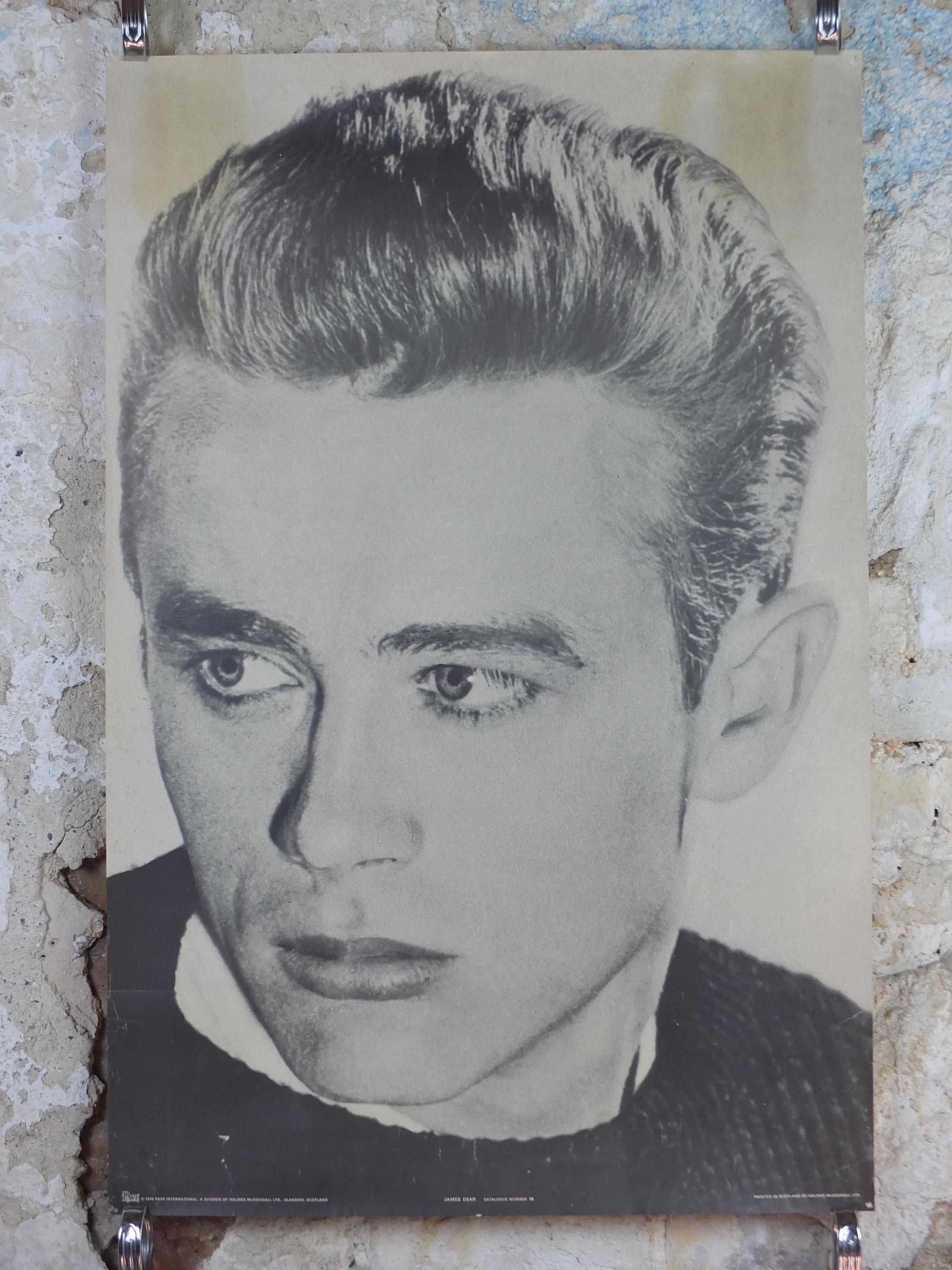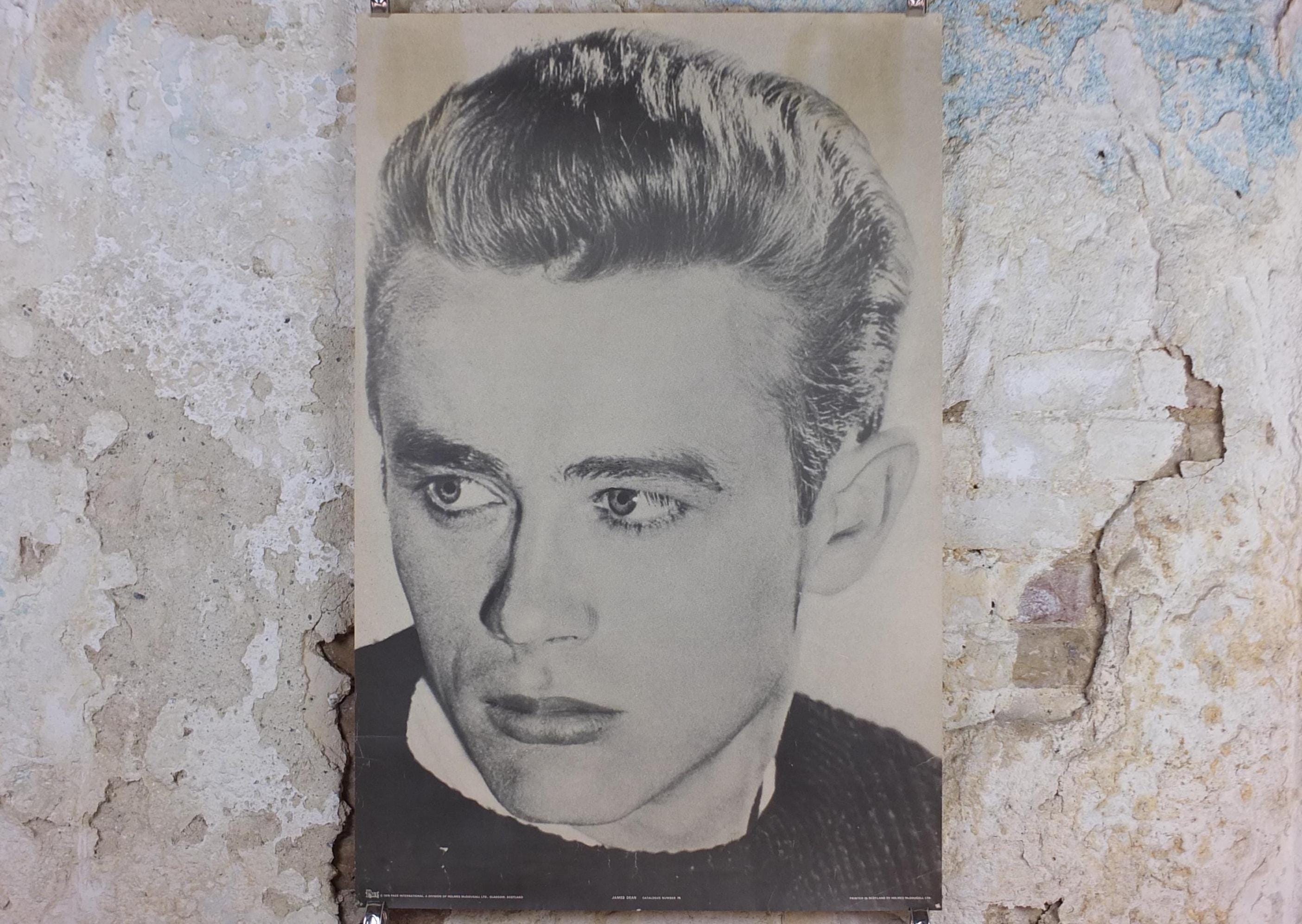 This is a vintage poster from the 1980 of James Dean from the movie "Rebel Without a Cause". Its a close-up image of his intense yet vulnerable gaze, the poster is likely marketed to capture his overall "Rebel" persona associated primarily with Rebel Without a Cause.