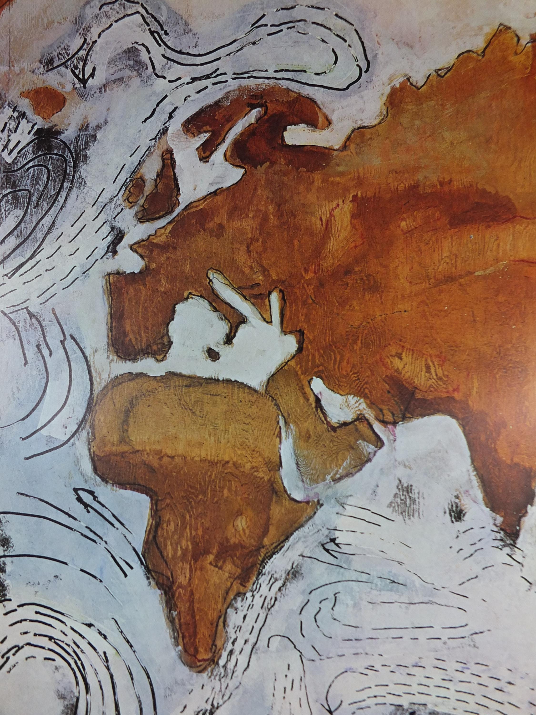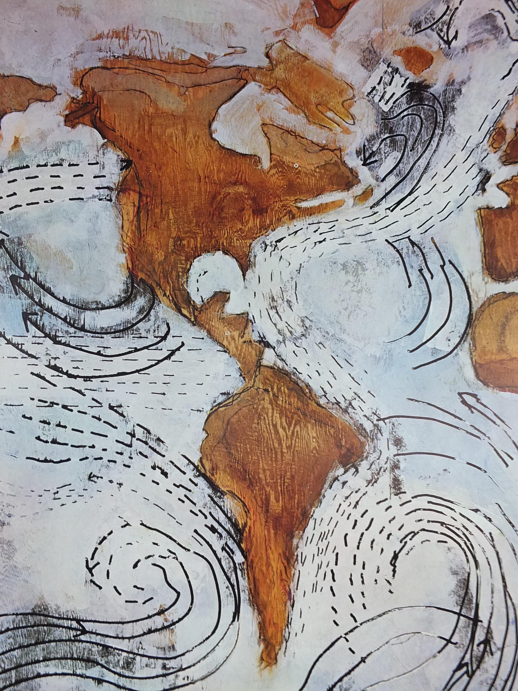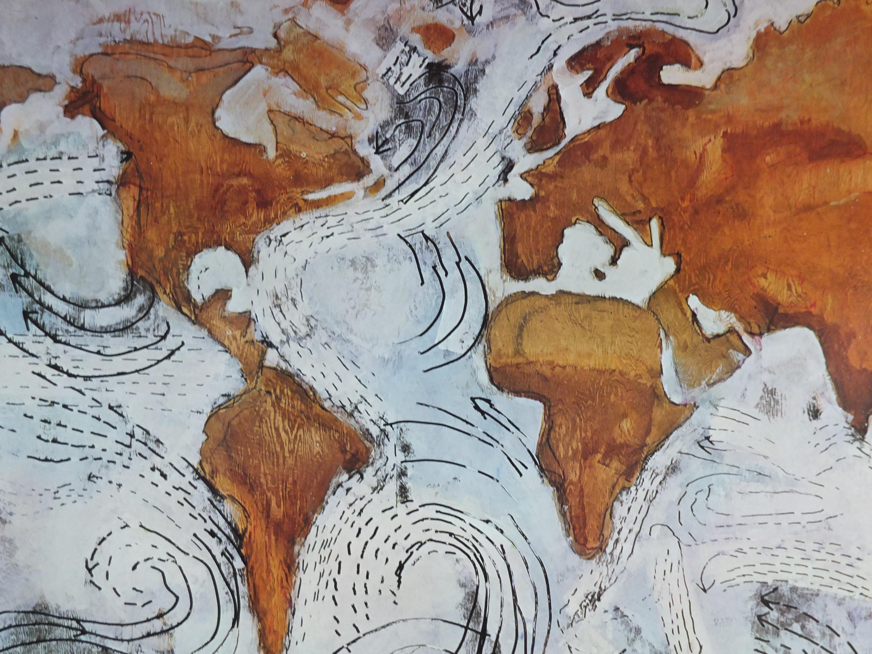 The poster shows an expressive rendition of a world map, with swirling lines suggestive of atmospheric or oceanic currents. Paterson Ewen's name is on the list, and his work often featured weather and cosmic phenomena.