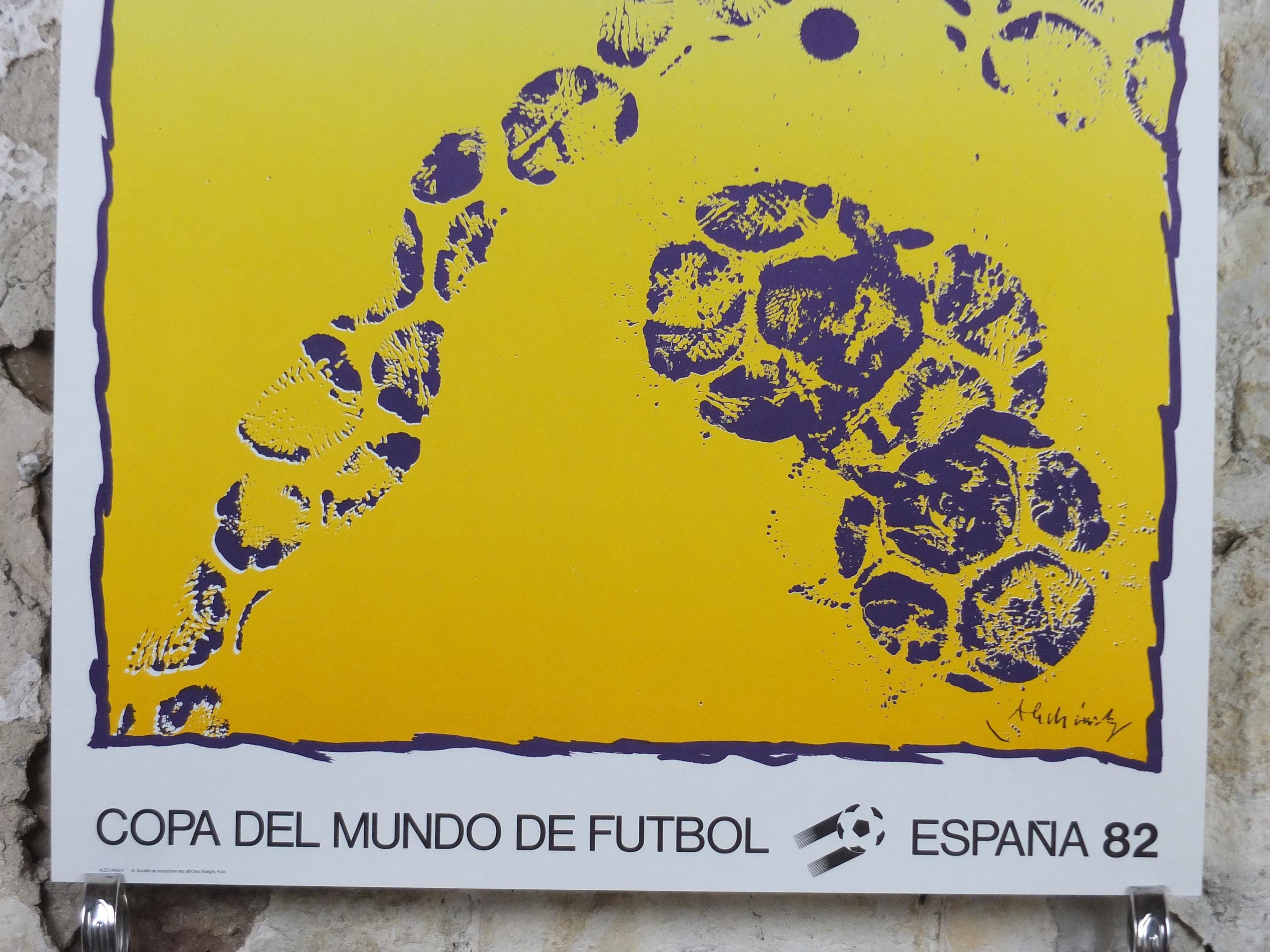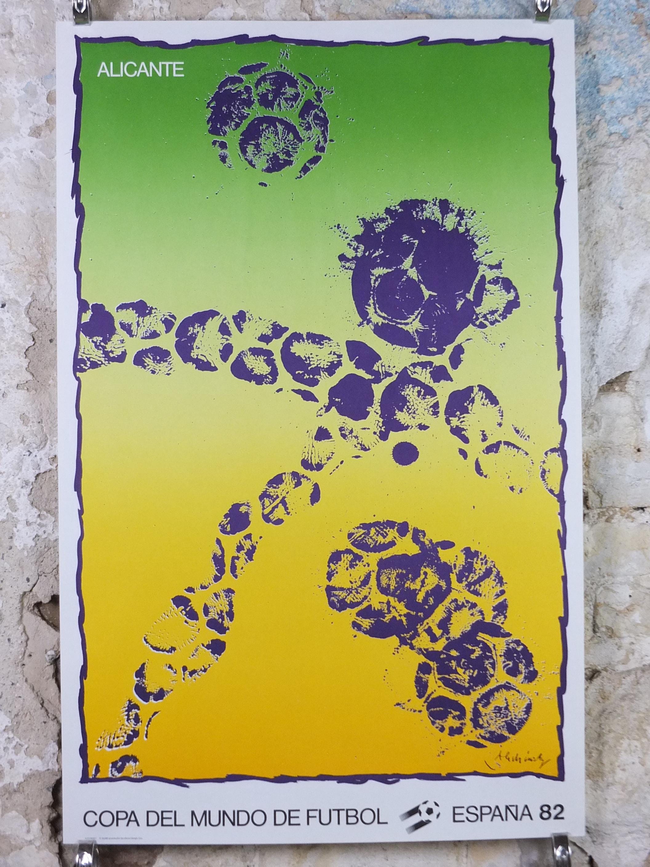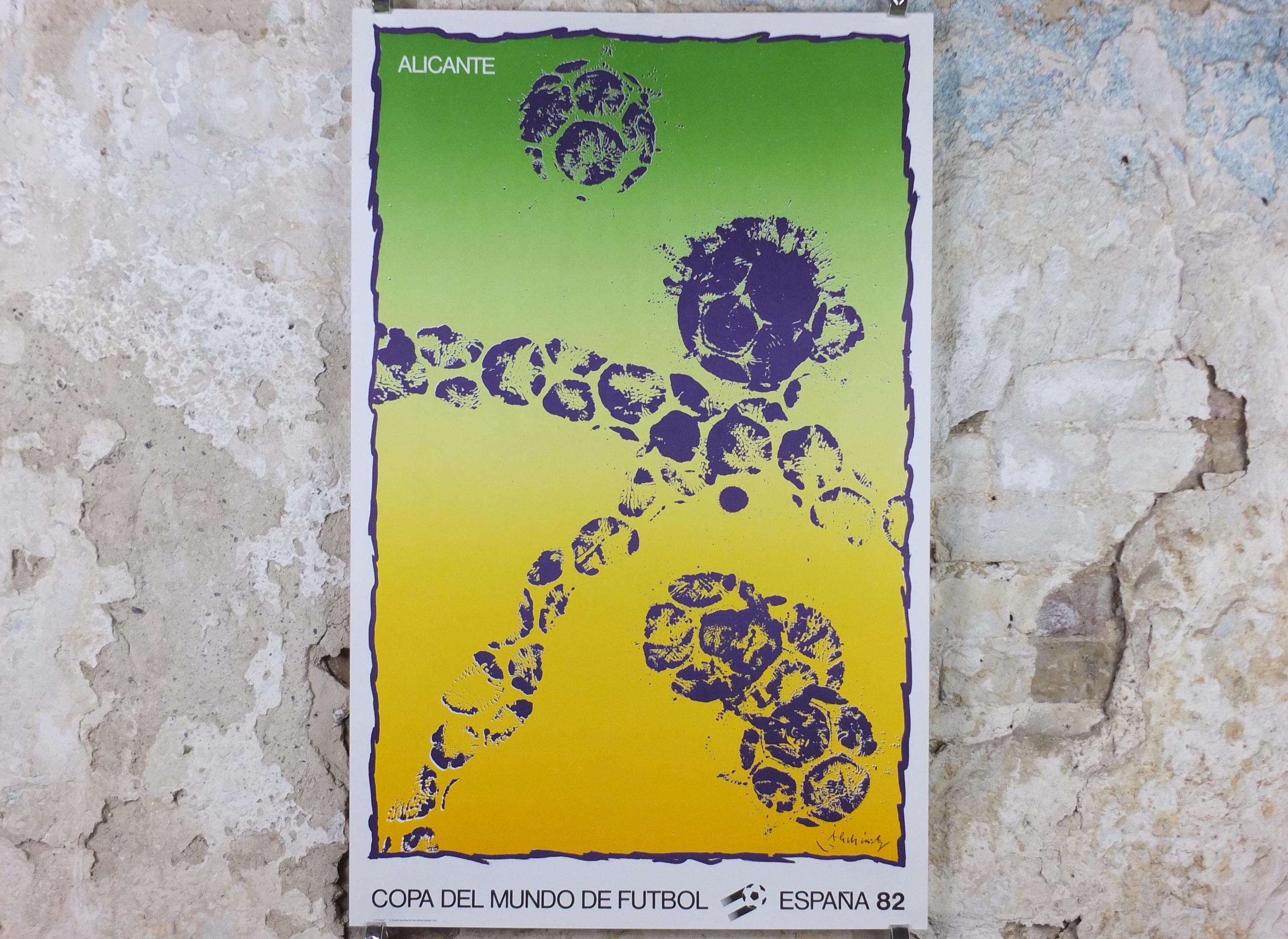 This an original World Cup poster of the Vigo stadium from Spain's 1982 World Cup Football showing the Alicante location with an imprint tracking of a football.