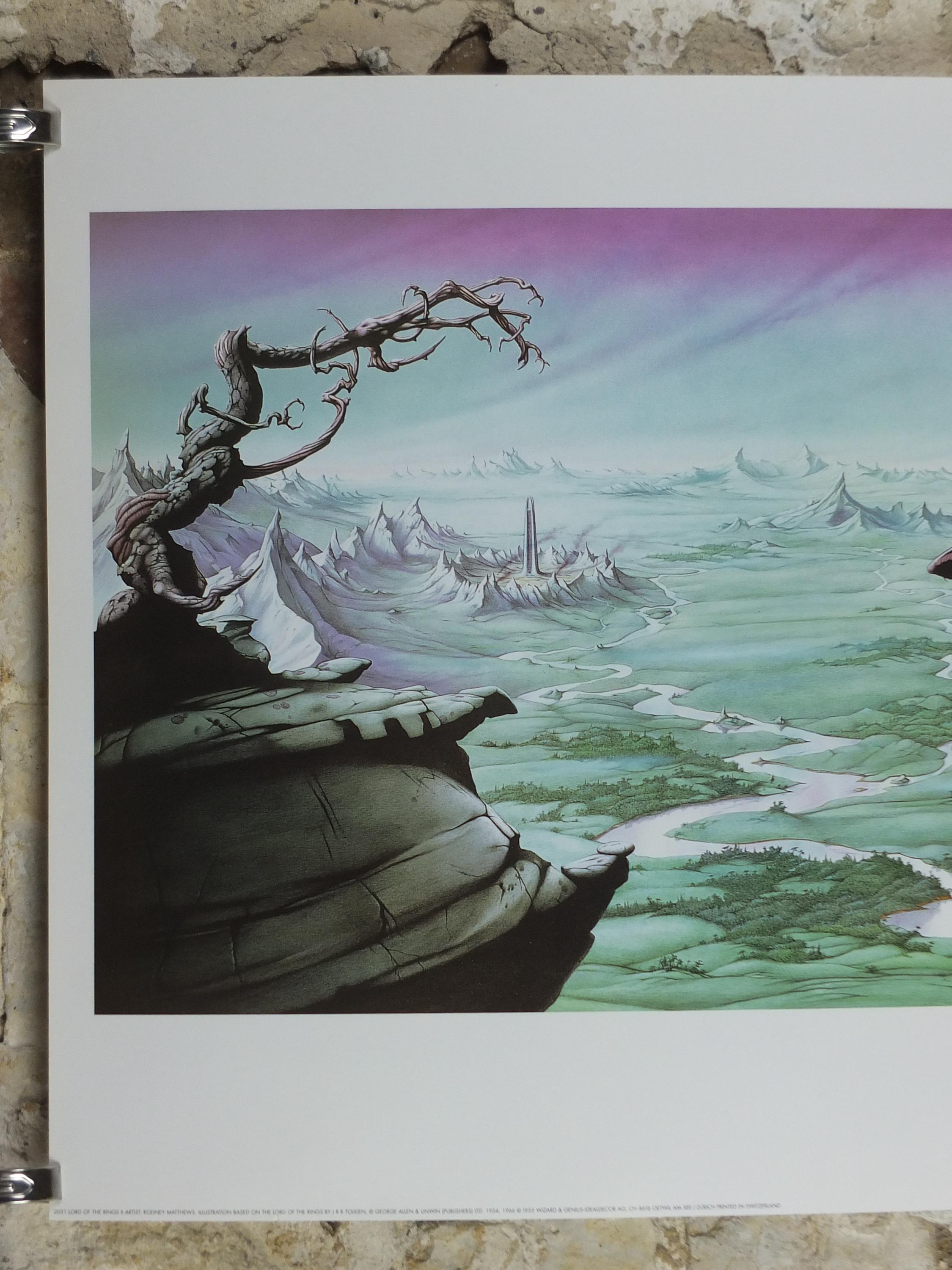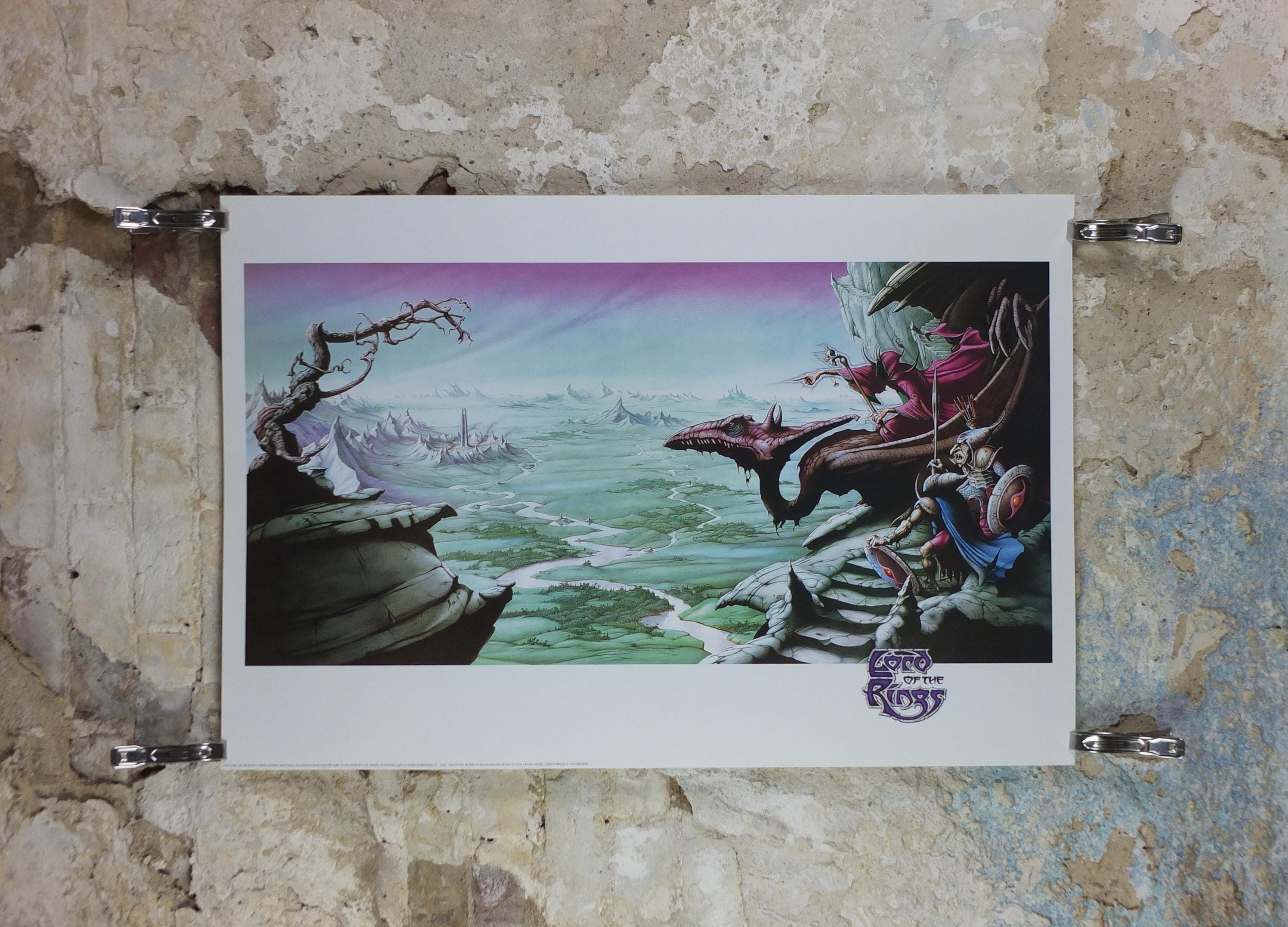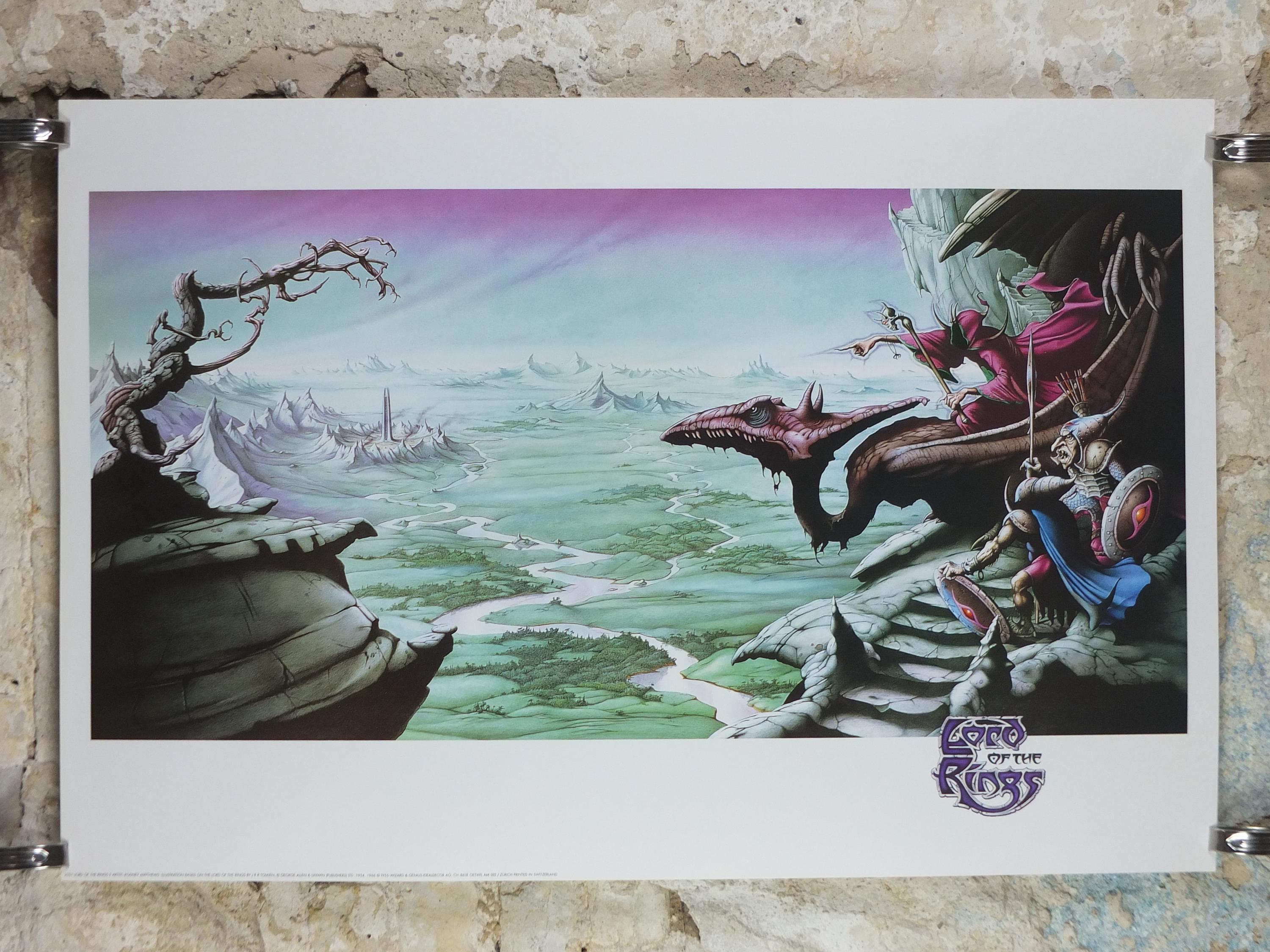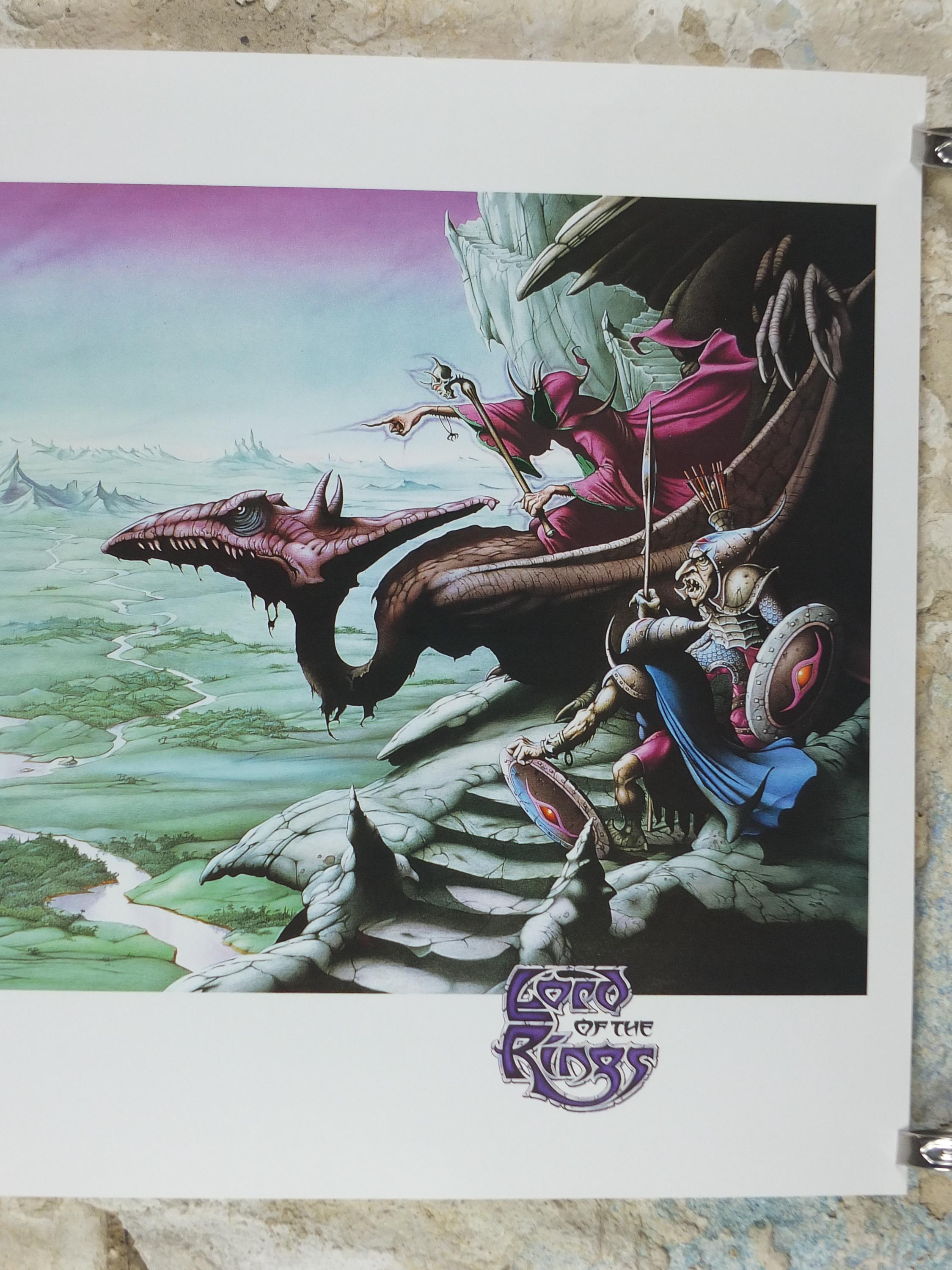 This is a poster from 1995 by Rodney Matthews, showing the view of a Nazgul or a Black Rider on a Fell Beast or Dragon with a couple of goblins on side. You can see the tower of Orthanc in the background - "A View over Isengard".