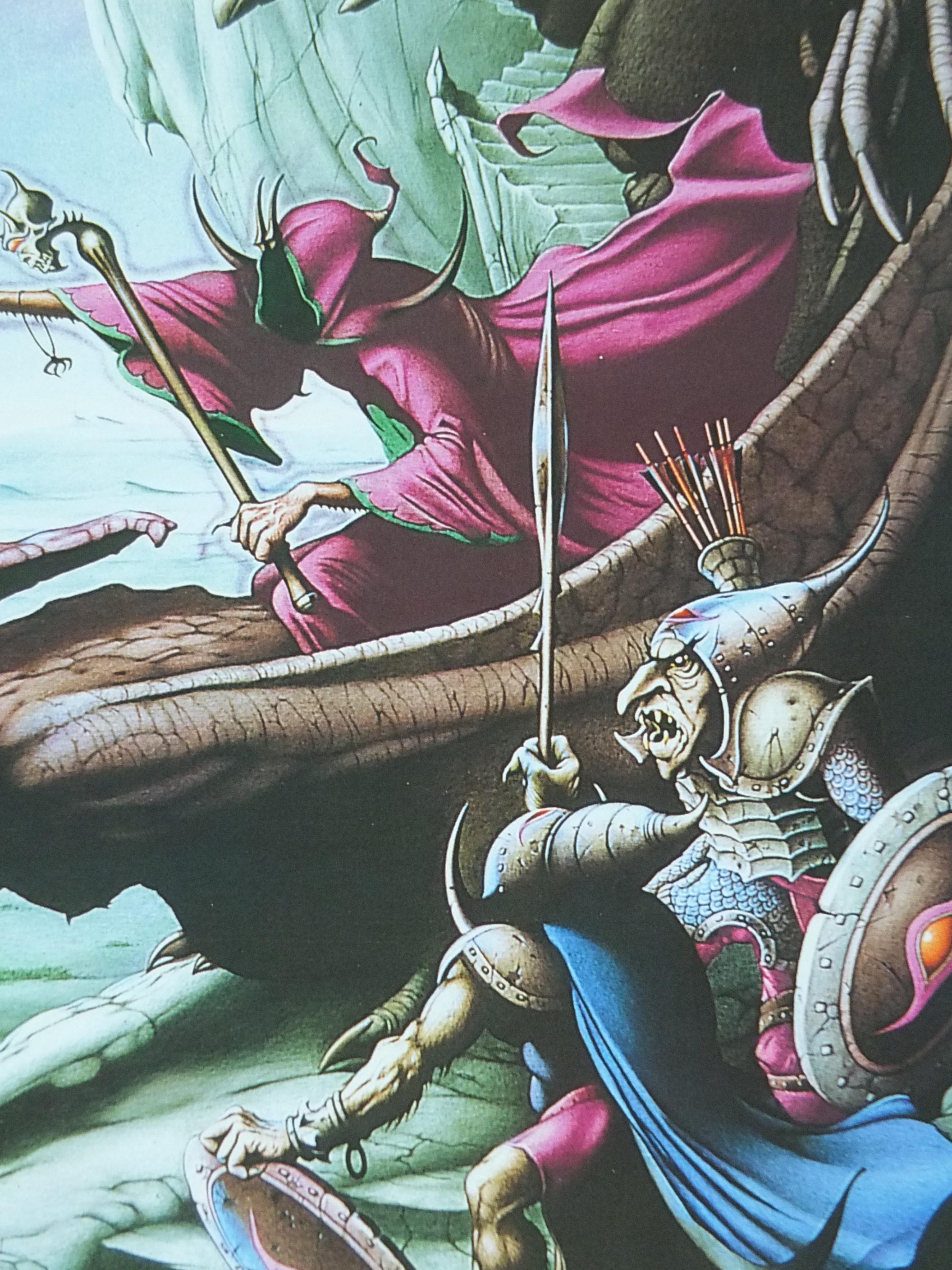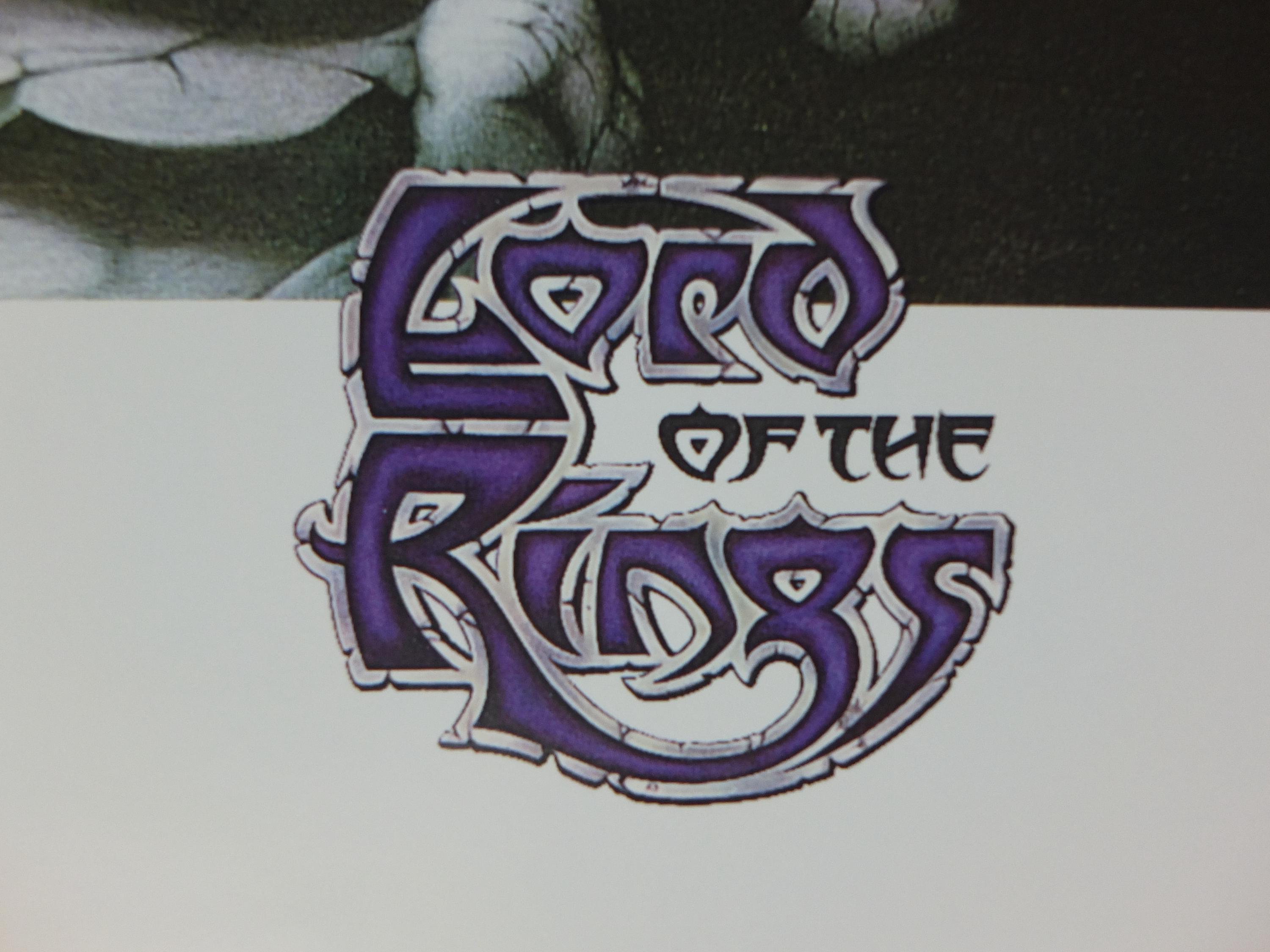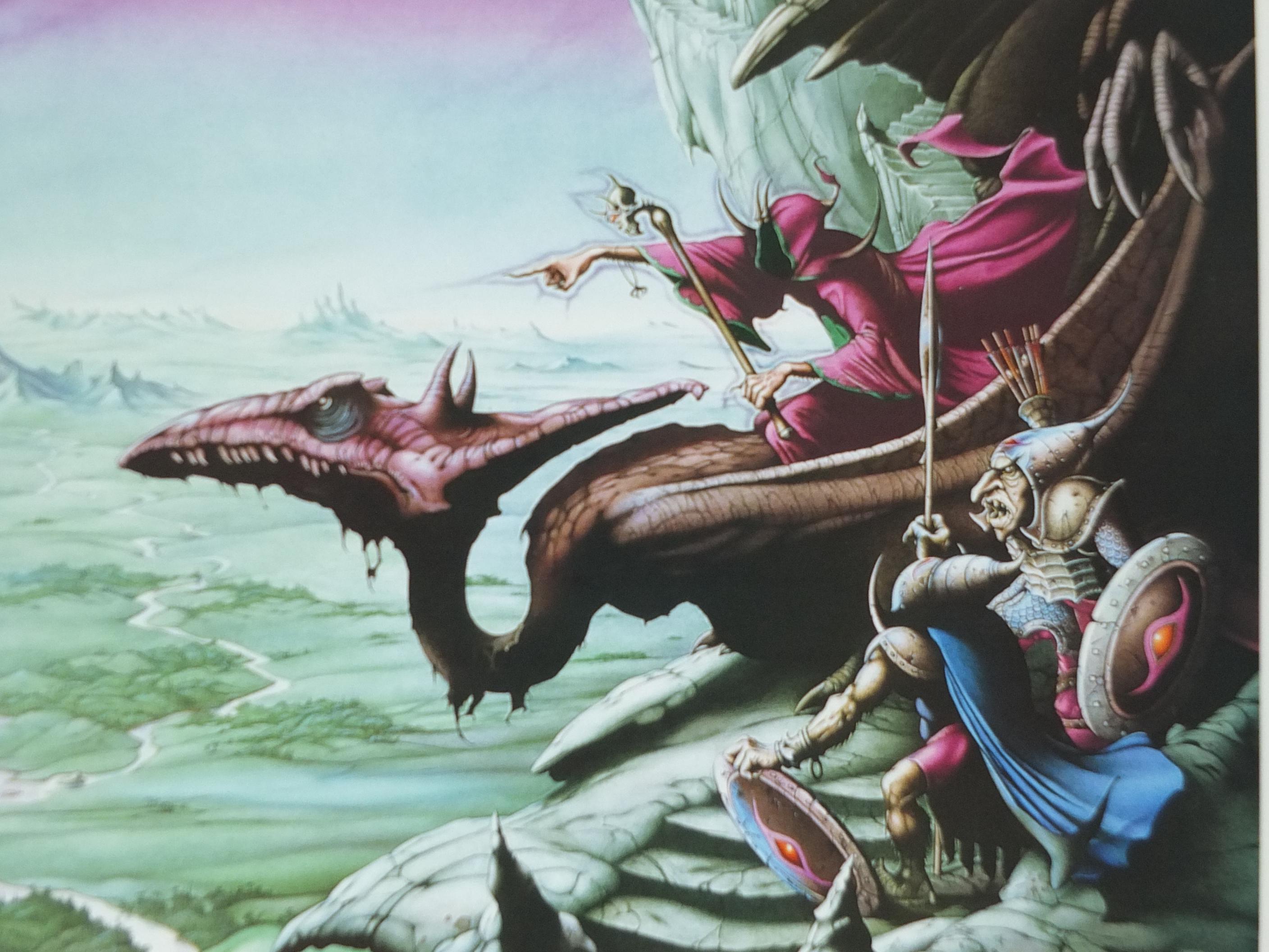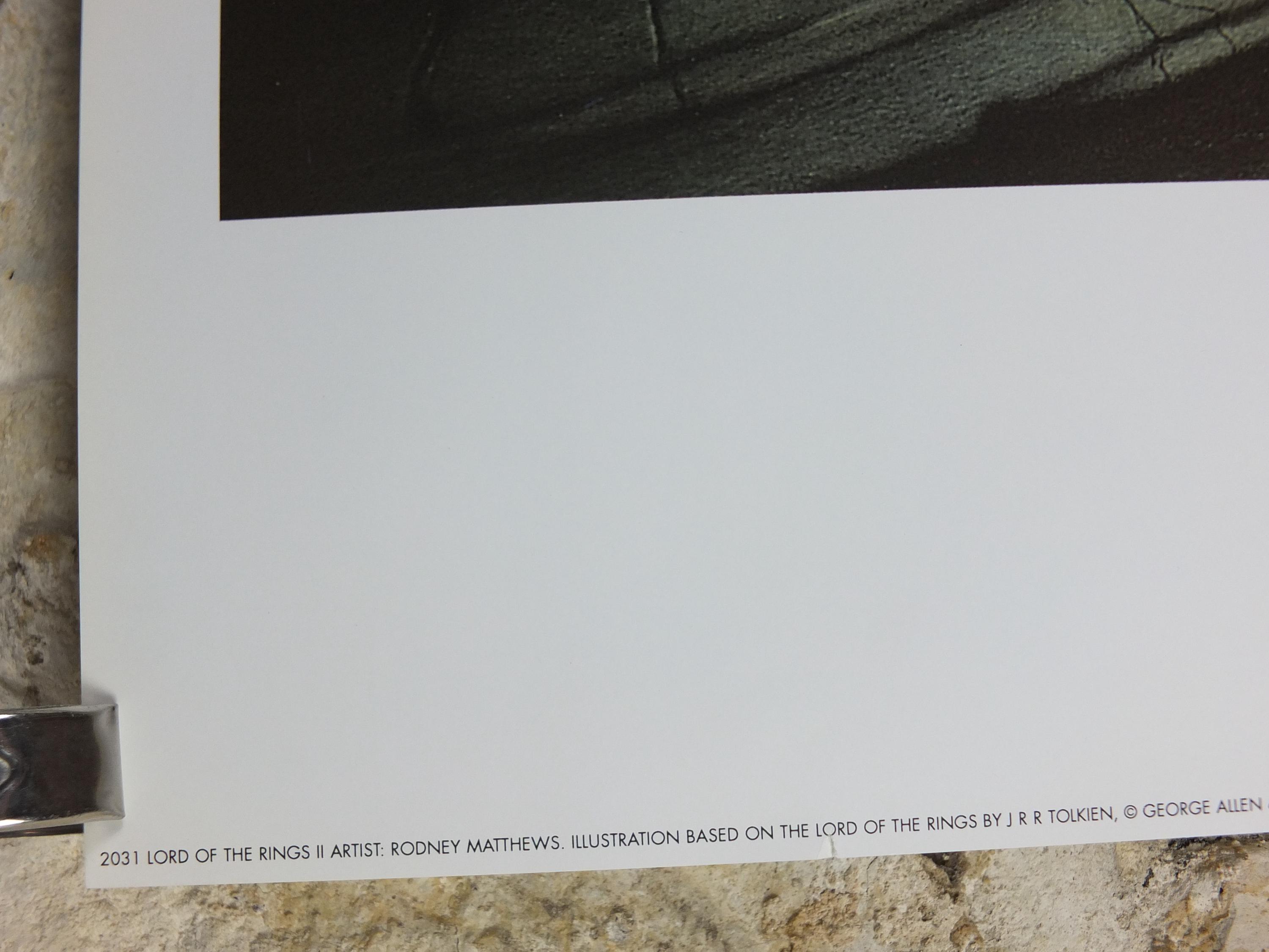 This is a poster from 1995 by Rodney Matthews, showing the view of a Nazgul or a Black Rider on a Fell Beast or Dragon with a couple of goblins on side. You can see the tower of Orthanc in the background - "A View over Isengard".