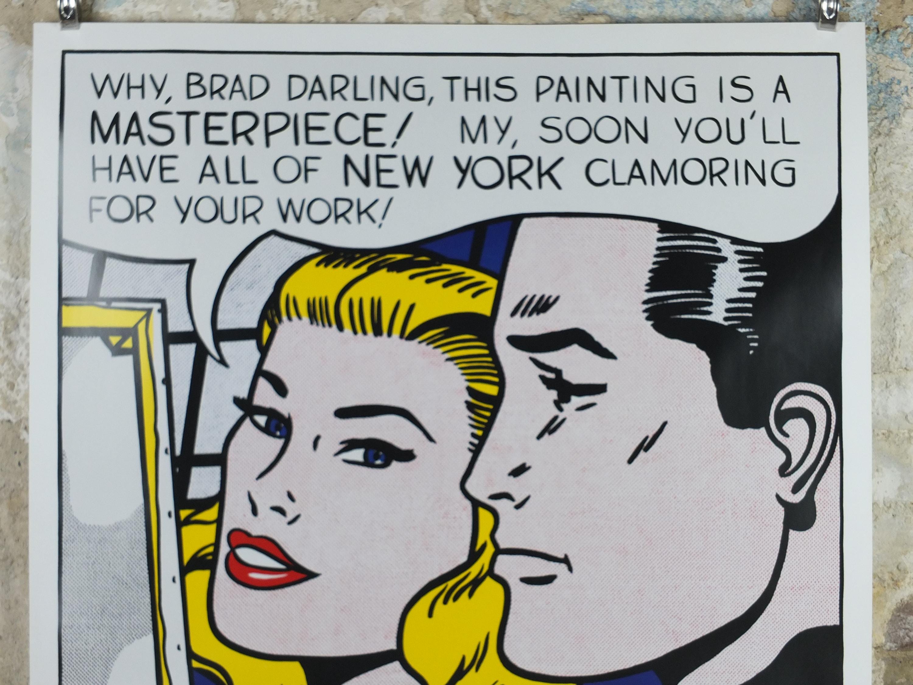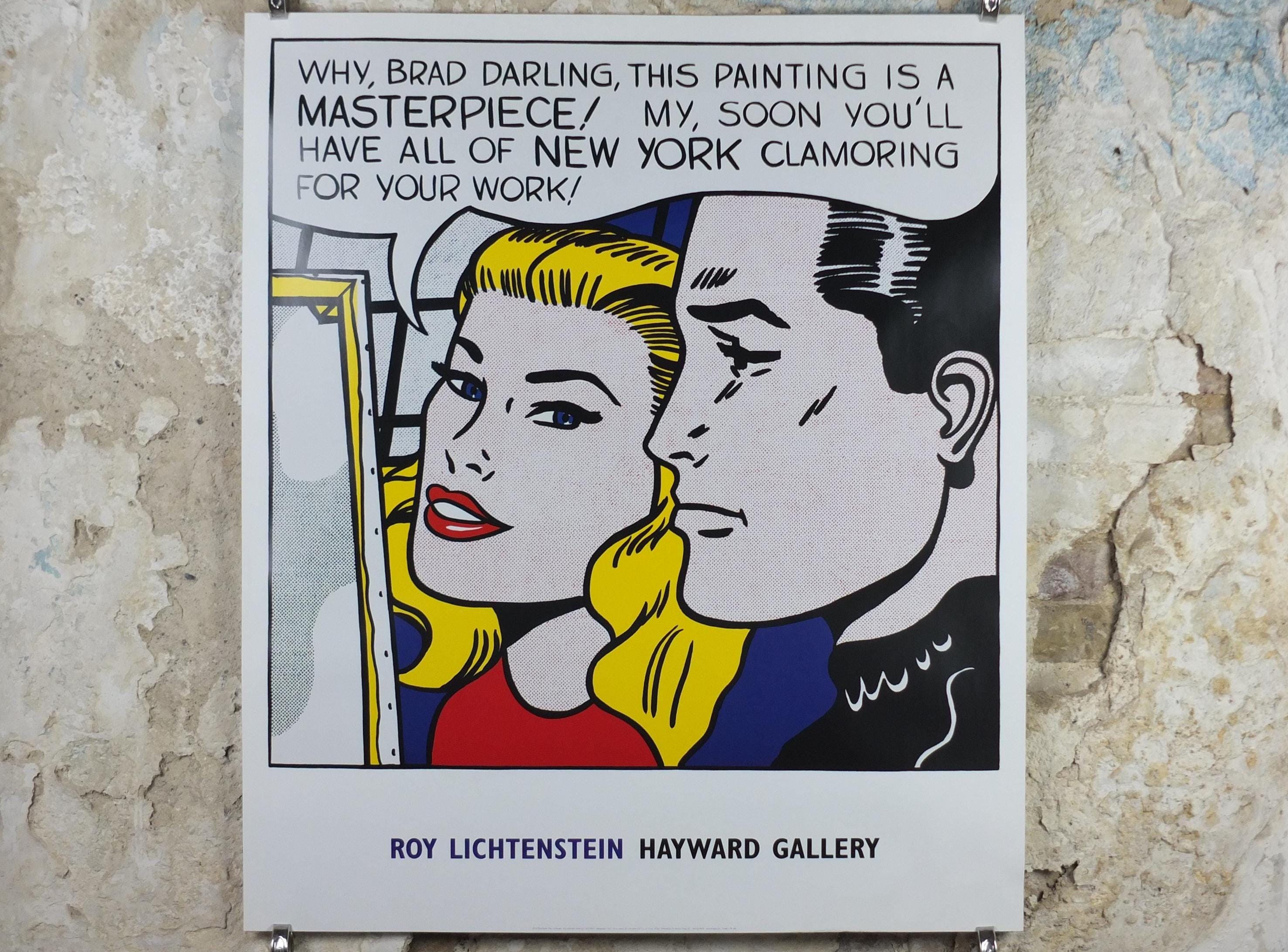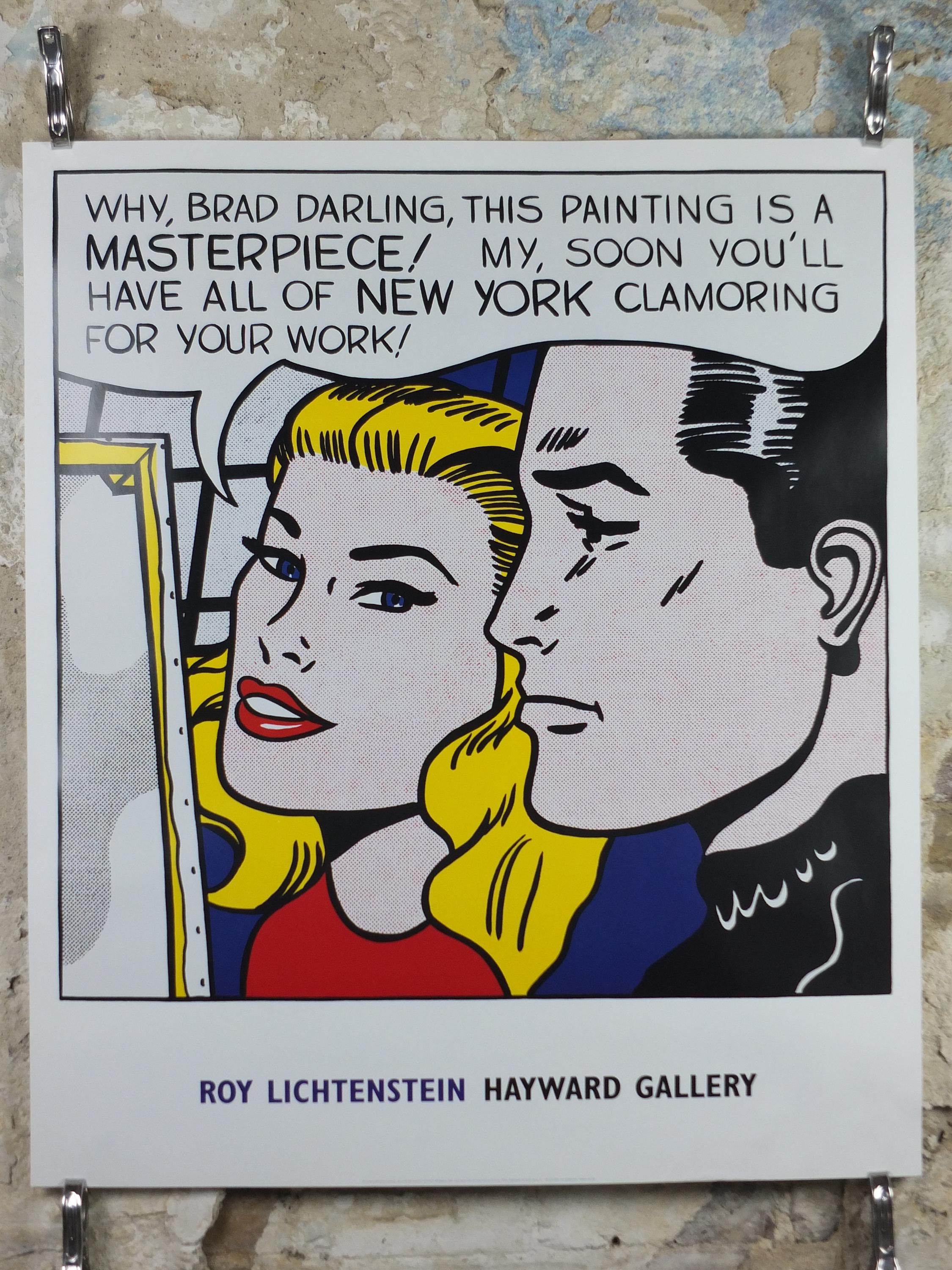 This is a poster from the Roy Lichtenstein 2004 exhibition at the Haywood Gallery in London showcasing the famous pop art example "Masterpiece" from 1962. A blonde woman stands with the artist Brad, praising his latest artwork to the New York audience.