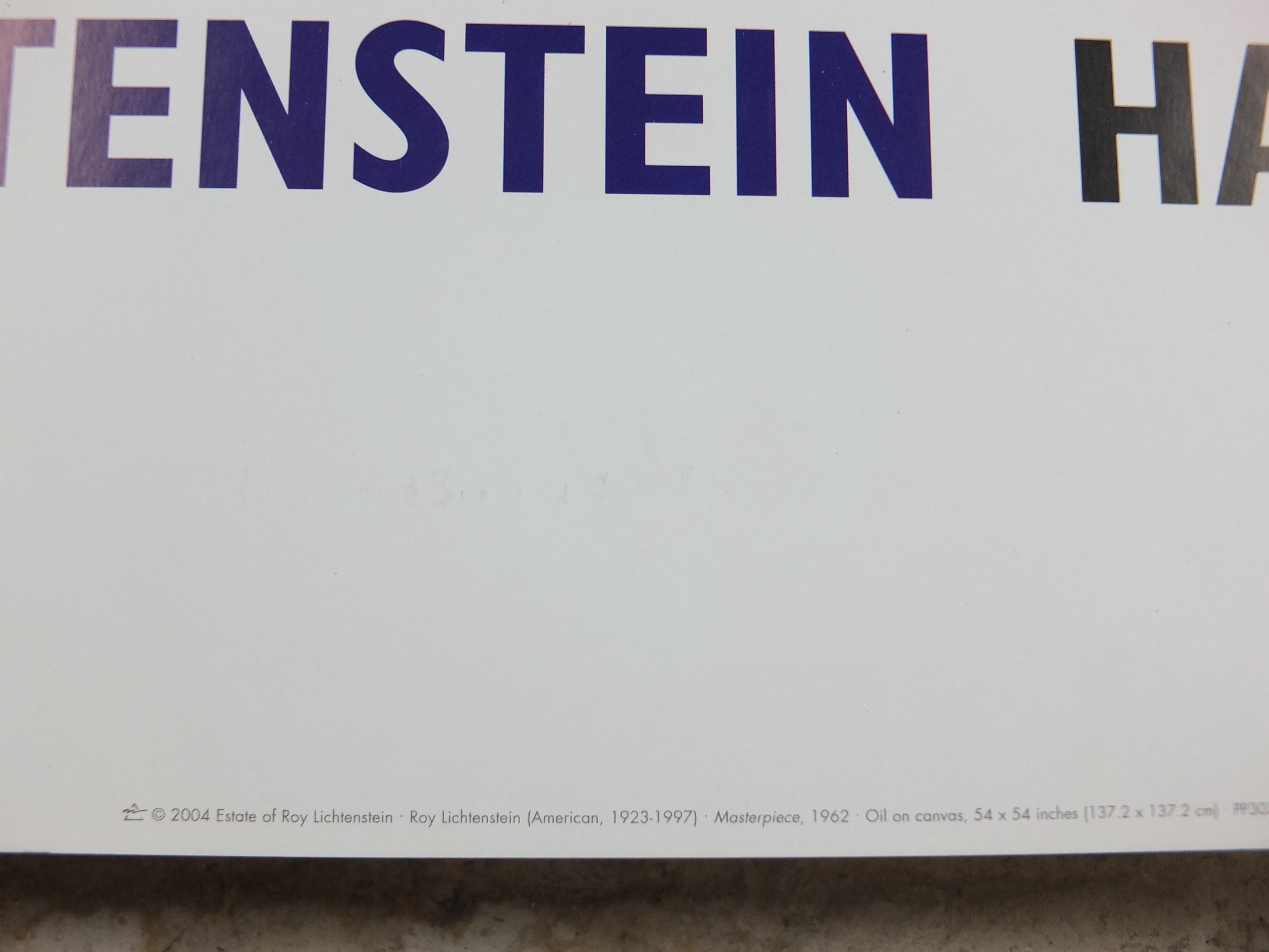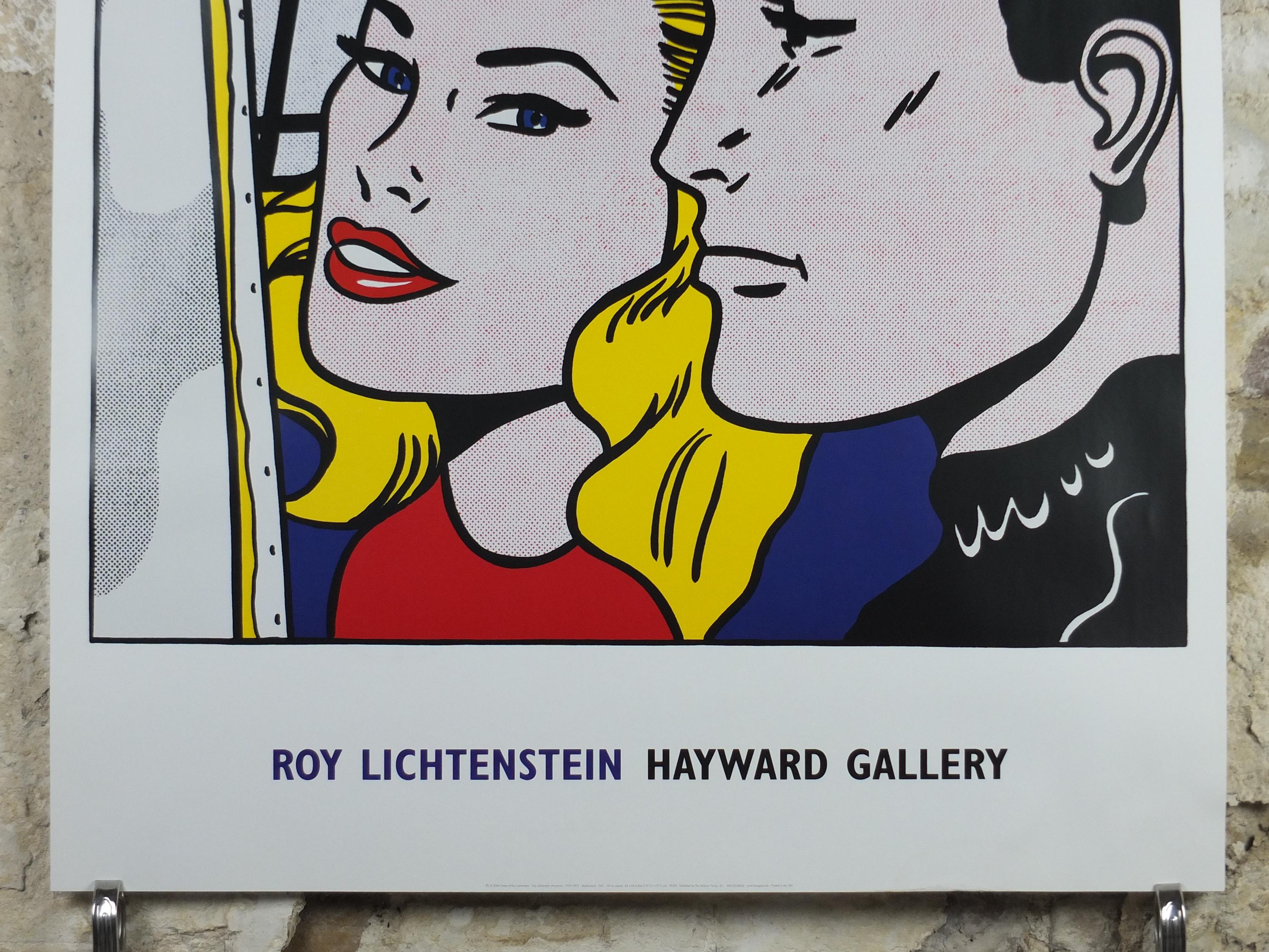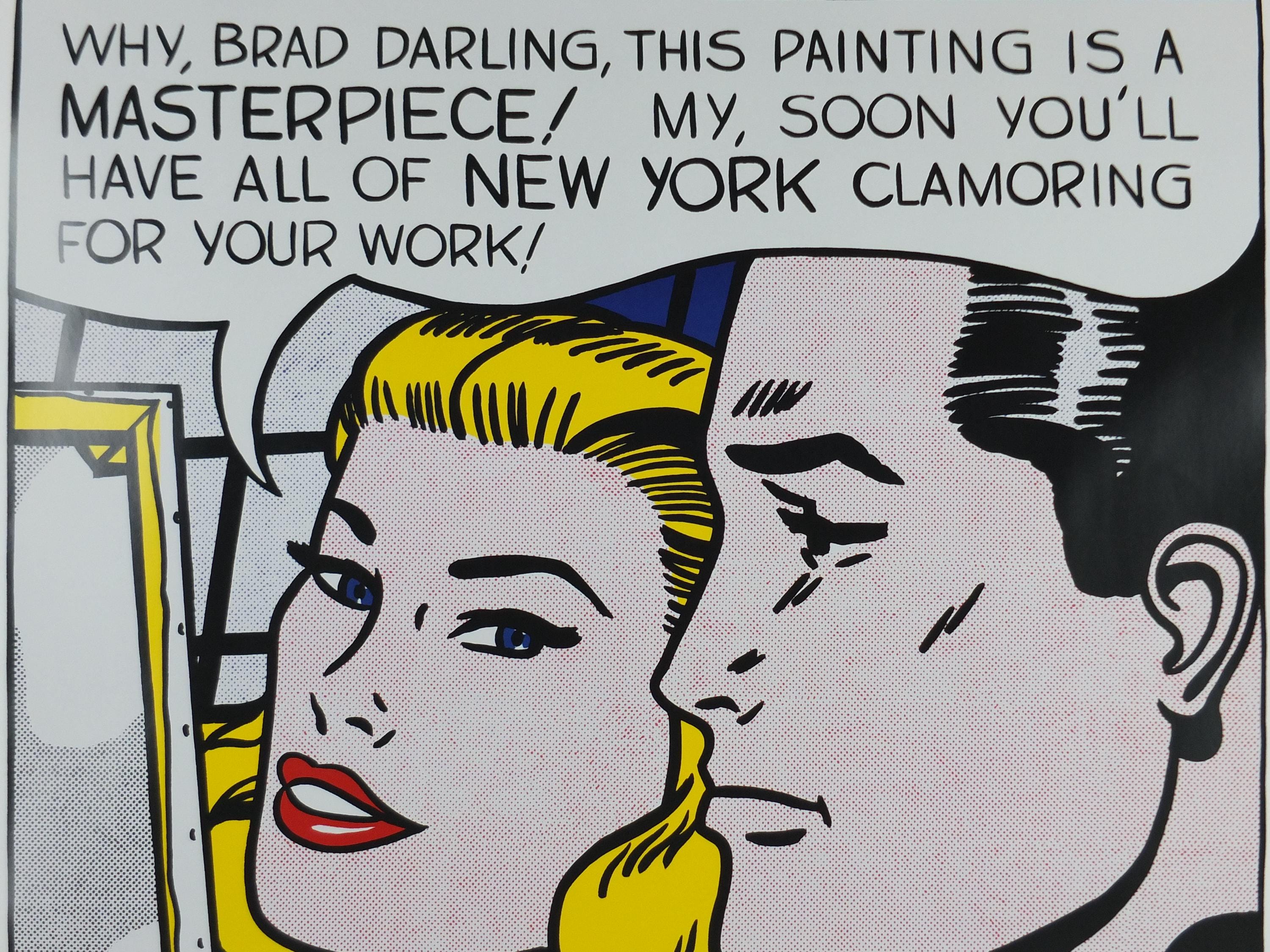 This is a poster from the Roy Lichtenstein 2004 exhibition at the Haywood Gallery in London showcasing the famous pop art example "Masterpiece" from 1962. A blonde woman stands with the artist Brad, praising his latest artwork to the New York audience.