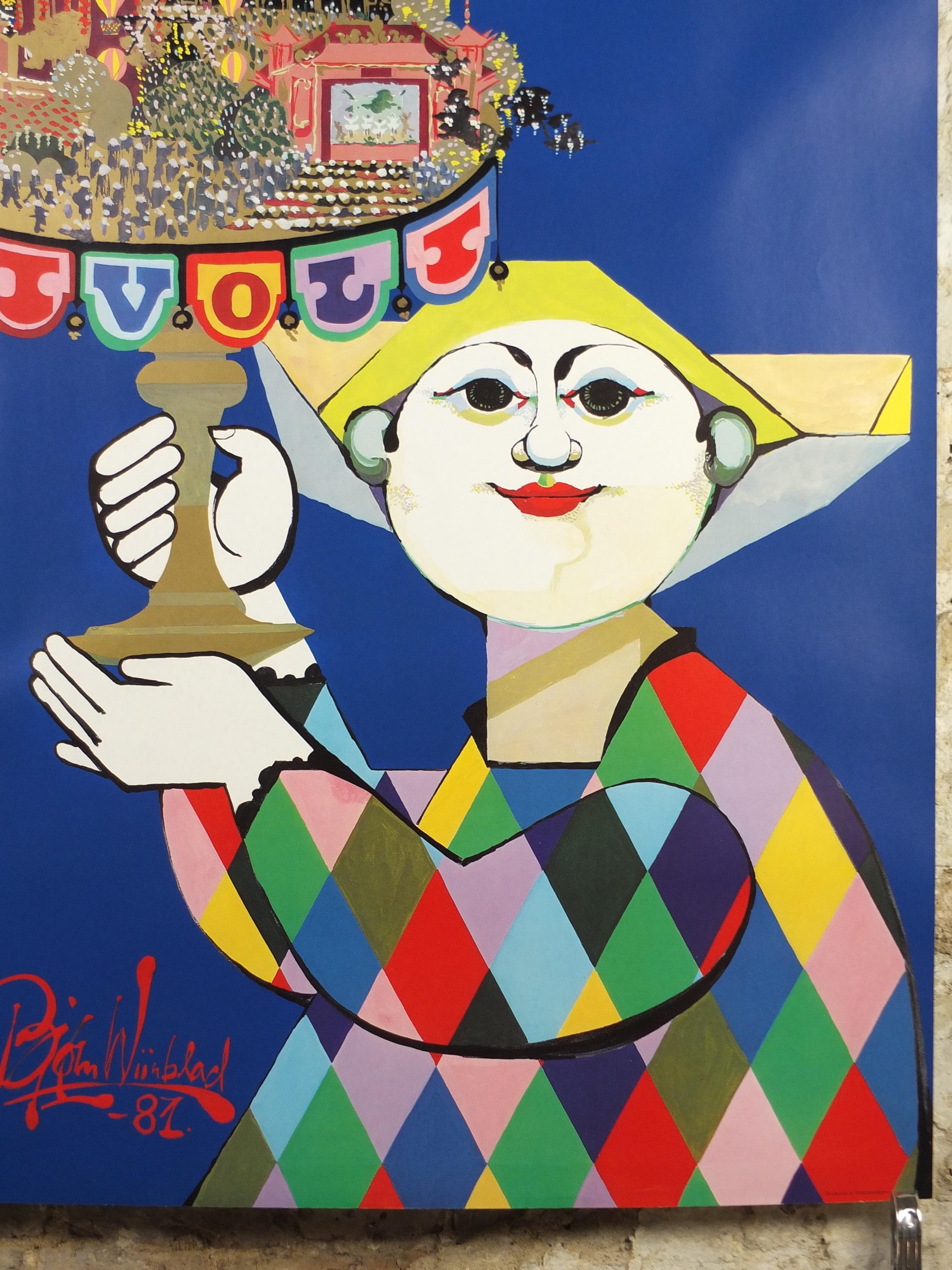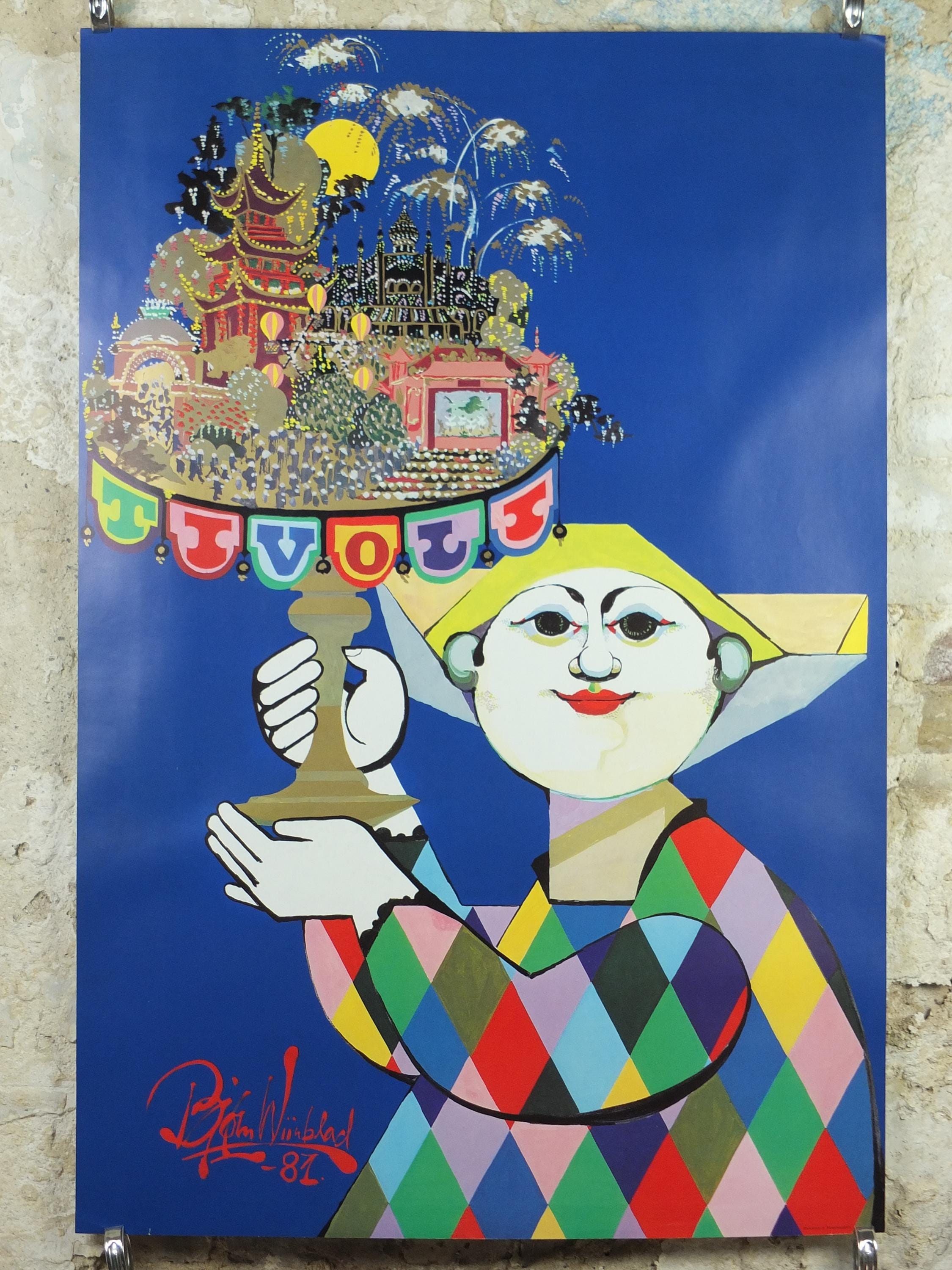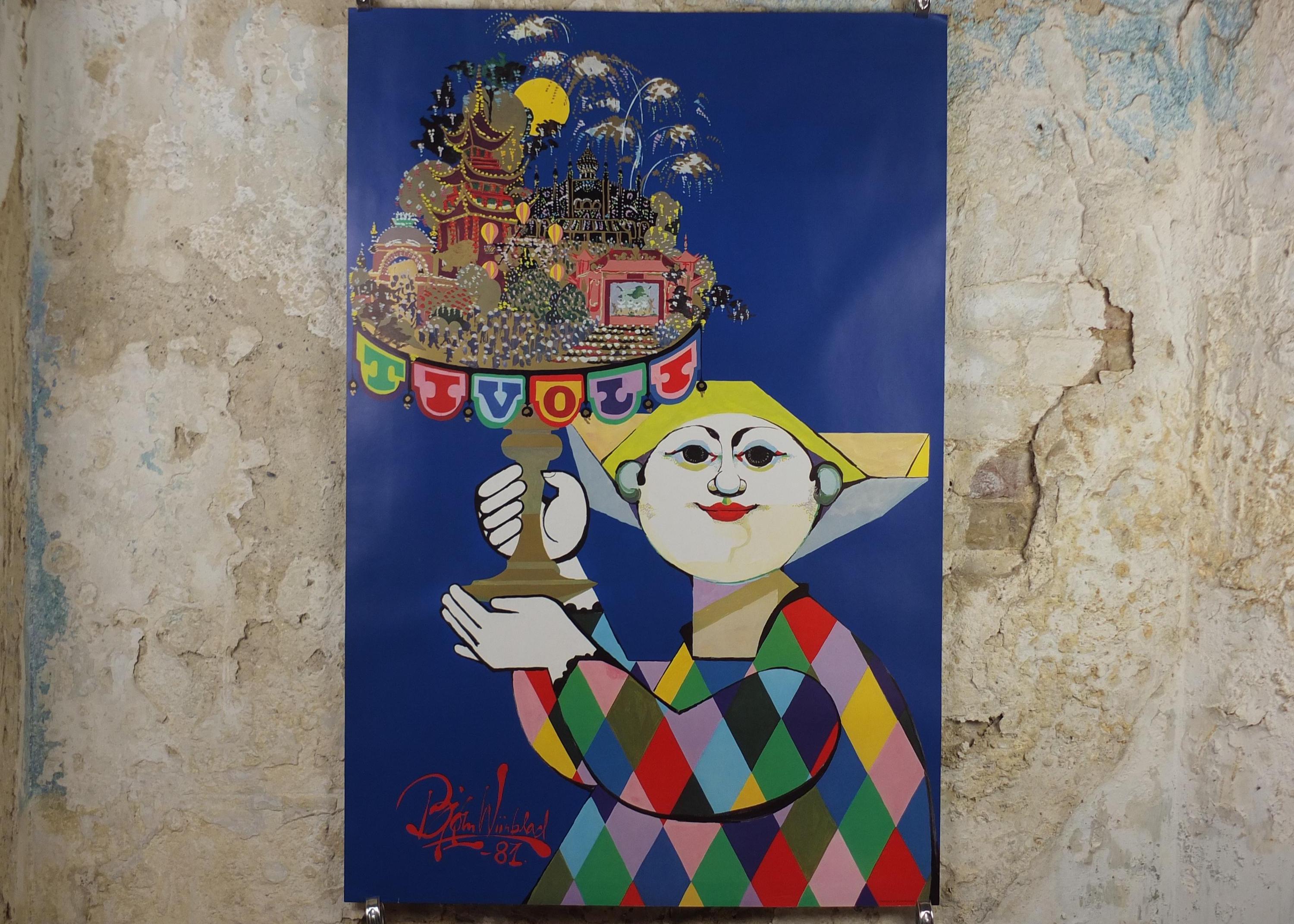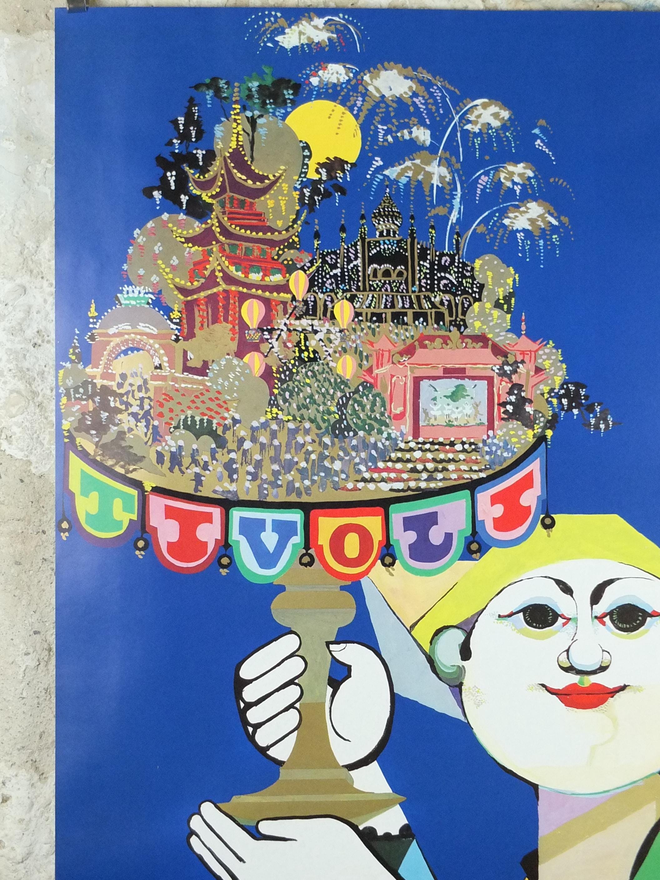 This large, beautiful and colourful pop art poster shows Tivoli, an Copenhagen Amusement Park in Denmark by Bjorn Wiinblad. It shows a harlequin holding a stand on which stands the wonderous global architectural wonders from the East.