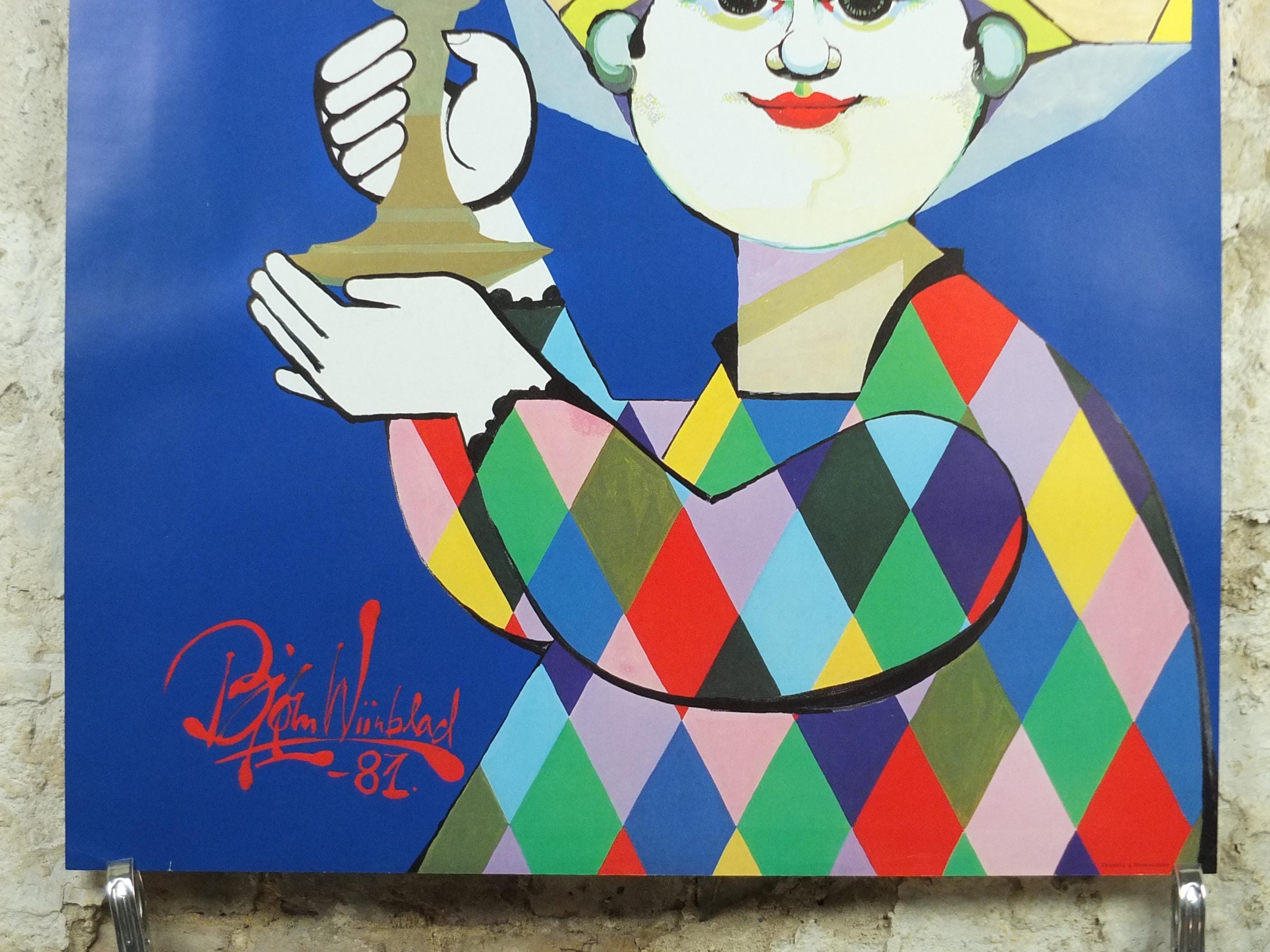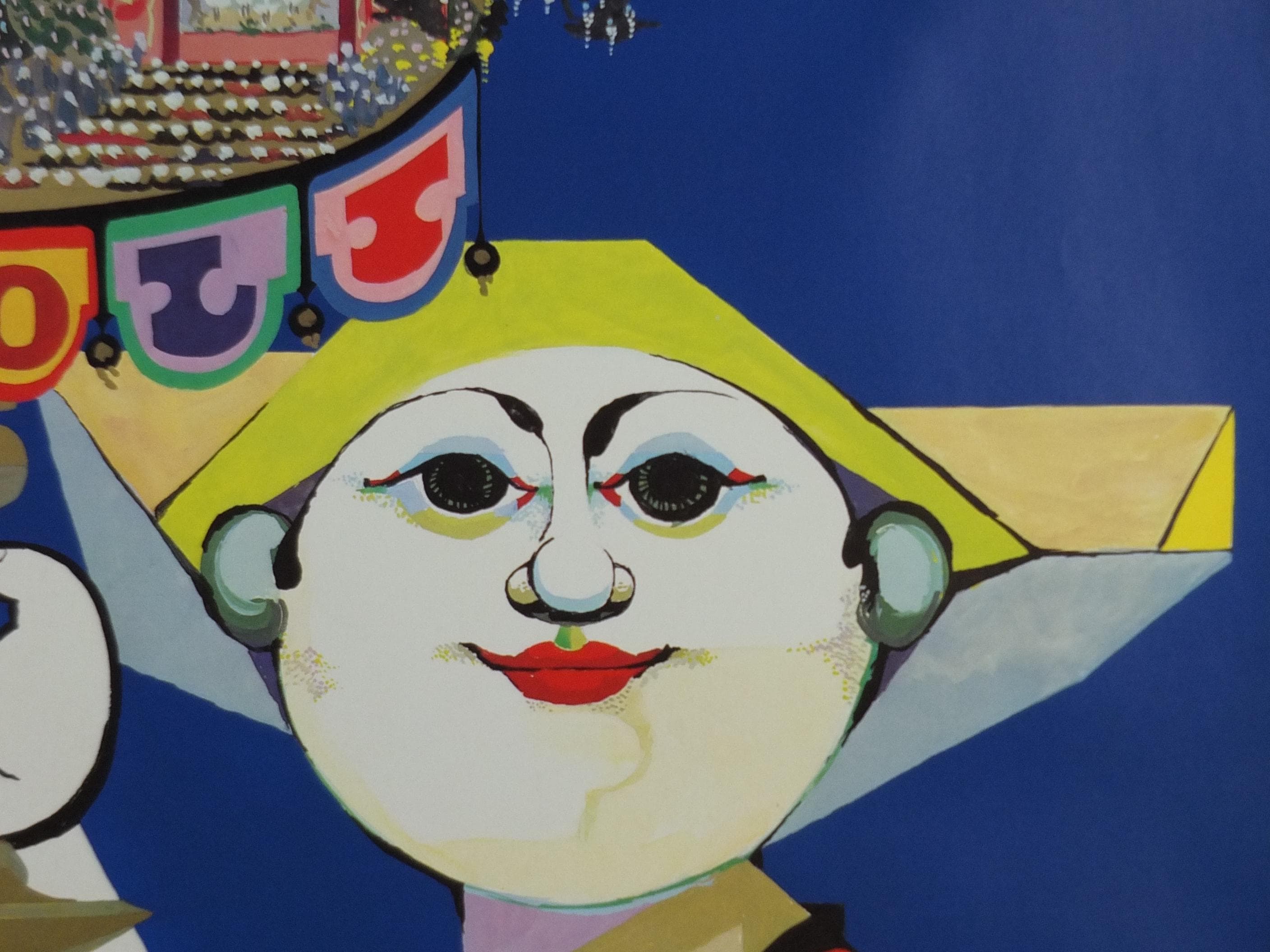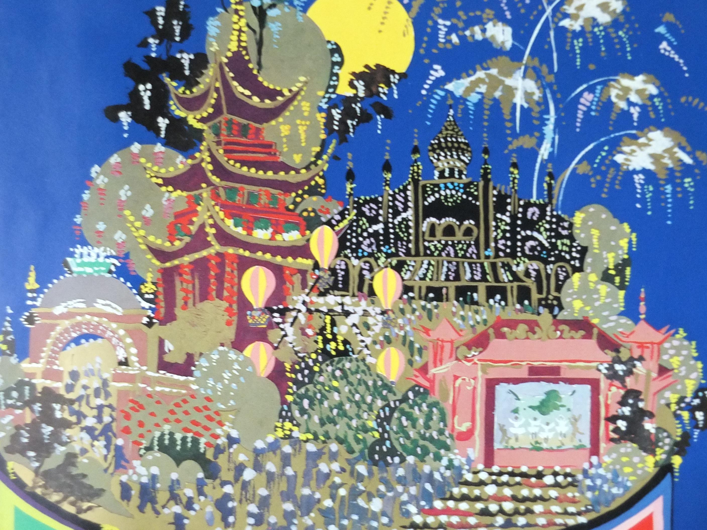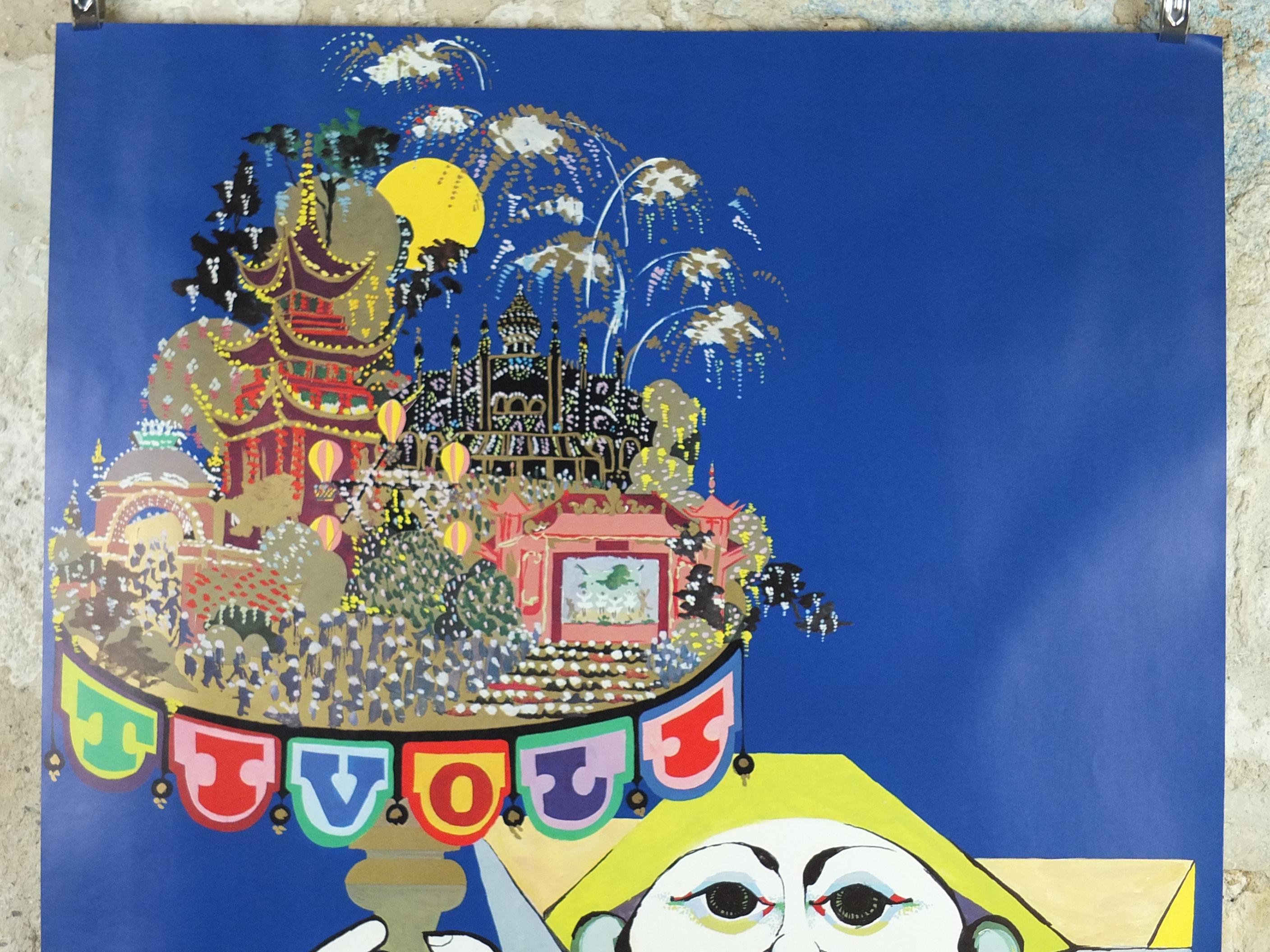 This large, beautiful and colourful pop art poster shows Tivoli, an Copenhagen Amusement Park in Denmark by Bjorn Wiinblad. It shows a harlequin holding a stand on which stands the wonderous global architectural wonders from the East.