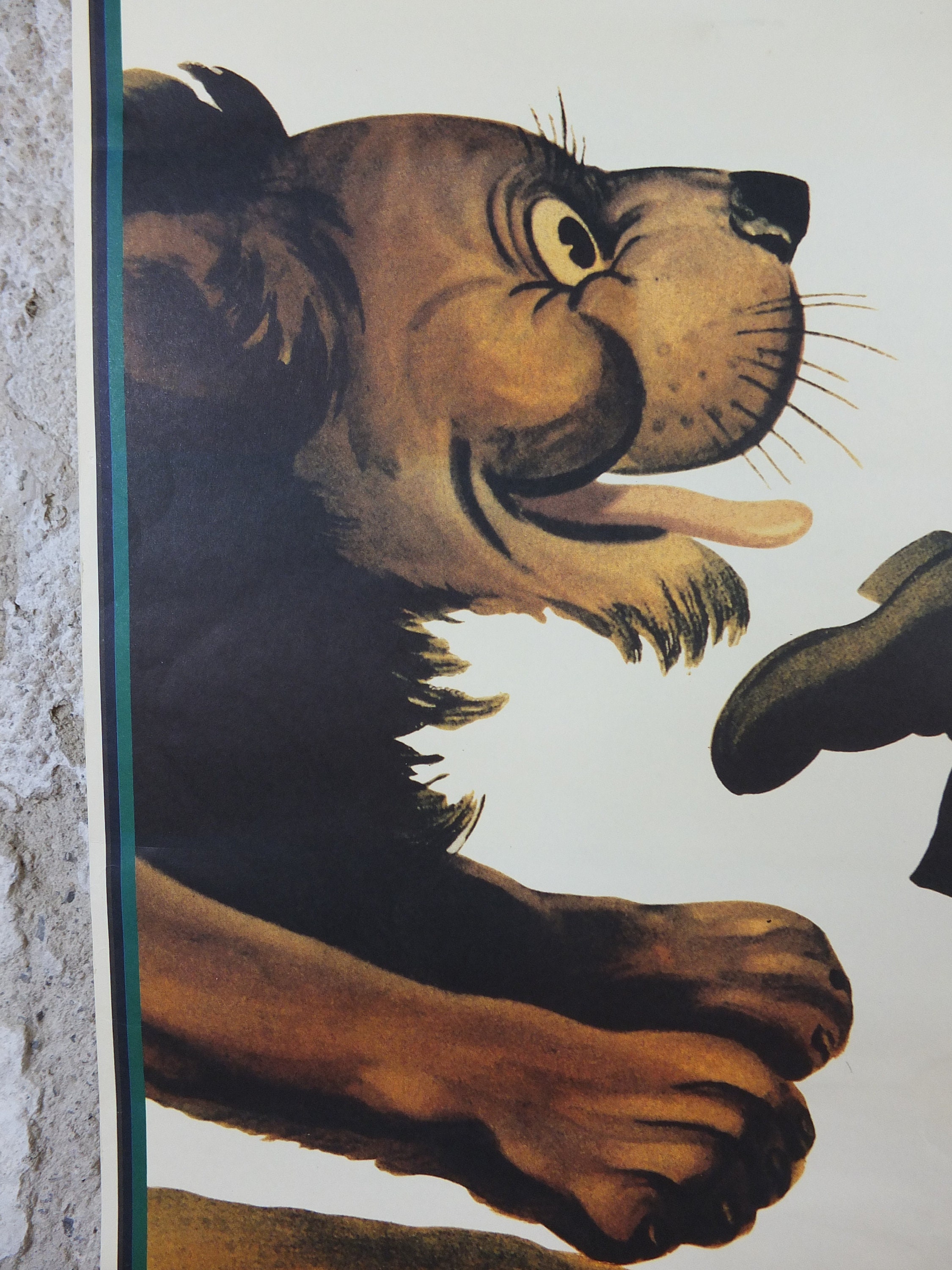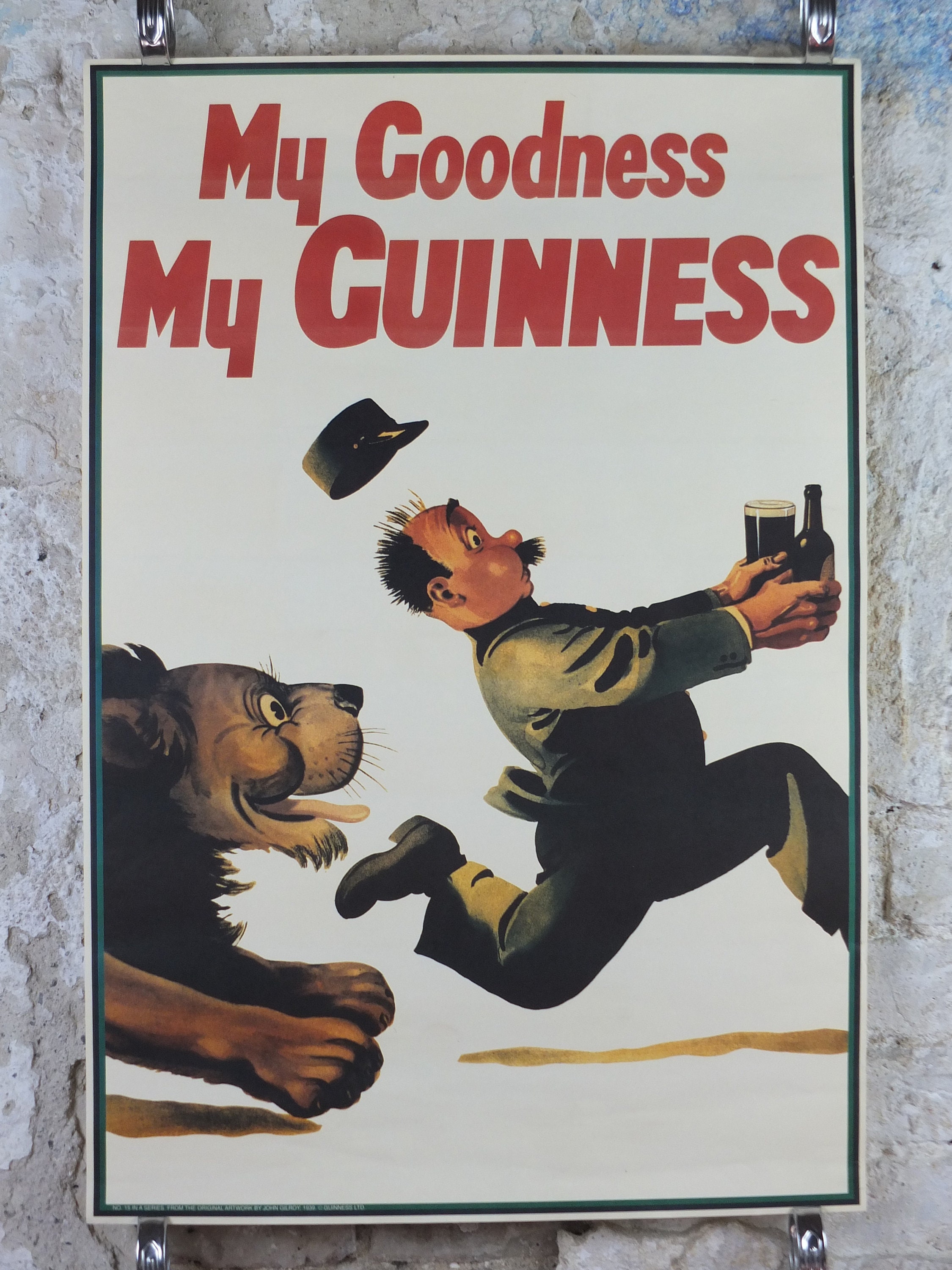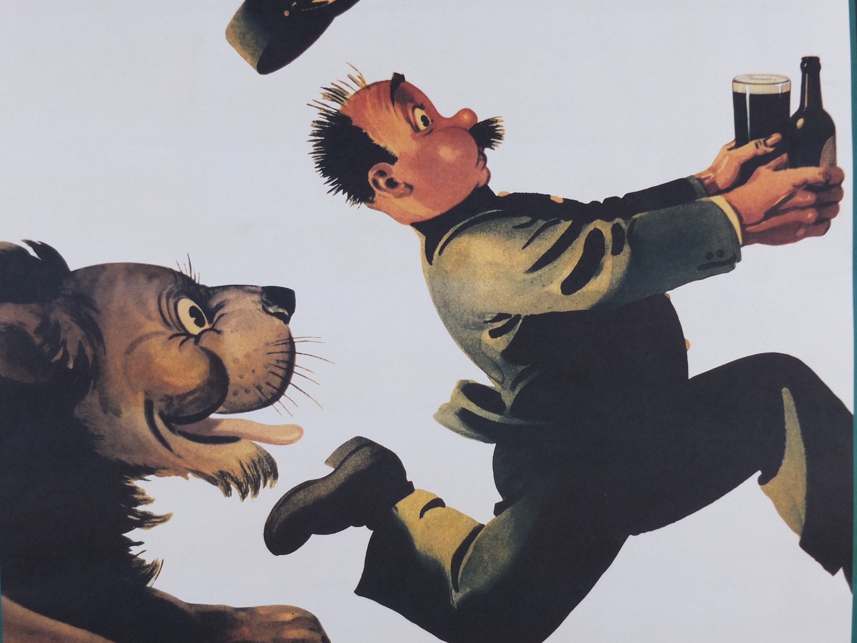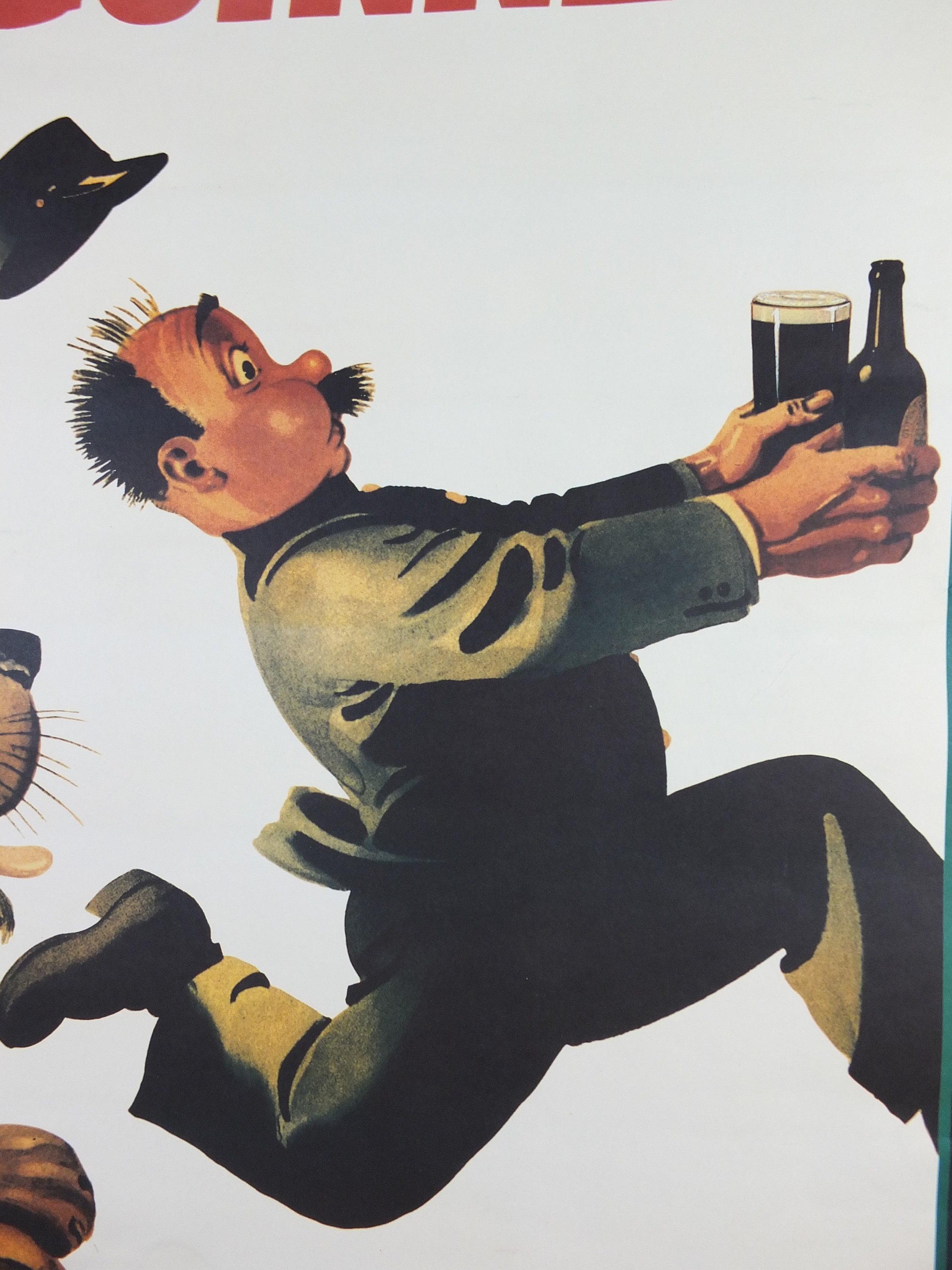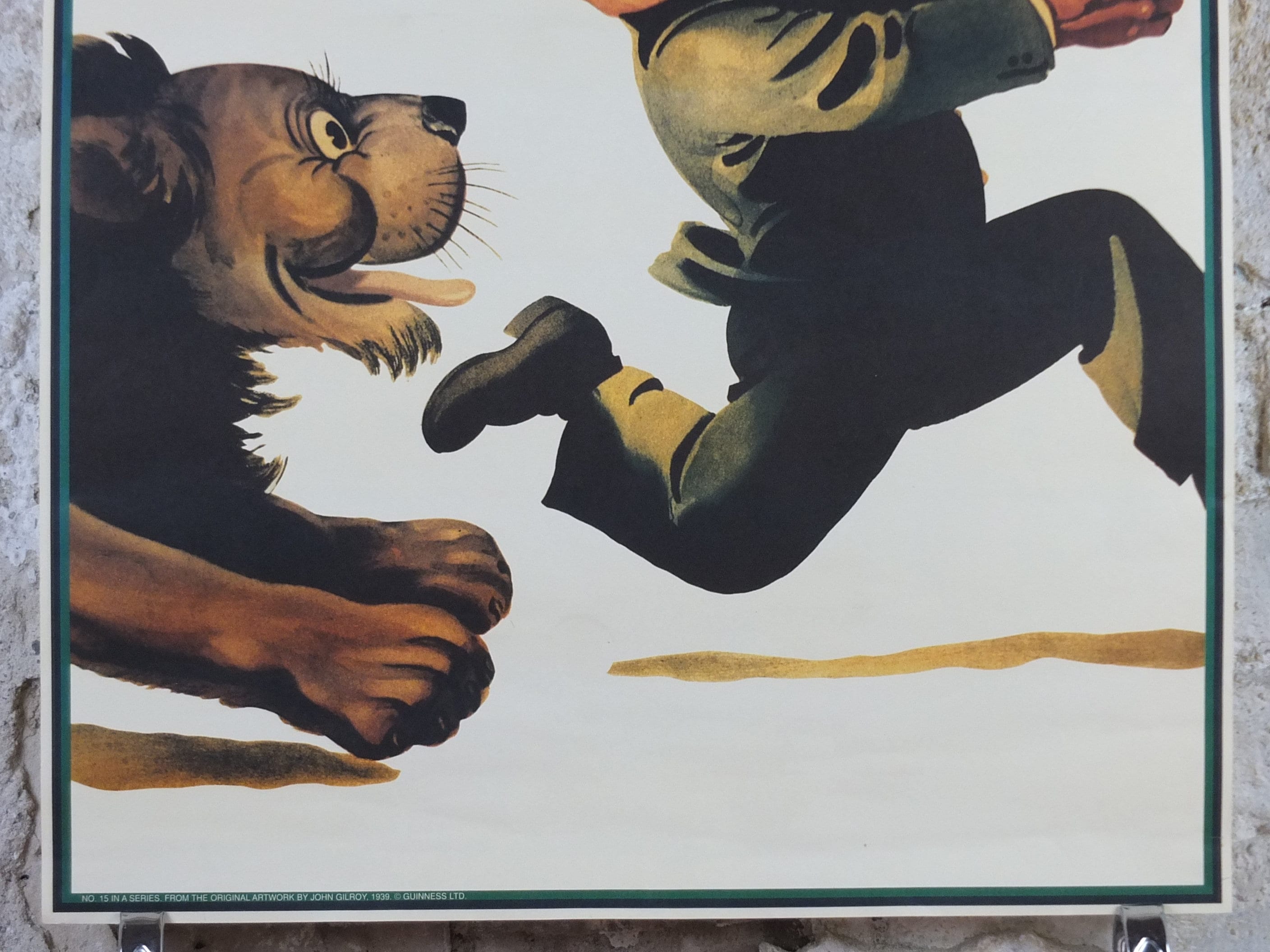 This is a pub promotional poster from the Guinness Museum in Dublin. They are from mid 1990s. It shows the zookeeper chasing a bear who has taken his Guinness. Most are larger (76x51cm) and on a heavy stock paper, but this one is smaller and on thinner paper, unclear what the difference is to the others, so much more affordable.